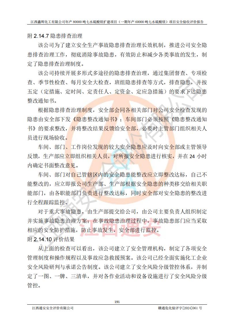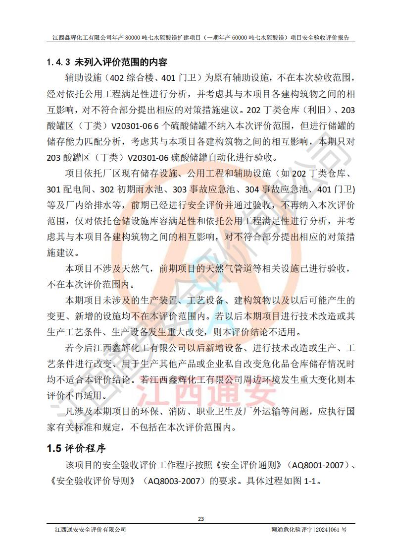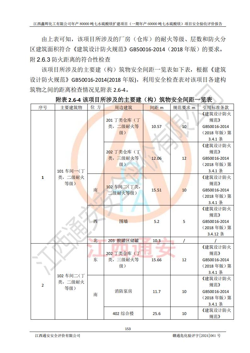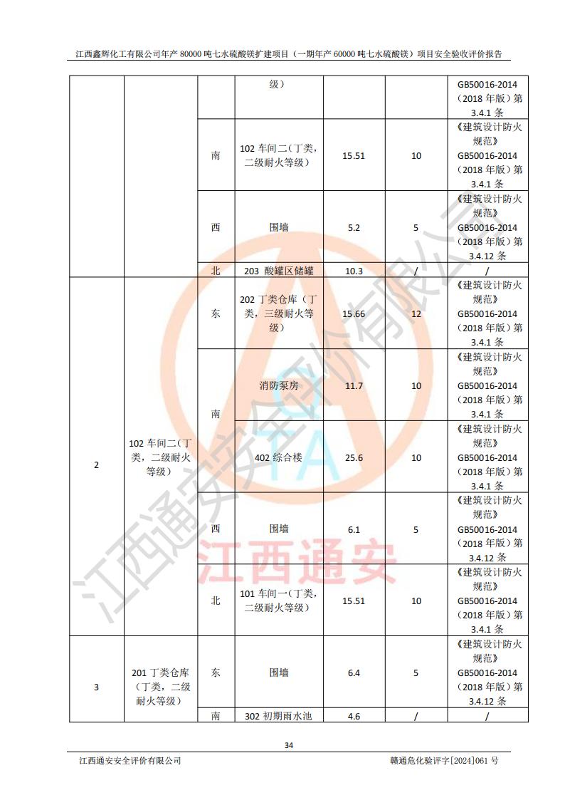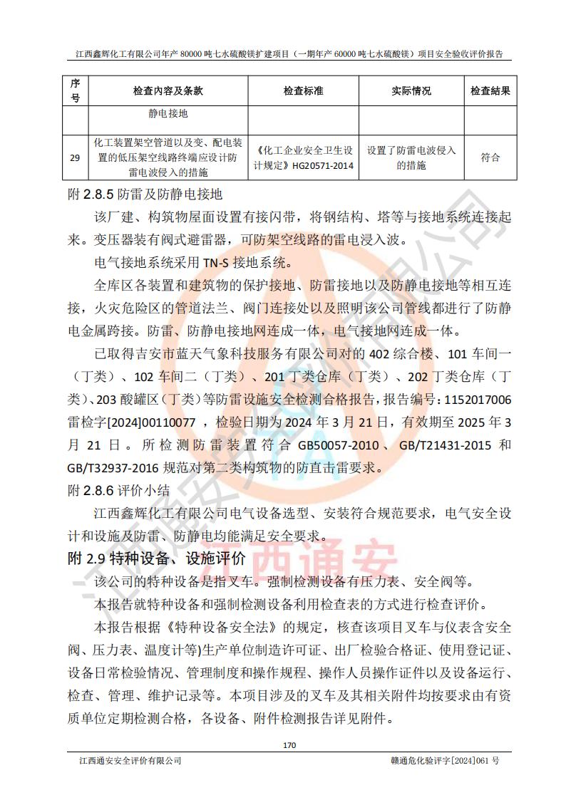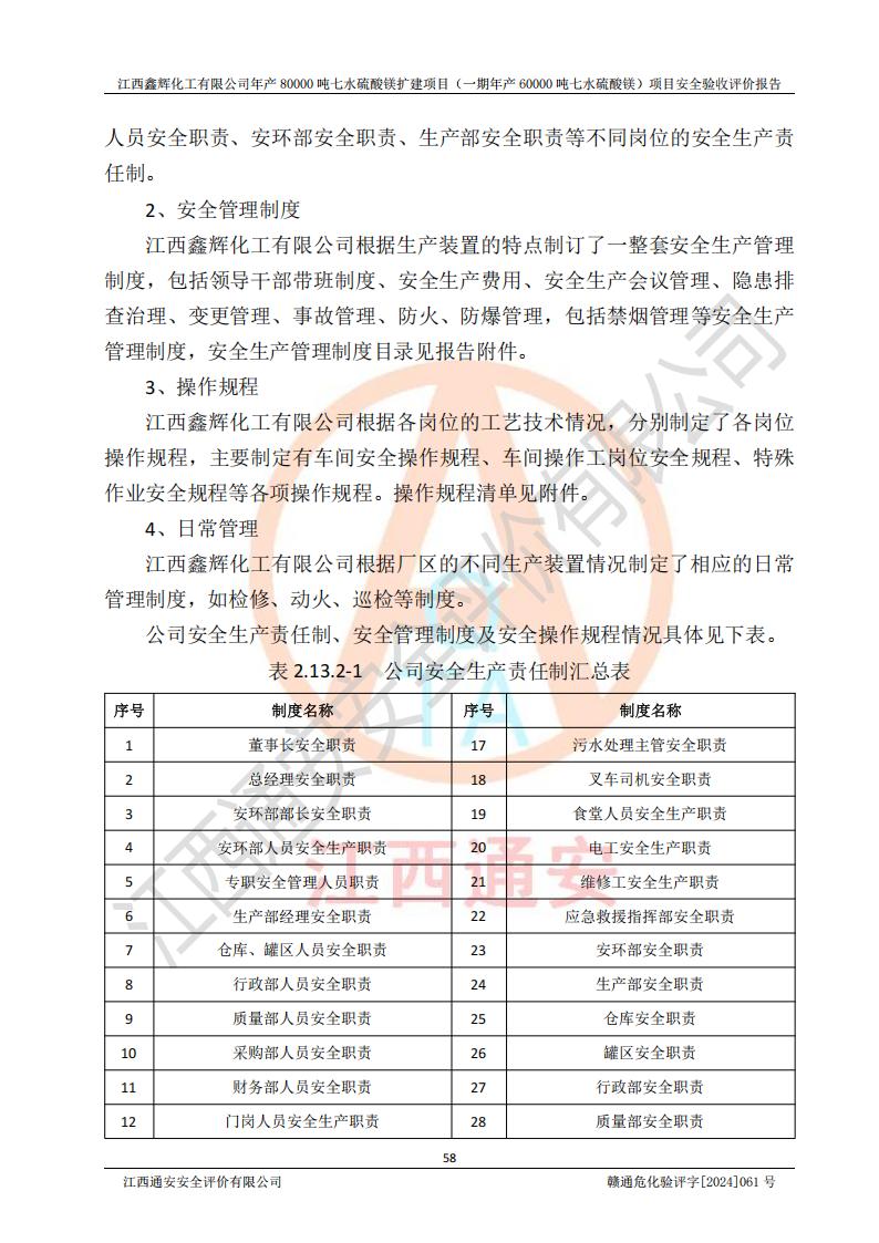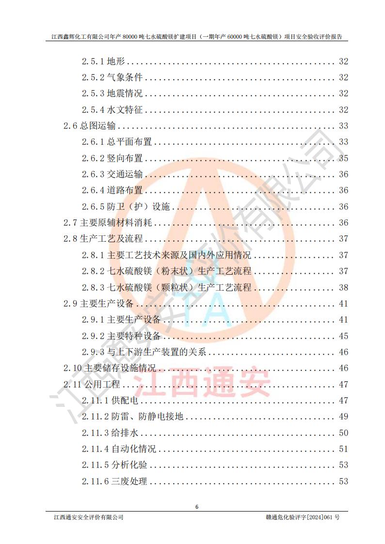 1. 江西鑫輝化工有限公司年產(chǎn)80000噸七水硫酸鎂擴(kuò)建項(xiàng)目(一期年產(chǎn)60000噸七水硫酸鎂)項(xiàng)目的安全設(shè)施與主體工程同時(shí)設(shè)計(jì)、同時(shí)施工、同時(shí)投入生產(chǎn)和使用,符合**有關(guān)建設(shè)項(xiàng)目“三同時(shí)”的規(guī)定和要求。 2. 江西鑫輝化工有限公司年產(chǎn)80000噸七水硫酸鎂擴(kuò)建項(xiàng)目(一期年產(chǎn)60000噸七水硫酸鎂)符合新干縣鹽化工業(yè)城發(fā)展規(guī)劃的布局; 3. 該項(xiàng)目現(xiàn)場情況、企業(yè)總平面布置、設(shè)備設(shè)施的布置與設(shè)計(jì)圖、竣工圖紙一致,主體工程安全設(shè)施、安全措施符合法律法規(guī)的規(guī)定和要求,安全設(shè)施正常投用并運(yùn)行**;供配電、給排水等公用工程及輔助設(shè)施滿足主體工程生產(chǎn)安全的需要;企業(yè)安全管理體系滿足生產(chǎn)安全的要求; 4. 總平面布置符合《建筑設(shè)計(jì)防火規(guī)范》GB50016-2014(2018年版)、《精細(xì)化工企業(yè)工程設(shè)計(jì)防火標(biāo)準(zhǔn)》GB51283-2020等標(biāo)準(zhǔn)、規(guī)范的要求; 5. 公司已針對(duì)本報(bào)告提出的安全隱患整改意見組織人員進(jìn)行整改,整改措施已落實(shí)到位,企業(yè)安全生產(chǎn)的風(fēng)險(xiǎn)控制在可以接受的范圍內(nèi); 6. 該項(xiàng)目采用成熟的生產(chǎn)工藝和設(shè)備,本質(zhì)安全程度較高。 7. 綜上所述:本報(bào)告認(rèn)為,江西鑫輝化工有限公司年產(chǎn)80000噸七水硫酸鎂擴(kuò)建項(xiàng)目(一期年產(chǎn)60000噸七水硫酸鎂)項(xiàng)目的生產(chǎn)裝置現(xiàn)場情況與設(shè)計(jì)圖紙一致,安全設(shè)施及安全管理符合**及有關(guān)部門關(guān)于安全生產(chǎn)法律、法規(guī)、標(biāo)準(zhǔn)的要求,安全風(fēng)險(xiǎn)是受控制的,其風(fēng)險(xiǎn)程度是可以接受的,符合安全生產(chǎn)條件,能夠滿足安全生產(chǎn)的要求,具備安全設(shè)施“三同時(shí)”驗(yàn)收條件。 |