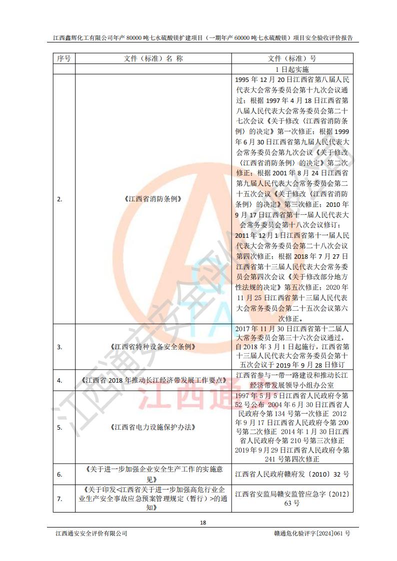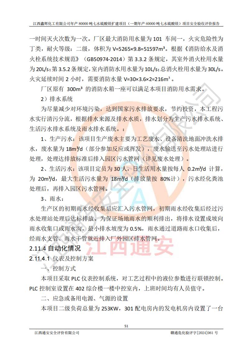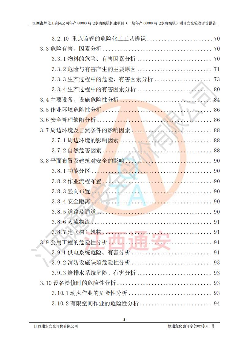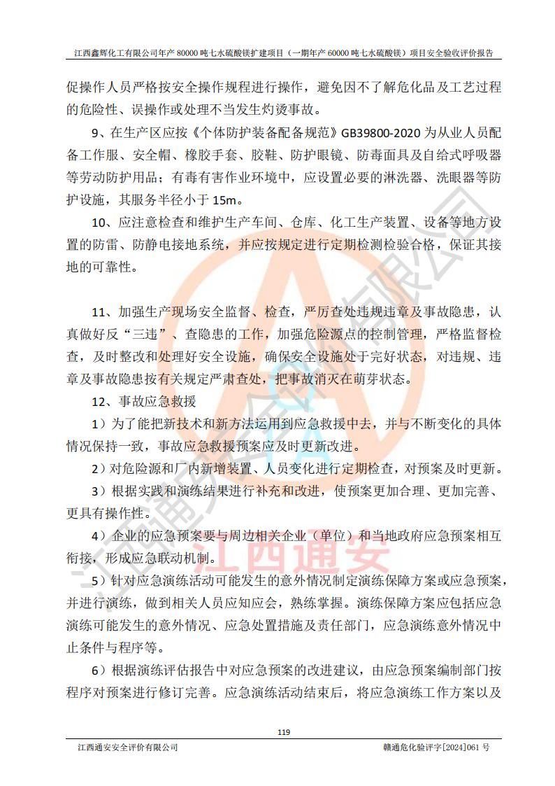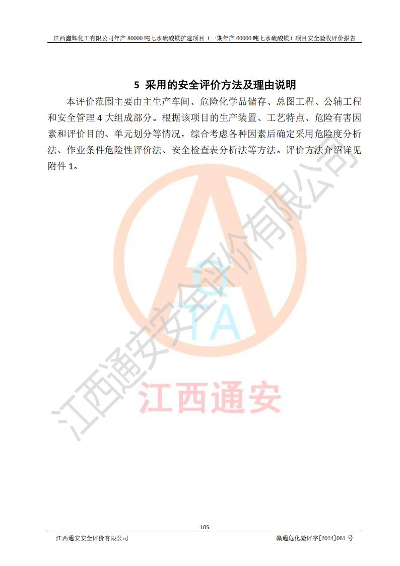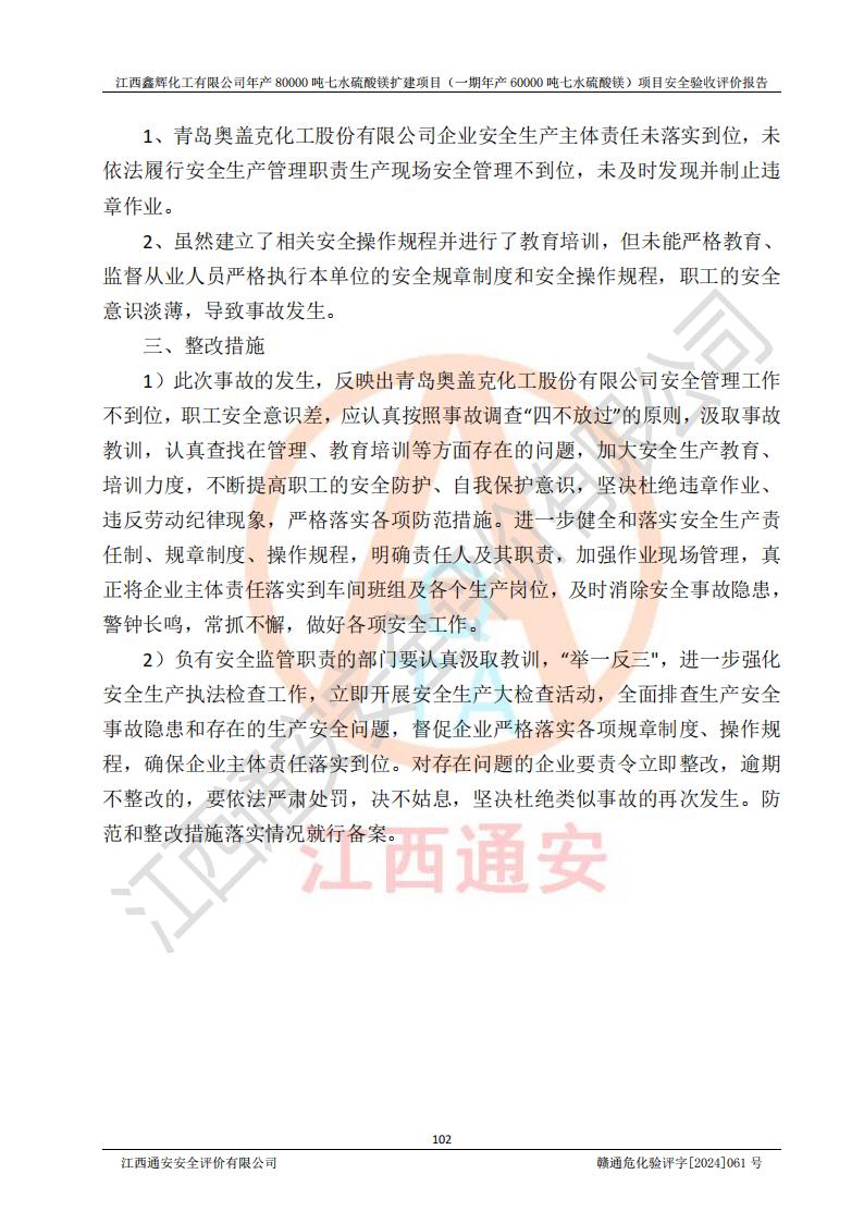 1. 江西鑫輝化工有限公司年產(chǎn)80000噸七水硫酸鎂擴(kuò)建項(xiàng)目(一期年產(chǎn)60000噸七水硫酸鎂)項(xiàng)目的安全設(shè)施與主體工程同時(shí)設(shè)計(jì)、同時(shí)施工、同時(shí)投入生產(chǎn)和使用,符合**有關(guān)建設(shè)項(xiàng)目“三同時(shí)”的規(guī)定和要求。 2. 江西鑫輝化工有限公司年產(chǎn)80000噸七水硫酸鎂擴(kuò)建項(xiàng)目(一期年產(chǎn)60000噸七水硫酸鎂)符合新干縣鹽化工業(yè)城發(fā)展規(guī)劃的布局; 3. 該項(xiàng)目現(xiàn)場情況、企業(yè)總平面布置、設(shè)備設(shè)施的布置與設(shè)計(jì)圖、竣工圖紙一致,主體工程安全設(shè)施、安全措施符合法律法規(guī)的規(guī)定和要求,安全設(shè)施正常投用并運(yùn)行**;供配電、給排水等公用工程及輔助設(shè)施滿足主體工程生產(chǎn)安全的需要;企業(yè)安全管理體系滿足生產(chǎn)安全的要求; 4. 總平面布置符合《建筑設(shè)計(jì)防火規(guī)范》GB50016-2014(2018年版)、《精細(xì)化工企業(yè)工程設(shè)計(jì)防火標(biāo)準(zhǔn)》GB51283-2020等標(biāo)準(zhǔn)、規(guī)范的要求; 5. 公司已針對(duì)本報(bào)告提出的安全隱患整改意見組織人員進(jìn)行整改,整改措施已落實(shí)到位,企業(yè)安全生產(chǎn)的風(fēng)險(xiǎn)控制在可以接受的范圍內(nèi); 6. 該項(xiàng)目采用成熟的生產(chǎn)工藝和設(shè)備,本質(zhì)安全程度較高。 7. 綜上所述:本報(bào)告認(rèn)為,江西鑫輝化工有限公司年產(chǎn)80000噸七水硫酸鎂擴(kuò)建項(xiàng)目(一期年產(chǎn)60000噸七水硫酸鎂)項(xiàng)目的生產(chǎn)裝置現(xiàn)場情況與設(shè)計(jì)圖紙一致,安全設(shè)施及安全管理符合**及有關(guān)部門關(guān)于安全生產(chǎn)法律、法規(guī)、標(biāo)準(zhǔn)的要求,安全風(fēng)險(xiǎn)是受控制的,其風(fēng)險(xiǎn)程度是可以接受的,符合安全生產(chǎn)條件,能夠滿足安全生產(chǎn)的要求,具備安全設(shè)施“三同時(shí)”驗(yàn)收條件。 |