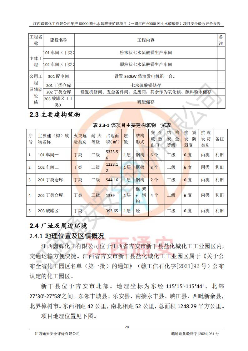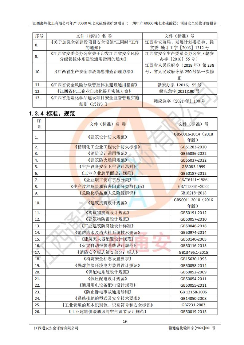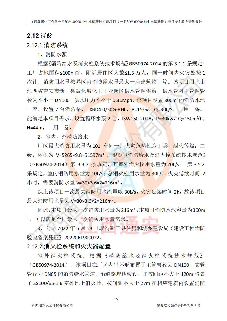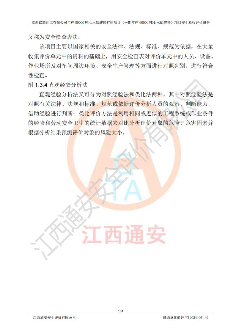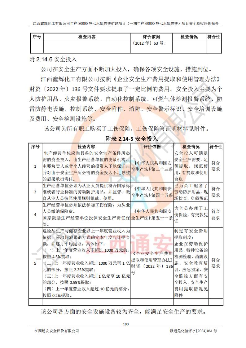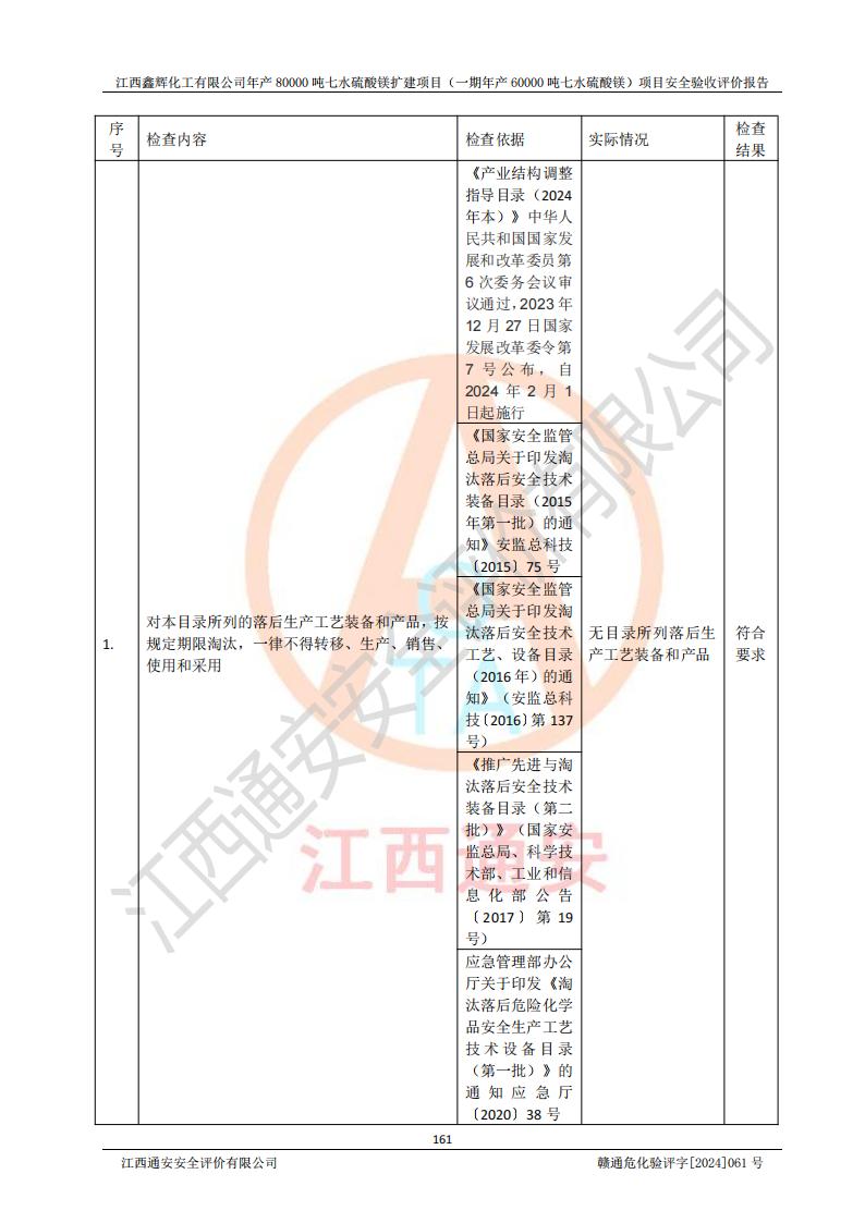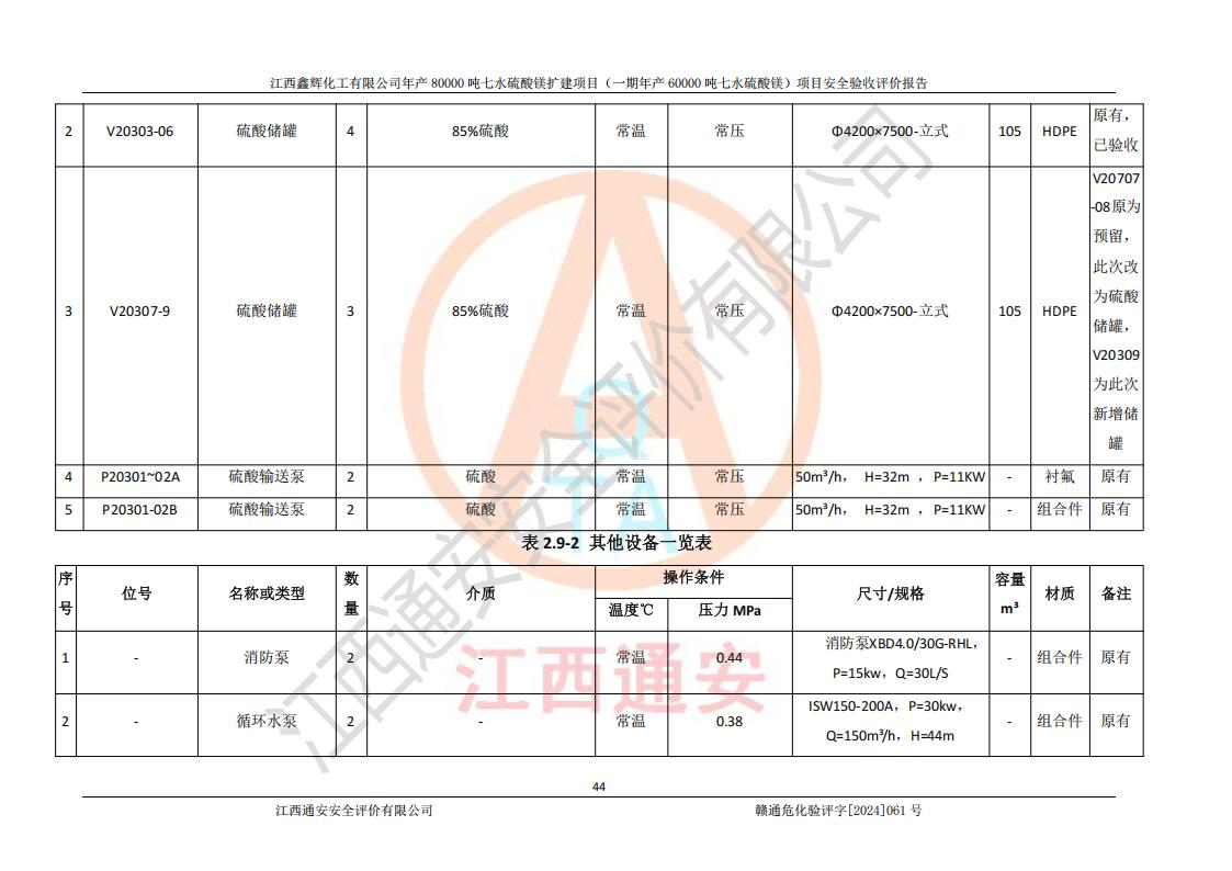1. 江西鑫輝化工有限公司年產(chǎn)80000噸七水硫酸鎂擴(kuò)建項(xiàng)目(一期年產(chǎn)60000噸七水硫酸鎂)項(xiàng)目的安全設(shè)施與主體工程同時(shí)設(shè)計(jì)、同時(shí)施工、同時(shí)投入生產(chǎn)和使用,符合**有關(guān)建設(shè)項(xiàng)目“三同時(shí)”的規(guī)定和要求。 2. 江西鑫輝化工有限公司年產(chǎn)80000噸七水硫酸鎂擴(kuò)建項(xiàng)目(一期年產(chǎn)60000噸七水硫酸鎂)符合新干縣鹽化工業(yè)城發(fā)展規(guī)劃的布局; 3. 該項(xiàng)目現(xiàn)場情況、企業(yè)總平面布置、設(shè)備設(shè)施的布置與設(shè)計(jì)圖、竣工圖紙一致,主體工程安全設(shè)施、安全措施符合法律法規(guī)的規(guī)定和要求,安全設(shè)施正常投用并運(yùn)行**;供配電、給排水等公用工程及輔助設(shè)施滿足主體工程生產(chǎn)安全的需要;企業(yè)安全管理體系滿足生產(chǎn)安全的要求; 4. 總平面布置符合《建筑設(shè)計(jì)防火規(guī)范》GB50016-2014(2018年版)、《精細(xì)化工企業(yè)工程設(shè)計(jì)防火標(biāo)準(zhǔn)》GB51283-2020等標(biāo)準(zhǔn)、規(guī)范的要求; 5. 公司已針對(duì)本報(bào)告提出的安全隱患整改意見組織人員進(jìn)行整改,整改措施已落實(shí)到位,企業(yè)安全生產(chǎn)的風(fēng)險(xiǎn)控制在可以接受的范圍內(nèi); 6. 該項(xiàng)目采用成熟的生產(chǎn)工藝和設(shè)備,本質(zhì)安全程度較高。 7. 綜上所述:本報(bào)告認(rèn)為,江西鑫輝化工有限公司年產(chǎn)80000噸七水硫酸鎂擴(kuò)建項(xiàng)目(一期年產(chǎn)60000噸七水硫酸鎂)項(xiàng)目的生產(chǎn)裝置現(xiàn)場情況與設(shè)計(jì)圖紙一致,安全設(shè)施及安全管理符合**及有關(guān)部門關(guān)于安全生產(chǎn)法律、法規(guī)、標(biāo)準(zhǔn)的要求,安全風(fēng)險(xiǎn)是受控制的,其風(fēng)險(xiǎn)程度是可以接受的,符合安全生產(chǎn)條件,能夠滿足安全生產(chǎn)的要求,具備安全設(shè)施“三同時(shí)”驗(yàn)收條件。 |