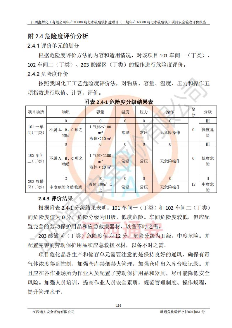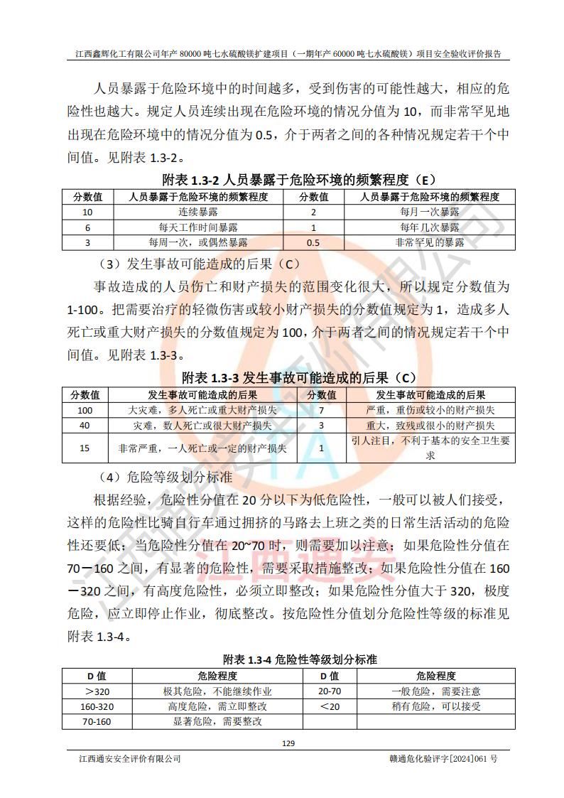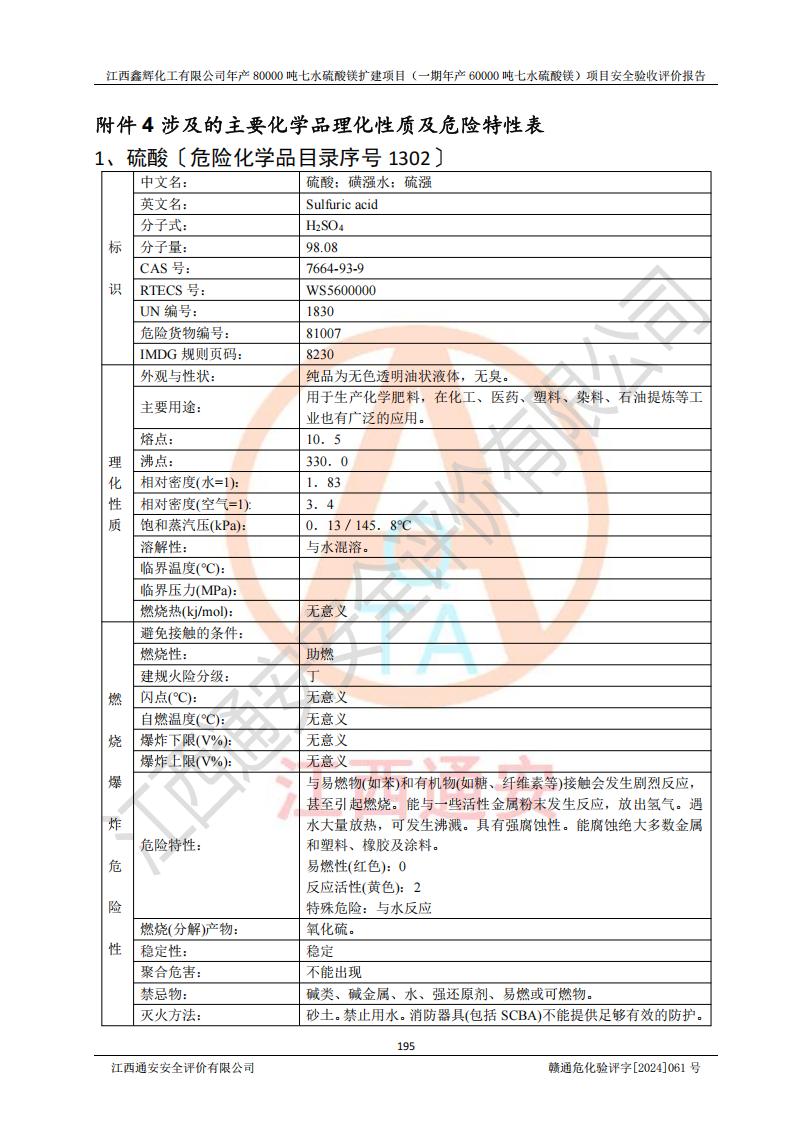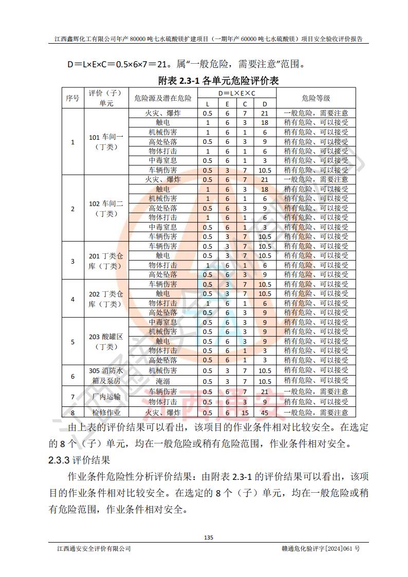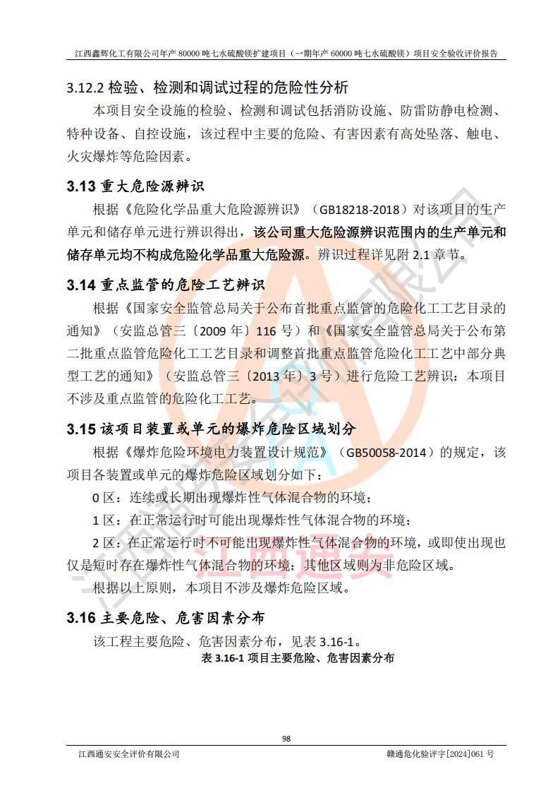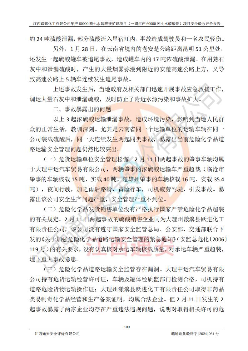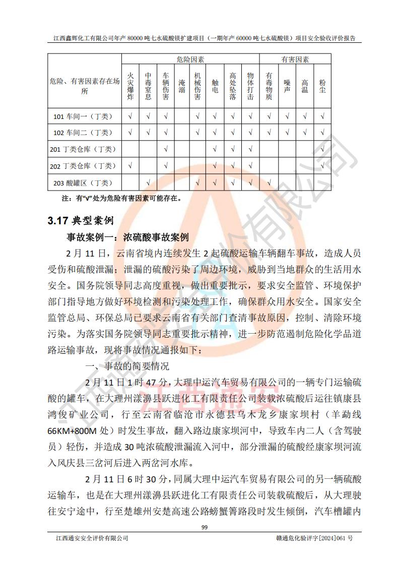1. 江西鑫輝化工有限公司年產(chǎn)80000噸七水硫酸鎂擴(kuò)建項(xiàng)目(一期年產(chǎn)60000噸七水硫酸鎂)項(xiàng)目的安全設(shè)施與主體工程同時(shí)設(shè)計(jì)、同時(shí)施工、同時(shí)投入生產(chǎn)和使用,符合**有關(guān)建設(shè)項(xiàng)目“三同時(shí)”的規(guī)定和要求。 2. 江西鑫輝化工有限公司年產(chǎn)80000噸七水硫酸鎂擴(kuò)建項(xiàng)目(一期年產(chǎn)60000噸七水硫酸鎂)符合新干縣鹽化工業(yè)城發(fā)展規(guī)劃的布局; 3. 該項(xiàng)目現(xiàn)場情況、企業(yè)總平面布置、設(shè)備設(shè)施的布置與設(shè)計(jì)圖、竣工圖紙一致,主體工程安全設(shè)施、安全措施符合法律法規(guī)的規(guī)定和要求,安全設(shè)施正常投用并運(yùn)行**;供配電、給排水等公用工程及輔助設(shè)施滿足主體工程生產(chǎn)安全的需要;企業(yè)安全管理體系滿足生產(chǎn)安全的要求; 4. 總平面布置符合《建筑設(shè)計(jì)防火規(guī)范》GB50016-2014(2018年版)、《精細(xì)化工企業(yè)工程設(shè)計(jì)防火標(biāo)準(zhǔn)》GB51283-2020等標(biāo)準(zhǔn)、規(guī)范的要求; 5. 公司已針對(duì)本報(bào)告提出的安全隱患整改意見組織人員進(jìn)行整改,整改措施已落實(shí)到位,企業(yè)安全生產(chǎn)的風(fēng)險(xiǎn)控制在可以接受的范圍內(nèi); 6. 該項(xiàng)目采用成熟的生產(chǎn)工藝和設(shè)備,本質(zhì)安全程度較高。 7. 綜上所述:本報(bào)告認(rèn)為,江西鑫輝化工有限公司年產(chǎn)80000噸七水硫酸鎂擴(kuò)建項(xiàng)目(一期年產(chǎn)60000噸七水硫酸鎂)項(xiàng)目的生產(chǎn)裝置現(xiàn)場情況與設(shè)計(jì)圖紙一致,安全設(shè)施及安全管理符合**及有關(guān)部門關(guān)于安全生產(chǎn)法律、法規(guī)、標(biāo)準(zhǔn)的要求,安全風(fēng)險(xiǎn)是受控制的,其風(fēng)險(xiǎn)程度是可以接受的,符合安全生產(chǎn)條件,能夠滿足安全生產(chǎn)的要求,具備安全設(shè)施“三同時(shí)”驗(yàn)收條件。 |