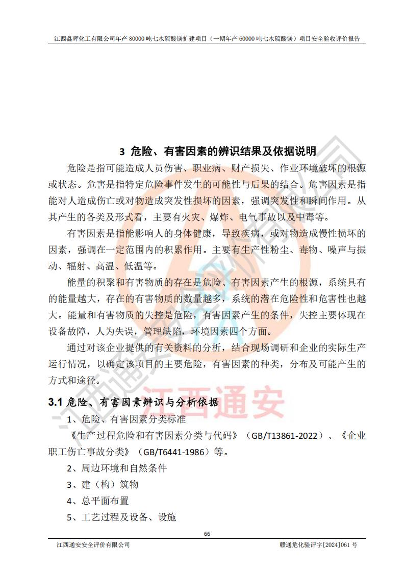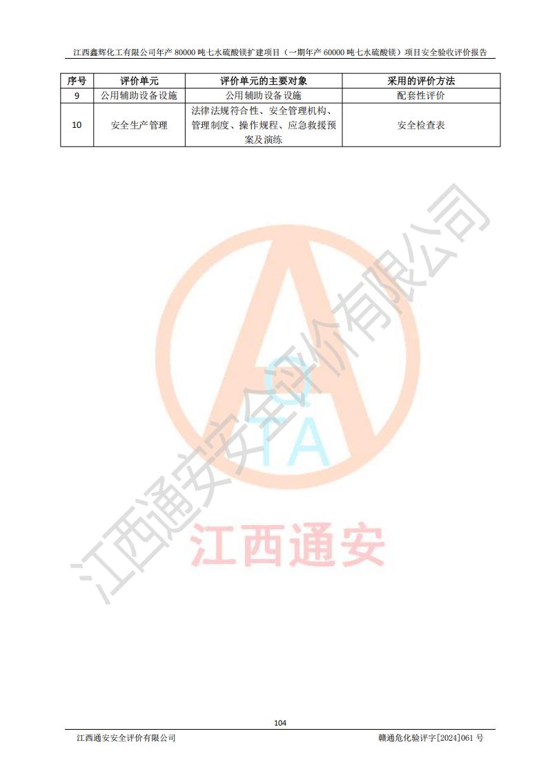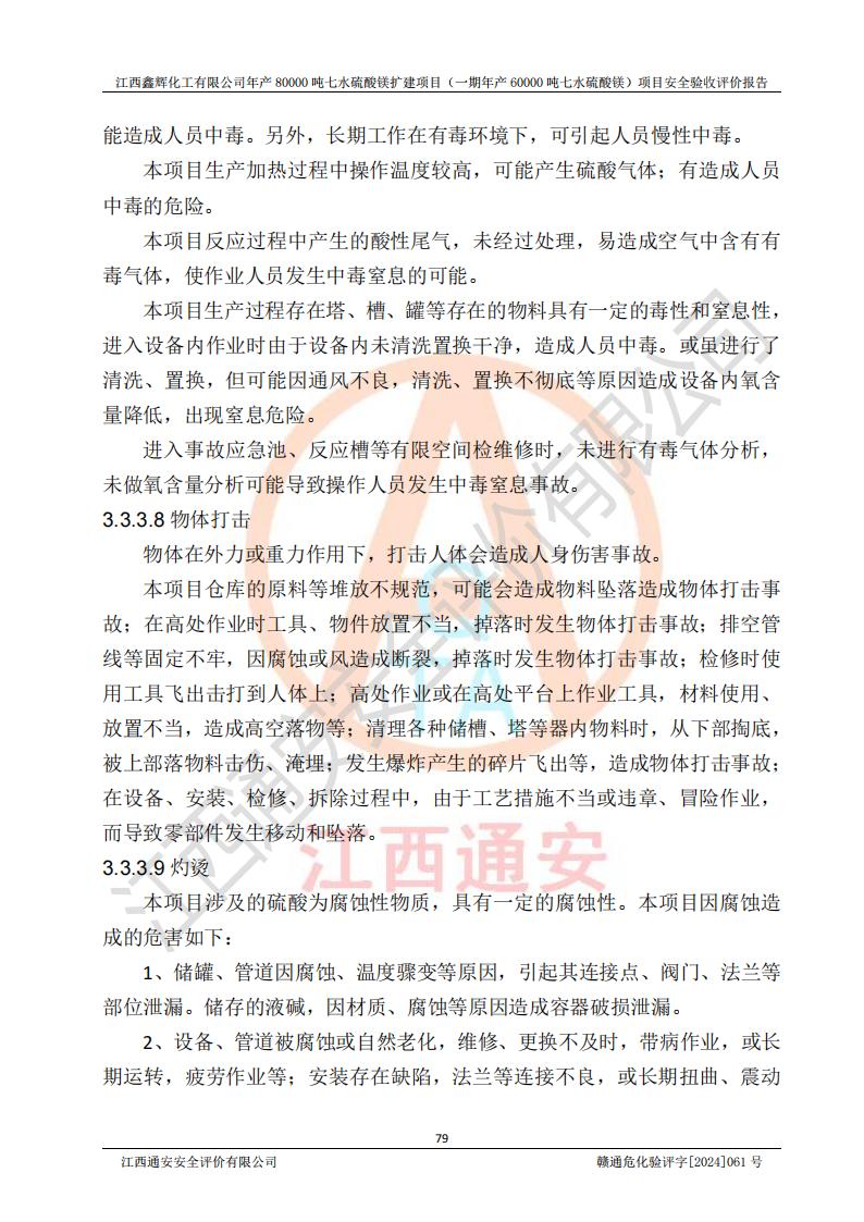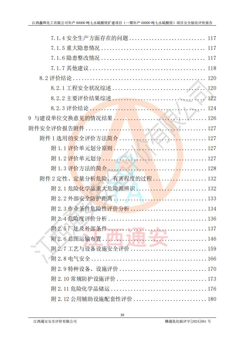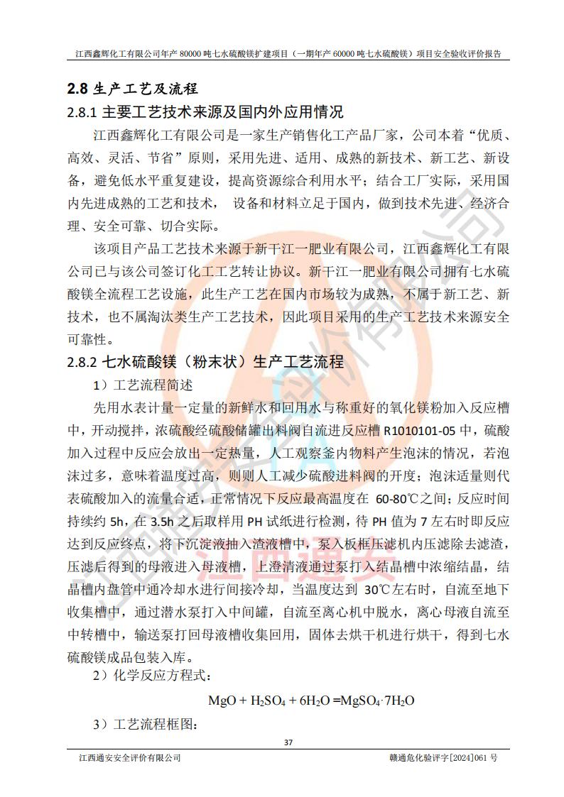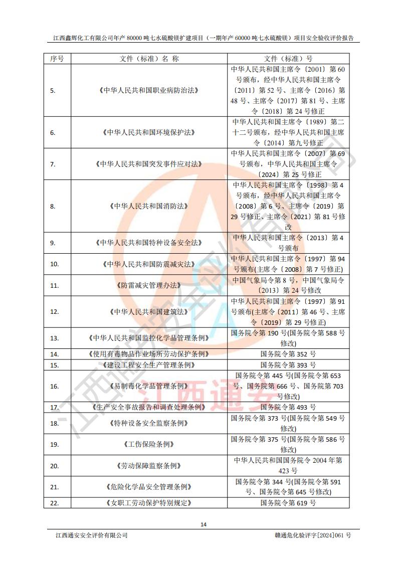 1. 江西鑫輝化工有限公司年產(chǎn)80000噸七水硫酸鎂擴(kuò)建項(xiàng)目(一期年產(chǎn)60000噸七水硫酸鎂)項(xiàng)目的安全設(shè)施與主體工程同時(shí)設(shè)計(jì)、同時(shí)施工、同時(shí)投入生產(chǎn)和使用,符合**有關(guān)建設(shè)項(xiàng)目“三同時(shí)”的規(guī)定和要求。 2. 江西鑫輝化工有限公司年產(chǎn)80000噸七水硫酸鎂擴(kuò)建項(xiàng)目(一期年產(chǎn)60000噸七水硫酸鎂)符合新干縣鹽化工業(yè)城發(fā)展規(guī)劃的布局; 3. 該項(xiàng)目現(xiàn)場情況、企業(yè)總平面布置、設(shè)備設(shè)施的布置與設(shè)計(jì)圖、竣工圖紙一致,主體工程安全設(shè)施、安全措施符合法律法規(guī)的規(guī)定和要求,安全設(shè)施正常投用并運(yùn)行**;供配電、給排水等公用工程及輔助設(shè)施滿足主體工程生產(chǎn)安全的需要;企業(yè)安全管理體系滿足生產(chǎn)安全的要求; 4. 總平面布置符合《建筑設(shè)計(jì)防火規(guī)范》GB50016-2014(2018年版)、《精細(xì)化工企業(yè)工程設(shè)計(jì)防火標(biāo)準(zhǔn)》GB51283-2020等標(biāo)準(zhǔn)、規(guī)范的要求; 5. 公司已針對(duì)本報(bào)告提出的安全隱患整改意見組織人員進(jìn)行整改,整改措施已落實(shí)到位,企業(yè)安全生產(chǎn)的風(fēng)險(xiǎn)控制在可以接受的范圍內(nèi); 6. 該項(xiàng)目采用成熟的生產(chǎn)工藝和設(shè)備,本質(zhì)安全程度較高。 7. 綜上所述:本報(bào)告認(rèn)為,江西鑫輝化工有限公司年產(chǎn)80000噸七水硫酸鎂擴(kuò)建項(xiàng)目(一期年產(chǎn)60000噸七水硫酸鎂)項(xiàng)目的生產(chǎn)裝置現(xiàn)場情況與設(shè)計(jì)圖紙一致,安全設(shè)施及安全管理符合**及有關(guān)部門關(guān)于安全生產(chǎn)法律、法規(guī)、標(biāo)準(zhǔn)的要求,安全風(fēng)險(xiǎn)是受控制的,其風(fēng)險(xiǎn)程度是可以接受的,符合安全生產(chǎn)條件,能夠滿足安全生產(chǎn)的要求,具備安全設(shè)施“三同時(shí)”驗(yàn)收條件。 |
