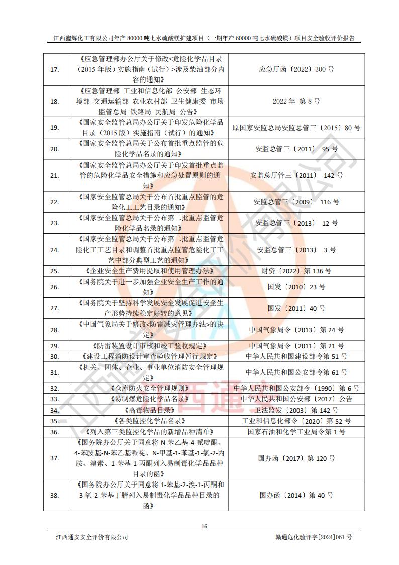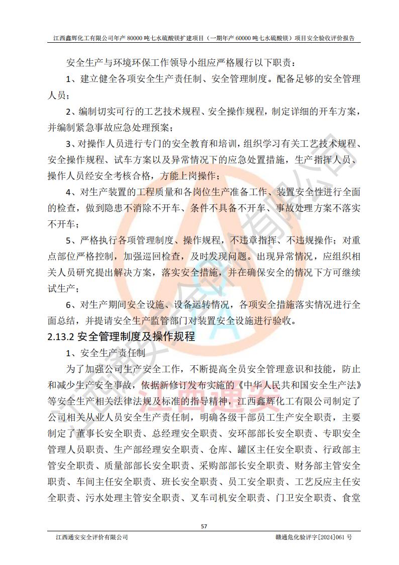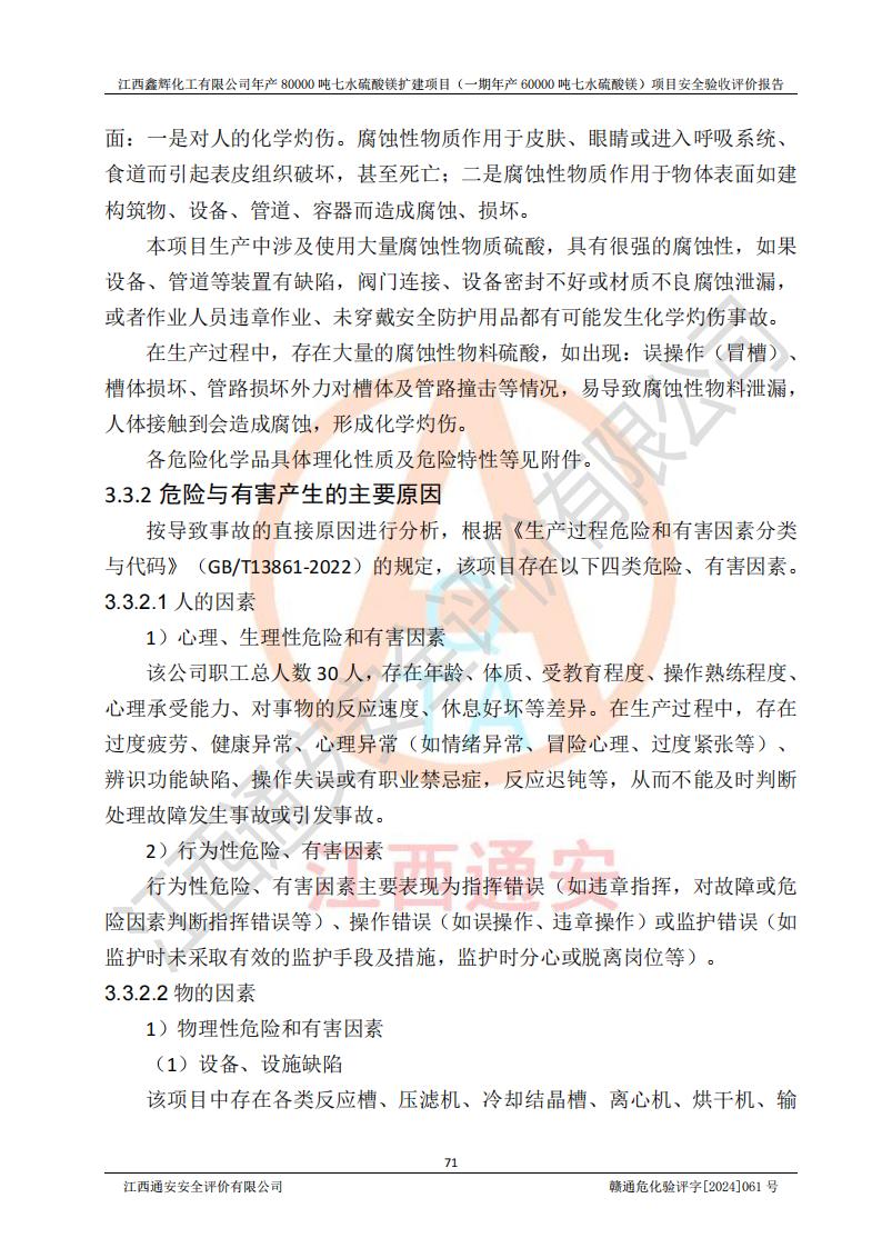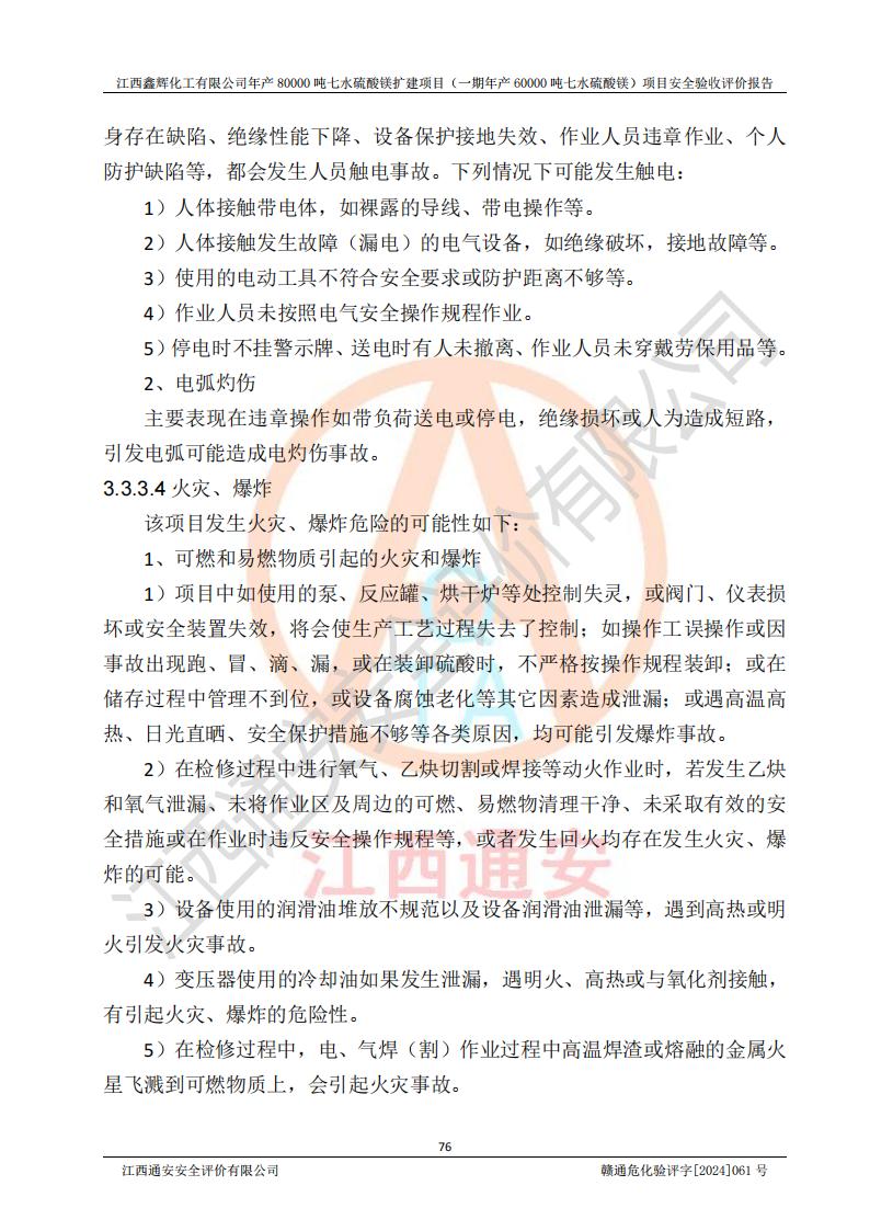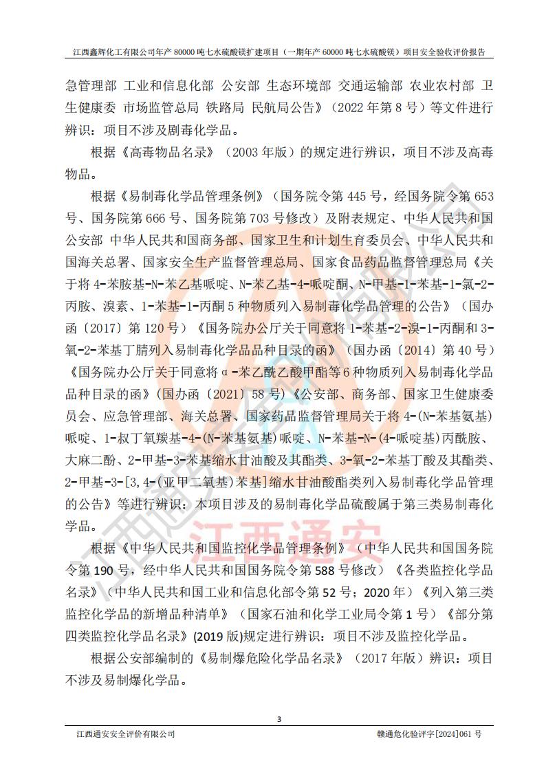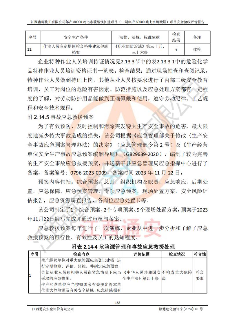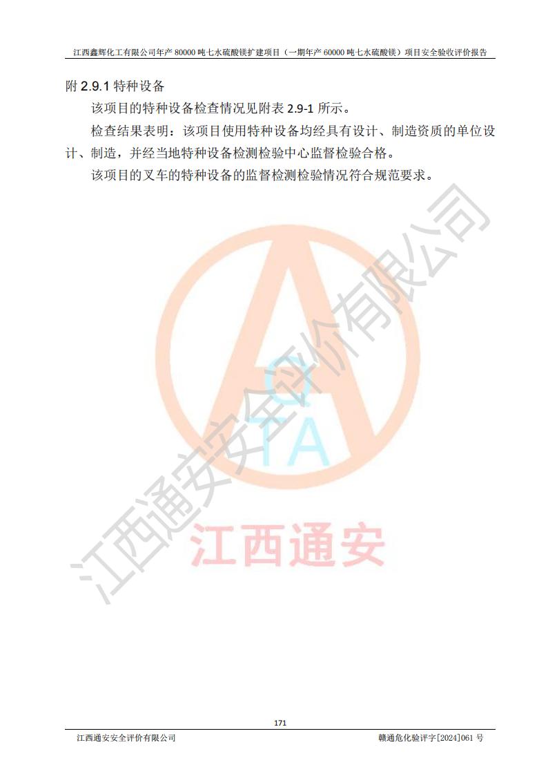 1. 江西鑫輝化工有限公司年產(chǎn)80000噸七水硫酸鎂擴(kuò)建項(xiàng)目(一期年產(chǎn)60000噸七水硫酸鎂)項(xiàng)目的安全設(shè)施與主體工程同時(shí)設(shè)計(jì)、同時(shí)施工、同時(shí)投入生產(chǎn)和使用,符合**有關(guān)建設(shè)項(xiàng)目“三同時(shí)”的規(guī)定和要求。 2. 江西鑫輝化工有限公司年產(chǎn)80000噸七水硫酸鎂擴(kuò)建項(xiàng)目(一期年產(chǎn)60000噸七水硫酸鎂)符合新干縣鹽化工業(yè)城發(fā)展規(guī)劃的布局; 3. 該項(xiàng)目現(xiàn)場情況、企業(yè)總平面布置、設(shè)備設(shè)施的布置與設(shè)計(jì)圖、竣工圖紙一致,主體工程安全設(shè)施、安全措施符合法律法規(guī)的規(guī)定和要求,安全設(shè)施正常投用并運(yùn)行**;供配電、給排水等公用工程及輔助設(shè)施滿足主體工程生產(chǎn)安全的需要;企業(yè)安全管理體系滿足生產(chǎn)安全的要求; 4. 總平面布置符合《建筑設(shè)計(jì)防火規(guī)范》GB50016-2014(2018年版)、《精細(xì)化工企業(yè)工程設(shè)計(jì)防火標(biāo)準(zhǔn)》GB51283-2020等標(biāo)準(zhǔn)、規(guī)范的要求; 5. 公司已針對(duì)本報(bào)告提出的安全隱患整改意見組織人員進(jìn)行整改,整改措施已落實(shí)到位,企業(yè)安全生產(chǎn)的風(fēng)險(xiǎn)控制在可以接受的范圍內(nèi); 6. 該項(xiàng)目采用成熟的生產(chǎn)工藝和設(shè)備,本質(zhì)安全程度較高。 7. 綜上所述:本報(bào)告認(rèn)為,江西鑫輝化工有限公司年產(chǎn)80000噸七水硫酸鎂擴(kuò)建項(xiàng)目(一期年產(chǎn)60000噸七水硫酸鎂)項(xiàng)目的生產(chǎn)裝置現(xiàn)場情況與設(shè)計(jì)圖紙一致,安全設(shè)施及安全管理符合**及有關(guān)部門關(guān)于安全生產(chǎn)法律、法規(guī)、標(biāo)準(zhǔn)的要求,安全風(fēng)險(xiǎn)是受控制的,其風(fēng)險(xiǎn)程度是可以接受的,符合安全生產(chǎn)條件,能夠滿足安全生產(chǎn)的要求,具備安全設(shè)施“三同時(shí)”驗(yàn)收條件。 |