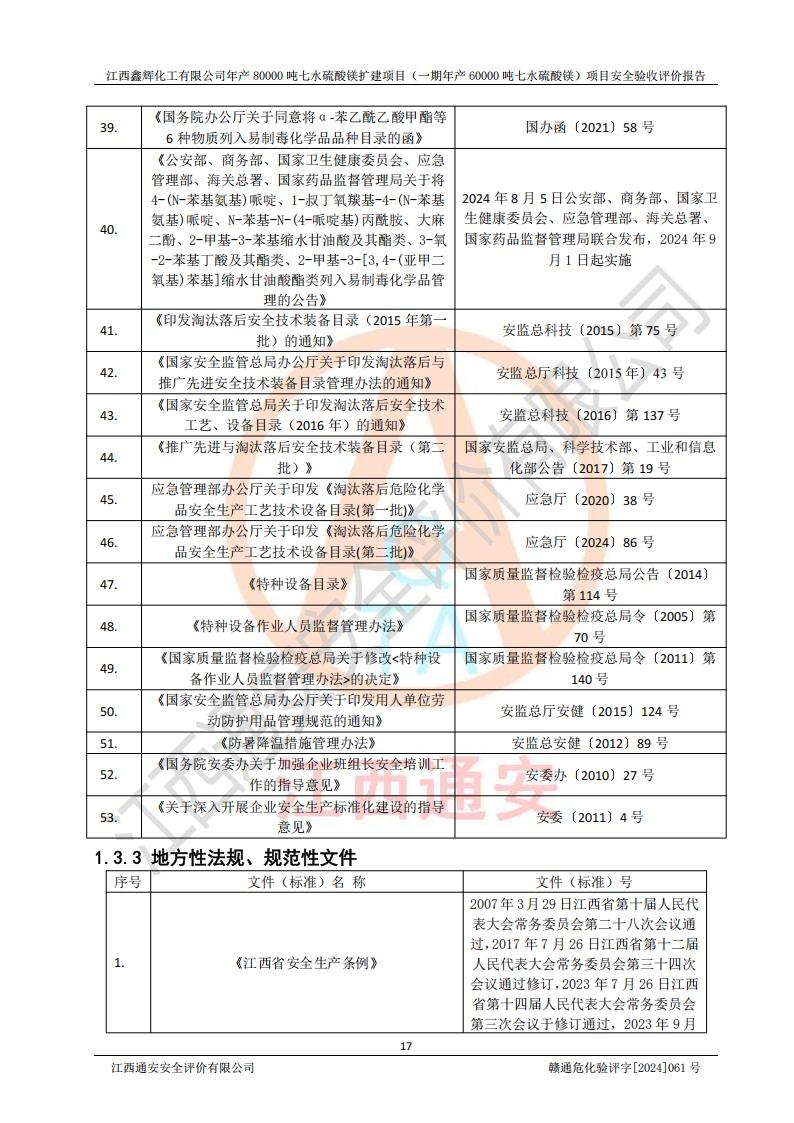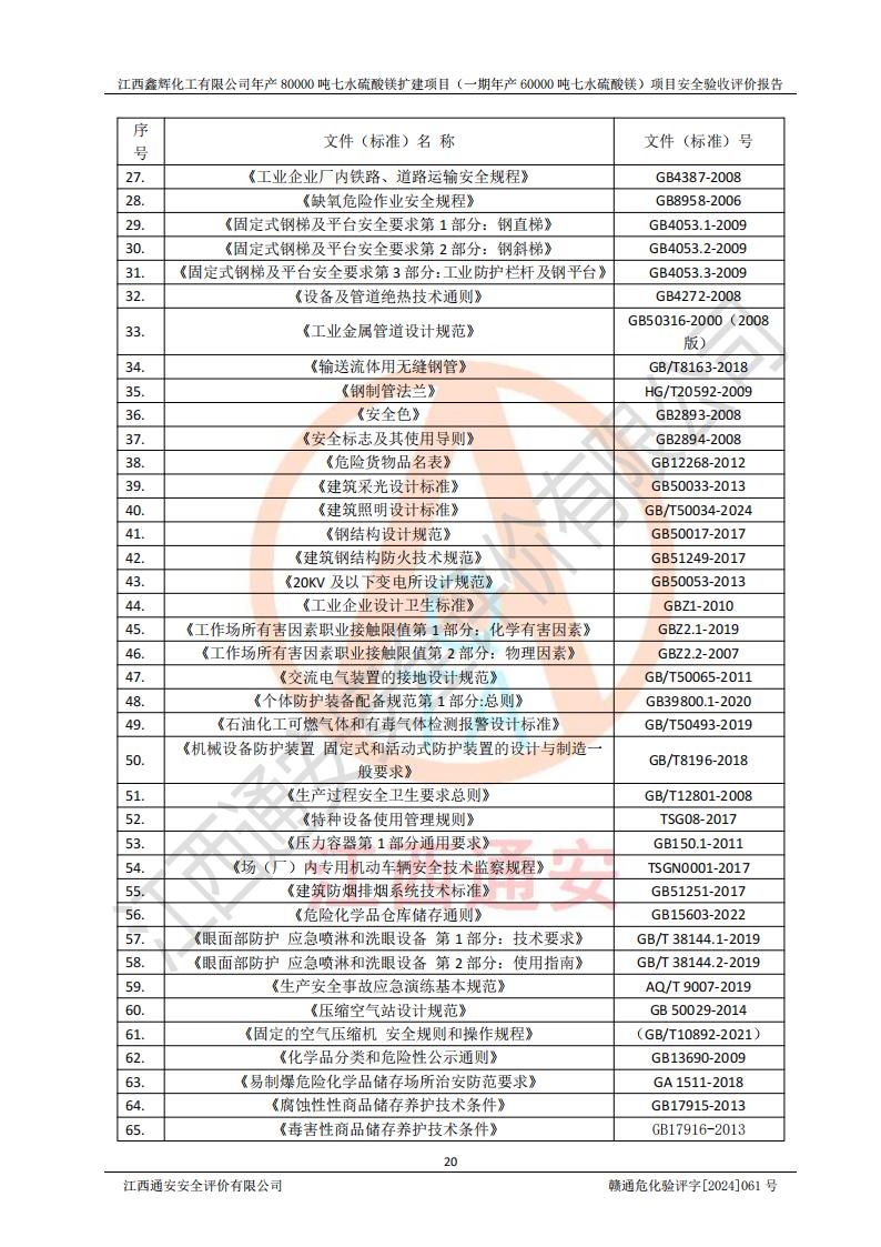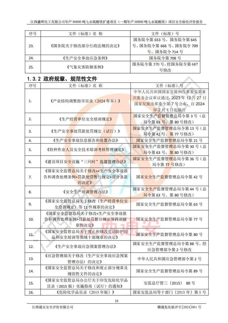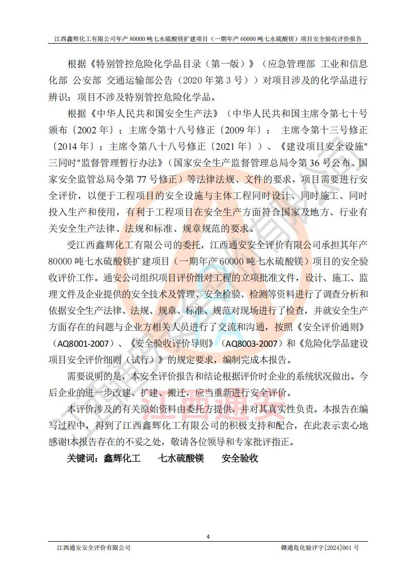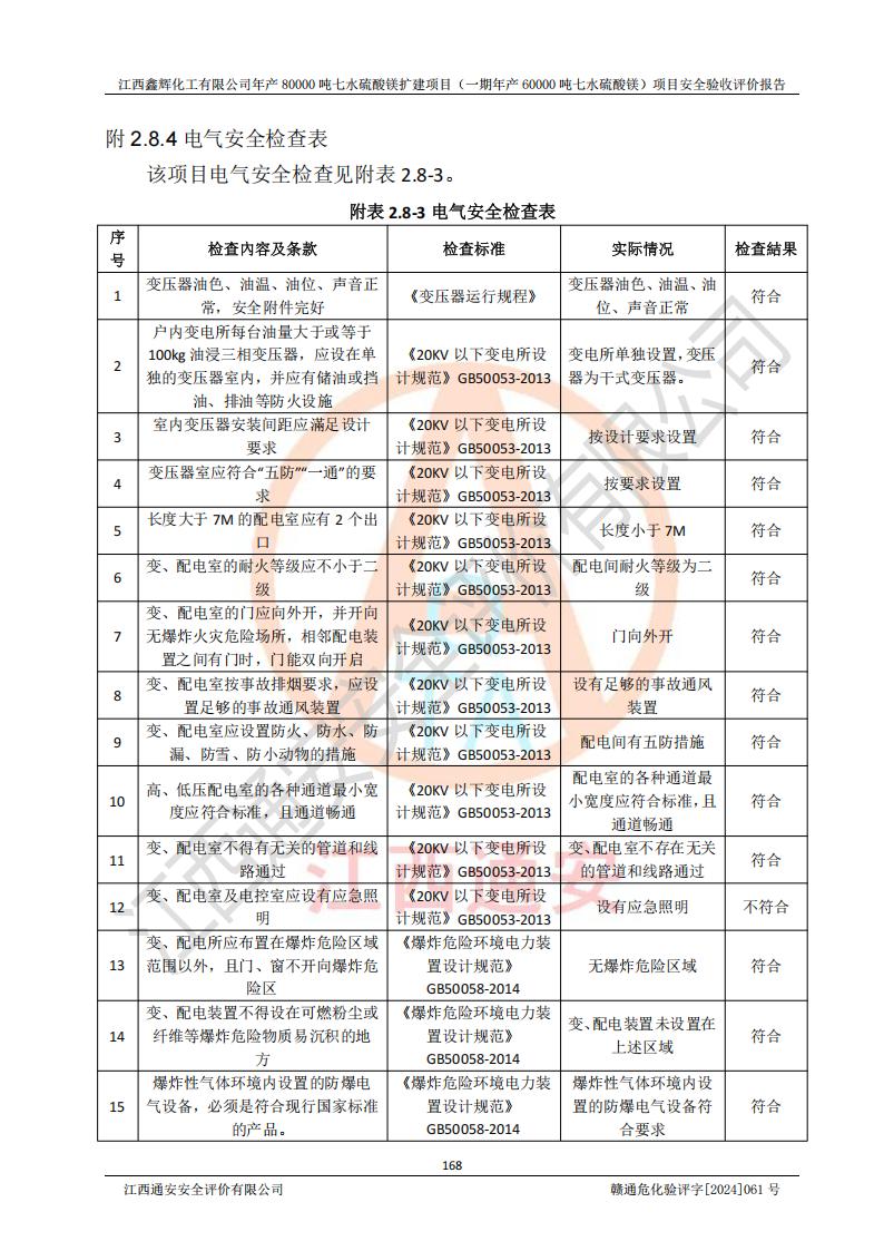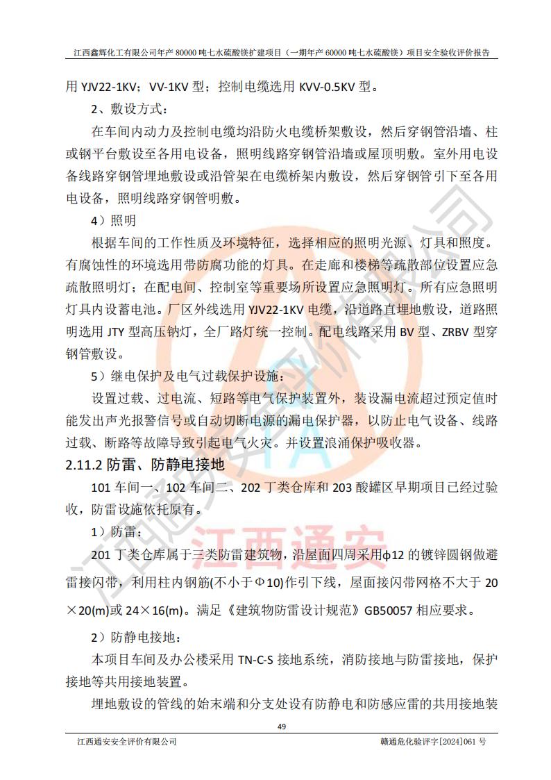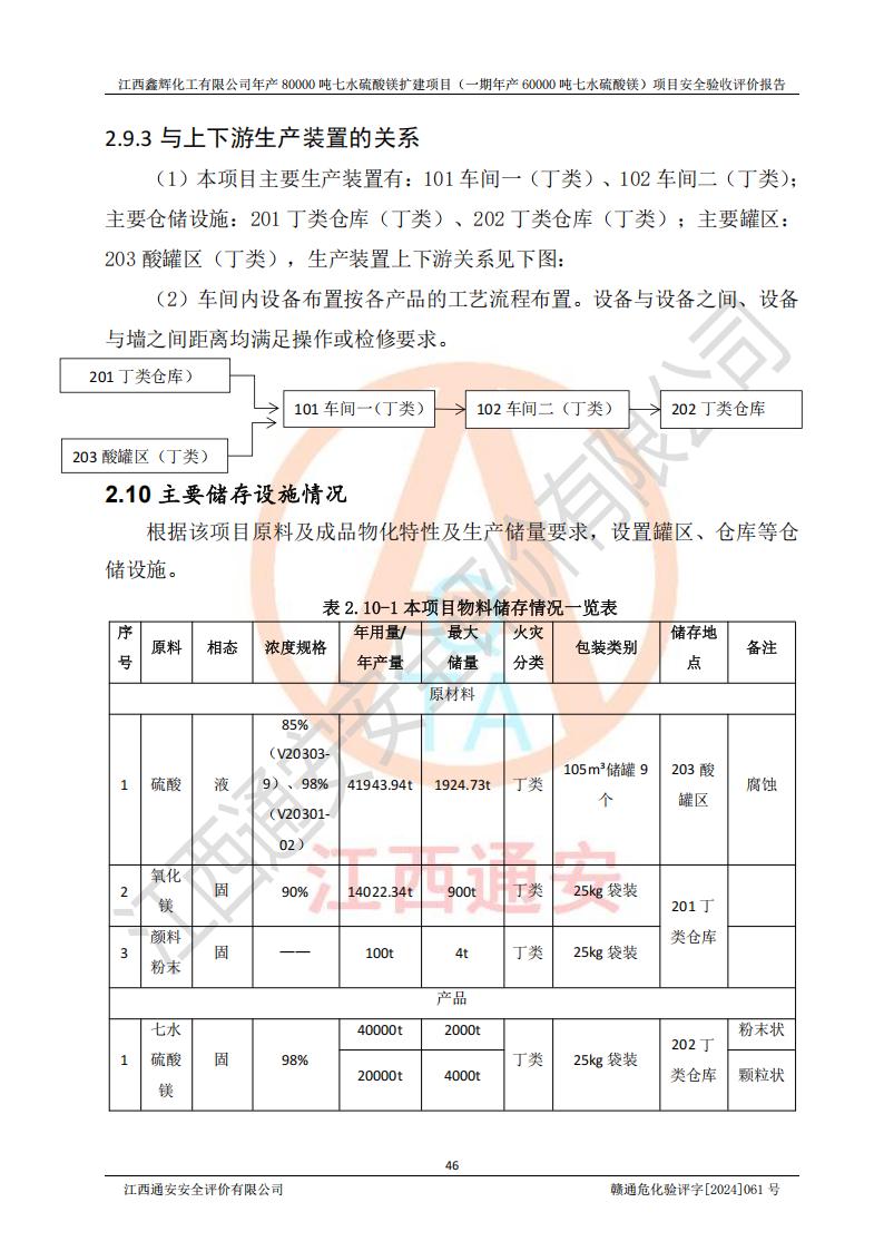 1. 江西鑫輝化工有限公司年產(chǎn)80000噸七水硫酸鎂擴(kuò)建項(xiàng)目(一期年產(chǎn)60000噸七水硫酸鎂)項(xiàng)目的安全設(shè)施與主體工程同時(shí)設(shè)計(jì)、同時(shí)施工、同時(shí)投入生產(chǎn)和使用,符合**有關(guān)建設(shè)項(xiàng)目“三同時(shí)”的規(guī)定和要求。 2. 江西鑫輝化工有限公司年產(chǎn)80000噸七水硫酸鎂擴(kuò)建項(xiàng)目(一期年產(chǎn)60000噸七水硫酸鎂)符合新干縣鹽化工業(yè)城發(fā)展規(guī)劃的布局; 3. 該項(xiàng)目現(xiàn)場情況、企業(yè)總平面布置、設(shè)備設(shè)施的布置與設(shè)計(jì)圖、竣工圖紙一致,主體工程安全設(shè)施、安全措施符合法律法規(guī)的規(guī)定和要求,安全設(shè)施正常投用并運(yùn)行**;供配電、給排水等公用工程及輔助設(shè)施滿足主體工程生產(chǎn)安全的需要;企業(yè)安全管理體系滿足生產(chǎn)安全的要求; 4. 總平面布置符合《建筑設(shè)計(jì)防火規(guī)范》GB50016-2014(2018年版)、《精細(xì)化工企業(yè)工程設(shè)計(jì)防火標(biāo)準(zhǔn)》GB51283-2020等標(biāo)準(zhǔn)、規(guī)范的要求; 5. 公司已針對(duì)本報(bào)告提出的安全隱患整改意見組織人員進(jìn)行整改,整改措施已落實(shí)到位,企業(yè)安全生產(chǎn)的風(fēng)險(xiǎn)控制在可以接受的范圍內(nèi); 6. 該項(xiàng)目采用成熟的生產(chǎn)工藝和設(shè)備,本質(zhì)安全程度較高。 7. 綜上所述:本報(bào)告認(rèn)為,江西鑫輝化工有限公司年產(chǎn)80000噸七水硫酸鎂擴(kuò)建項(xiàng)目(一期年產(chǎn)60000噸七水硫酸鎂)項(xiàng)目的生產(chǎn)裝置現(xiàn)場情況與設(shè)計(jì)圖紙一致,安全設(shè)施及安全管理符合**及有關(guān)部門關(guān)于安全生產(chǎn)法律、法規(guī)、標(biāo)準(zhǔn)的要求,安全風(fēng)險(xiǎn)是受控制的,其風(fēng)險(xiǎn)程度是可以接受的,符合安全生產(chǎn)條件,能夠滿足安全生產(chǎn)的要求,具備安全設(shè)施“三同時(shí)”驗(yàn)收條件。 |