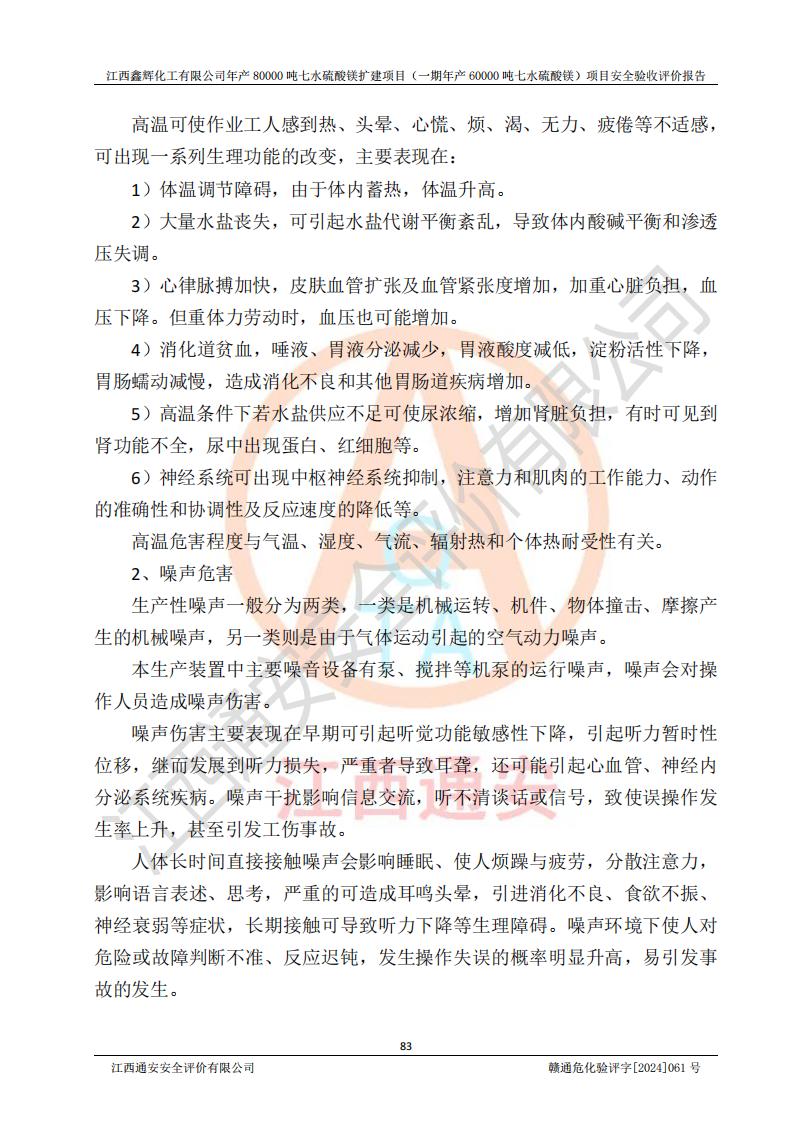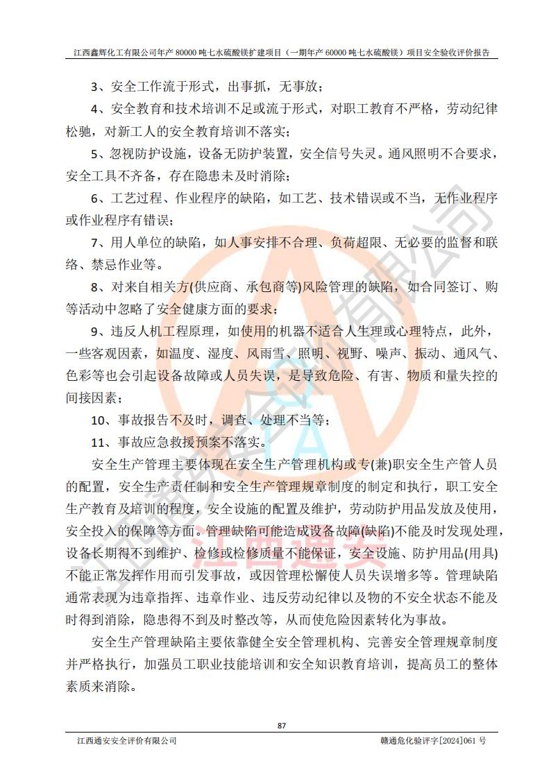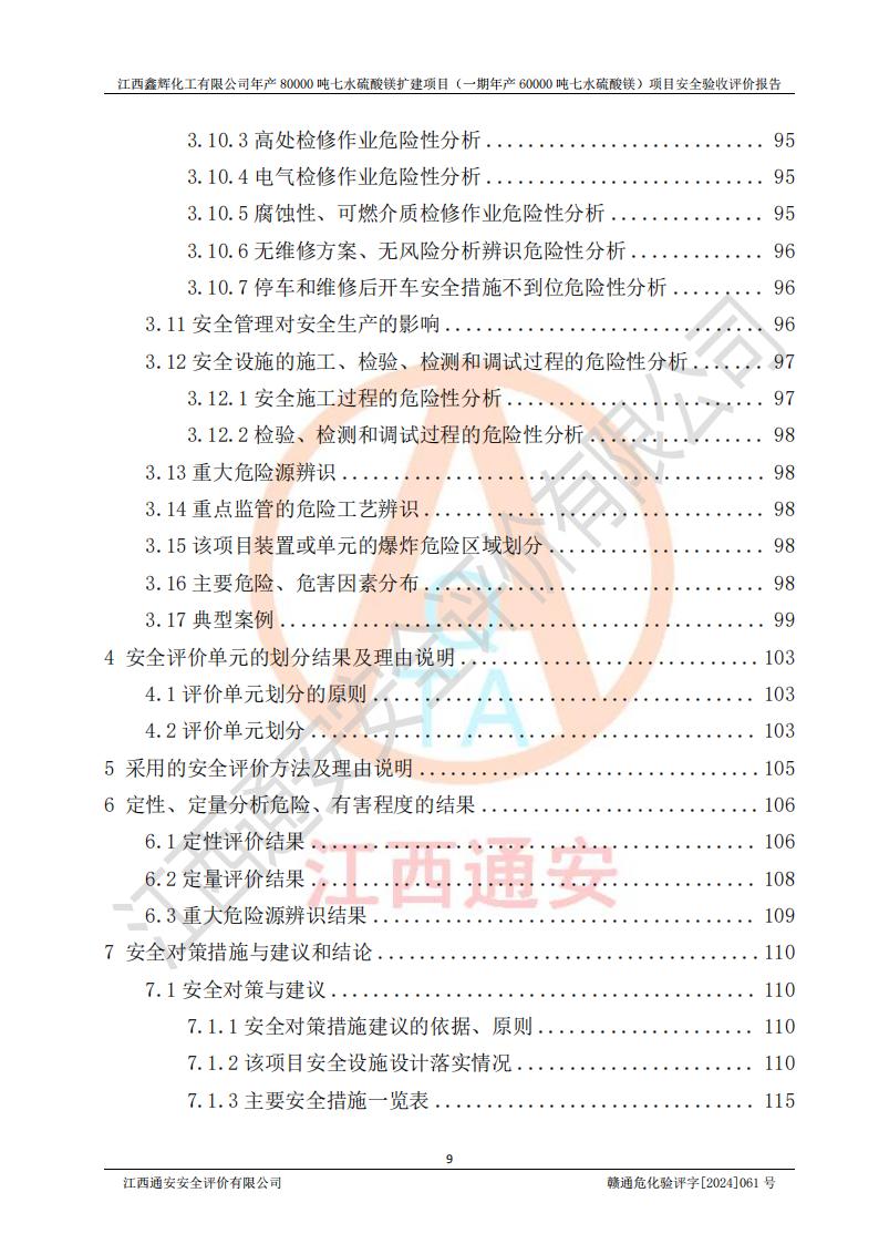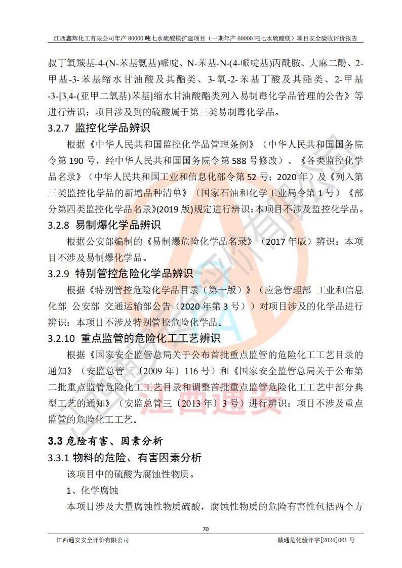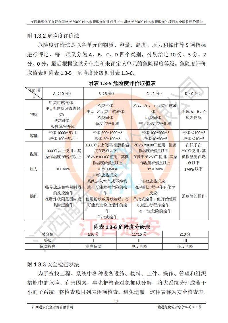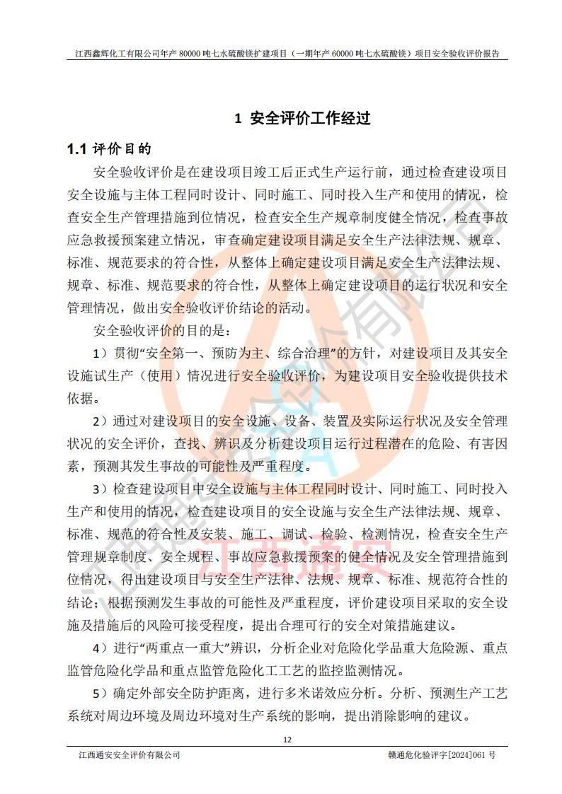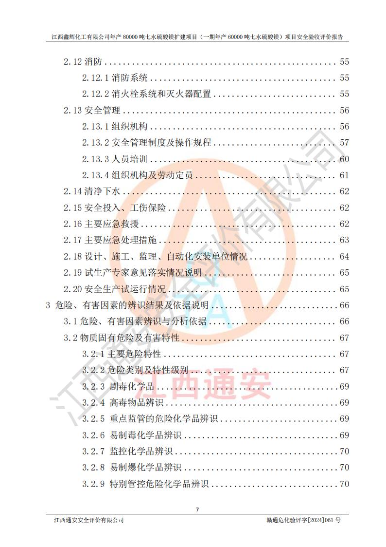 1. 江西鑫輝化工有限公司年產(chǎn)80000噸七水硫酸鎂擴(kuò)建項(xiàng)目(一期年產(chǎn)60000噸七水硫酸鎂)項(xiàng)目的安全設(shè)施與主體工程同時(shí)設(shè)計(jì)、同時(shí)施工、同時(shí)投入生產(chǎn)和使用,符合**有關(guān)建設(shè)項(xiàng)目“三同時(shí)”的規(guī)定和要求。 2. 江西鑫輝化工有限公司年產(chǎn)80000噸七水硫酸鎂擴(kuò)建項(xiàng)目(一期年產(chǎn)60000噸七水硫酸鎂)符合新干縣鹽化工業(yè)城發(fā)展規(guī)劃的布局; 3. 該項(xiàng)目現(xiàn)場情況、企業(yè)總平面布置、設(shè)備設(shè)施的布置與設(shè)計(jì)圖、竣工圖紙一致,主體工程安全設(shè)施、安全措施符合法律法規(guī)的規(guī)定和要求,安全設(shè)施正常投用并運(yùn)行**;供配電、給排水等公用工程及輔助設(shè)施滿足主體工程生產(chǎn)安全的需要;企業(yè)安全管理體系滿足生產(chǎn)安全的要求; 4. 總平面布置符合《建筑設(shè)計(jì)防火規(guī)范》GB50016-2014(2018年版)、《精細(xì)化工企業(yè)工程設(shè)計(jì)防火標(biāo)準(zhǔn)》GB51283-2020等標(biāo)準(zhǔn)、規(guī)范的要求; 5. 公司已針對(duì)本報(bào)告提出的安全隱患整改意見組織人員進(jìn)行整改,整改措施已落實(shí)到位,企業(yè)安全生產(chǎn)的風(fēng)險(xiǎn)控制在可以接受的范圍內(nèi); 6. 該項(xiàng)目采用成熟的生產(chǎn)工藝和設(shè)備,本質(zhì)安全程度較高。 7. 綜上所述:本報(bào)告認(rèn)為,江西鑫輝化工有限公司年產(chǎn)80000噸七水硫酸鎂擴(kuò)建項(xiàng)目(一期年產(chǎn)60000噸七水硫酸鎂)項(xiàng)目的生產(chǎn)裝置現(xiàn)場情況與設(shè)計(jì)圖紙一致,安全設(shè)施及安全管理符合**及有關(guān)部門關(guān)于安全生產(chǎn)法律、法規(guī)、標(biāo)準(zhǔn)的要求,安全風(fēng)險(xiǎn)是受控制的,其風(fēng)險(xiǎn)程度是可以接受的,符合安全生產(chǎn)條件,能夠滿足安全生產(chǎn)的要求,具備安全設(shè)施“三同時(shí)”驗(yàn)收條件。 |