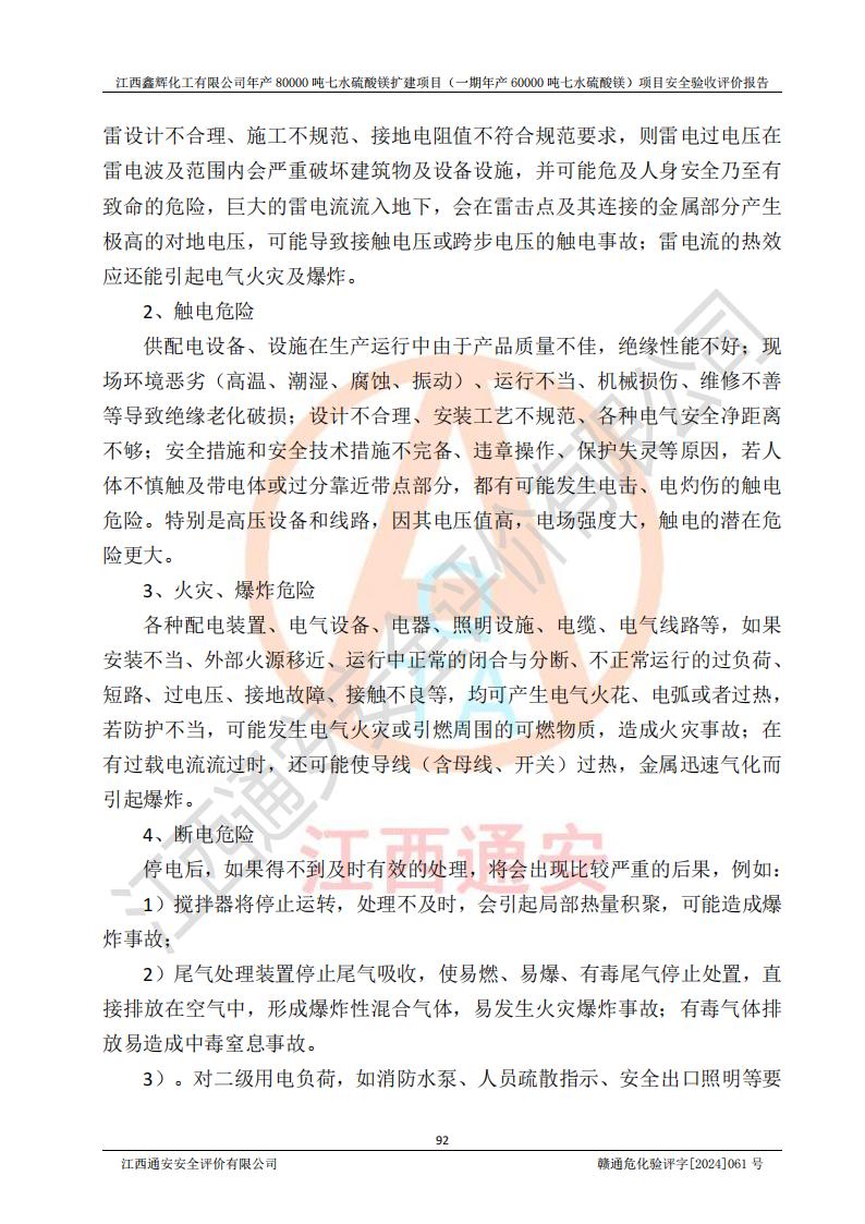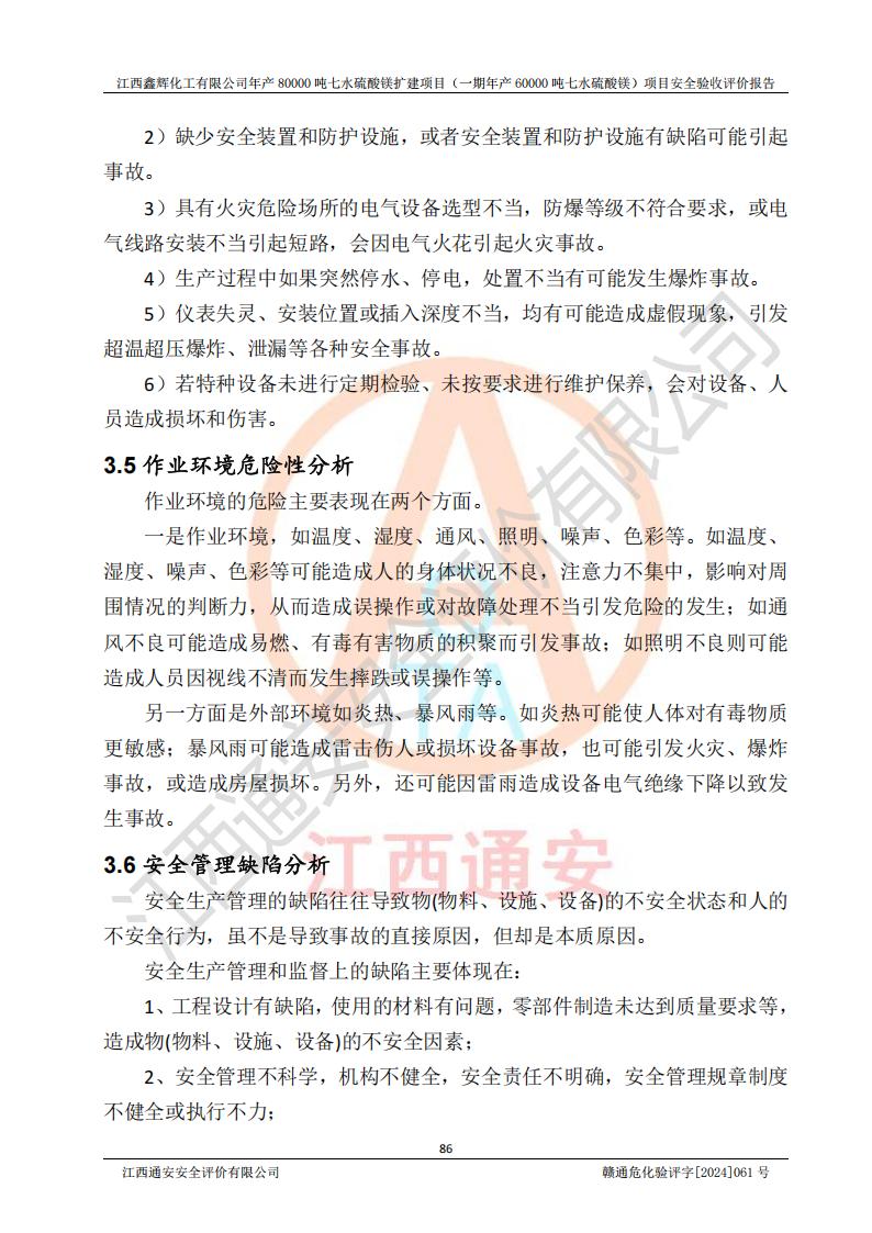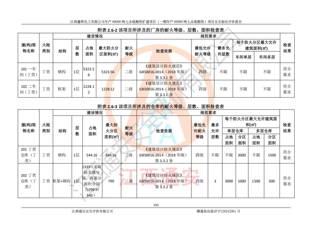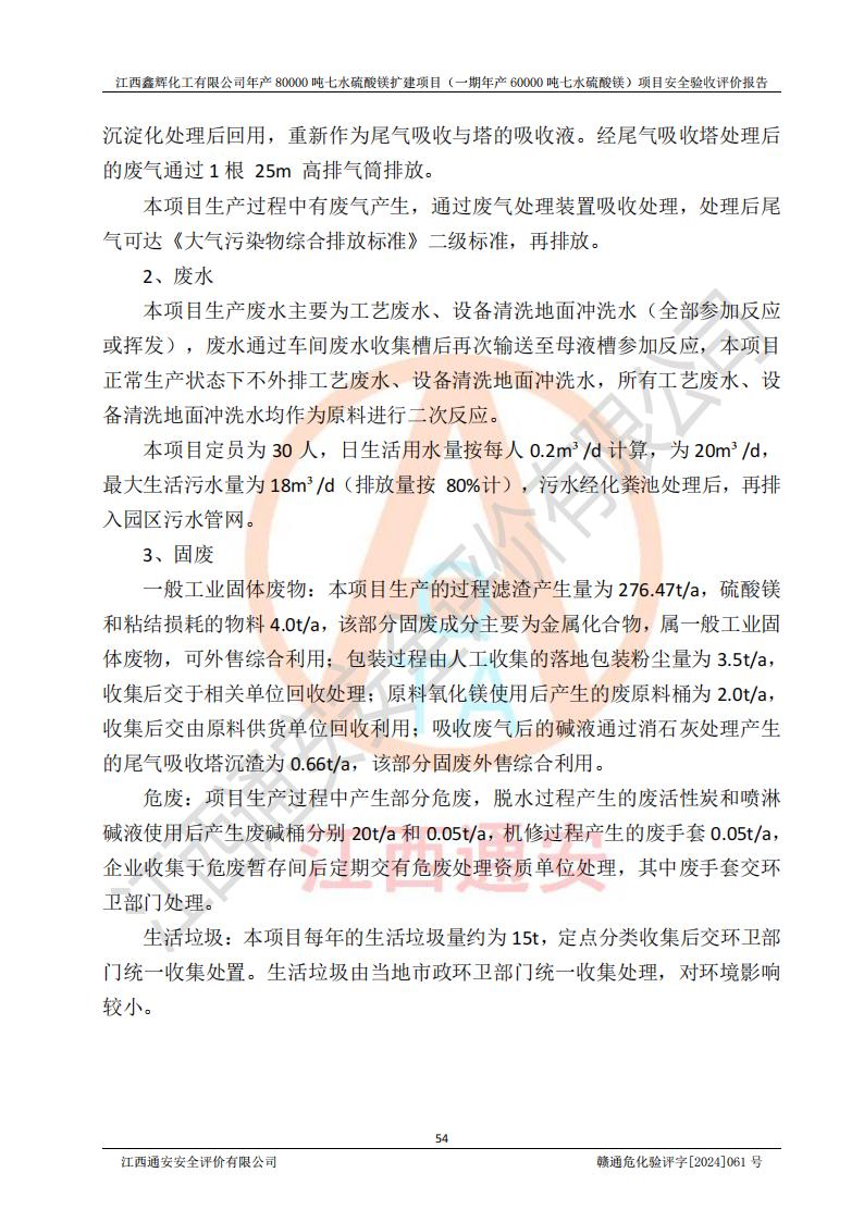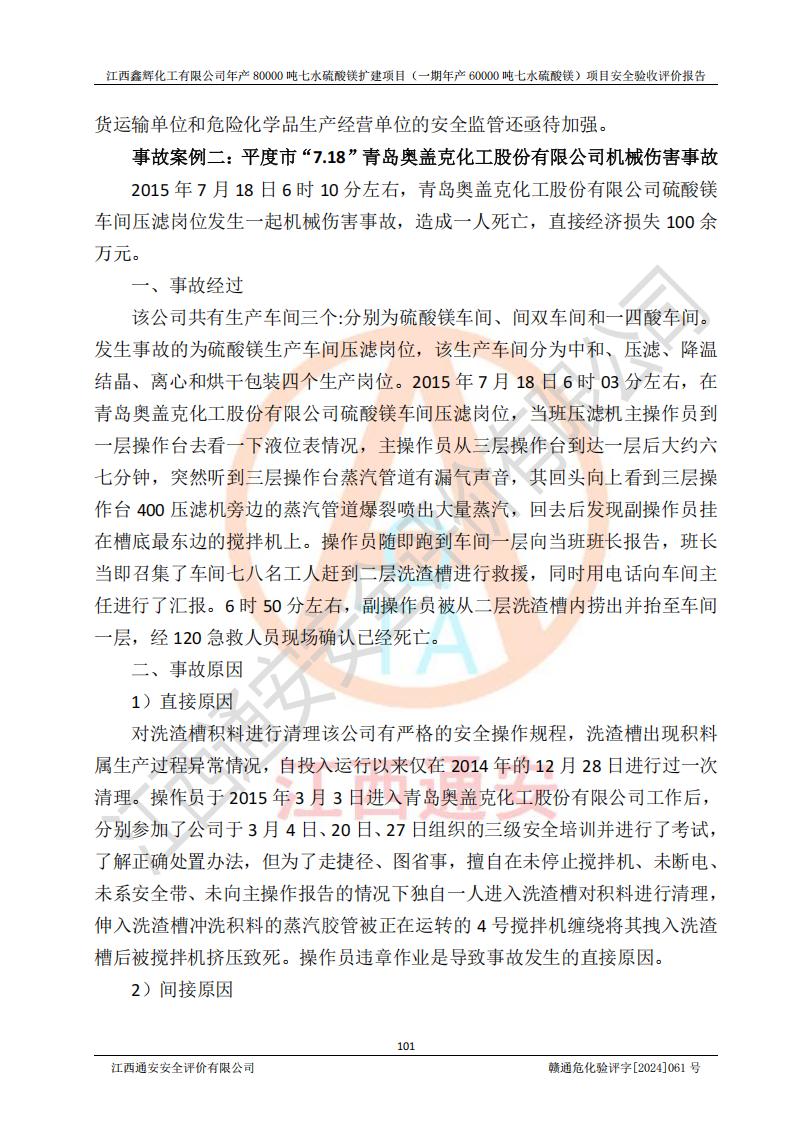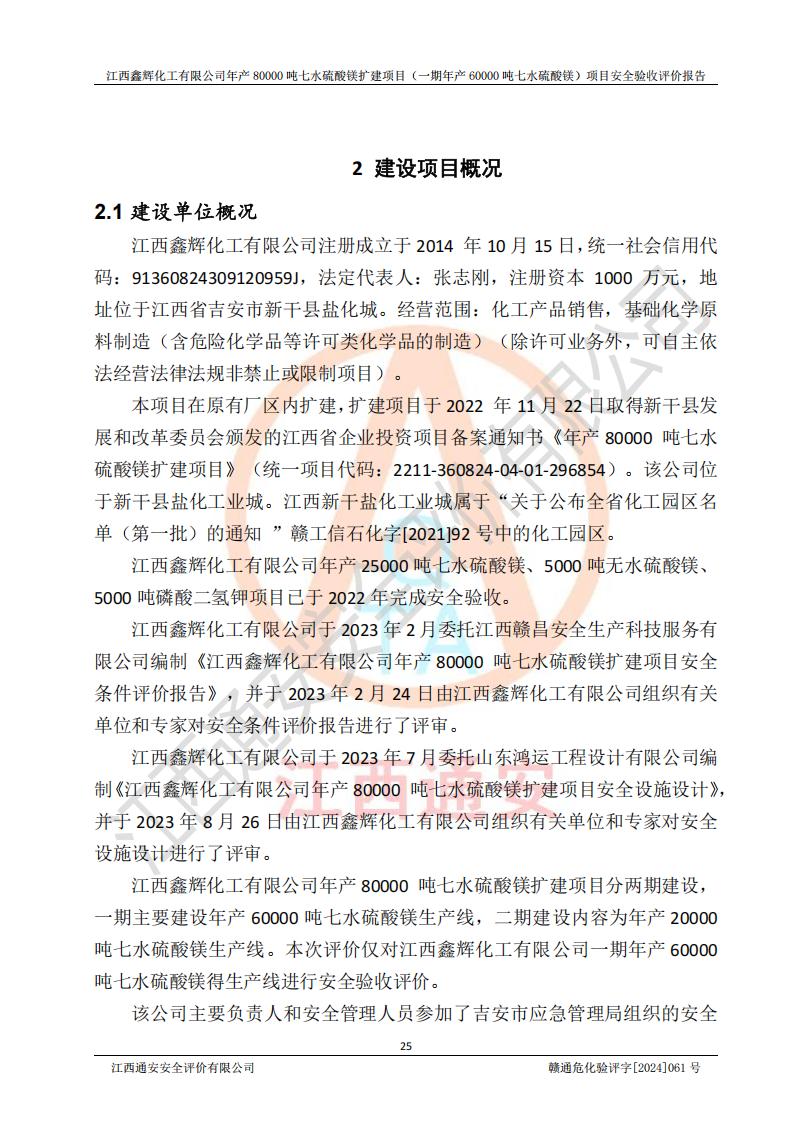 1. 江西鑫輝化工有限公司年產(chǎn)80000噸七水硫酸鎂擴(kuò)建項(xiàng)目(一期年產(chǎn)60000噸七水硫酸鎂)項(xiàng)目的安全設(shè)施與主體工程同時(shí)設(shè)計(jì)、同時(shí)施工、同時(shí)投入生產(chǎn)和使用,符合**有關(guān)建設(shè)項(xiàng)目“三同時(shí)”的規(guī)定和要求。 2. 江西鑫輝化工有限公司年產(chǎn)80000噸七水硫酸鎂擴(kuò)建項(xiàng)目(一期年產(chǎn)60000噸七水硫酸鎂)符合新干縣鹽化工業(yè)城發(fā)展規(guī)劃的布局; 3. 該項(xiàng)目現(xiàn)場情況、企業(yè)總平面布置、設(shè)備設(shè)施的布置與設(shè)計(jì)圖、竣工圖紙一致,主體工程安全設(shè)施、安全措施符合法律法規(guī)的規(guī)定和要求,安全設(shè)施正常投用并運(yùn)行**;供配電、給排水等公用工程及輔助設(shè)施滿足主體工程生產(chǎn)安全的需要;企業(yè)安全管理體系滿足生產(chǎn)安全的要求; 4. 總平面布置符合《建筑設(shè)計(jì)防火規(guī)范》GB50016-2014(2018年版)、《精細(xì)化工企業(yè)工程設(shè)計(jì)防火標(biāo)準(zhǔn)》GB51283-2020等標(biāo)準(zhǔn)、規(guī)范的要求; 5. 公司已針對(duì)本報(bào)告提出的安全隱患整改意見組織人員進(jìn)行整改,整改措施已落實(shí)到位,企業(yè)安全生產(chǎn)的風(fēng)險(xiǎn)控制在可以接受的范圍內(nèi); 6. 該項(xiàng)目采用成熟的生產(chǎn)工藝和設(shè)備,本質(zhì)安全程度較高。 7. 綜上所述:本報(bào)告認(rèn)為,江西鑫輝化工有限公司年產(chǎn)80000噸七水硫酸鎂擴(kuò)建項(xiàng)目(一期年產(chǎn)60000噸七水硫酸鎂)項(xiàng)目的生產(chǎn)裝置現(xiàn)場情況與設(shè)計(jì)圖紙一致,安全設(shè)施及安全管理符合**及有關(guān)部門關(guān)于安全生產(chǎn)法律、法規(guī)、標(biāo)準(zhǔn)的要求,安全風(fēng)險(xiǎn)是受控制的,其風(fēng)險(xiǎn)程度是可以接受的,符合安全生產(chǎn)條件,能夠滿足安全生產(chǎn)的要求,具備安全設(shè)施“三同時(shí)”驗(yàn)收條件。 |