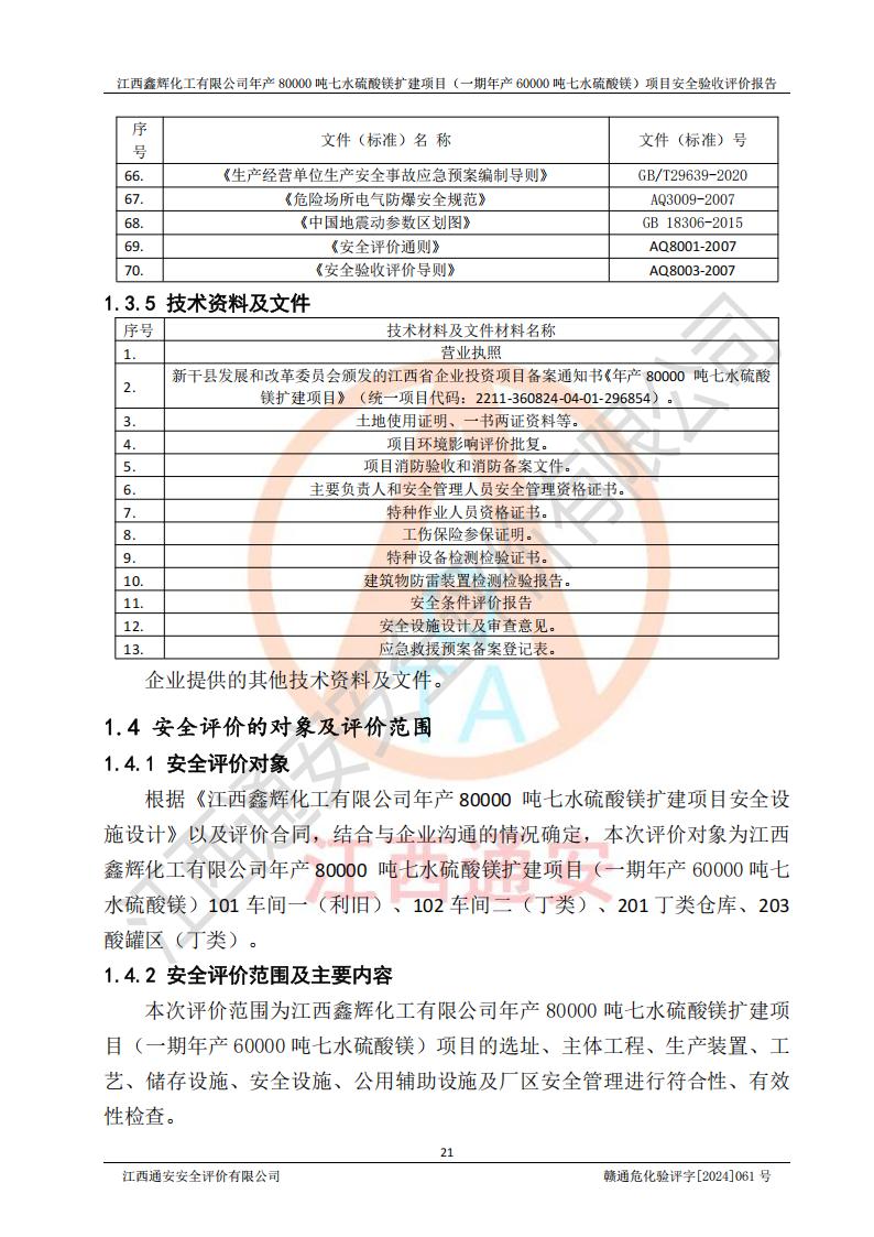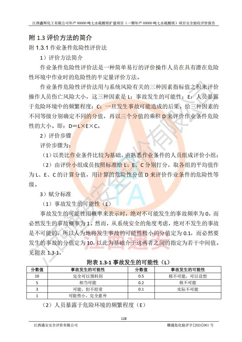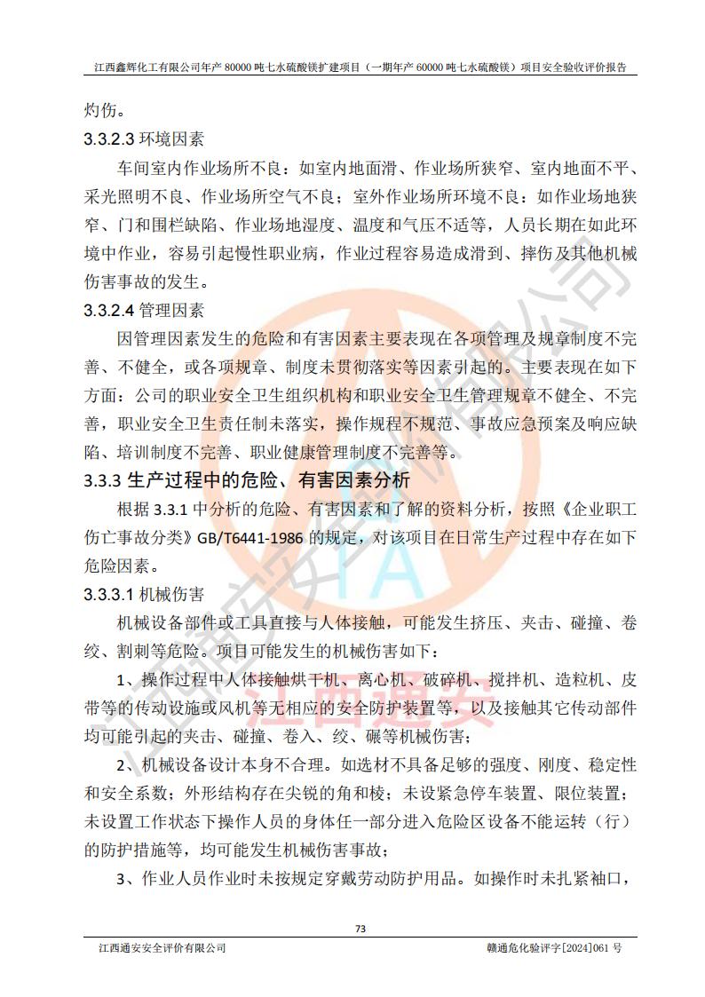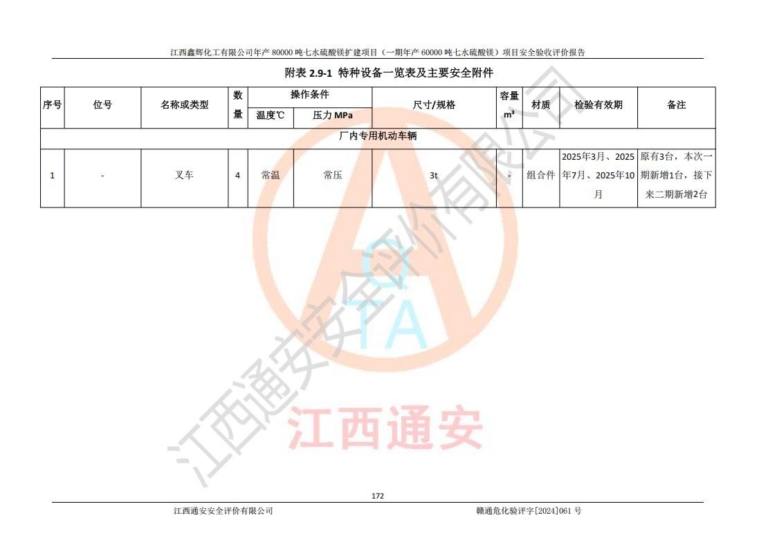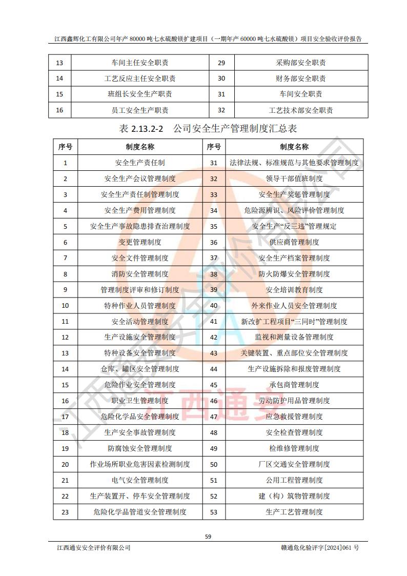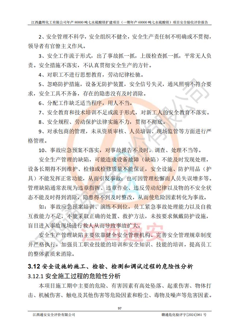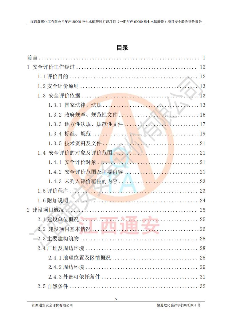1. 江西鑫輝化工有限公司年產(chǎn)80000噸七水硫酸鎂擴(kuò)建項(xiàng)目(一期年產(chǎn)60000噸七水硫酸鎂)項(xiàng)目的安全設(shè)施與主體工程同時(shí)設(shè)計(jì)、同時(shí)施工、同時(shí)投入生產(chǎn)和使用,符合**有關(guān)建設(shè)項(xiàng)目“三同時(shí)”的規(guī)定和要求。 2. 江西鑫輝化工有限公司年產(chǎn)80000噸七水硫酸鎂擴(kuò)建項(xiàng)目(一期年產(chǎn)60000噸七水硫酸鎂)符合新干縣鹽化工業(yè)城發(fā)展規(guī)劃的布局; 3. 該項(xiàng)目現(xiàn)場情況、企業(yè)總平面布置、設(shè)備設(shè)施的布置與設(shè)計(jì)圖、竣工圖紙一致,主體工程安全設(shè)施、安全措施符合法律法規(guī)的規(guī)定和要求,安全設(shè)施正常投用并運(yùn)行**;供配電、給排水等公用工程及輔助設(shè)施滿足主體工程生產(chǎn)安全的需要;企業(yè)安全管理體系滿足生產(chǎn)安全的要求; 4. 總平面布置符合《建筑設(shè)計(jì)防火規(guī)范》GB50016-2014(2018年版)、《精細(xì)化工企業(yè)工程設(shè)計(jì)防火標(biāo)準(zhǔn)》GB51283-2020等標(biāo)準(zhǔn)、規(guī)范的要求; 5. 公司已針對(duì)本報(bào)告提出的安全隱患整改意見組織人員進(jìn)行整改,整改措施已落實(shí)到位,企業(yè)安全生產(chǎn)的風(fēng)險(xiǎn)控制在可以接受的范圍內(nèi); 6. 該項(xiàng)目采用成熟的生產(chǎn)工藝和設(shè)備,本質(zhì)安全程度較高。 7. 綜上所述:本報(bào)告認(rèn)為,江西鑫輝化工有限公司年產(chǎn)80000噸七水硫酸鎂擴(kuò)建項(xiàng)目(一期年產(chǎn)60000噸七水硫酸鎂)項(xiàng)目的生產(chǎn)裝置現(xiàn)場情況與設(shè)計(jì)圖紙一致,安全設(shè)施及安全管理符合**及有關(guān)部門關(guān)于安全生產(chǎn)法律、法規(guī)、標(biāo)準(zhǔn)的要求,安全風(fēng)險(xiǎn)是受控制的,其風(fēng)險(xiǎn)程度是可以接受的,符合安全生產(chǎn)條件,能夠滿足安全生產(chǎn)的要求,具備安全設(shè)施“三同時(shí)”驗(yàn)收條件。 |