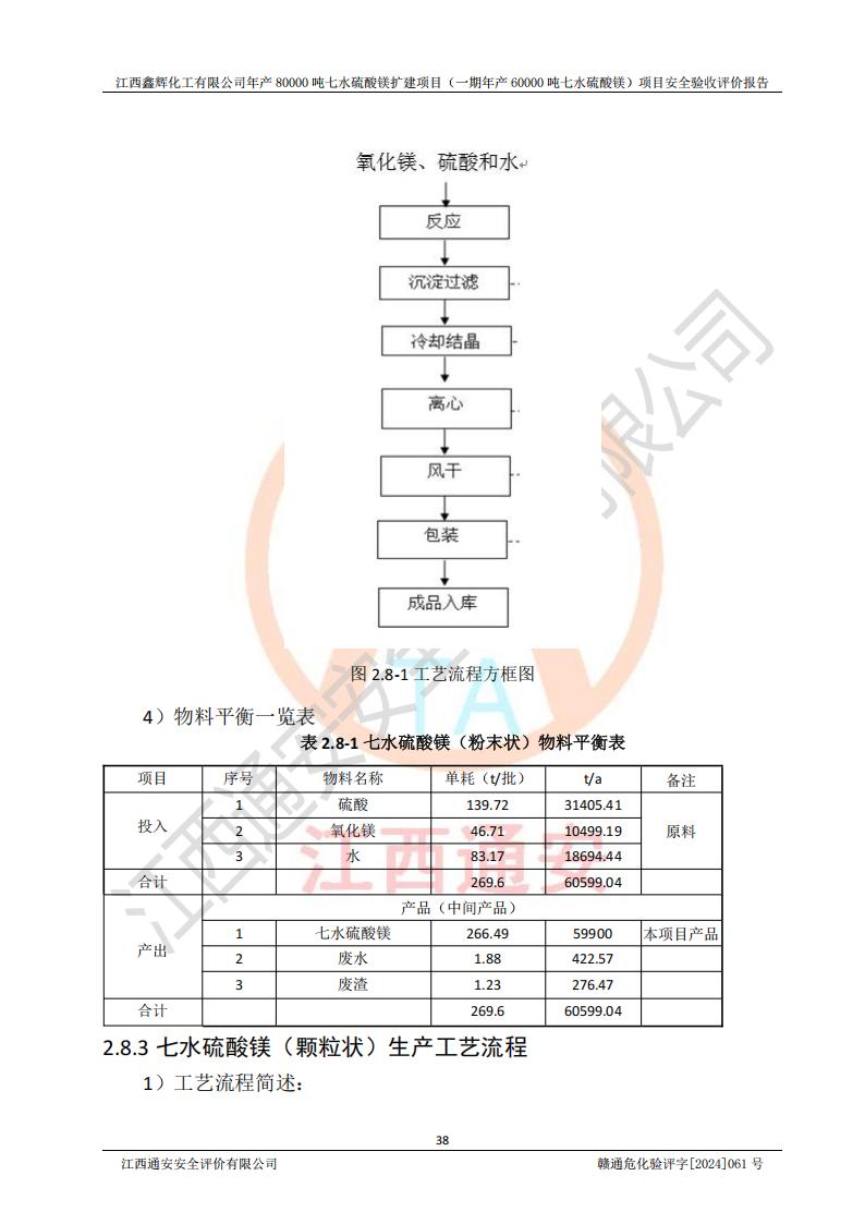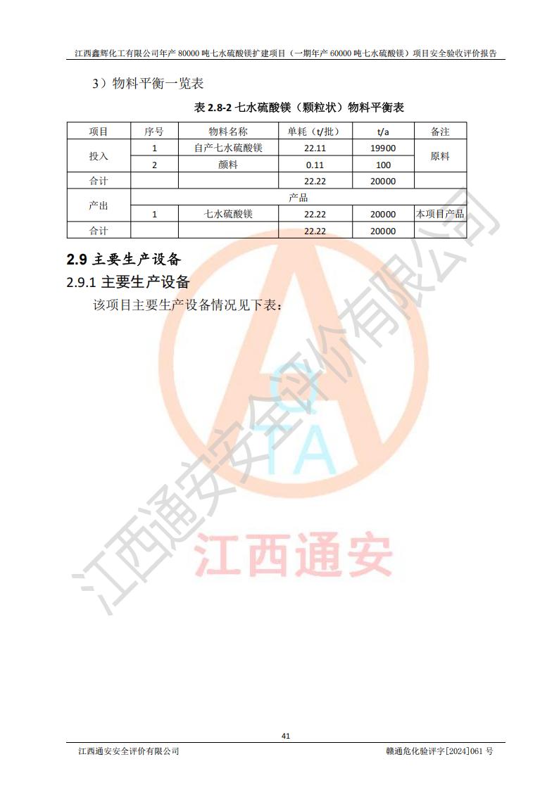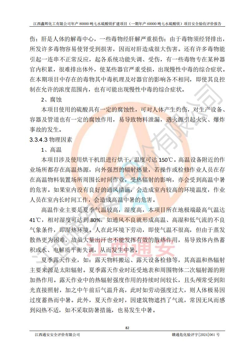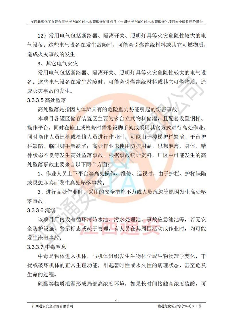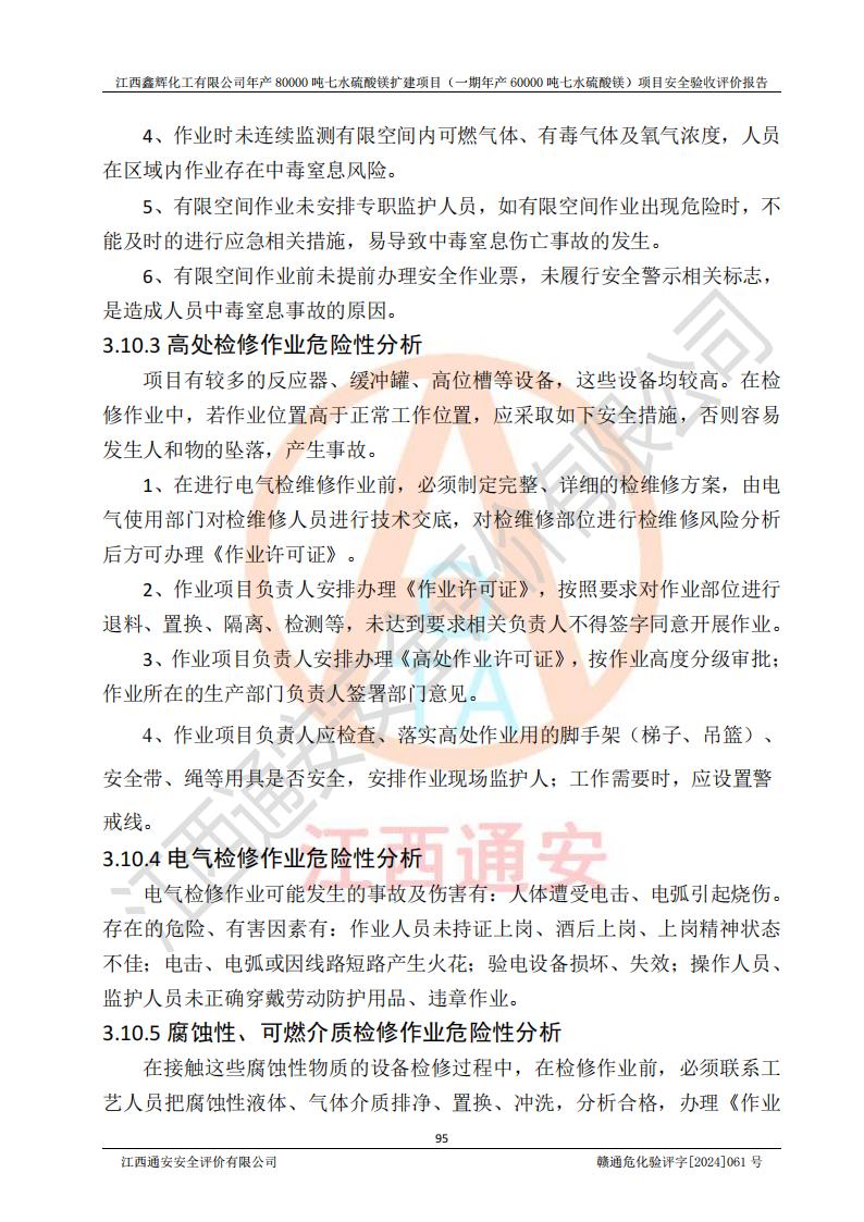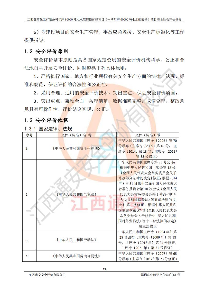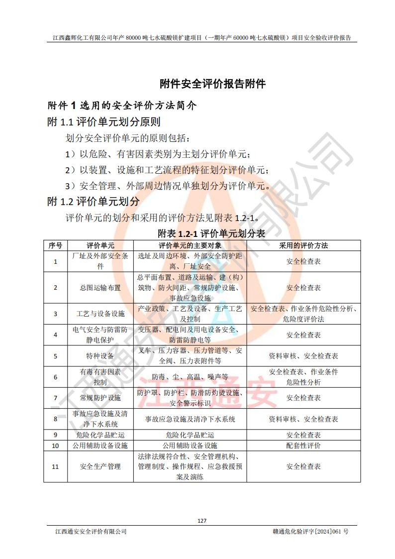 1. 江西鑫輝化工有限公司年產(chǎn)80000噸七水硫酸鎂擴(kuò)建項(xiàng)目(一期年產(chǎn)60000噸七水硫酸鎂)項(xiàng)目的安全設(shè)施與主體工程同時(shí)設(shè)計(jì)、同時(shí)施工、同時(shí)投入生產(chǎn)和使用,符合**有關(guān)建設(shè)項(xiàng)目“三同時(shí)”的規(guī)定和要求。 2. 江西鑫輝化工有限公司年產(chǎn)80000噸七水硫酸鎂擴(kuò)建項(xiàng)目(一期年產(chǎn)60000噸七水硫酸鎂)符合新干縣鹽化工業(yè)城發(fā)展規(guī)劃的布局; 3. 該項(xiàng)目現(xiàn)場情況、企業(yè)總平面布置、設(shè)備設(shè)施的布置與設(shè)計(jì)圖、竣工圖紙一致,主體工程安全設(shè)施、安全措施符合法律法規(guī)的規(guī)定和要求,安全設(shè)施正常投用并運(yùn)行**;供配電、給排水等公用工程及輔助設(shè)施滿足主體工程生產(chǎn)安全的需要;企業(yè)安全管理體系滿足生產(chǎn)安全的要求; 4. 總平面布置符合《建筑設(shè)計(jì)防火規(guī)范》GB50016-2014(2018年版)、《精細(xì)化工企業(yè)工程設(shè)計(jì)防火標(biāo)準(zhǔn)》GB51283-2020等標(biāo)準(zhǔn)、規(guī)范的要求; 5. 公司已針對(duì)本報(bào)告提出的安全隱患整改意見組織人員進(jìn)行整改,整改措施已落實(shí)到位,企業(yè)安全生產(chǎn)的風(fēng)險(xiǎn)控制在可以接受的范圍內(nèi); 6. 該項(xiàng)目采用成熟的生產(chǎn)工藝和設(shè)備,本質(zhì)安全程度較高。 7. 綜上所述:本報(bào)告認(rèn)為,江西鑫輝化工有限公司年產(chǎn)80000噸七水硫酸鎂擴(kuò)建項(xiàng)目(一期年產(chǎn)60000噸七水硫酸鎂)項(xiàng)目的生產(chǎn)裝置現(xiàn)場情況與設(shè)計(jì)圖紙一致,安全設(shè)施及安全管理符合**及有關(guān)部門關(guān)于安全生產(chǎn)法律、法規(guī)、標(biāo)準(zhǔn)的要求,安全風(fēng)險(xiǎn)是受控制的,其風(fēng)險(xiǎn)程度是可以接受的,符合安全生產(chǎn)條件,能夠滿足安全生產(chǎn)的要求,具備安全設(shè)施“三同時(shí)”驗(yàn)收條件。 |