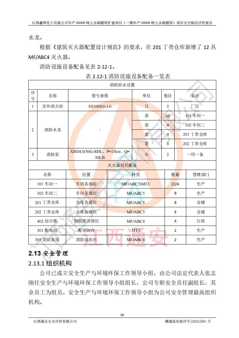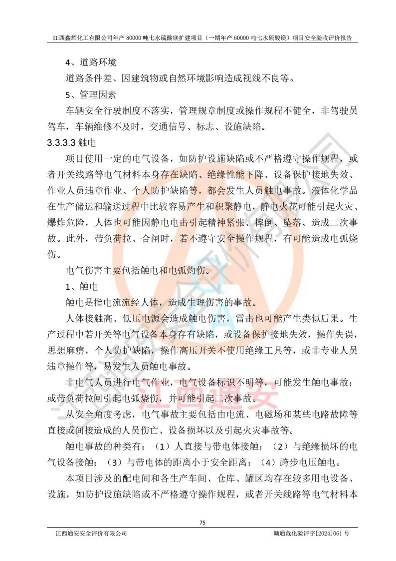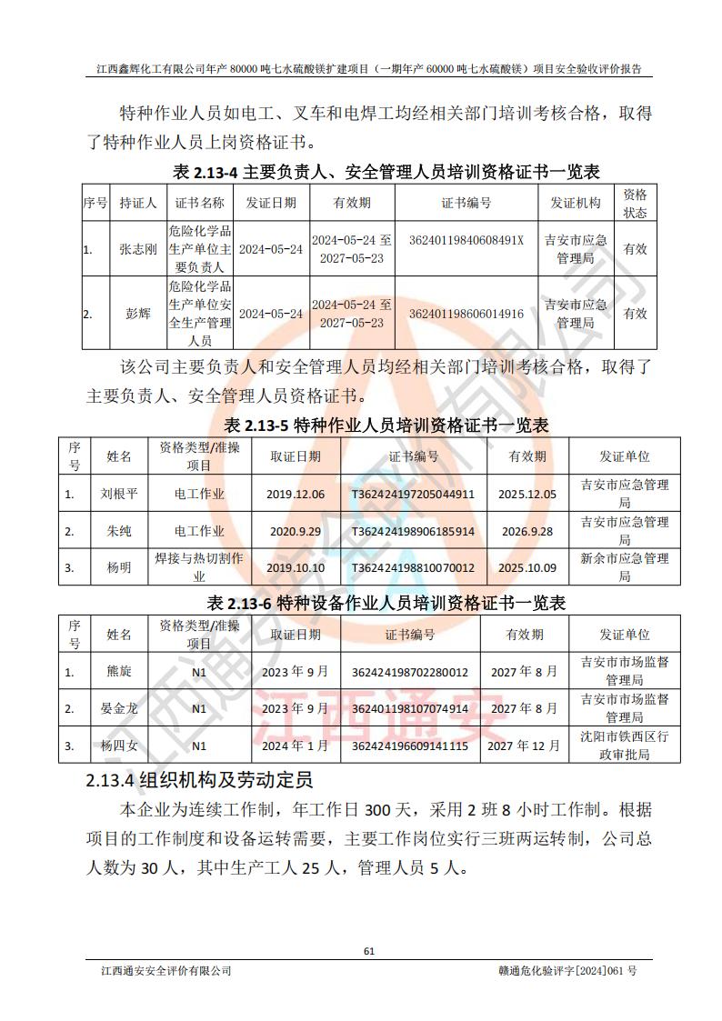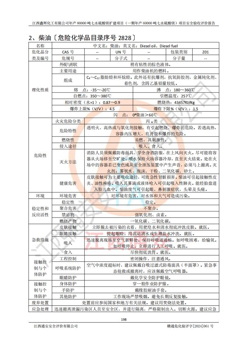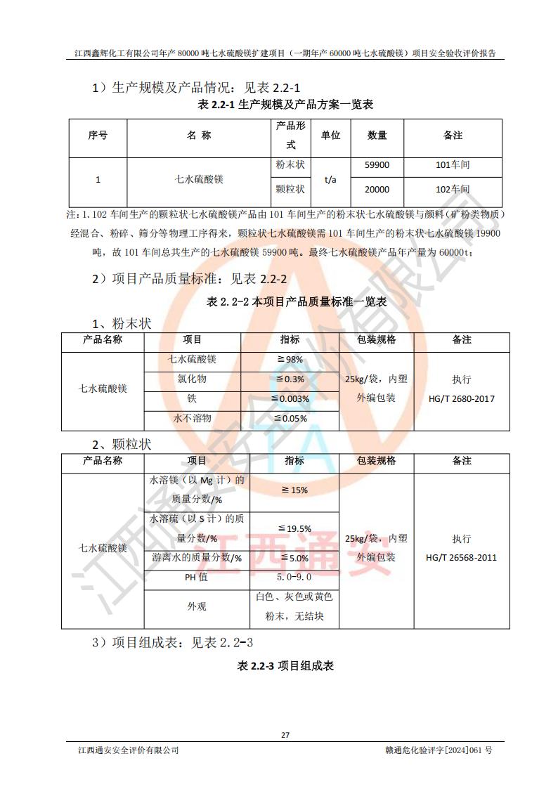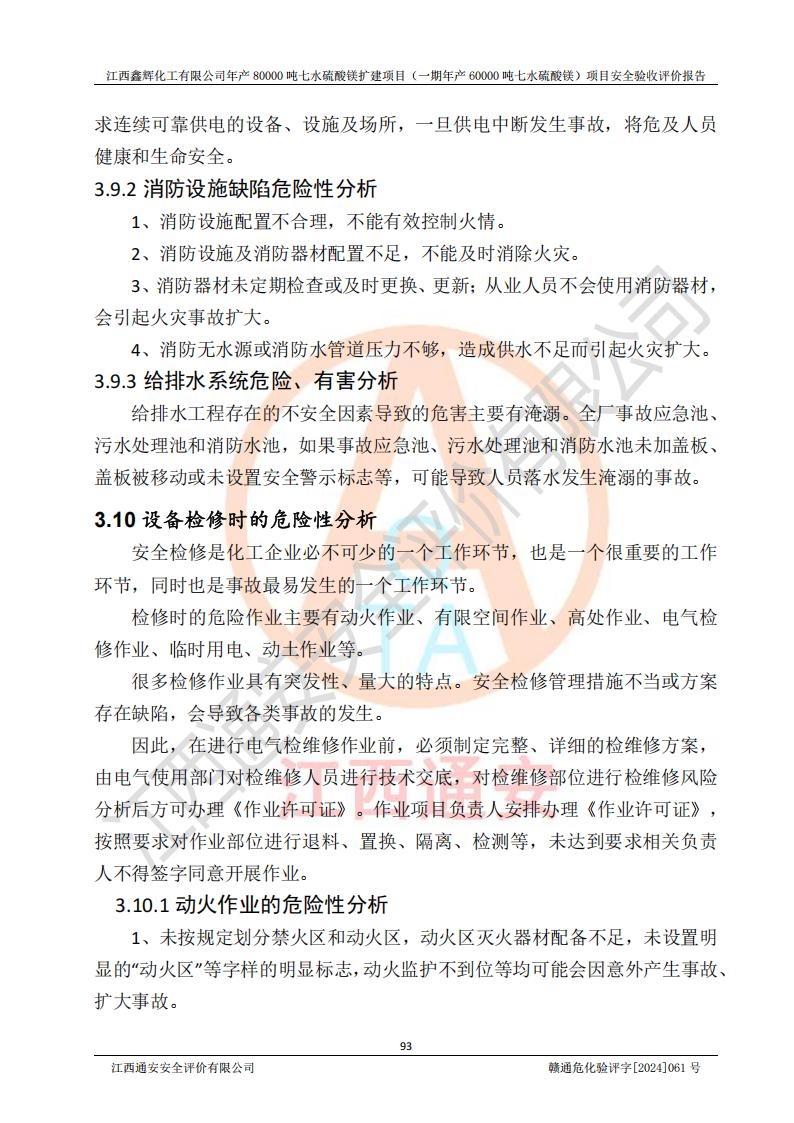 1. 江西鑫輝化工有限公司年產(chǎn)80000噸七水硫酸鎂擴(kuò)建項(xiàng)目(一期年產(chǎn)60000噸七水硫酸鎂)項(xiàng)目的安全設(shè)施與主體工程同時(shí)設(shè)計(jì)、同時(shí)施工、同時(shí)投入生產(chǎn)和使用,符合**有關(guān)建設(shè)項(xiàng)目“三同時(shí)”的規(guī)定和要求。 2. 江西鑫輝化工有限公司年產(chǎn)80000噸七水硫酸鎂擴(kuò)建項(xiàng)目(一期年產(chǎn)60000噸七水硫酸鎂)符合新干縣鹽化工業(yè)城發(fā)展規(guī)劃的布局; 3. 該項(xiàng)目現(xiàn)場情況、企業(yè)總平面布置、設(shè)備設(shè)施的布置與設(shè)計(jì)圖、竣工圖紙一致,主體工程安全設(shè)施、安全措施符合法律法規(guī)的規(guī)定和要求,安全設(shè)施正常投用并運(yùn)行**;供配電、給排水等公用工程及輔助設(shè)施滿足主體工程生產(chǎn)安全的需要;企業(yè)安全管理體系滿足生產(chǎn)安全的要求; 4. 總平面布置符合《建筑設(shè)計(jì)防火規(guī)范》GB50016-2014(2018年版)、《精細(xì)化工企業(yè)工程設(shè)計(jì)防火標(biāo)準(zhǔn)》GB51283-2020等標(biāo)準(zhǔn)、規(guī)范的要求; 5. 公司已針對(duì)本報(bào)告提出的安全隱患整改意見組織人員進(jìn)行整改,整改措施已落實(shí)到位,企業(yè)安全生產(chǎn)的風(fēng)險(xiǎn)控制在可以接受的范圍內(nèi); 6. 該項(xiàng)目采用成熟的生產(chǎn)工藝和設(shè)備,本質(zhì)安全程度較高。 7. 綜上所述:本報(bào)告認(rèn)為,江西鑫輝化工有限公司年產(chǎn)80000噸七水硫酸鎂擴(kuò)建項(xiàng)目(一期年產(chǎn)60000噸七水硫酸鎂)項(xiàng)目的生產(chǎn)裝置現(xiàn)場情況與設(shè)計(jì)圖紙一致,安全設(shè)施及安全管理符合**及有關(guān)部門關(guān)于安全生產(chǎn)法律、法規(guī)、標(biāo)準(zhǔn)的要求,安全風(fēng)險(xiǎn)是受控制的,其風(fēng)險(xiǎn)程度是可以接受的,符合安全生產(chǎn)條件,能夠滿足安全生產(chǎn)的要求,具備安全設(shè)施“三同時(shí)”驗(yàn)收條件。 |