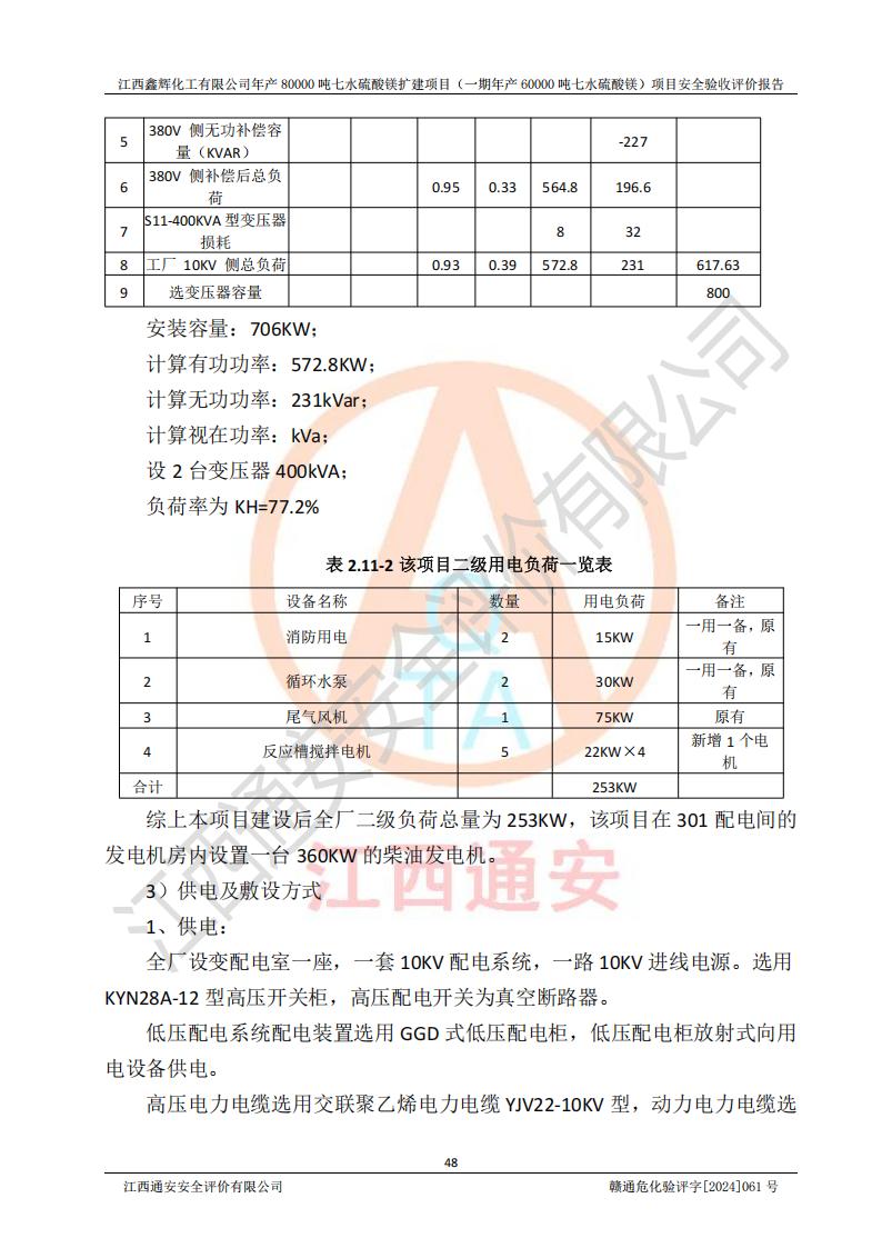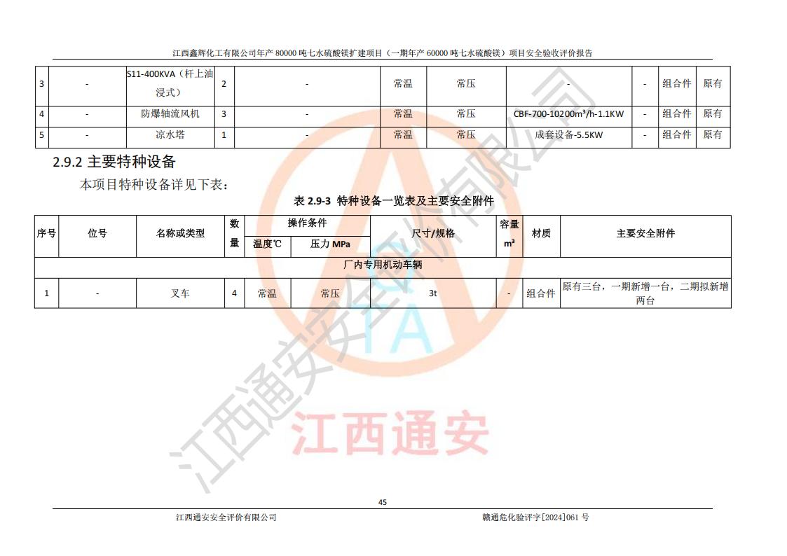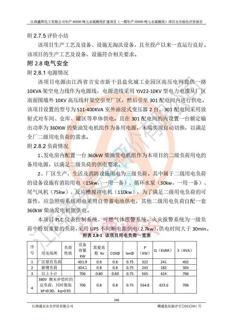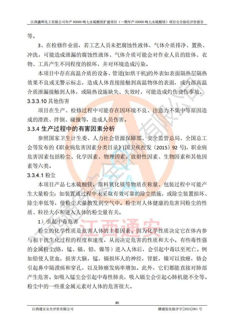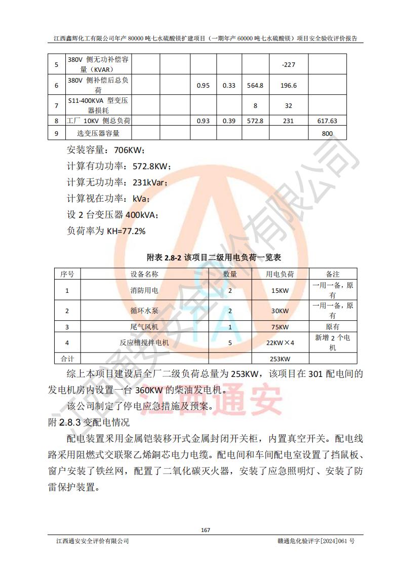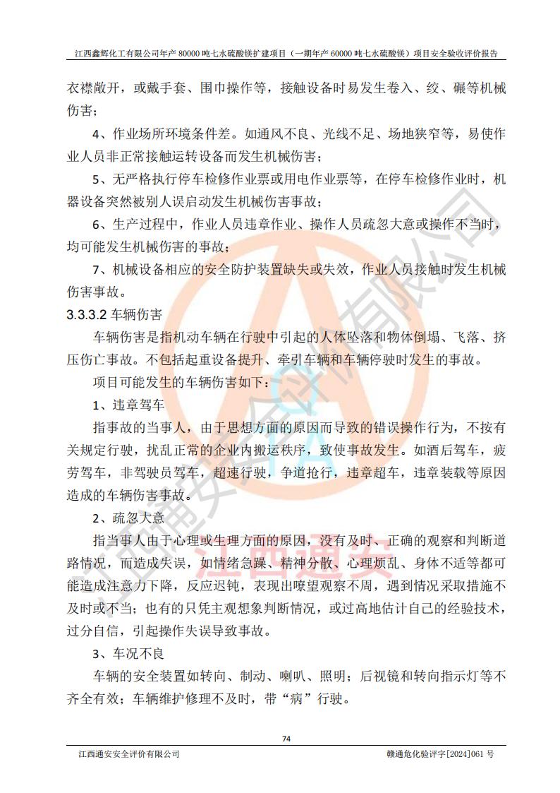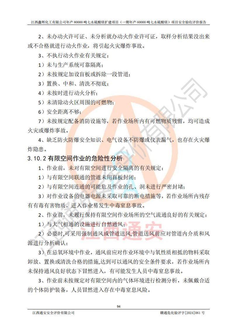 1. 江西鑫輝化工有限公司年產(chǎn)80000噸七水硫酸鎂擴(kuò)建項(xiàng)目(一期年產(chǎn)60000噸七水硫酸鎂)項(xiàng)目的安全設(shè)施與主體工程同時(shí)設(shè)計(jì)、同時(shí)施工、同時(shí)投入生產(chǎn)和使用,符合**有關(guān)建設(shè)項(xiàng)目“三同時(shí)”的規(guī)定和要求。 2. 江西鑫輝化工有限公司年產(chǎn)80000噸七水硫酸鎂擴(kuò)建項(xiàng)目(一期年產(chǎn)60000噸七水硫酸鎂)符合新干縣鹽化工業(yè)城發(fā)展規(guī)劃的布局; 3. 該項(xiàng)目現(xiàn)場情況、企業(yè)總平面布置、設(shè)備設(shè)施的布置與設(shè)計(jì)圖、竣工圖紙一致,主體工程安全設(shè)施、安全措施符合法律法規(guī)的規(guī)定和要求,安全設(shè)施正常投用并運(yùn)行**;供配電、給排水等公用工程及輔助設(shè)施滿足主體工程生產(chǎn)安全的需要;企業(yè)安全管理體系滿足生產(chǎn)安全的要求; 4. 總平面布置符合《建筑設(shè)計(jì)防火規(guī)范》GB50016-2014(2018年版)、《精細(xì)化工企業(yè)工程設(shè)計(jì)防火標(biāo)準(zhǔn)》GB51283-2020等標(biāo)準(zhǔn)、規(guī)范的要求; 5. 公司已針對(duì)本報(bào)告提出的安全隱患整改意見組織人員進(jìn)行整改,整改措施已落實(shí)到位,企業(yè)安全生產(chǎn)的風(fēng)險(xiǎn)控制在可以接受的范圍內(nèi); 6. 該項(xiàng)目采用成熟的生產(chǎn)工藝和設(shè)備,本質(zhì)安全程度較高。 7. 綜上所述:本報(bào)告認(rèn)為,江西鑫輝化工有限公司年產(chǎn)80000噸七水硫酸鎂擴(kuò)建項(xiàng)目(一期年產(chǎn)60000噸七水硫酸鎂)項(xiàng)目的生產(chǎn)裝置現(xiàn)場情況與設(shè)計(jì)圖紙一致,安全設(shè)施及安全管理符合**及有關(guān)部門關(guān)于安全生產(chǎn)法律、法規(guī)、標(biāo)準(zhǔn)的要求,安全風(fēng)險(xiǎn)是受控制的,其風(fēng)險(xiǎn)程度是可以接受的,符合安全生產(chǎn)條件,能夠滿足安全生產(chǎn)的要求,具備安全設(shè)施“三同時(shí)”驗(yàn)收條件。 |