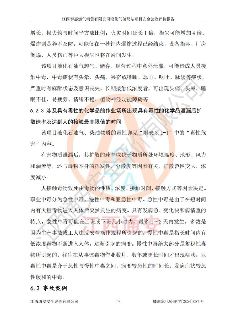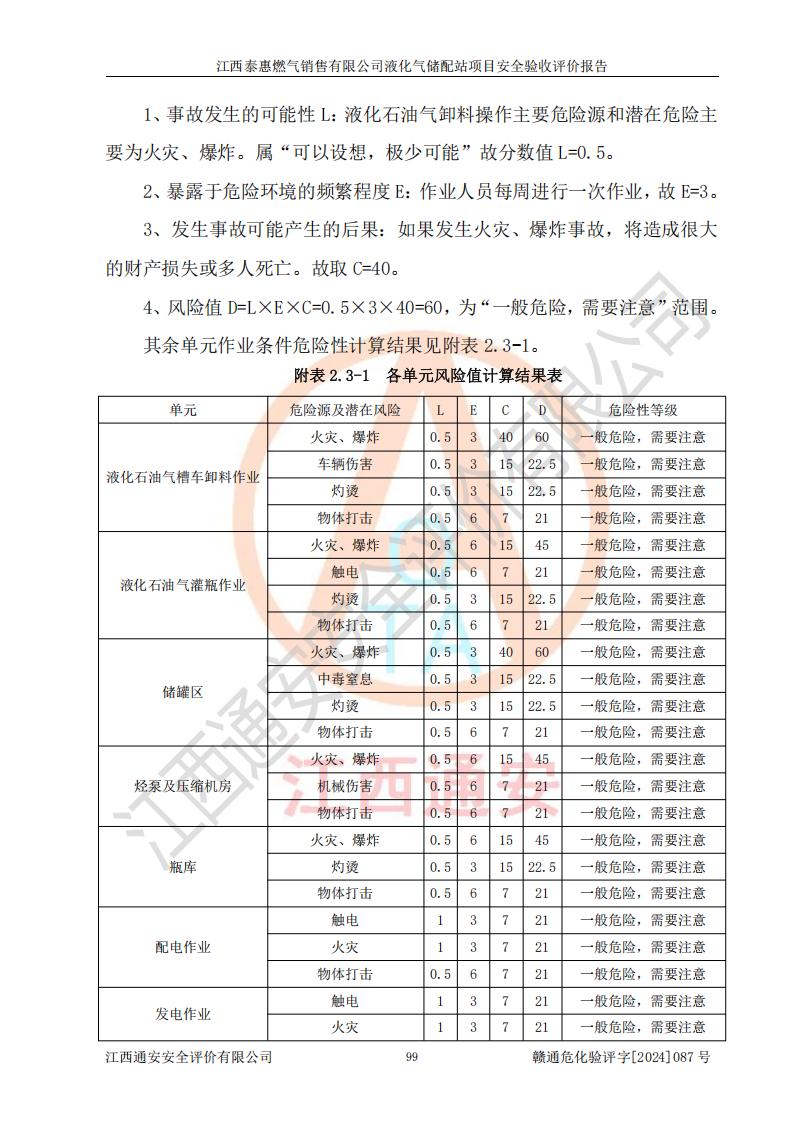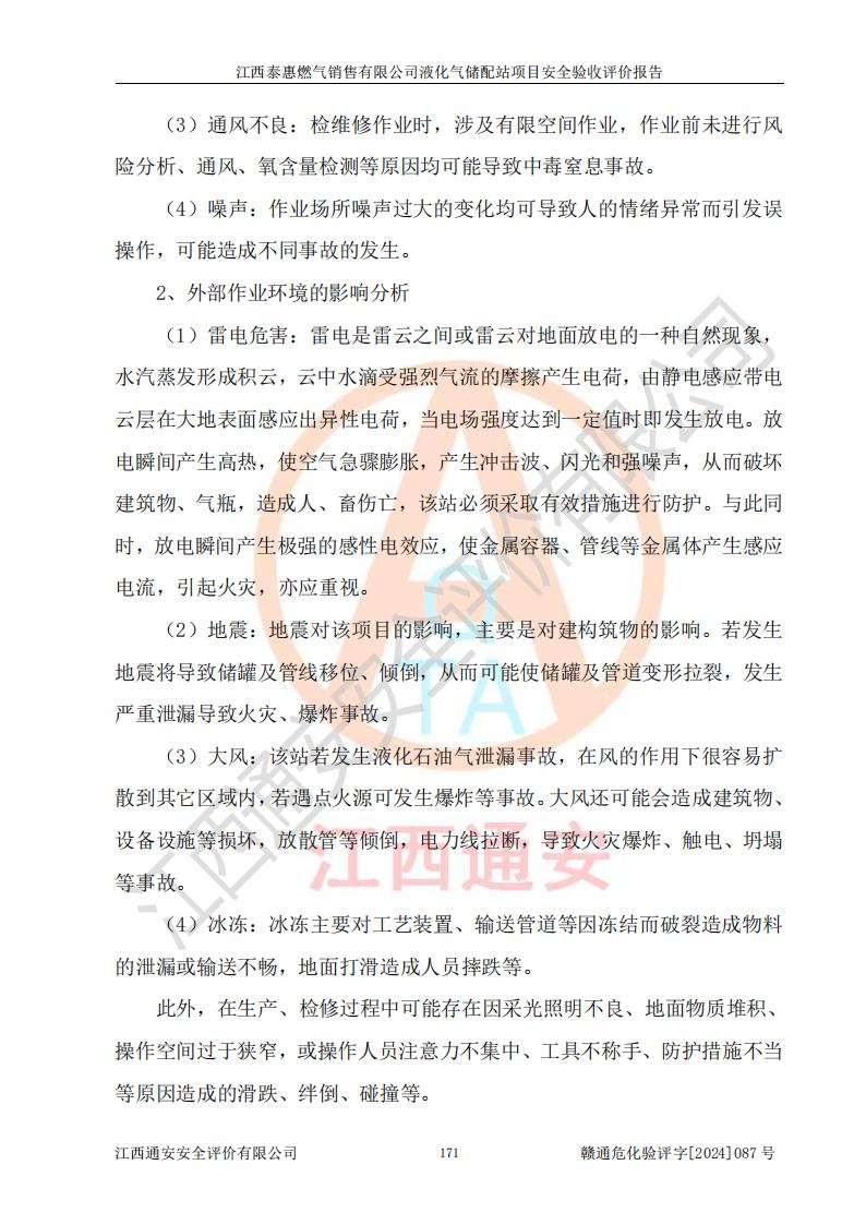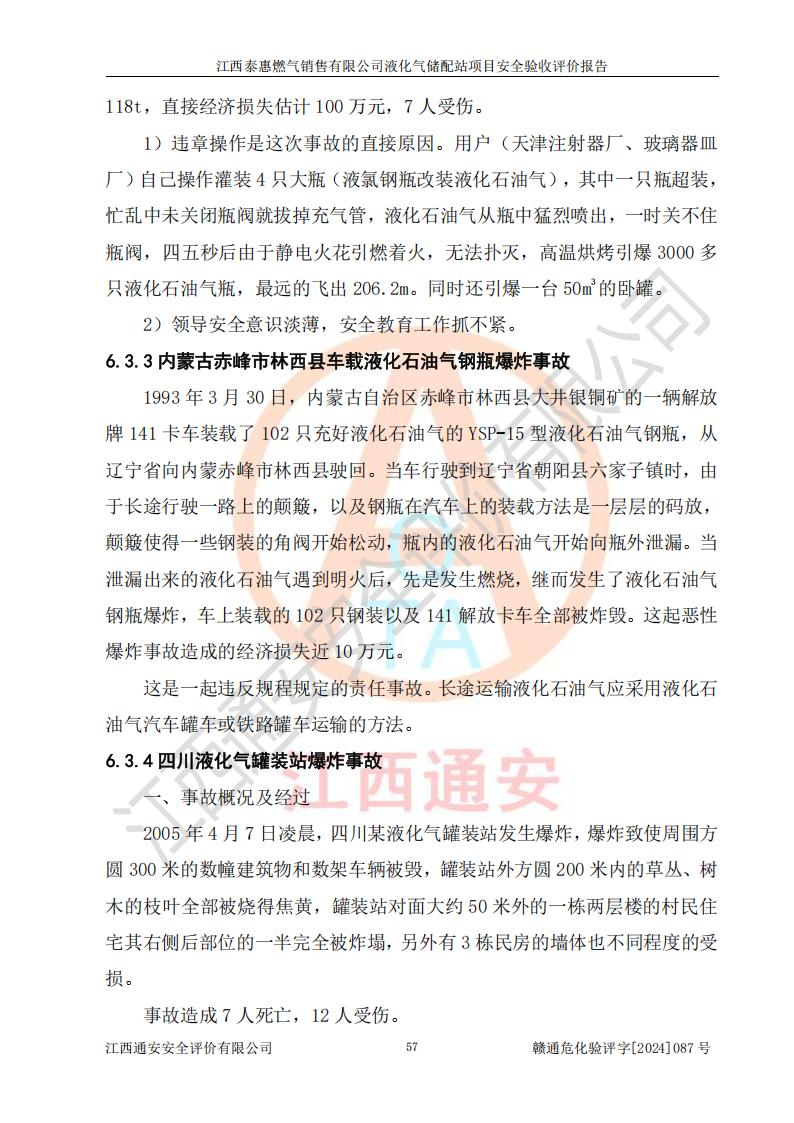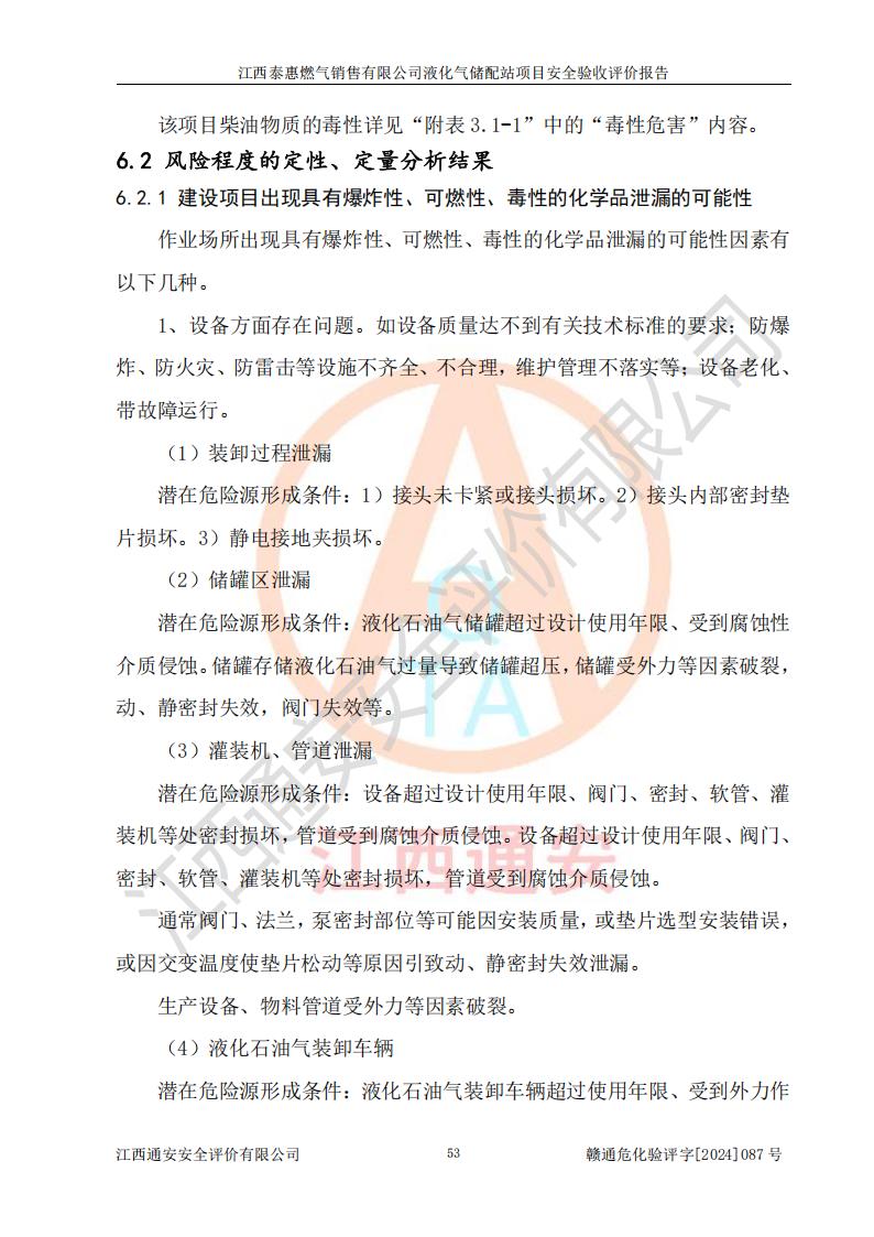 其它 | 在對(duì)該項(xiàng)目危險(xiǎn)、有害因素辨識(shí)分析的基礎(chǔ)上,運(yùn)用安全檢查表、預(yù)作業(yè)條件危險(xiǎn)性分析法、危險(xiǎn)度評(píng)價(jià)、重大事故后果分析結(jié)果等評(píng)價(jià)方法對(duì)該項(xiàng)目進(jìn)行了分析評(píng)價(jià),評(píng)價(jià)結(jié)果如下: 1、該項(xiàng)目位于江西省吉安市泰和縣澄江鎮(zhèn)黃崗村八組,符合當(dāng)?shù)匾?guī)劃,與周邊環(huán)境的距離符合有關(guān)標(biāo)準(zhǔn)、規(guī)范的要求。 2、總圖布置分區(qū)明確,布局合理,各建構(gòu)筑物的防火間距滿足規(guī)范要求。 3、該項(xiàng)目無**明令淘汰的工藝,設(shè)備、設(shè)施與工藝條件、內(nèi)部介質(zhì)相適應(yīng),特種設(shè)備及設(shè)施較齊全,按規(guī)定設(shè)置防雷、防靜電接地,爆炸危險(xiǎn)環(huán)境加油機(jī)按要求采用防爆型,符合相關(guān)標(biāo)準(zhǔn)規(guī)范要求。 5、企業(yè)設(shè)置了安全生產(chǎn)管理機(jī)構(gòu),配備了專職安全生產(chǎn)管理人員,建立了安全生產(chǎn)責(zé)任制和安全生產(chǎn)管理制度,編制了崗位操作規(guī)程,編制了生產(chǎn)安全事故應(yīng)急預(yù)案,人員經(jīng)過相應(yīng)的培訓(xùn),企業(yè)的安全生產(chǎn)管理正常。 6、作業(yè)條件危險(xiǎn)性評(píng)價(jià)結(jié)果:在選定的評(píng)價(jià)單元中,作業(yè)危險(xiǎn)程度均為“一般危險(xiǎn),需要注意”,作業(yè)條件相對(duì)安全。 7、危險(xiǎn)度評(píng)價(jià)結(jié)果:儲(chǔ)罐區(qū)和槽車卸車區(qū)危險(xiǎn)度為Ⅰ級(jí),屬**危險(xiǎn),烴泵及壓縮機(jī)室、灌瓶間和瓶庫(kù)危險(xiǎn)度為Ⅱ級(jí),屬中度危險(xiǎn)。 評(píng)價(jià)結(jié)論: 江西泰惠燃?xì)怃N售有限公司液化氣儲(chǔ)配站項(xiàng)目的安全設(shè)施及安全管理符合**及有關(guān)部門關(guān)于安全生產(chǎn)法律、法規(guī)、標(biāo)準(zhǔn)的要求,安全風(fēng)險(xiǎn)是受控制的,其風(fēng)險(xiǎn)程度是可以接受的,符合安全生產(chǎn)條件,能夠滿足安全生產(chǎn)的要求,具備安全設(shè)施“三同時(shí)”驗(yàn)收條件。 | ||||