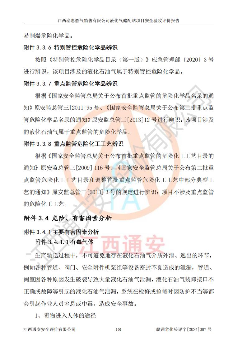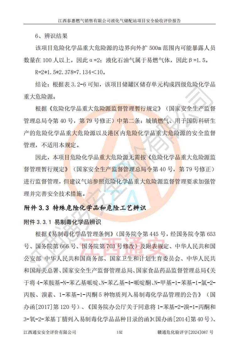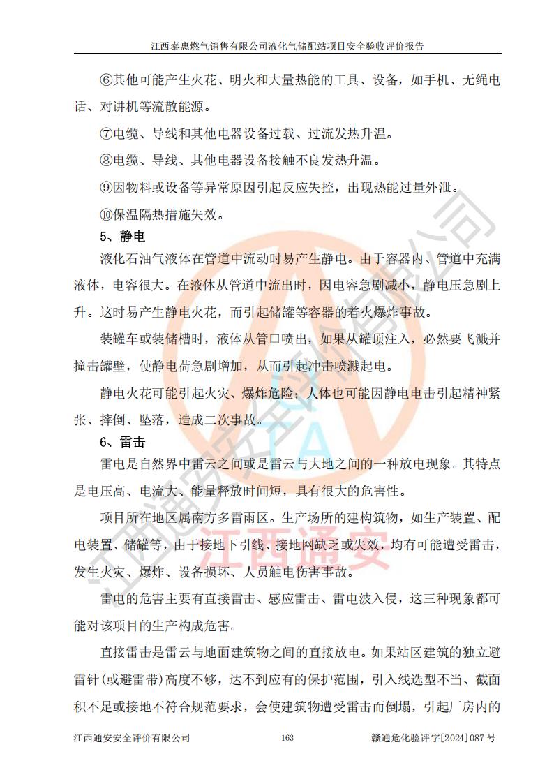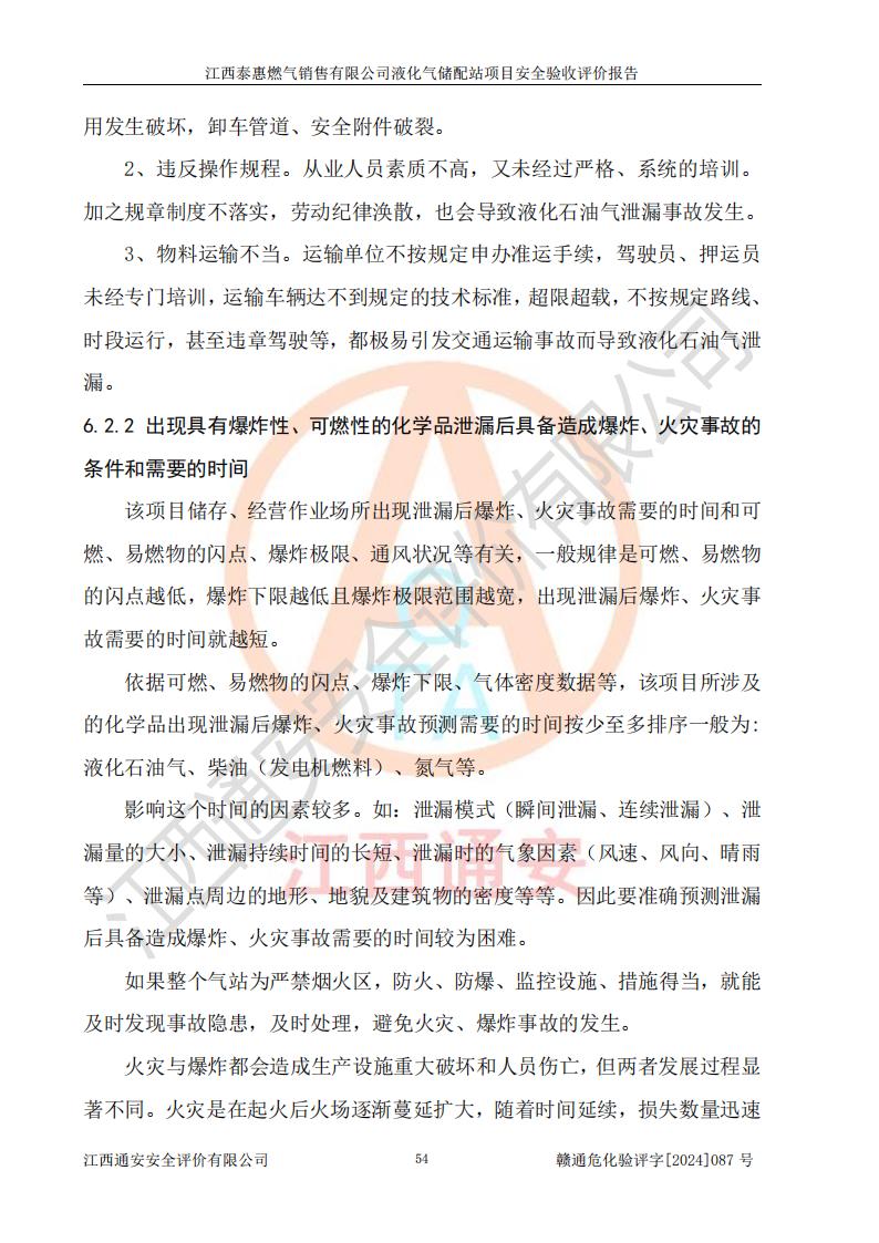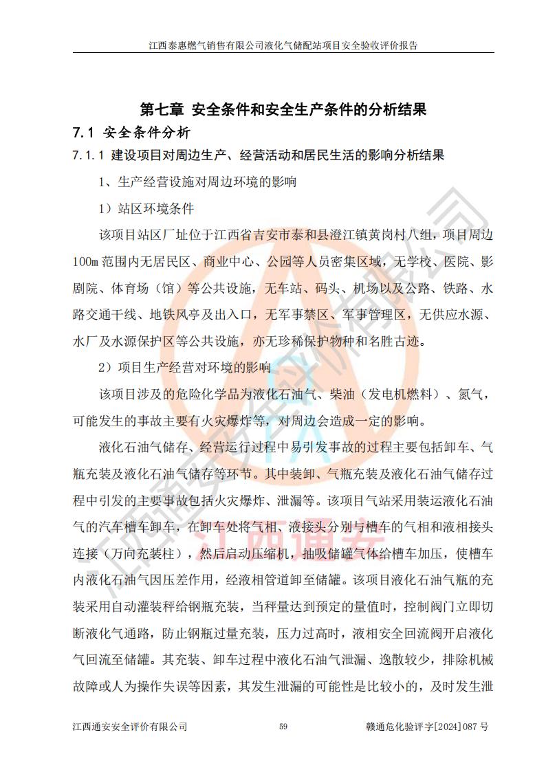 其它 | 在對(duì)該項(xiàng)目危險(xiǎn)、有害因素辨識(shí)分析的基礎(chǔ)上,運(yùn)用安全檢查表、預(yù)作業(yè)條件危險(xiǎn)性分析法、危險(xiǎn)度評(píng)價(jià)、重大事故后果分析結(jié)果等評(píng)價(jià)方法對(duì)該項(xiàng)目進(jìn)行了分析評(píng)價(jià),評(píng)價(jià)結(jié)果如下: 1、該項(xiàng)目位于江西省吉安市泰和縣澄江鎮(zhèn)黃崗村八組,符合當(dāng)?shù)匾?guī)劃,與周邊環(huán)境的距離符合有關(guān)標(biāo)準(zhǔn)、規(guī)范的要求。 2、總圖布置分區(qū)明確,布局合理,各建構(gòu)筑物的防火間距滿足規(guī)范要求。 3、該項(xiàng)目無**明令淘汰的工藝,設(shè)備、設(shè)施與工藝條件、內(nèi)部介質(zhì)相適應(yīng),特種設(shè)備及設(shè)施較齊全,按規(guī)定設(shè)置防雷、防靜電接地,爆炸危險(xiǎn)環(huán)境加油機(jī)按要求采用防爆型,符合相關(guān)標(biāo)準(zhǔn)規(guī)范要求。 5、企業(yè)設(shè)置了安全生產(chǎn)管理機(jī)構(gòu),配備了專職安全生產(chǎn)管理人員,建立了安全生產(chǎn)責(zé)任制和安全生產(chǎn)管理制度,編制了崗位操作規(guī)程,編制了生產(chǎn)安全事故應(yīng)急預(yù)案,人員經(jīng)過相應(yīng)的培訓(xùn),企業(yè)的安全生產(chǎn)管理正常。 6、作業(yè)條件危險(xiǎn)性評(píng)價(jià)結(jié)果:在選定的評(píng)價(jià)單元中,作業(yè)危險(xiǎn)程度均為“一般危險(xiǎn),需要注意”,作業(yè)條件相對(duì)安全。 7、危險(xiǎn)度評(píng)價(jià)結(jié)果:儲(chǔ)罐區(qū)和槽車卸車區(qū)危險(xiǎn)度為Ⅰ級(jí),屬**危險(xiǎn),烴泵及壓縮機(jī)室、灌瓶間和瓶庫(kù)危險(xiǎn)度為Ⅱ級(jí),屬中度危險(xiǎn)。 評(píng)價(jià)結(jié)論: 江西泰惠燃?xì)怃N售有限公司液化氣儲(chǔ)配站項(xiàng)目的安全設(shè)施及安全管理符合**及有關(guān)部門關(guān)于安全生產(chǎn)法律、法規(guī)、標(biāo)準(zhǔn)的要求,安全風(fēng)險(xiǎn)是受控制的,其風(fēng)險(xiǎn)程度是可以接受的,符合安全生產(chǎn)條件,能夠滿足安全生產(chǎn)的要求,具備安全設(shè)施“三同時(shí)”驗(yàn)收條件。 | ||||