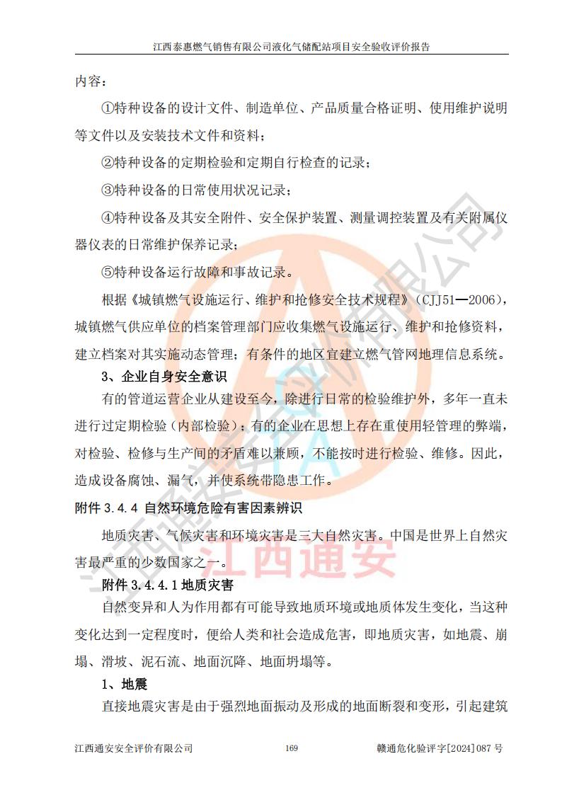 項(xiàng)目簡(jiǎn)介 | 江西泰惠燃?xì)怃N售有限公司液化氣儲(chǔ)配站項(xiàng)目(以下簡(jiǎn)稱“氣站”)位于江西省吉安市泰和縣澄江鎮(zhèn)黃崗村八組,是一家從事液化石油氣儲(chǔ)存、經(jīng)營(yíng)的企業(yè),成立于2016年12月15日,并取得泰和縣市場(chǎng)監(jiān)督管理局頒發(fā)的《營(yíng)業(yè)執(zhí)照》,營(yíng)業(yè)執(zhí)照統(tǒng)一社會(huì)信用代碼:91360826MA35MC7985。公司注冊(cè)住所:江西省吉安市泰和縣澄江鎮(zhèn)黃崗村八組。法定**人:羅運(yùn)忠,注冊(cè)資本貳佰萬元整。類型:有限責(zé)任公司(自然人投資或控股)。營(yíng)業(yè)執(zhí)照許可經(jīng)營(yíng)范圍:燃?xì)鈨?chǔ)備站項(xiàng)目建設(shè),燃?xì)馄?、燃?xì)饩呒芭浼N售,燃?xì)饩呔S修。(依法須經(jīng)批準(zhǔn)的項(xiàng)目,經(jīng)相關(guān)部門批準(zhǔn)后方可開展經(jīng)營(yíng)活動(dòng))。 江西泰惠燃?xì)怃N售有限公司液化石油氣儲(chǔ)配站原先地址為江西省吉安市泰和縣澄江鎮(zhèn)桔園村,因?yàn)椤短┖涂h城市總體規(guī)劃》(2014-2030年)中縣域交通規(guī)劃在城區(qū)西側(cè)預(yù)留105國(guó)道改線廊道。隨著泰和縣中心城區(qū)的發(fā)展,城區(qū)向西擴(kuò)展勢(shì)在必行。而要向西發(fā)展G105國(guó)道就應(yīng)按城市總體規(guī)劃要求向西改擴(kuò)建。江西泰惠燃?xì)怃N售有限公司液化石油氣儲(chǔ)配站是改線廊道的拆遷戶。因此江西泰惠燃?xì)怃N售有限公司液化石油氣儲(chǔ)配站需重新搬遷?,F(xiàn)搬遷地址:江西省吉安市泰和縣澄江鎮(zhèn)黃崗村八組,土地性質(zhì)為**規(guī)劃劃撥用地。因氣站建設(shè)地點(diǎn)發(fā)生變化,該氣站于2023年5月18日重新取得泰和縣發(fā)展和改革委員會(huì)出具的《關(guān)于江西泰惠燃?xì)怃N售有限公司液化氣儲(chǔ)配站項(xiàng)目重新備案的通知》(項(xiàng)目名稱:江西泰惠燃?xì)怃N售有限公司液化氣儲(chǔ)配站項(xiàng)目,項(xiàng)目統(tǒng)一代碼:2105-360826-04-01-111545),項(xiàng)目投資200萬元,建設(shè)地址為江西省吉安市泰和縣澄江鎮(zhèn)黃崗村八組,建設(shè)內(nèi)容及規(guī)模為2臺(tái)100m3地上液化石油氣臥式儲(chǔ)罐、1臺(tái)5m3地上殘液臥式儲(chǔ)罐、2臺(tái)液化石油氣壓縮機(jī)等。 該氣站于2024年5月委托山東新安達(dá)工程咨詢有限公司編制了《江西泰惠燃?xì)怃N售有限公司液化氣儲(chǔ)配站項(xiàng)目安全預(yù)評(píng)價(jià)報(bào)告》,并組織專家進(jìn)行了審查通過。 該氣站于2024年7月委托北京慎恒工程設(shè)計(jì)有限公司編制了《江西泰惠燃?xì)怃N售有限公司液化氣儲(chǔ)配站項(xiàng)目安全設(shè)施設(shè)計(jì)》,并組織專家進(jìn)行了審查通過。 | ||||