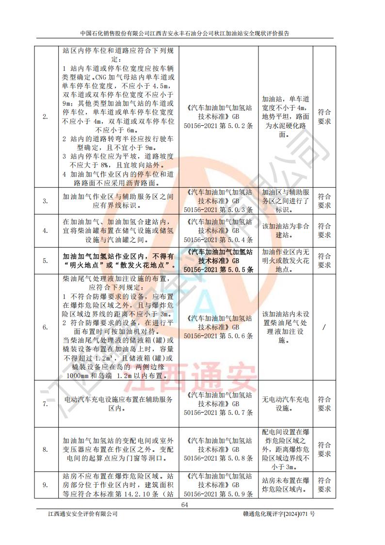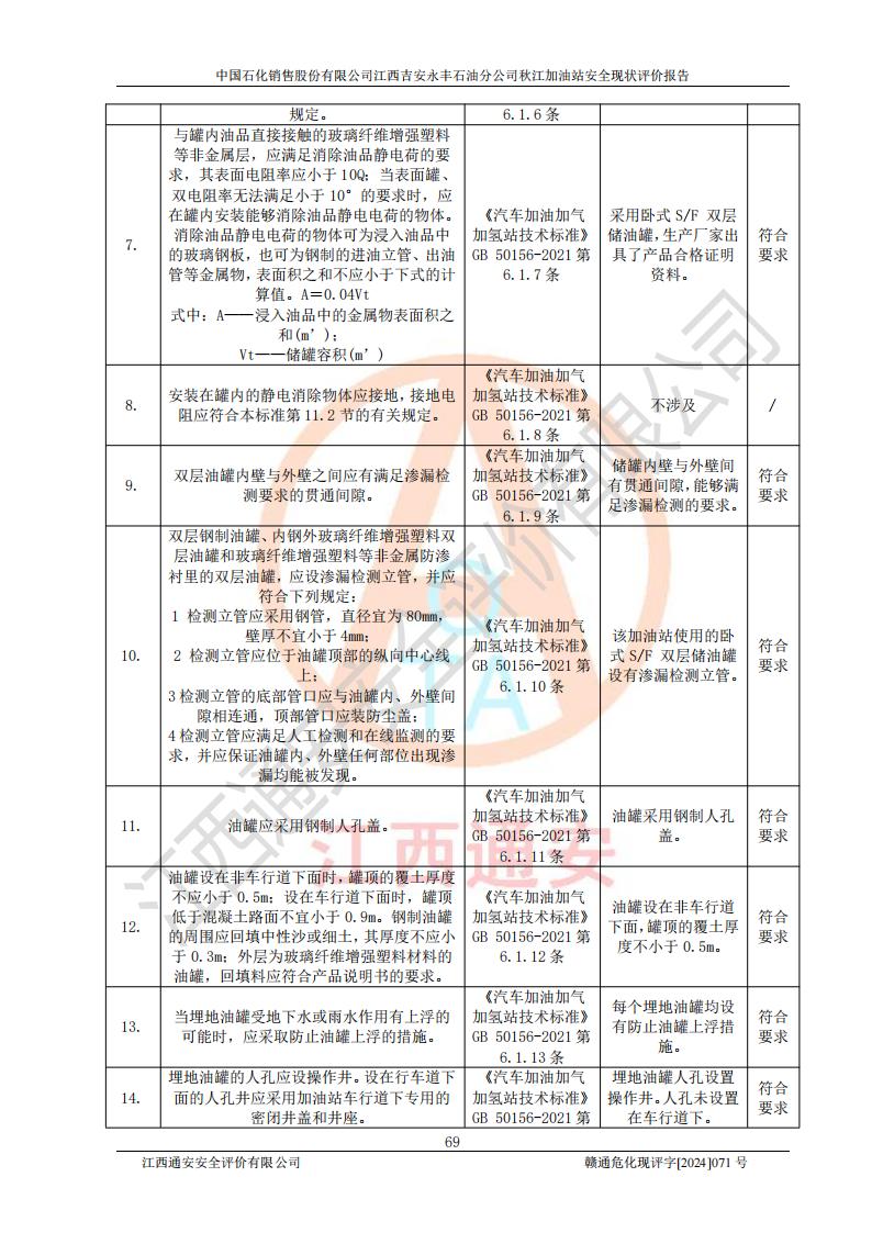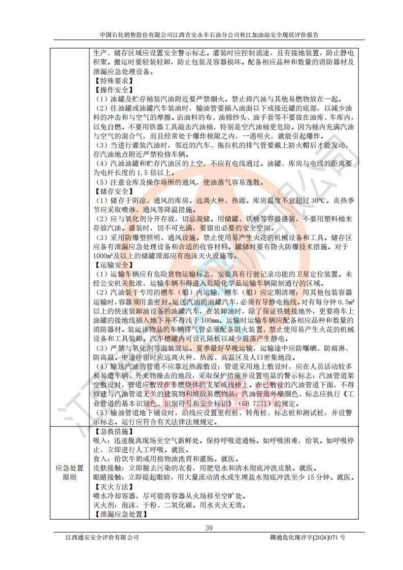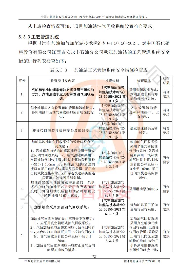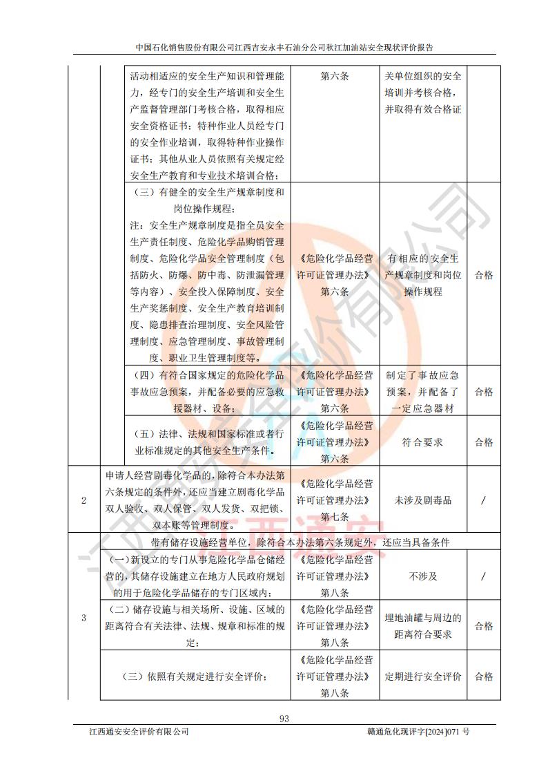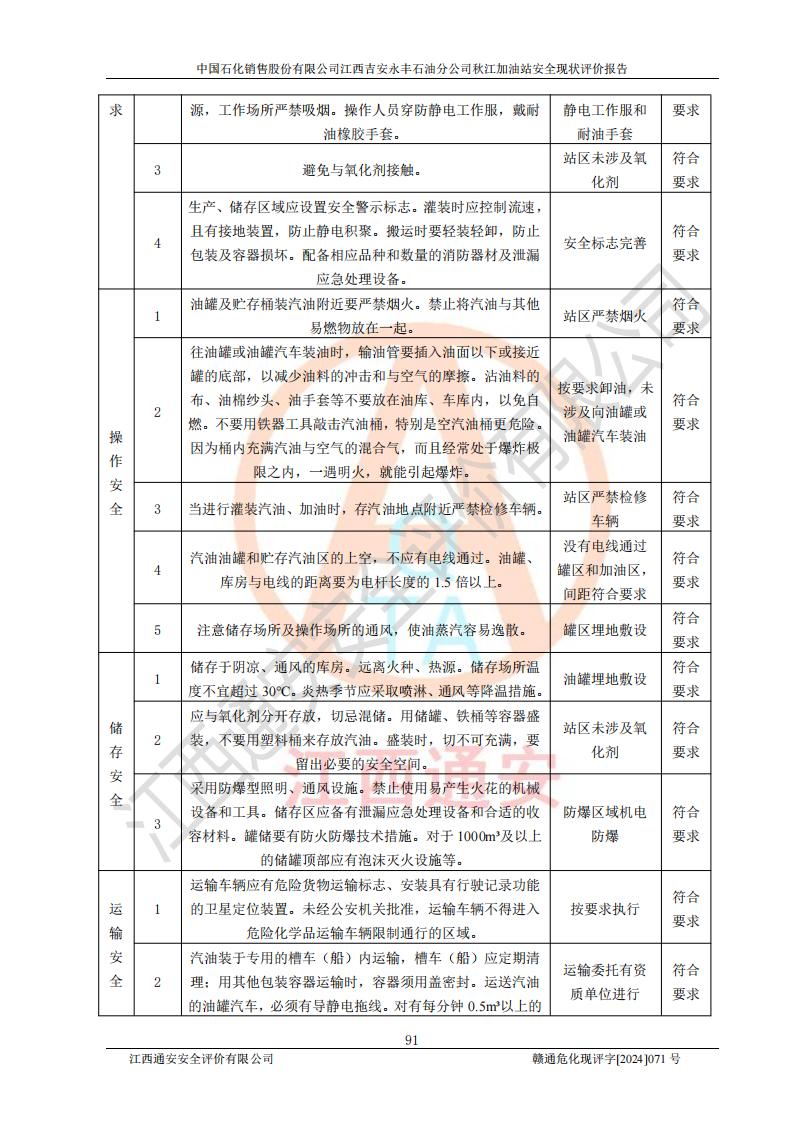 評價結論 | 江西高速實業(yè)開發(fā)有限公司吉安服務區(qū)西加油站改造項目現場布置與設計圖紙一致,有關從業(yè)人員資質符合《江西省危險化學品安全專項整治三年行動實施方案》要求,具備**有關安全生產法律、法規(guī)、部門規(guī)章及標準規(guī)范要求的安全條件,符合經營和儲存危險化學品的安全條件要求,具備安全驗收的要求。 | |||
