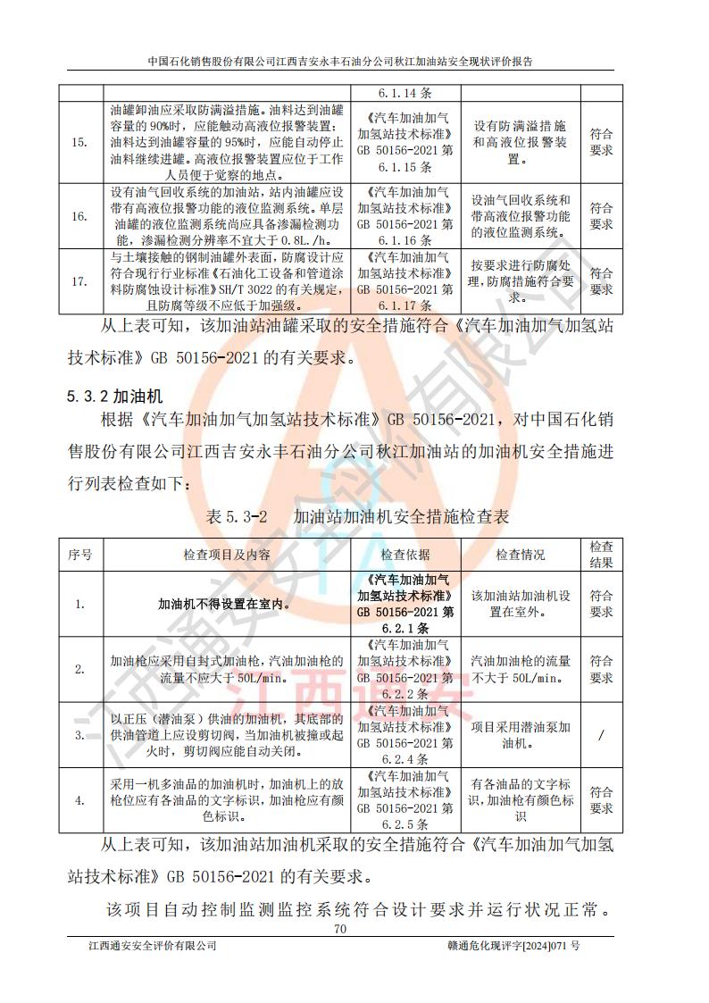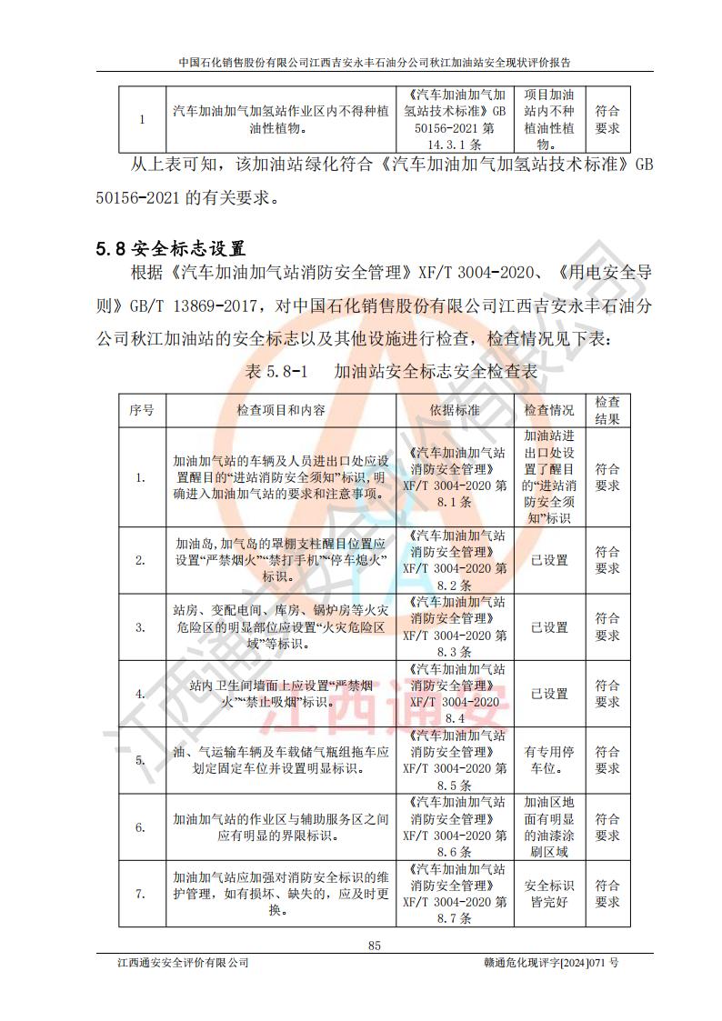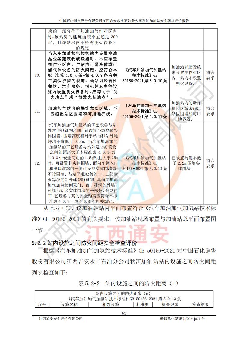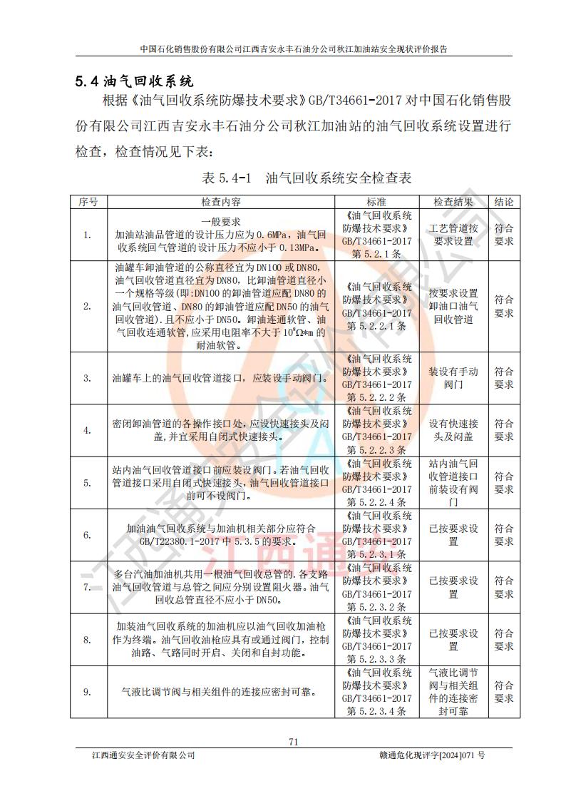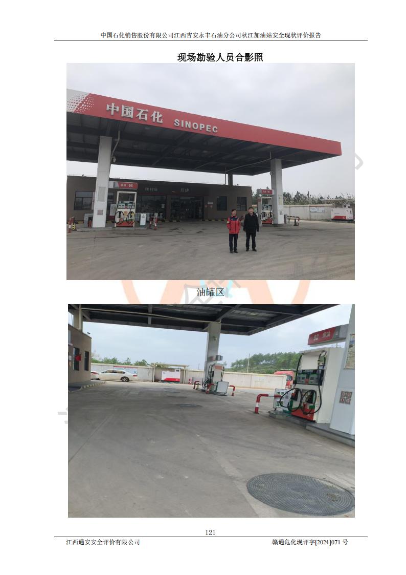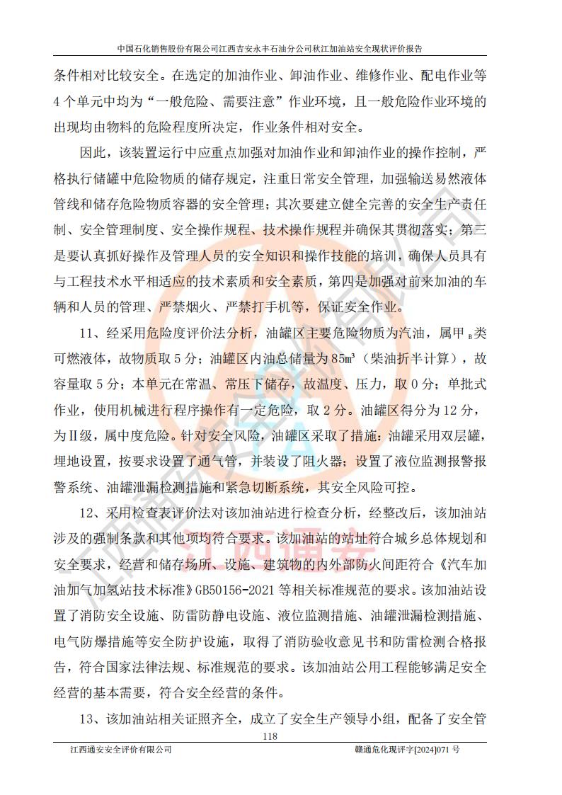 評價結論 | 江西高速實業(yè)開發(fā)有限公司吉安服務區(qū)西加油站改造項目現場布置與設計圖紙一致,有關從業(yè)人員資質符合《江西省危險化學品安全專項整治三年行動實施方案》要求,具備**有關安全生產法律、法規(guī)、部門規(guī)章及標準規(guī)范要求的安全條件,符合經營和儲存危險化學品的安全條件要求,具備安全驗收的要求。 | |||