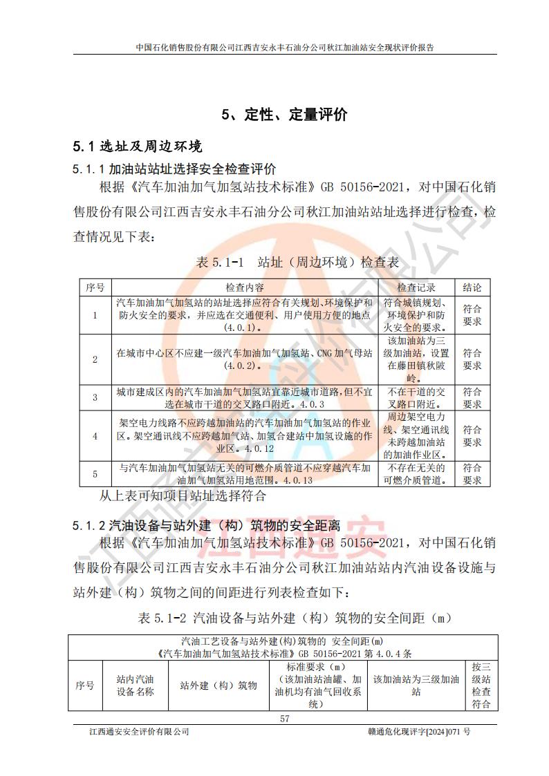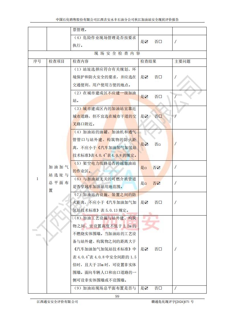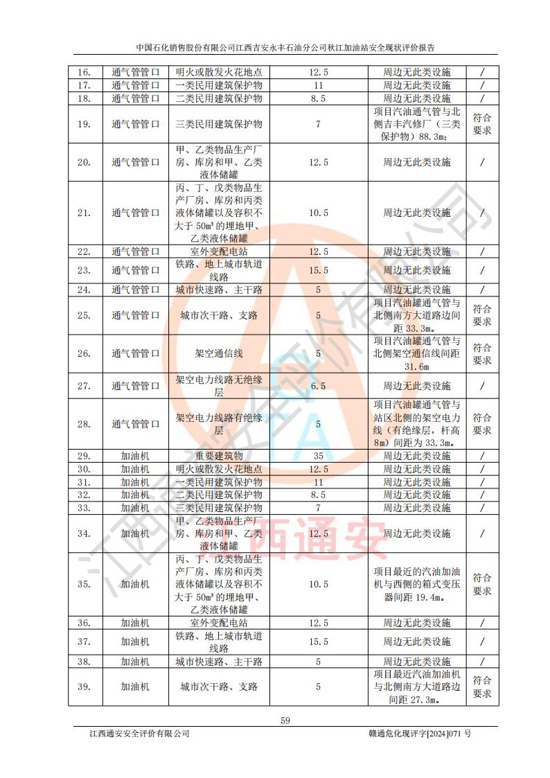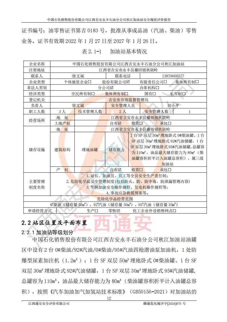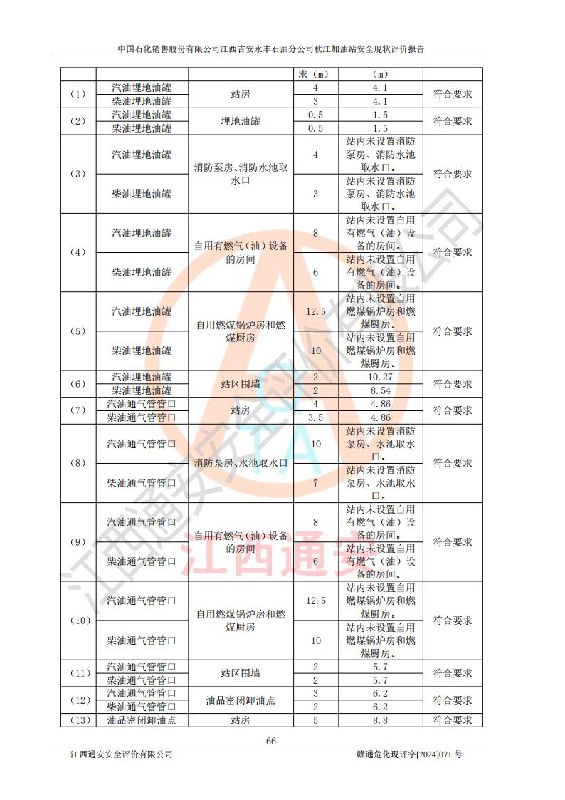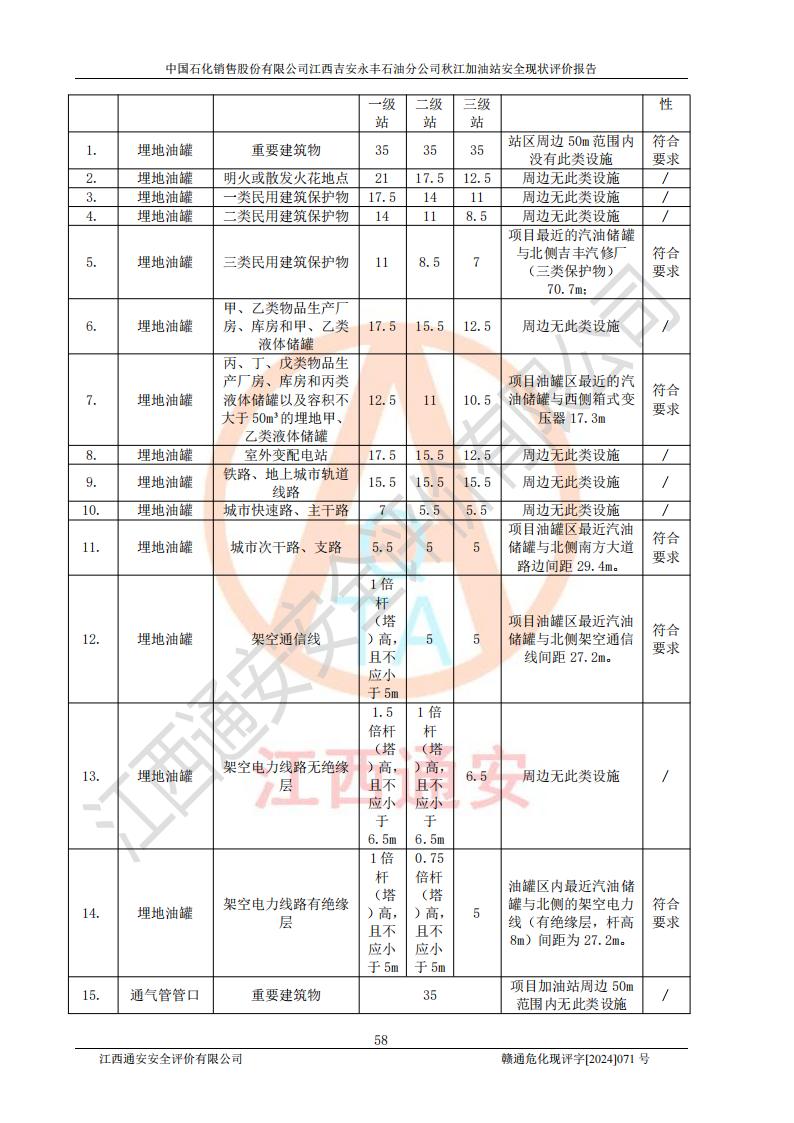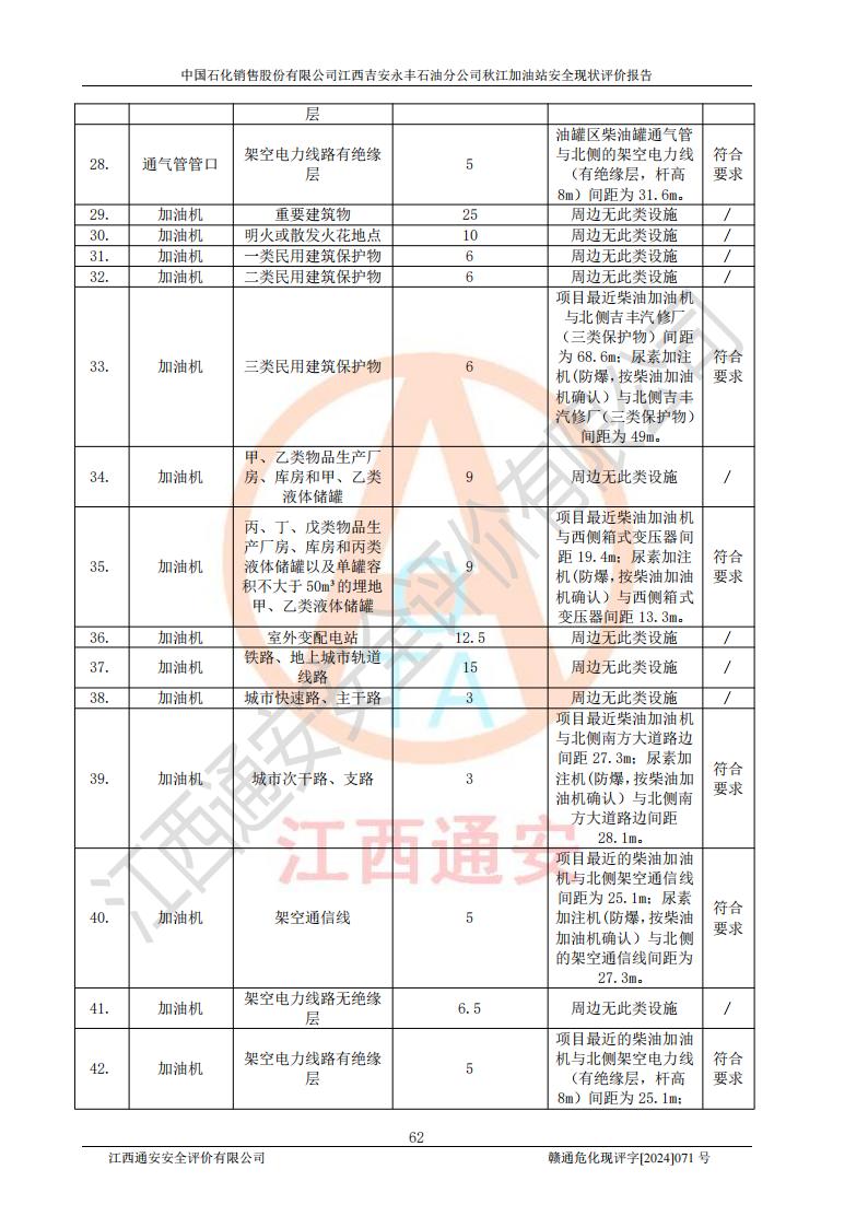 評價結論 | 江西高速實業(yè)開發(fā)有限公司吉安服務區(qū)西加油站改造項目現場布置與設計圖紙一致,有關從業(yè)人員資質符合《江西省危險化學品安全專項整治三年行動實施方案》要求,具備**有關安全生產法律、法規(guī)、部門規(guī)章及標準規(guī)范要求的安全條件,符合經營和儲存危險化學品的安全條件要求,具備安全驗收的要求。 | |||