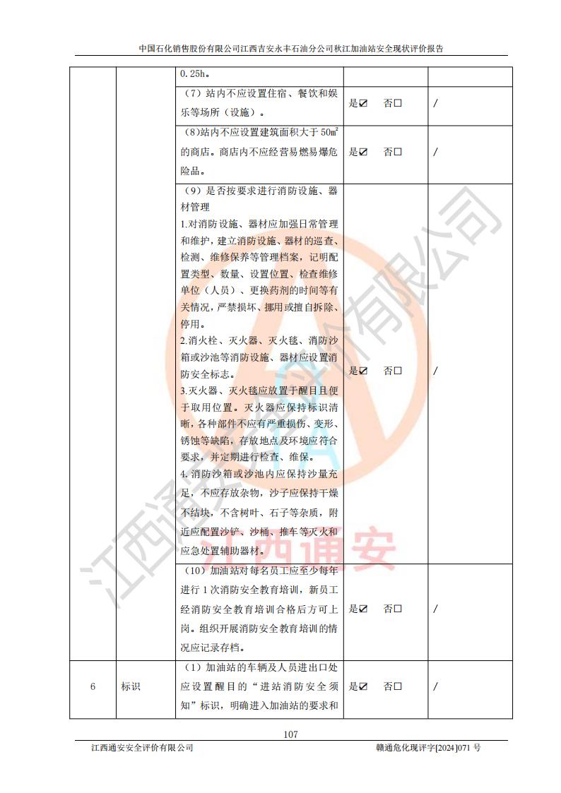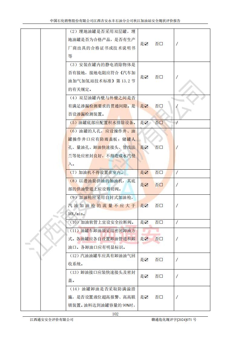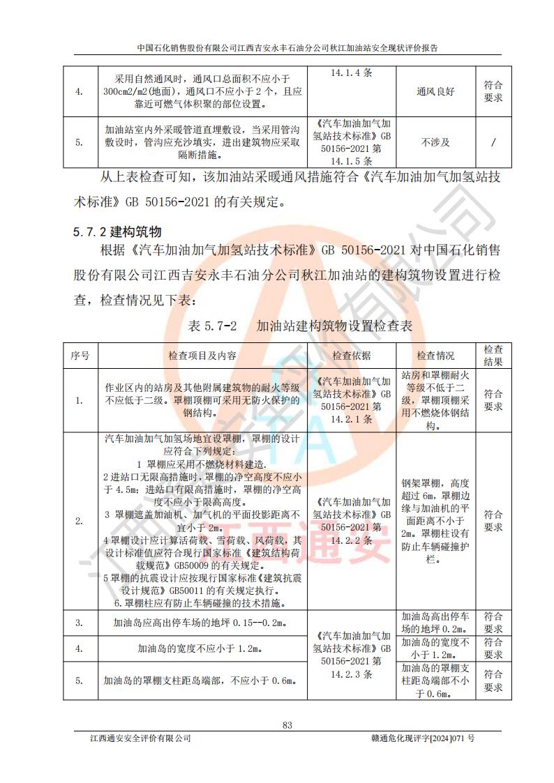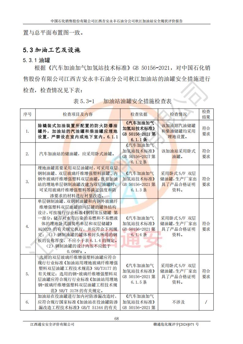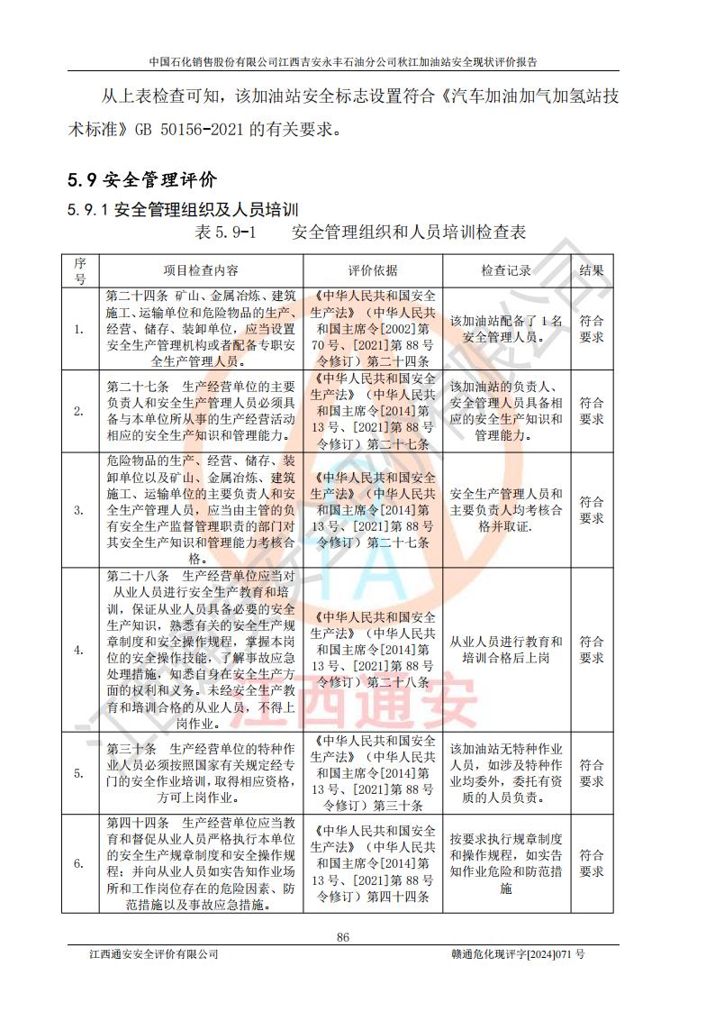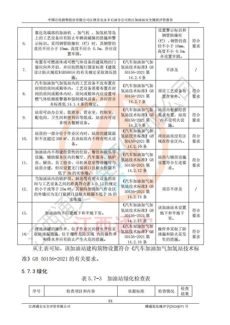 評價結論 | 江西高速實業(yè)開發(fā)有限公司吉安服務區(qū)西加油站改造項目現場布置與設計圖紙一致,有關從業(yè)人員資質符合《江西省危險化學品安全專項整治三年行動實施方案》要求,具備**有關安全生產法律、法規(guī)、部門規(guī)章及標準規(guī)范要求的安全條件,符合經營和儲存危險化學品的安全條件要求,具備安全驗收的要求。 | |||