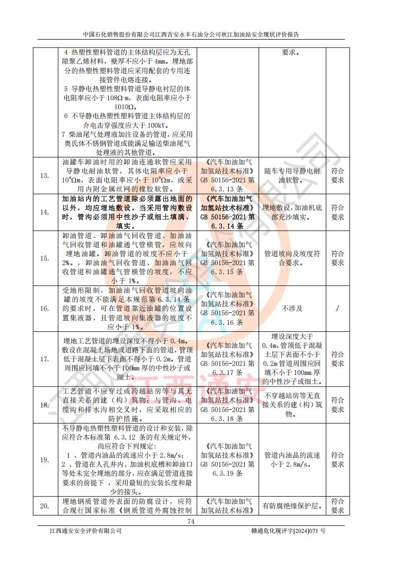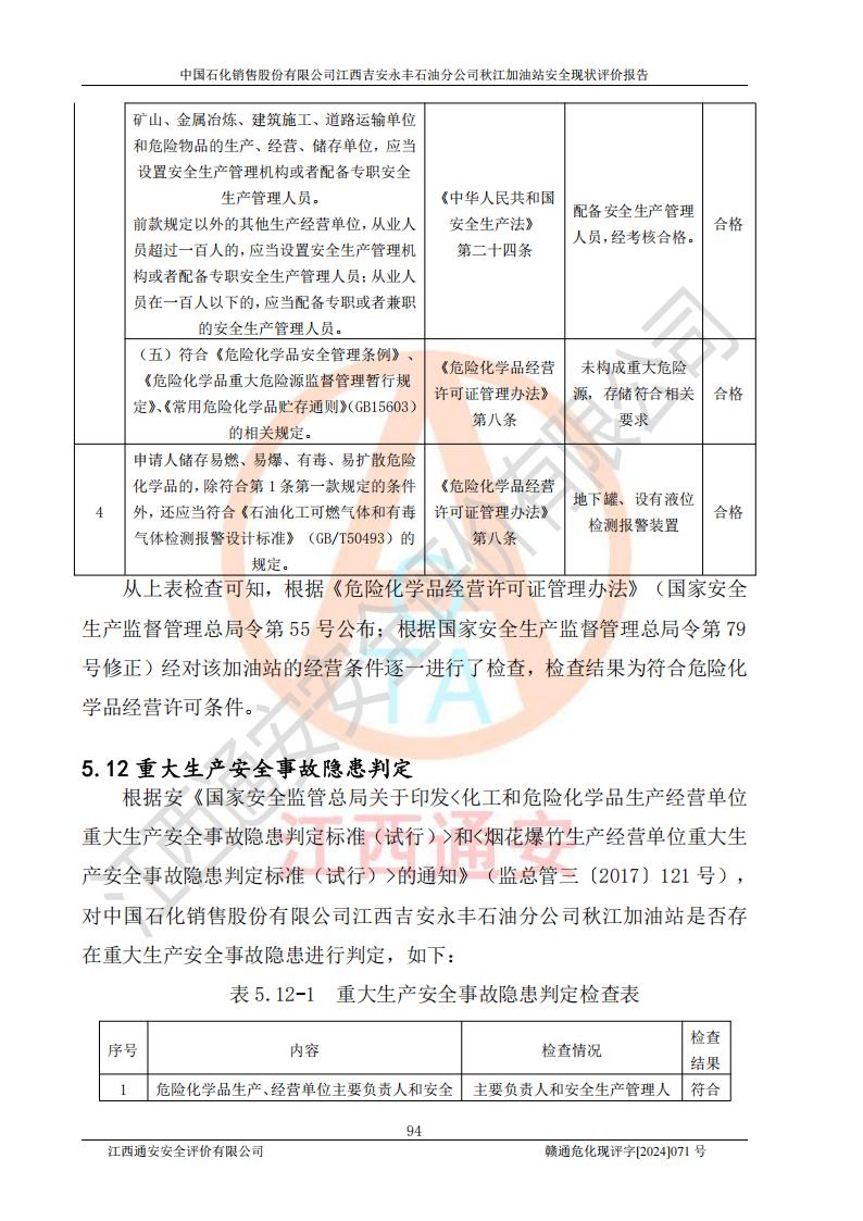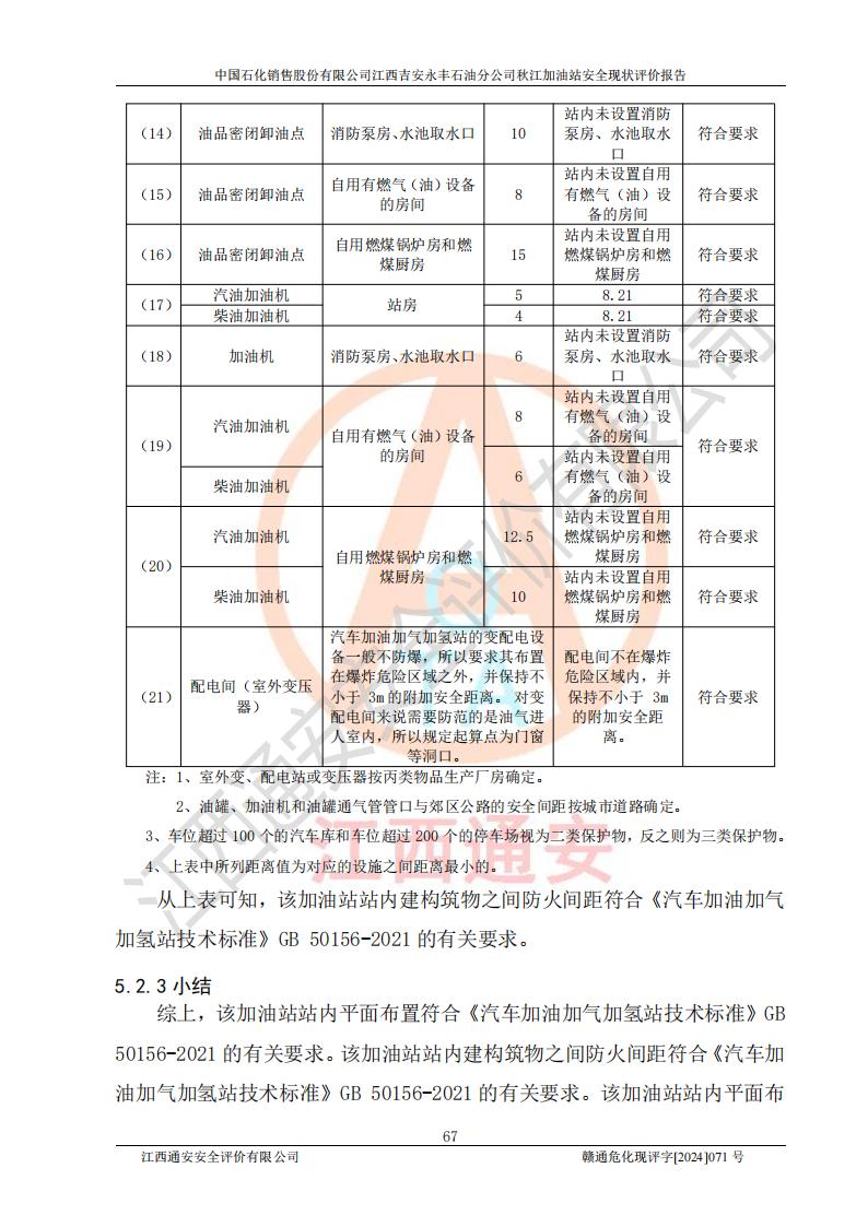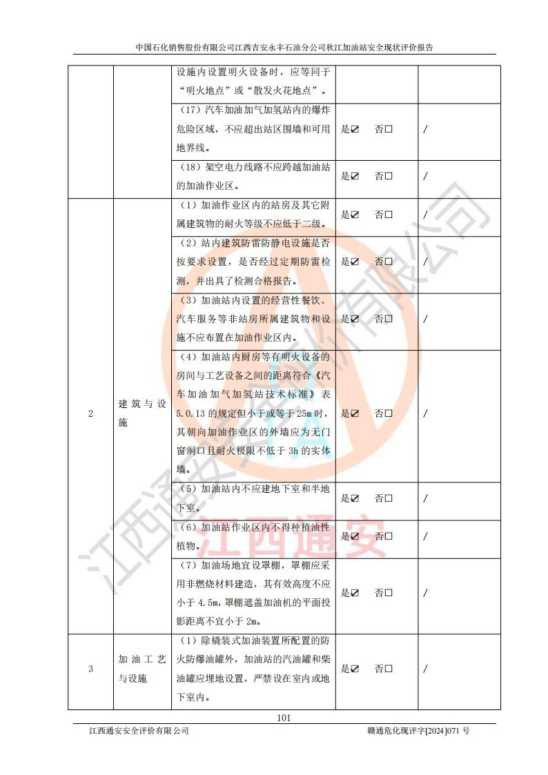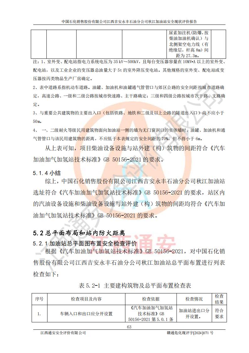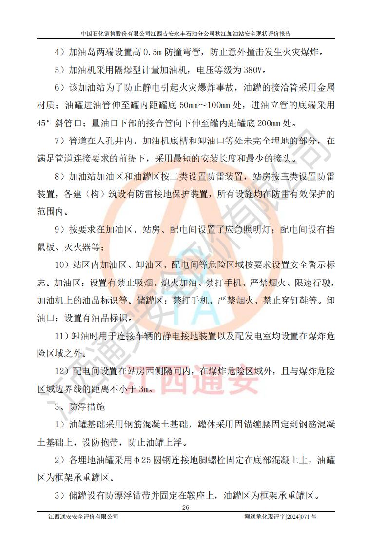 評價結論 | 江西高速實業(yè)開發(fā)有限公司吉安服務區(qū)西加油站改造項目現場布置與設計圖紙一致,有關從業(yè)人員資質符合《江西省危險化學品安全專項整治三年行動實施方案》要求,具備**有關安全生產法律、法規(guī)、部門規(guī)章及標準規(guī)范要求的安全條件,符合經營和儲存危險化學品的安全條件要求,具備安全驗收的要求。 | |||