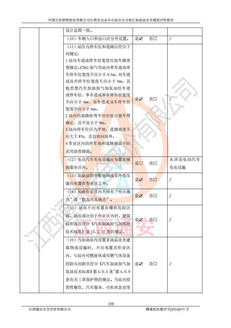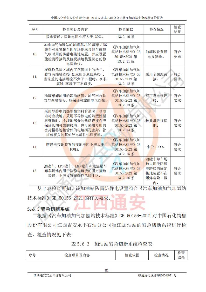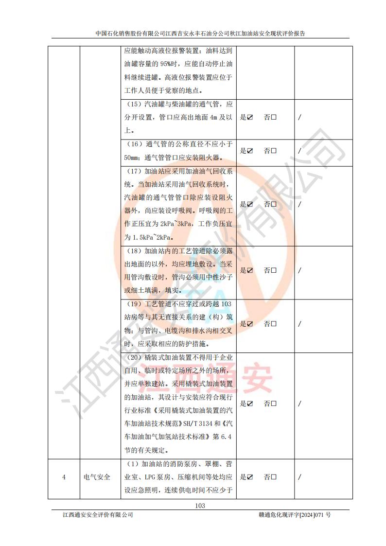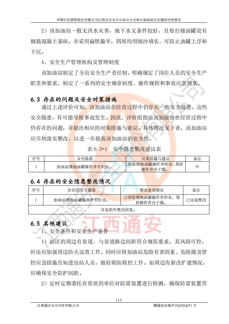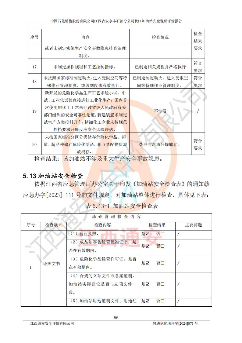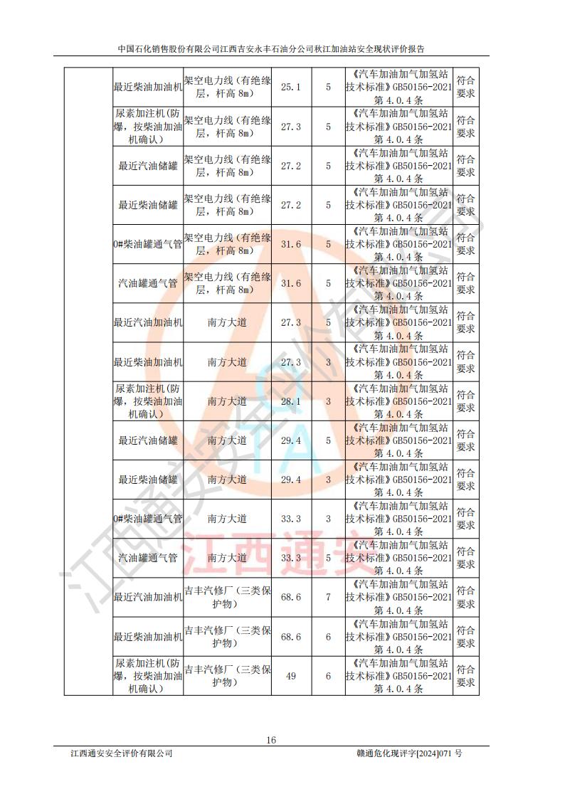 評價結論 | 江西高速實業(yè)開發(fā)有限公司吉安服務區(qū)西加油站改造項目現場布置與設計圖紙一致,有關從業(yè)人員資質符合《江西省危險化學品安全專項整治三年行動實施方案》要求,具備**有關安全生產法律、法規(guī)、部門規(guī)章及標準規(guī)范要求的安全條件,符合經營和儲存危險化學品的安全條件要求,具備安全驗收的要求。 | |||