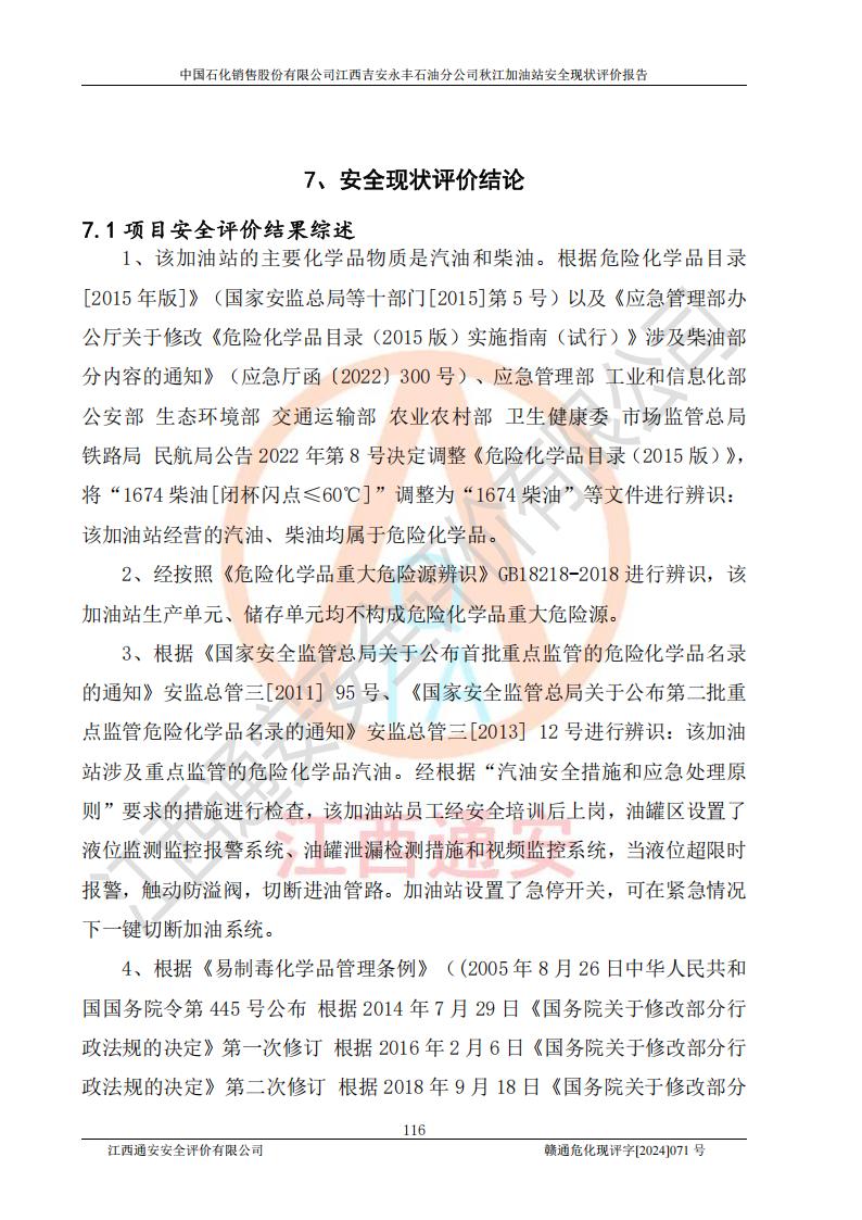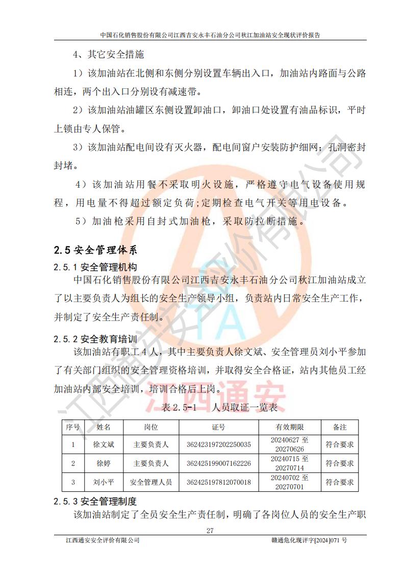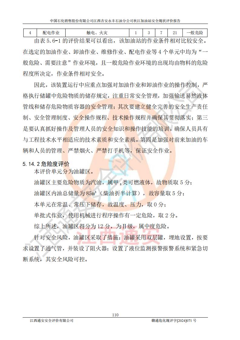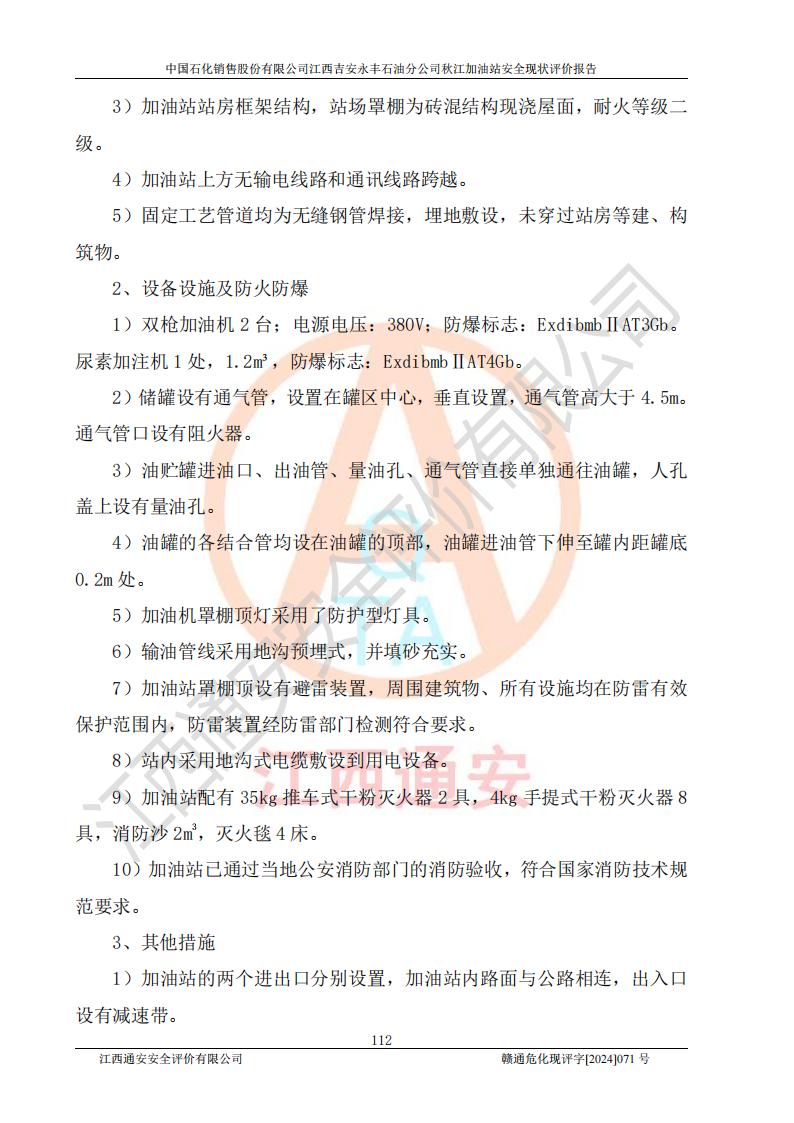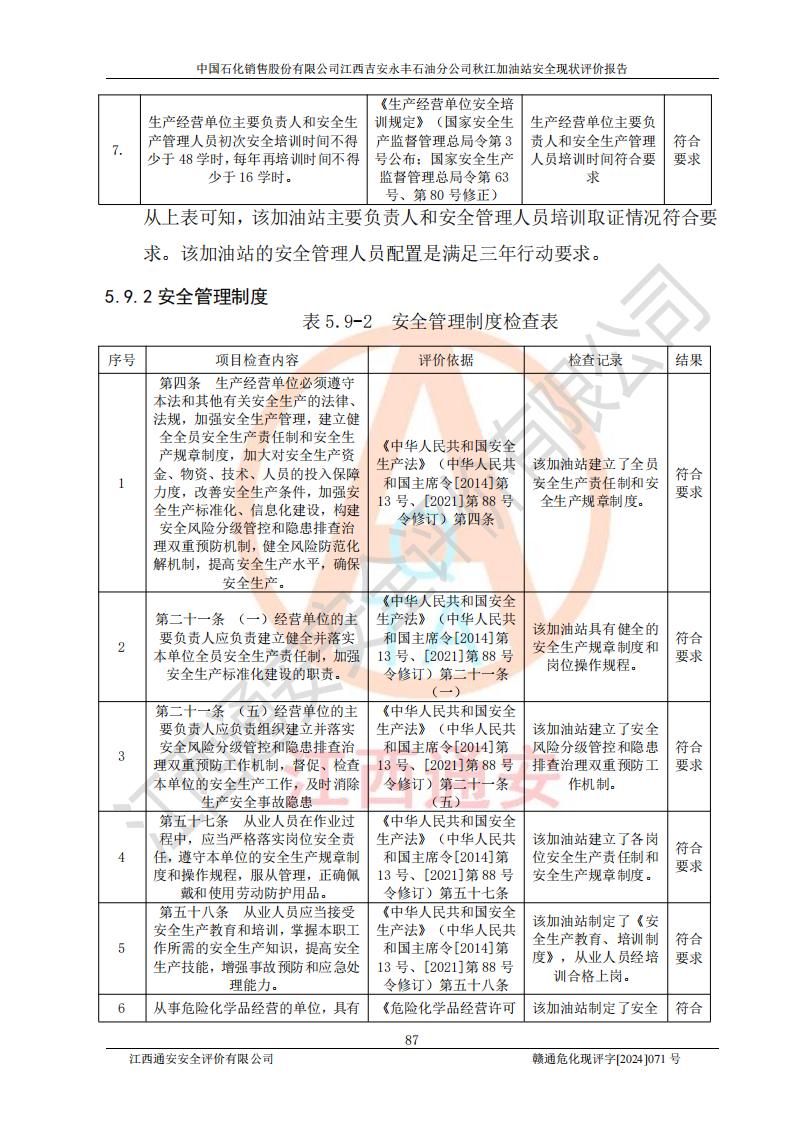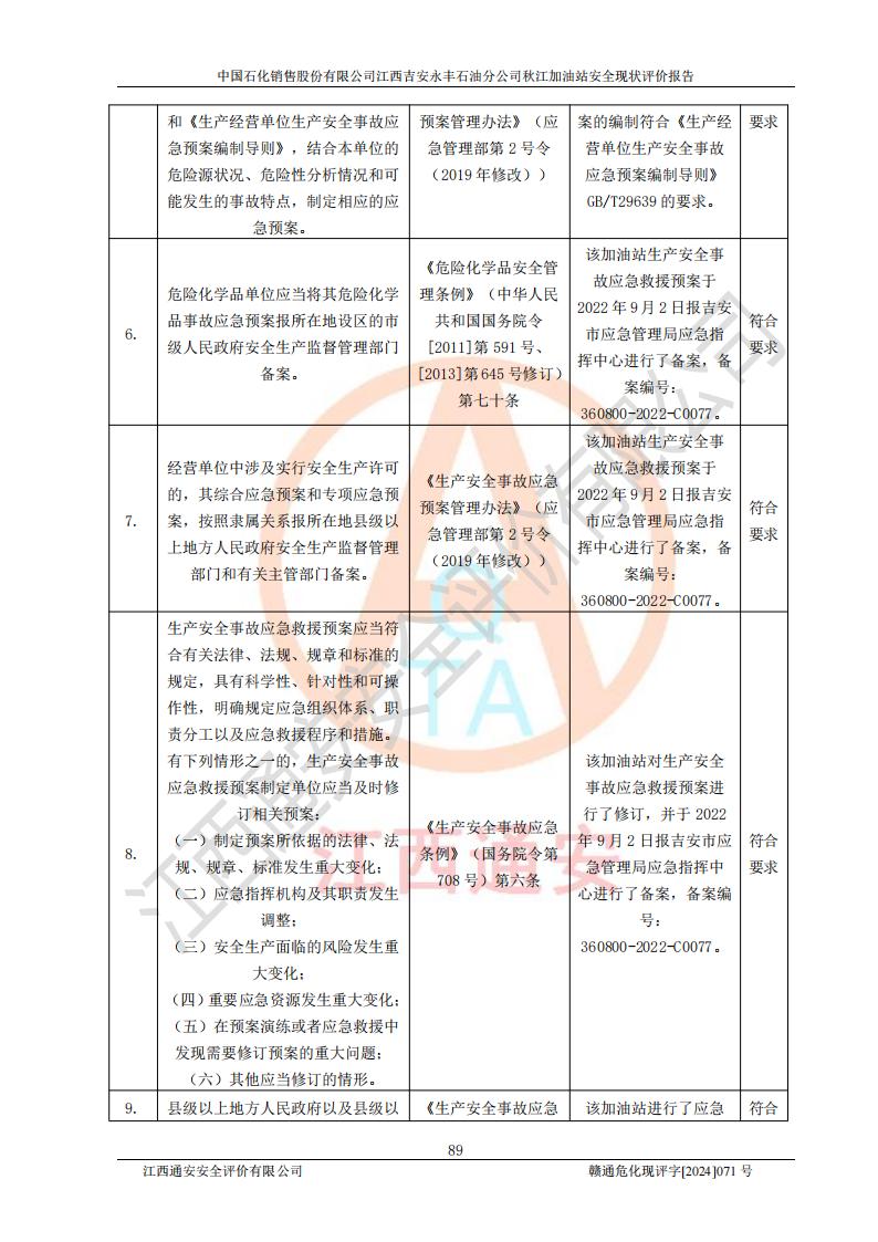 評價結論 | 江西高速實業(yè)開發(fā)有限公司吉安服務區(qū)西加油站改造項目現場布置與設計圖紙一致,有關從業(yè)人員資質符合《江西省危險化學品安全專項整治三年行動實施方案》要求,具備**有關安全生產法律、法規(guī)、部門規(guī)章及標準規(guī)范要求的安全條件,符合經營和儲存危險化學品的安全條件要求,具備安全驗收的要求。 | |||