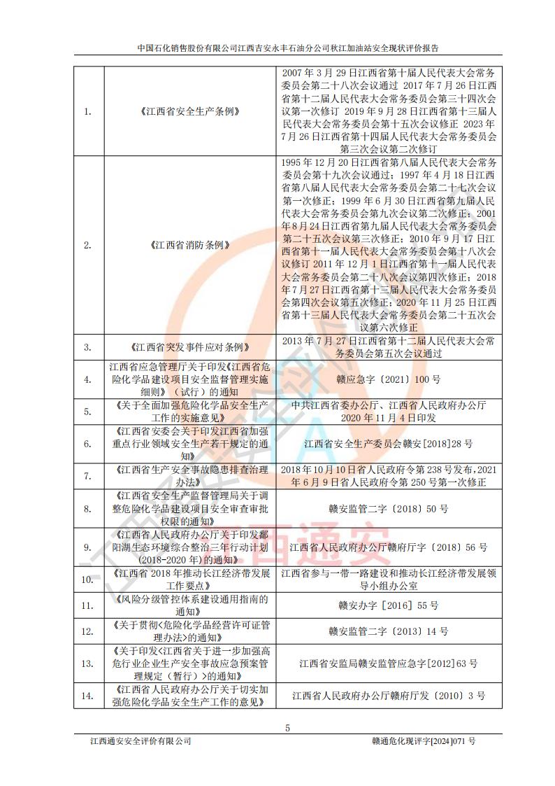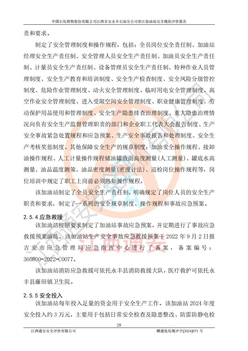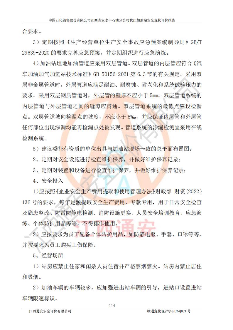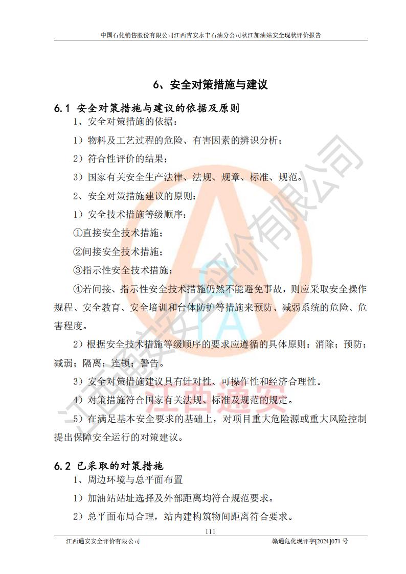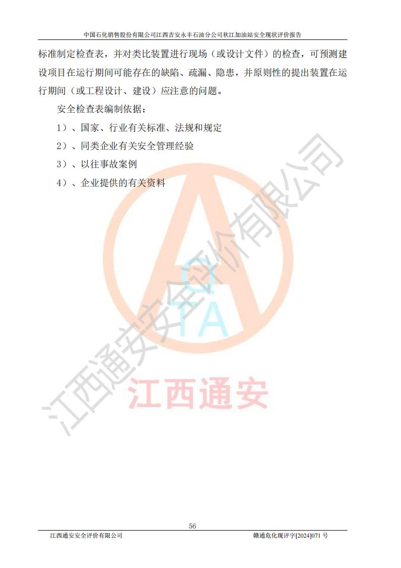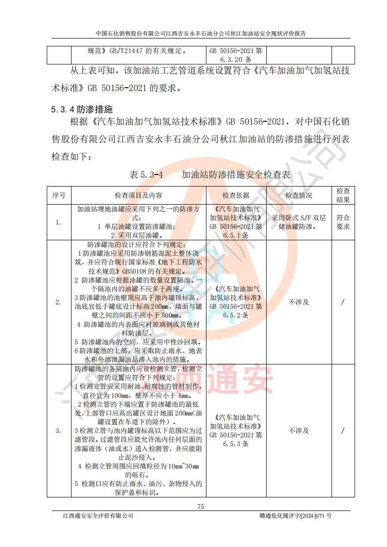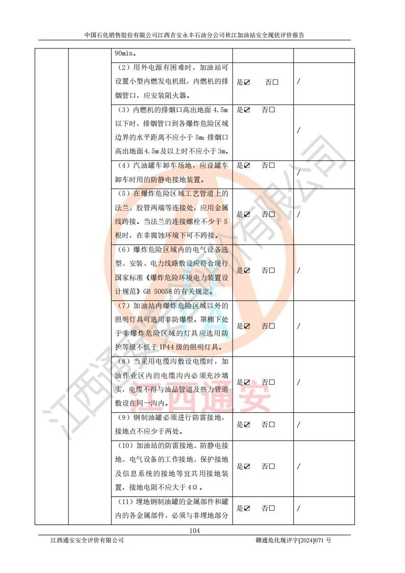 評價結論 | 江西高速實業(yè)開發(fā)有限公司吉安服務區(qū)西加油站改造項目現場布置與設計圖紙一致,有關從業(yè)人員資質符合《江西省危險化學品安全專項整治三年行動實施方案》要求,具備**有關安全生產法律、法規(guī)、部門規(guī)章及標準規(guī)范要求的安全條件,符合經營和儲存危險化學品的安全條件要求,具備安全驗收的要求。 | |||