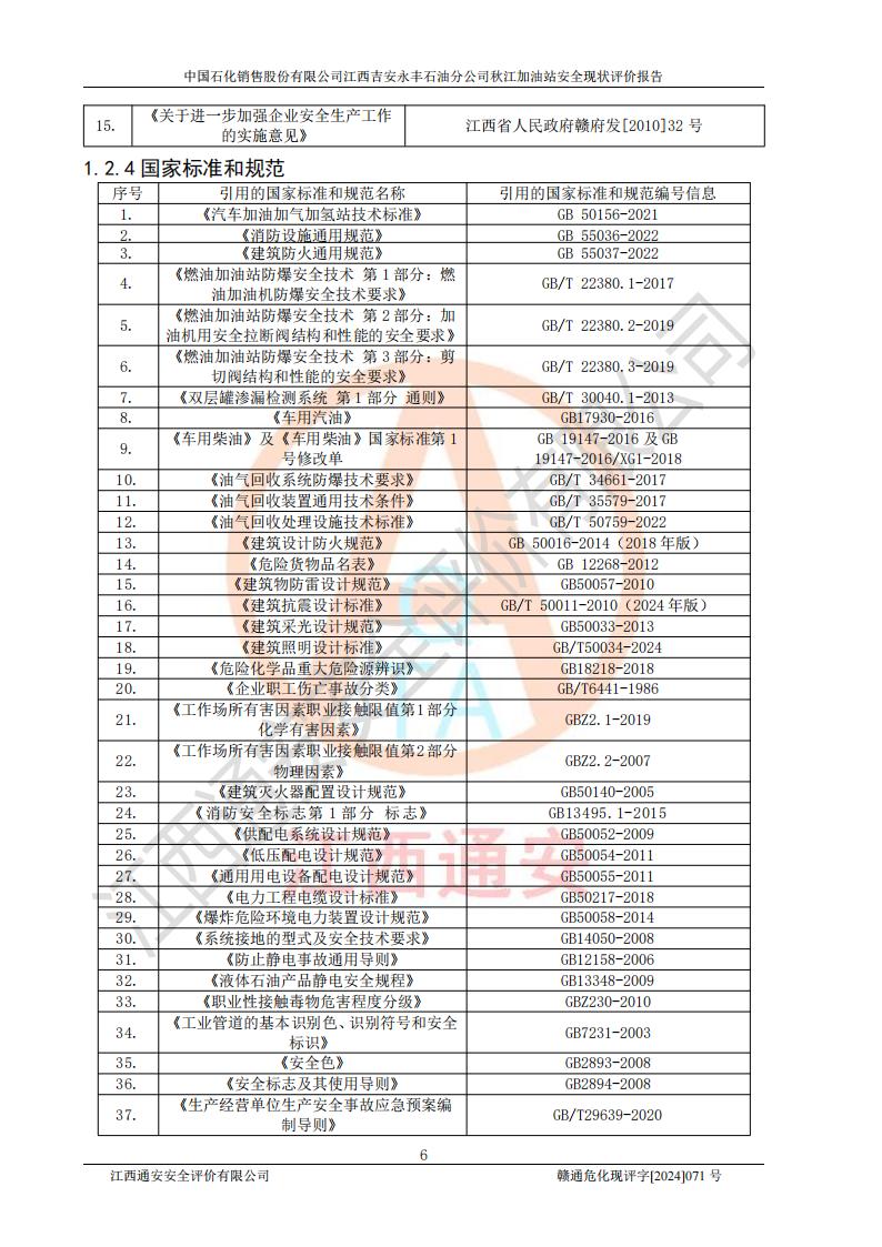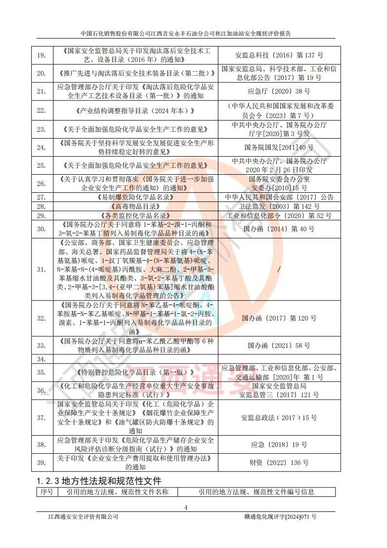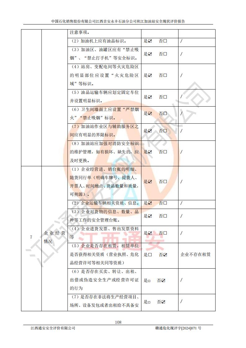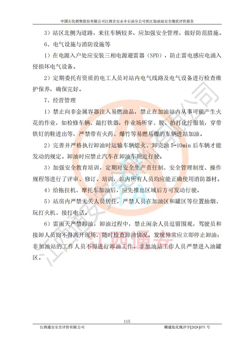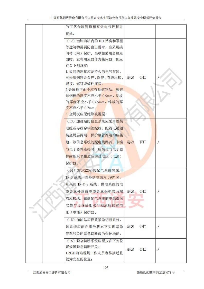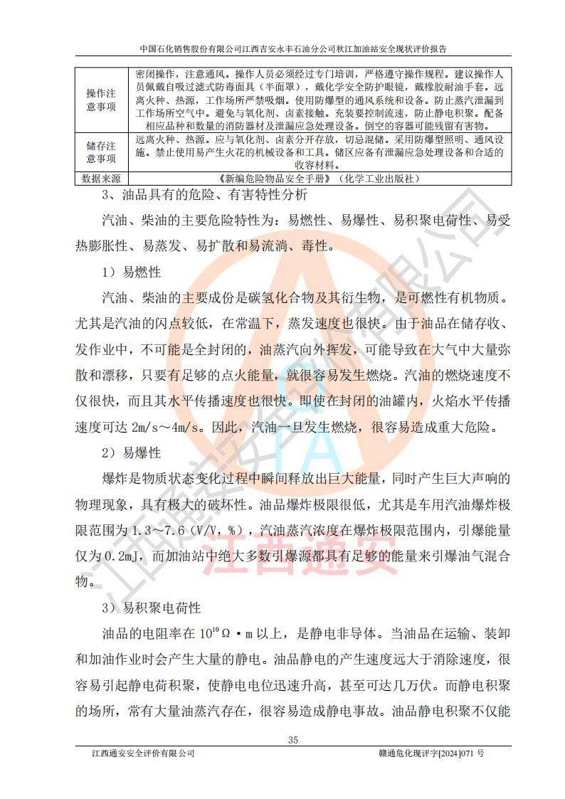 評價結論 | 江西高速實業(yè)開發(fā)有限公司吉安服務區(qū)西加油站改造項目現場布置與設計圖紙一致,有關從業(yè)人員資質符合《江西省危險化學品安全專項整治三年行動實施方案》要求,具備**有關安全生產法律、法規(guī)、部門規(guī)章及標準規(guī)范要求的安全條件,符合經營和儲存危險化學品的安全條件要求,具備安全驗收的要求。 | |||