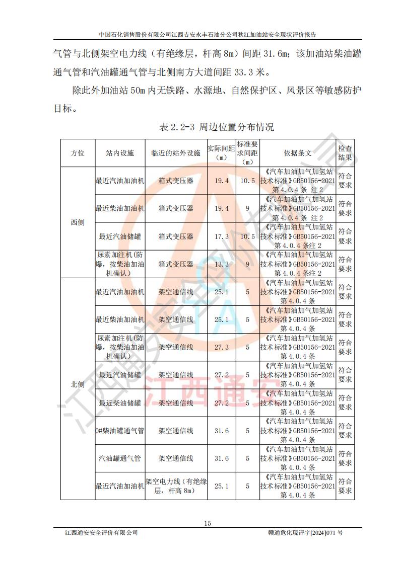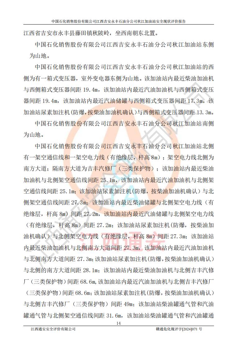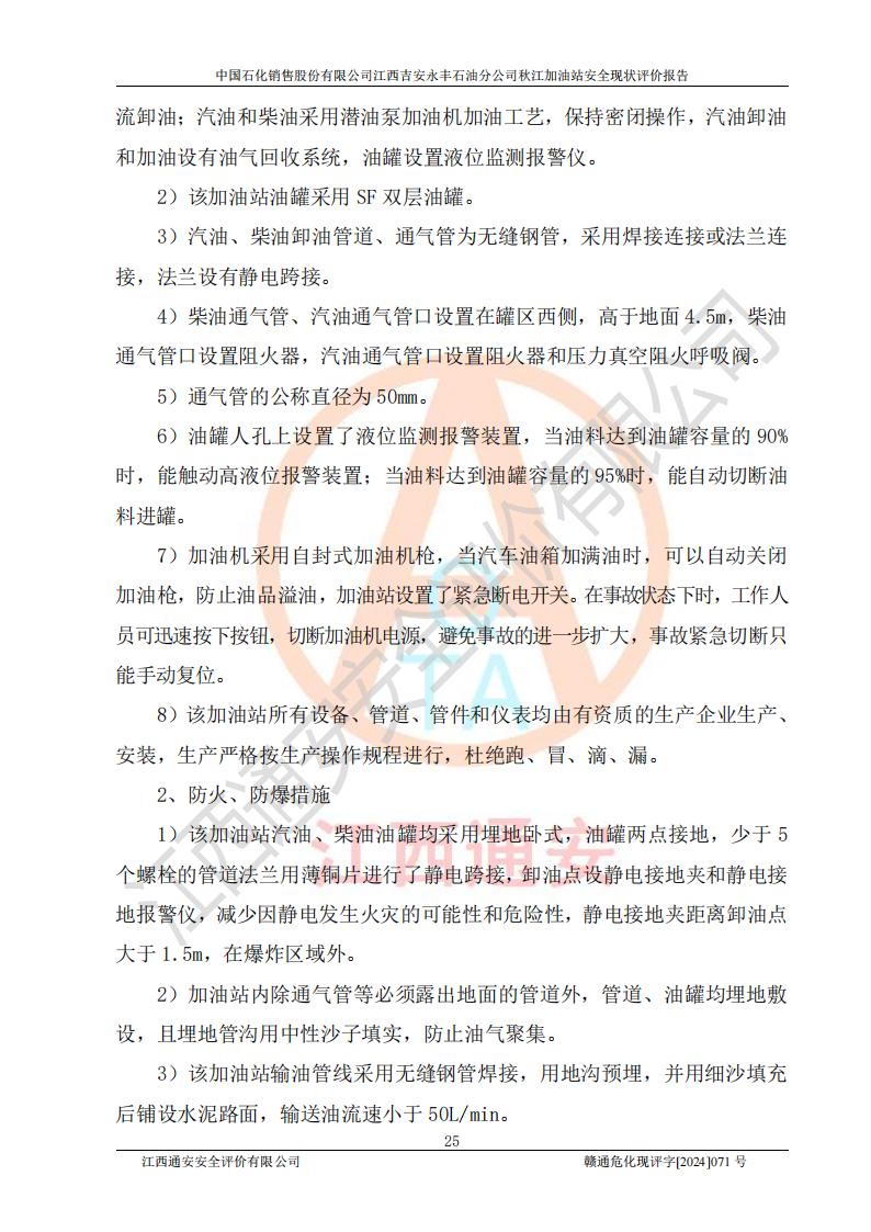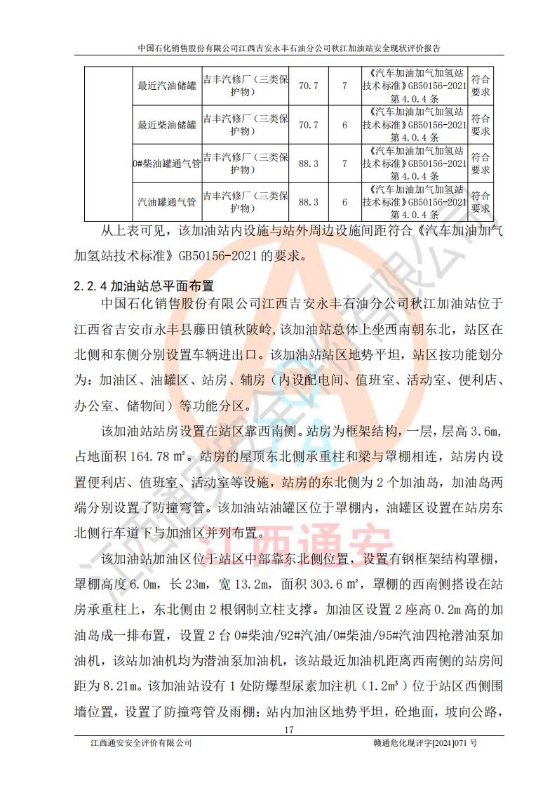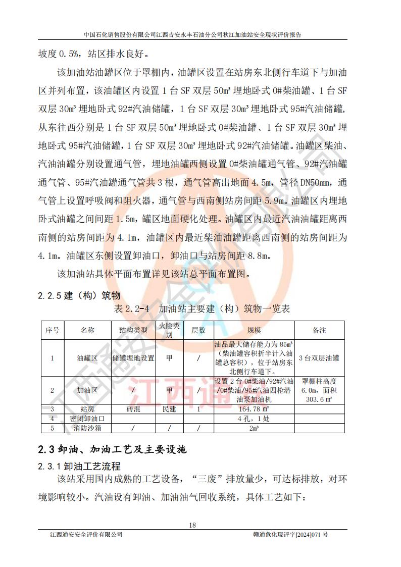 項目簡介 | 江西高速實業(yè)開發(fā)有限公司吉安服務區(qū)西加油站成立于2021年9月22日,企業(yè)類型:其他有限責任公司分公司,法定**人余勇。 江西高速實業(yè)開發(fā)有限公司吉安服務區(qū)西加油站2024年8月30日取得由吉安縣發(fā)展和改革委員會出具的《江西省企業(yè)投資項目備案通知書》,項目統(tǒng)一代碼為:2408-360821-04-01-467493,項目名稱:江西高速實業(yè)開發(fā)有限公司吉安服務區(qū)西加油站改造項目。 江西高速實業(yè)開發(fā)有限公司吉安服務區(qū)西加油站位于江西省吉安市吉安縣大廣高速吉安東區(qū)服務區(qū)(橫江段),加油站租賃江西贛粵實業(yè)發(fā)展有限公司用地。該加油站設有的1座503的0#柴油埋地臥式雙層貯罐、2座50m3的92#汽油埋地臥式油罐、1座50m3的95#汽油埋地臥式雙層油罐、1座30m3的95#汽油埋地臥式雙層油罐;*大存儲量為230m3,實際油品折算總容量為205m3(柴油折半),屬于**加油站。 江西高速實業(yè)開發(fā)有限公司吉安服務區(qū)西加油站2024年9月委托山東新安達工程咨詢有限公司編制《江西高速實業(yè)開發(fā)有限公司吉安服務區(qū)西加油站改造項目安全條件評價報告》,并于2024年9月13日取得《危險化學品建設項目安全條件備案告知意見書》(吉市危化項目安條審字[2024]9號)。 江西高速實業(yè)開發(fā)有限公司吉安服務區(qū)西加油站改造項目2024年11月委托天津中德工程設計有限公司編制《江西高速實業(yè)開發(fā)有限公司吉安服務區(qū)西加油站改造項目安全設施設計專篇》,并于2024年11月14日取得《危險化學品建設項目安全設施設計審查意見書》(吉市危化項目安設審字[2024]31號)。 項目生產過程中涉及的危險化學品有:汽油、柴油等。 項目各生產和儲存單元均未構成危險化學品重大危險源。 | |||