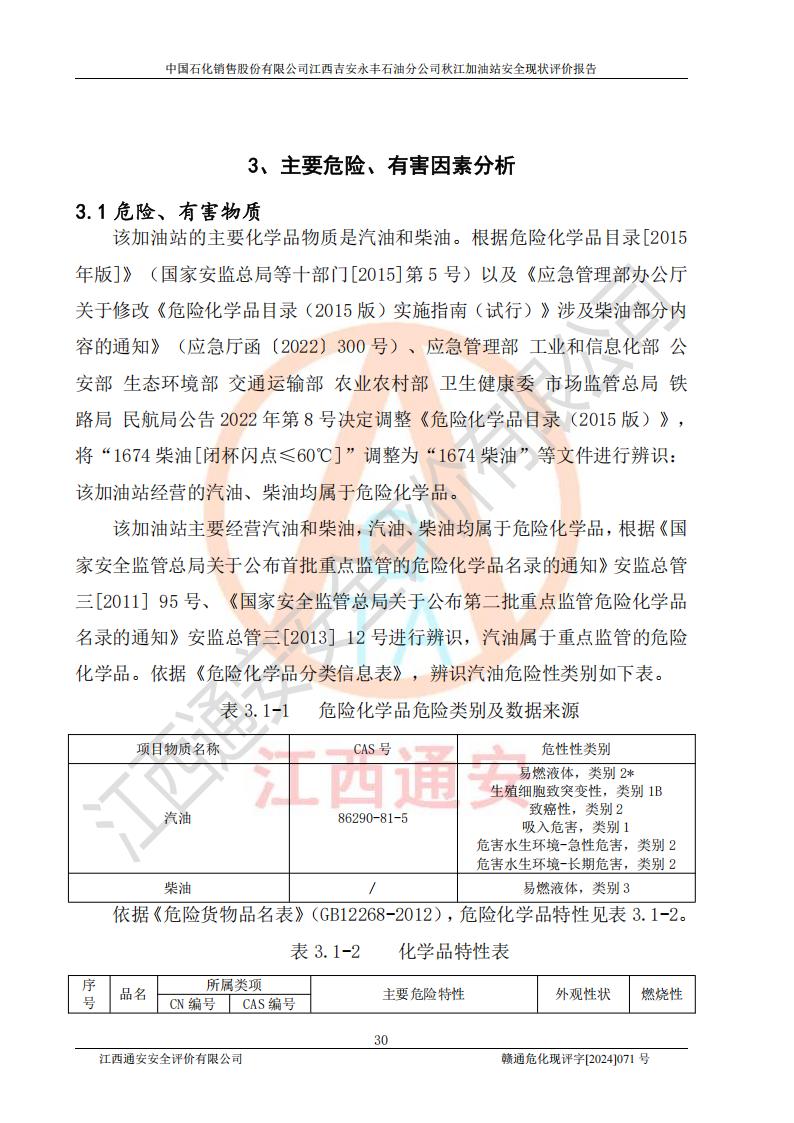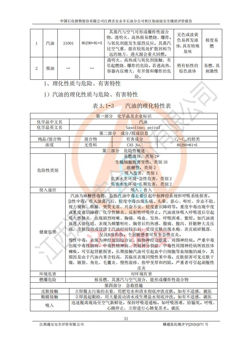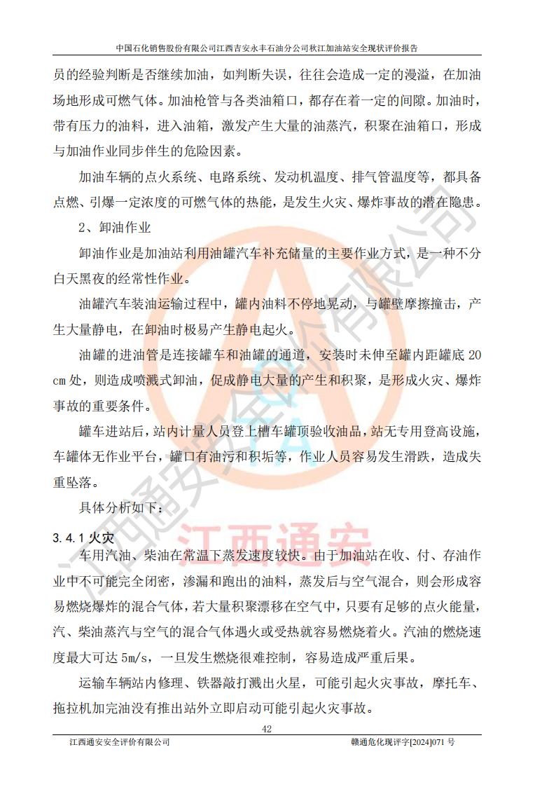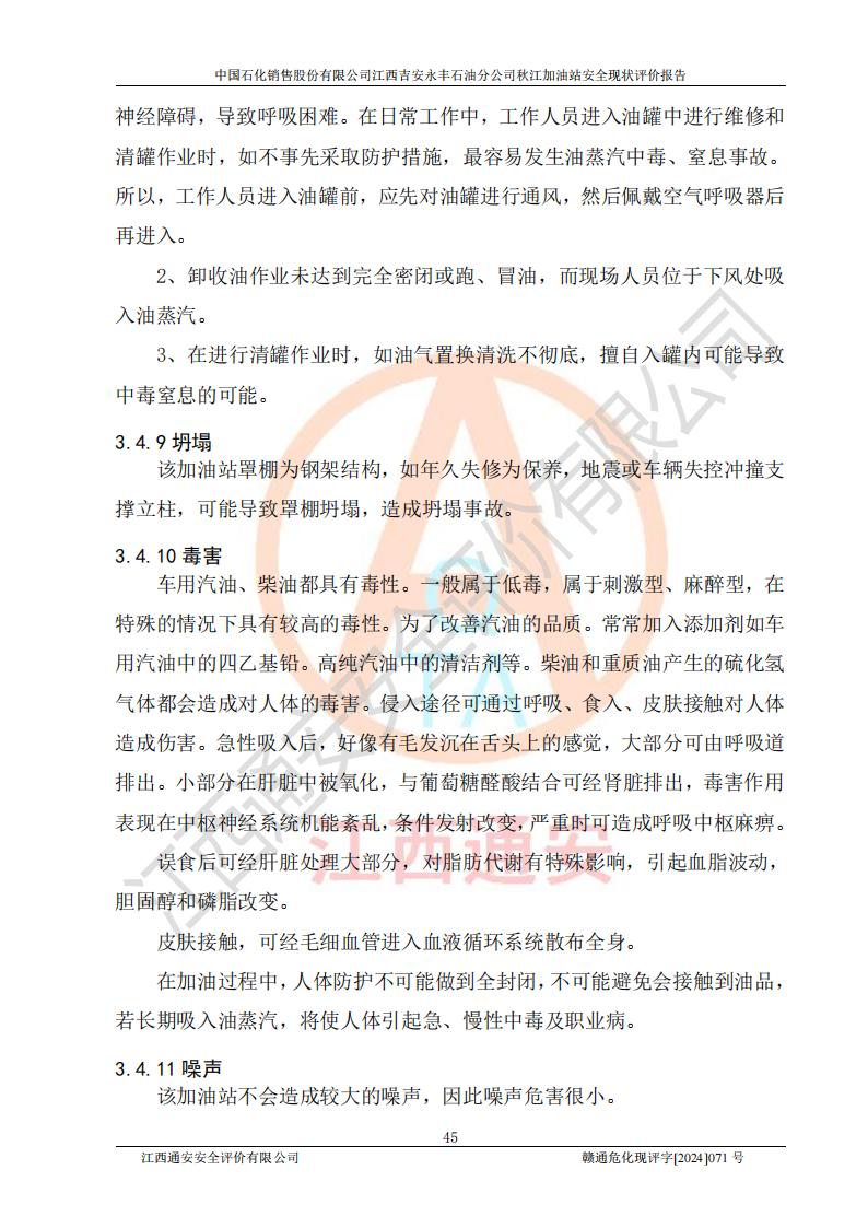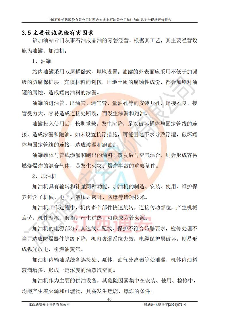 項目簡介 | 江西高速實業(yè)開發(fā)有限公司吉安服務區(qū)西加油站成立于2021年9月22日,企業(yè)類型:其他有限責任公司分公司,法定**人余勇。 江西高速實業(yè)開發(fā)有限公司吉安服務區(qū)西加油站2024年8月30日取得由吉安縣發(fā)展和改革委員會出具的《江西省企業(yè)投資項目備案通知書》,項目統(tǒng)一代碼為:2408-360821-04-01-467493,項目名稱:江西高速實業(yè)開發(fā)有限公司吉安服務區(qū)西加油站改造項目。 江西高速實業(yè)開發(fā)有限公司吉安服務區(qū)西加油站位于江西省吉安市吉安縣大廣高速吉安東區(qū)服務區(qū)(橫江段),加油站租賃江西贛粵實業(yè)發(fā)展有限公司用地。該加油站設有的1座503的0#柴油埋地臥式雙層貯罐、2座50m3的92#汽油埋地臥式油罐、1座50m3的95#汽油埋地臥式雙層油罐、1座30m3的95#汽油埋地臥式雙層油罐;*大存儲量為230m3,實際油品折算總容量為205m3(柴油折半),屬于**加油站。 江西高速實業(yè)開發(fā)有限公司吉安服務區(qū)西加油站2024年9月委托山東新安達工程咨詢有限公司編制《江西高速實業(yè)開發(fā)有限公司吉安服務區(qū)西加油站改造項目安全條件評價報告》,并于2024年9月13日取得《危險化學品建設項目安全條件備案告知意見書》(吉市危化項目安條審字[2024]9號)。 江西高速實業(yè)開發(fā)有限公司吉安服務區(qū)西加油站改造項目2024年11月委托天津中德工程設計有限公司編制《江西高速實業(yè)開發(fā)有限公司吉安服務區(qū)西加油站改造項目安全設施設計專篇》,并于2024年11月14日取得《危險化學品建設項目安全設施設計審查意見書》(吉市危化項目安設審字[2024]31號)。 項目生產過程中涉及的危險化學品有:汽油、柴油等。 項目各生產和儲存單元均未構成危險化學品重大危險源。 | |||