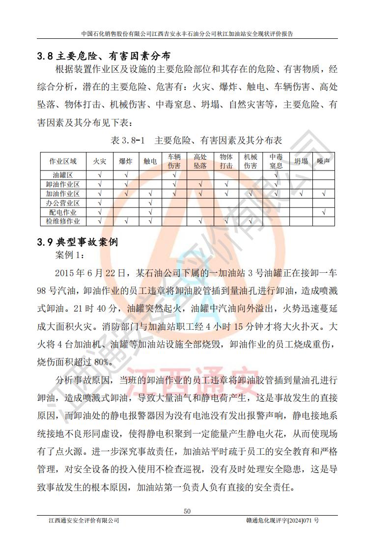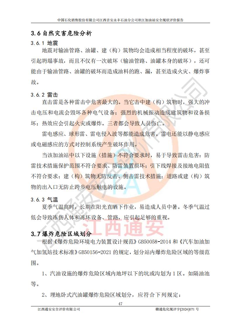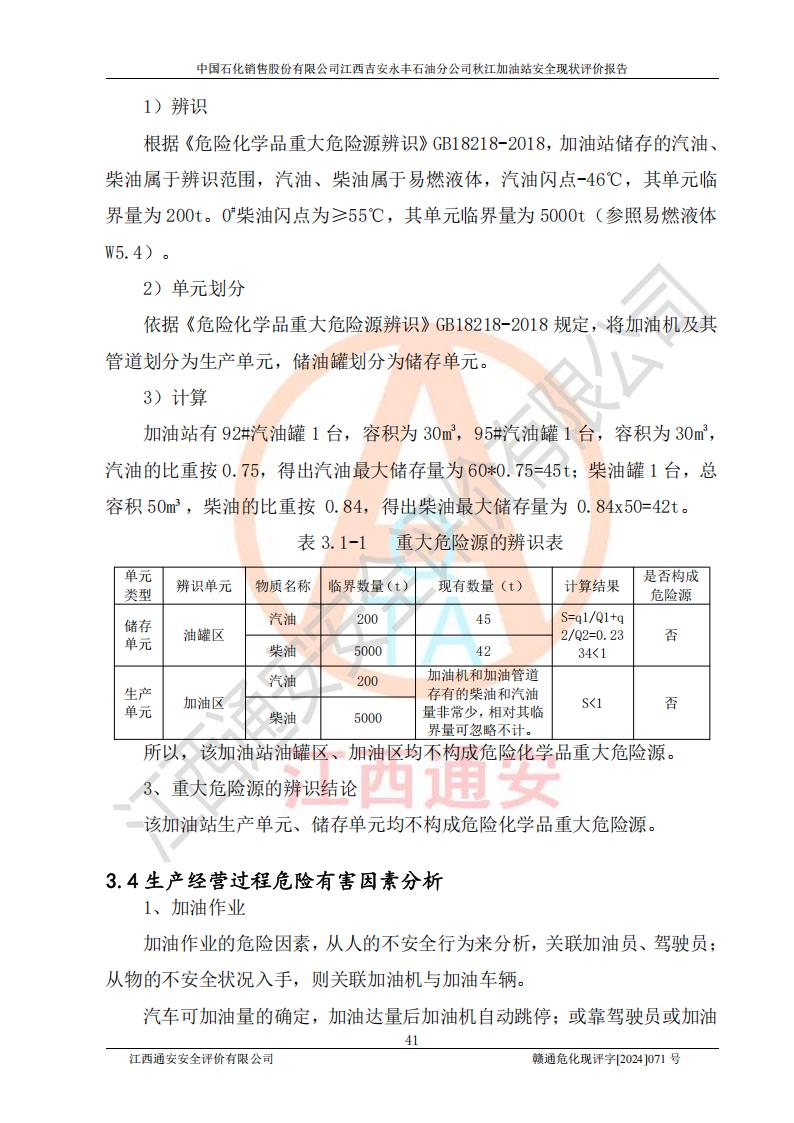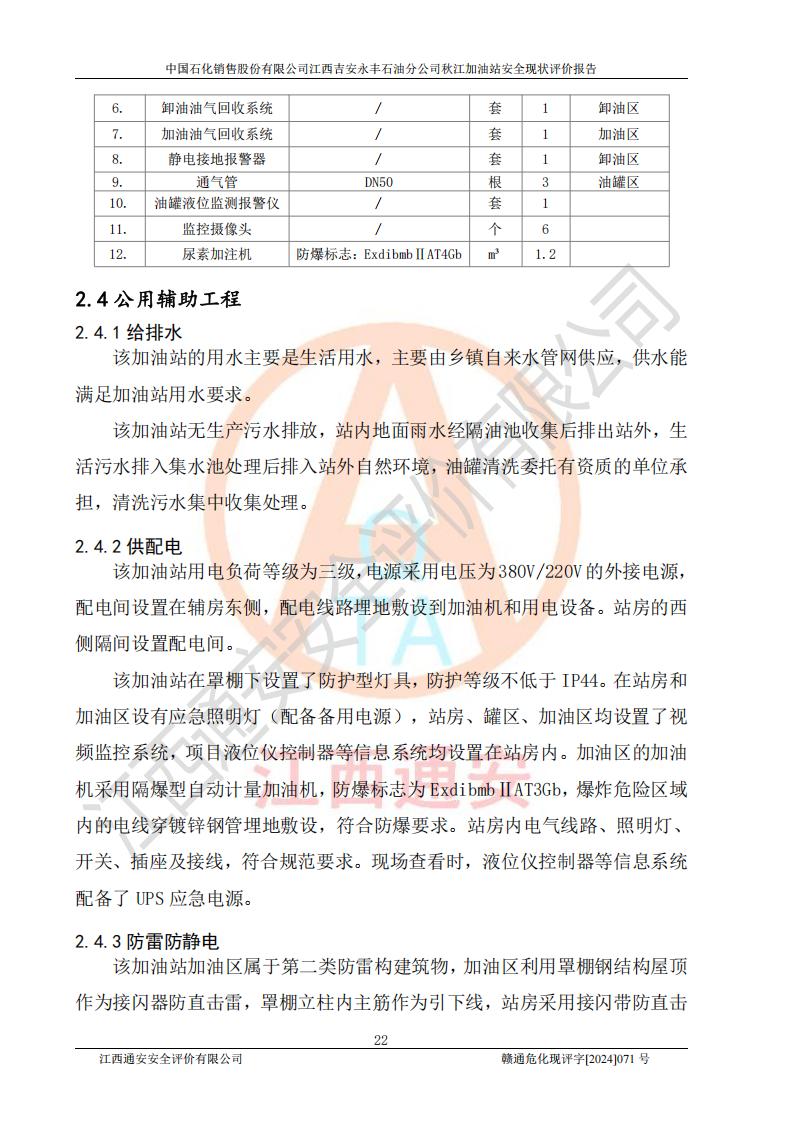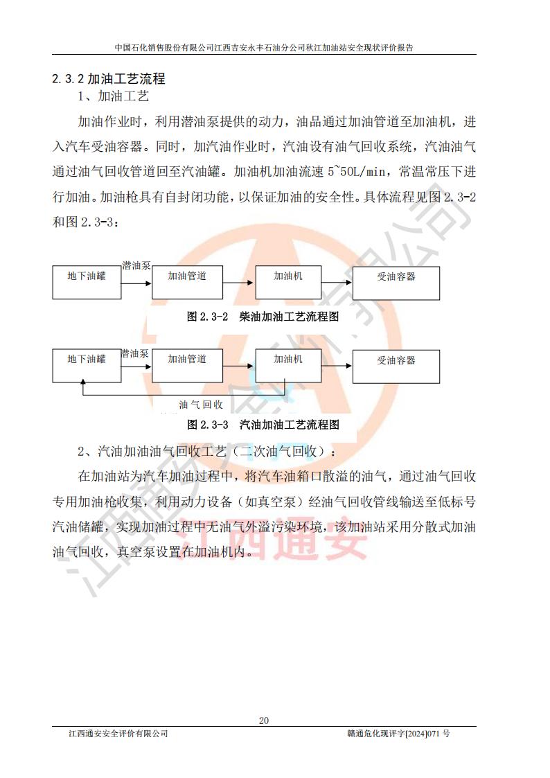 項目簡介 | 江西高速實業(yè)開發(fā)有限公司吉安服務區(qū)西加油站成立于2021年9月22日,企業(yè)類型:其他有限責任公司分公司,法定**人余勇。 江西高速實業(yè)開發(fā)有限公司吉安服務區(qū)西加油站2024年8月30日取得由吉安縣發(fā)展和改革委員會出具的《江西省企業(yè)投資項目備案通知書》,項目統(tǒng)一代碼為:2408-360821-04-01-467493,項目名稱:江西高速實業(yè)開發(fā)有限公司吉安服務區(qū)西加油站改造項目。 江西高速實業(yè)開發(fā)有限公司吉安服務區(qū)西加油站位于江西省吉安市吉安縣大廣高速吉安東區(qū)服務區(qū)(橫江段),加油站租賃江西贛粵實業(yè)發(fā)展有限公司用地。該加油站設有的1座503的0#柴油埋地臥式雙層貯罐、2座50m3的92#汽油埋地臥式油罐、1座50m3的95#汽油埋地臥式雙層油罐、1座30m3的95#汽油埋地臥式雙層油罐;*大存儲量為230m3,實際油品折算總容量為205m3(柴油折半),屬于**加油站。 江西高速實業(yè)開發(fā)有限公司吉安服務區(qū)西加油站2024年9月委托山東新安達工程咨詢有限公司編制《江西高速實業(yè)開發(fā)有限公司吉安服務區(qū)西加油站改造項目安全條件評價報告》,并于2024年9月13日取得《危險化學品建設項目安全條件備案告知意見書》(吉市危化項目安條審字[2024]9號)。 江西高速實業(yè)開發(fā)有限公司吉安服務區(qū)西加油站改造項目2024年11月委托天津中德工程設計有限公司編制《江西高速實業(yè)開發(fā)有限公司吉安服務區(qū)西加油站改造項目安全設施設計專篇》,并于2024年11月14日取得《危險化學品建設項目安全設施設計審查意見書》(吉市危化項目安設審字[2024]31號)。 項目生產過程中涉及的危險化學品有:汽油、柴油等。 項目各生產和儲存單元均未構成危險化學品重大危險源。 | |||