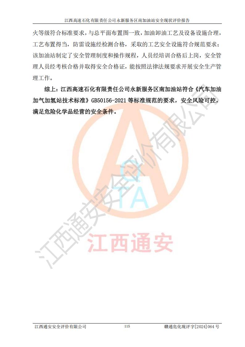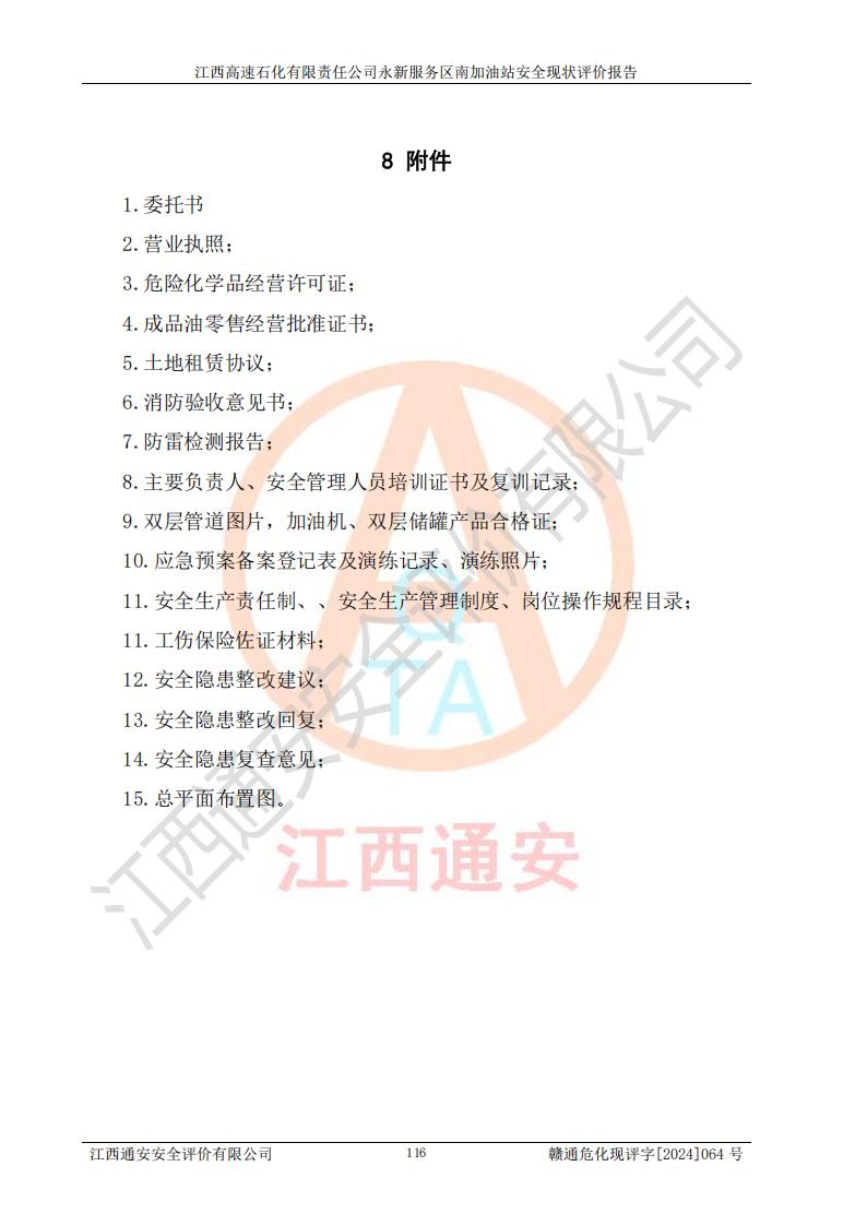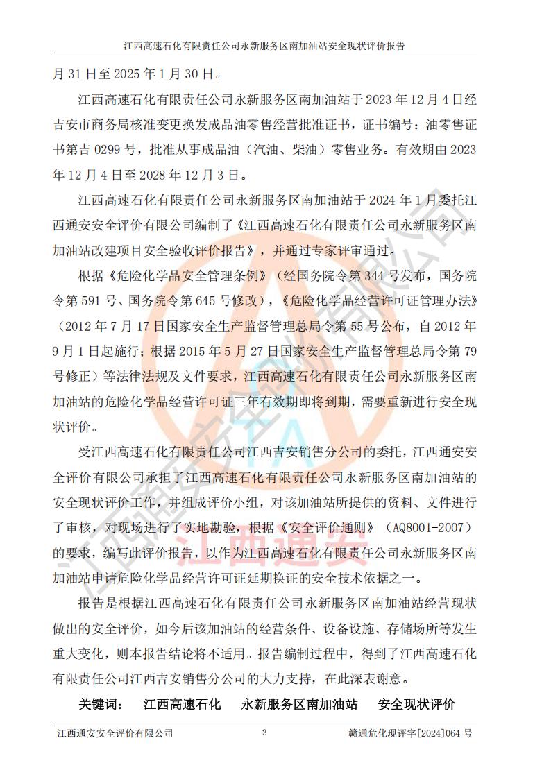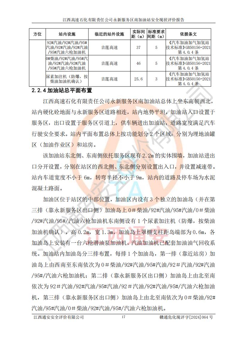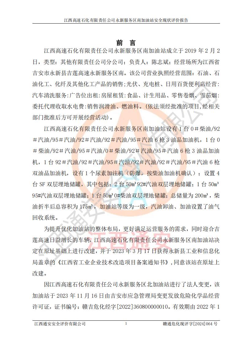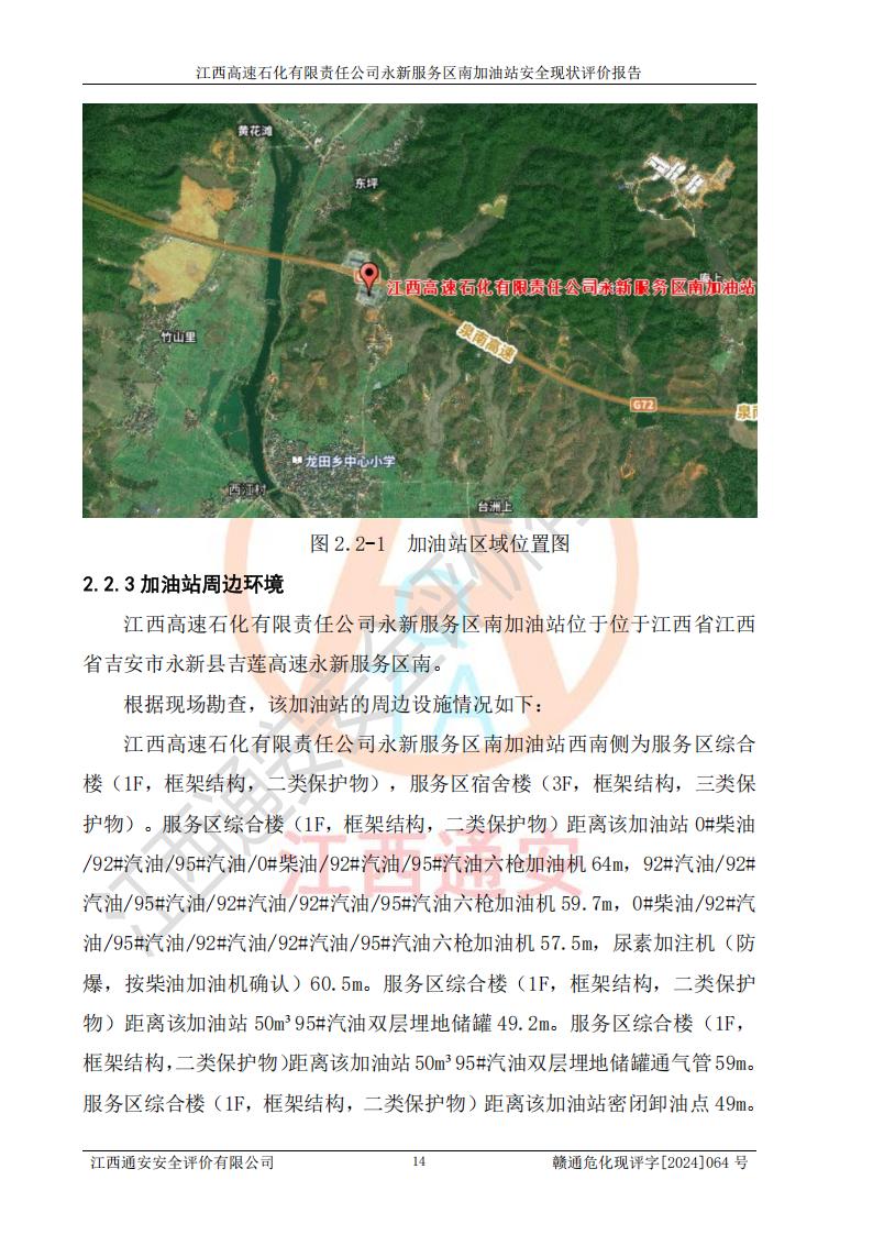 評價報告名稱 | 江西高速石化有限責任公司永新服務區(qū)南加油站安全現(xiàn)狀評價報告 | |||