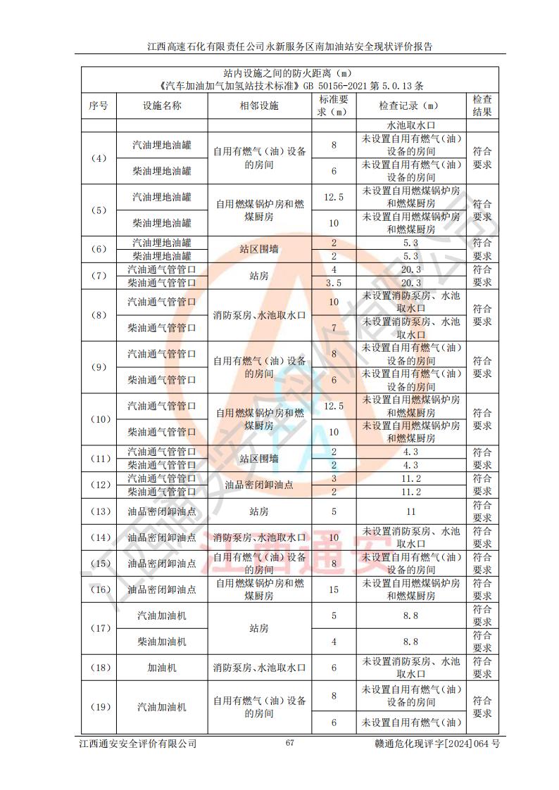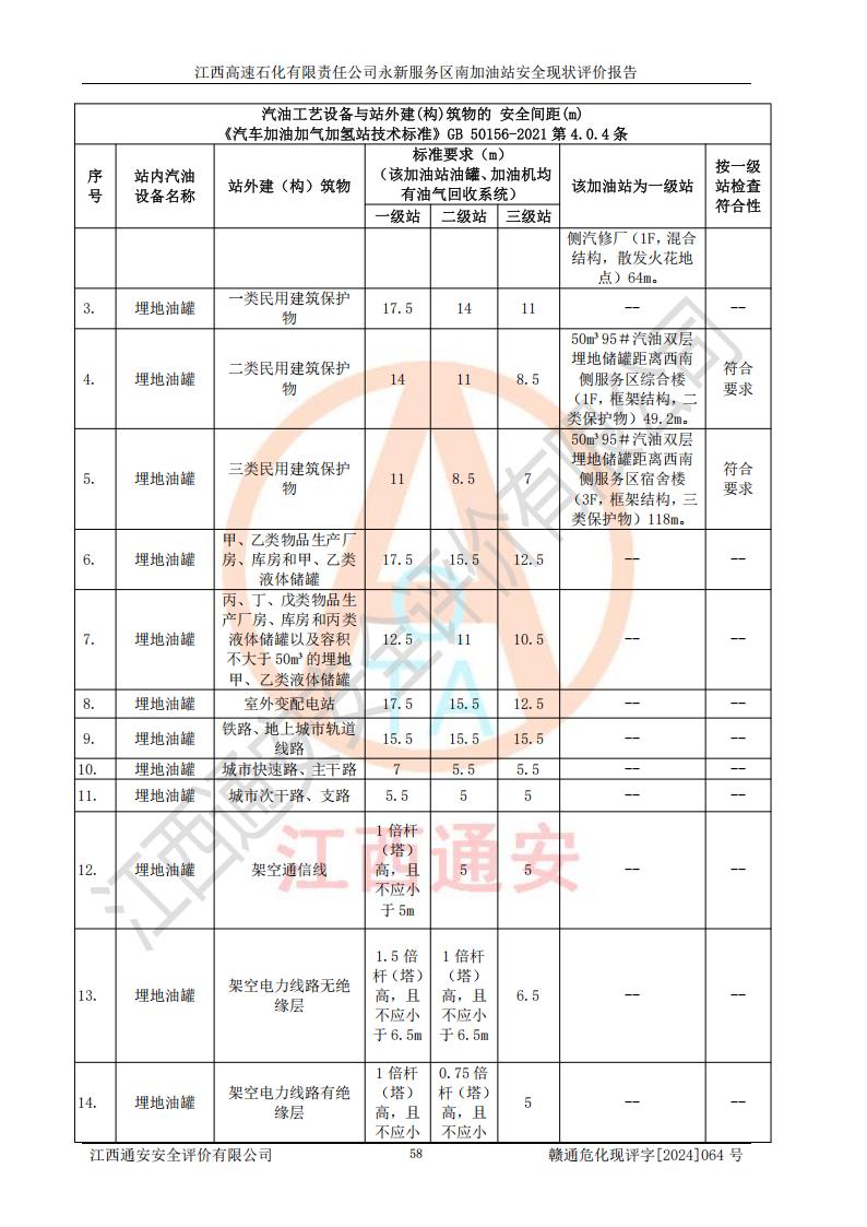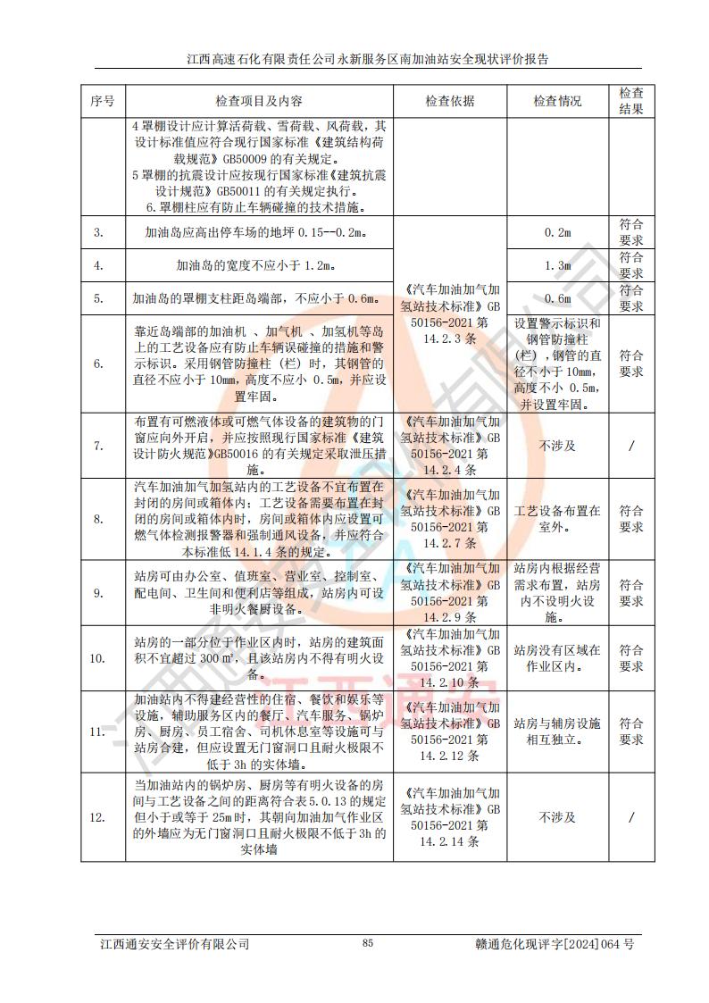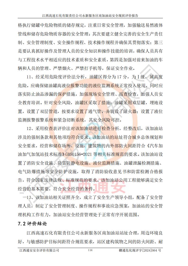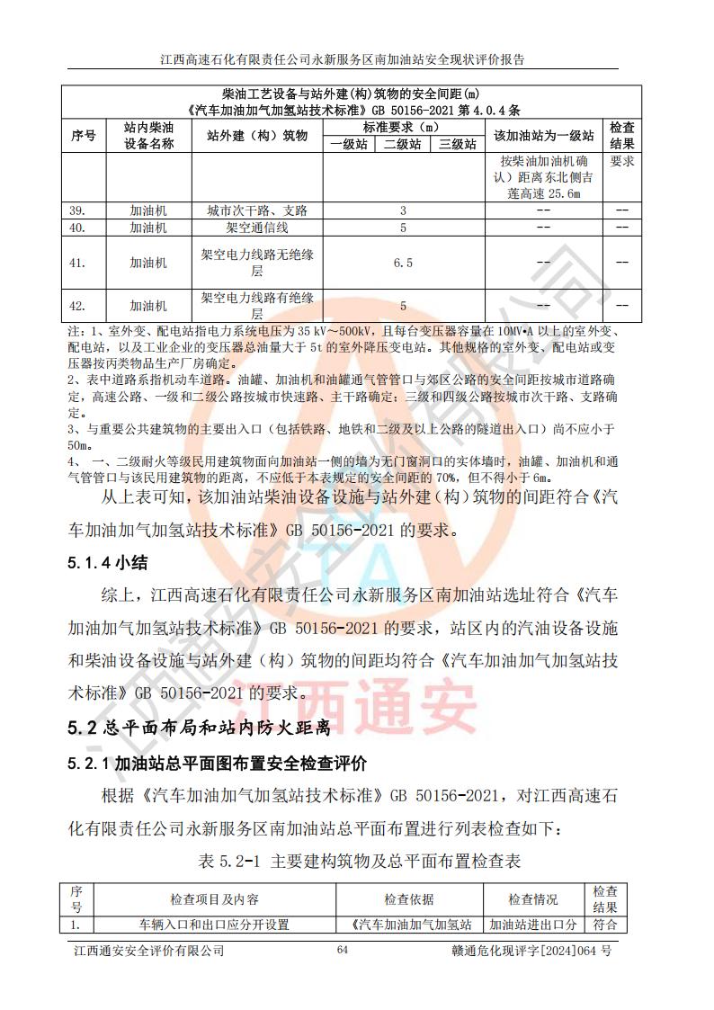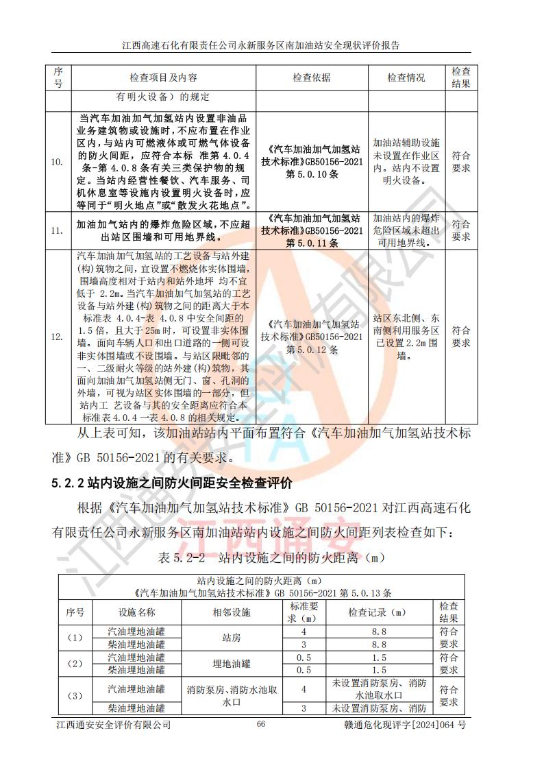評價結論 | 江西高速石化有限責任公司永新服務區(qū)南加油站站址合理,周邊環(huán)境良好,與敏感防護目標間距符合規(guī)范要求,站區(qū)建構筑物之間的防火間距、耐火等級符合標準要求,與總平面布置圖一致,加油卸油工藝及設備設施合理,工藝布置得當,防雷設施經(jīng)檢測合格,采取的工藝安全設施符合規(guī)范要求;該加油站制定了安全管理制度和操作規(guī)程,人員經(jīng)培訓合格后上崗,安全管理人員經(jīng)考核合格并取得安全合格證,能按照法律法規(guī)要求開展安全生產(chǎn)管理工作。 綜上:江西高速石化有限責任公司永新服務區(qū)南加油站符合《汽車加油加氣加氫站技術標準》GB50156-2021等標準規(guī)范的要求,安全風險可控,滿足危險化學品經(jīng)營的安全條件。 | |||