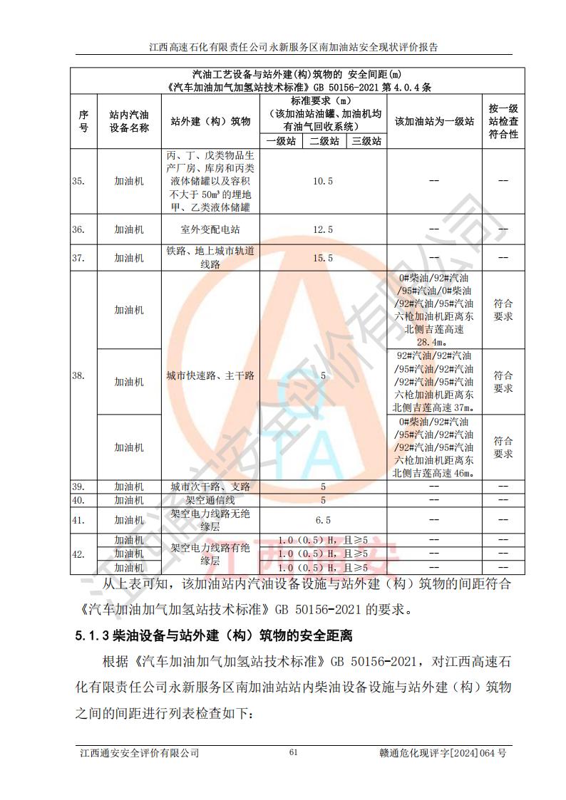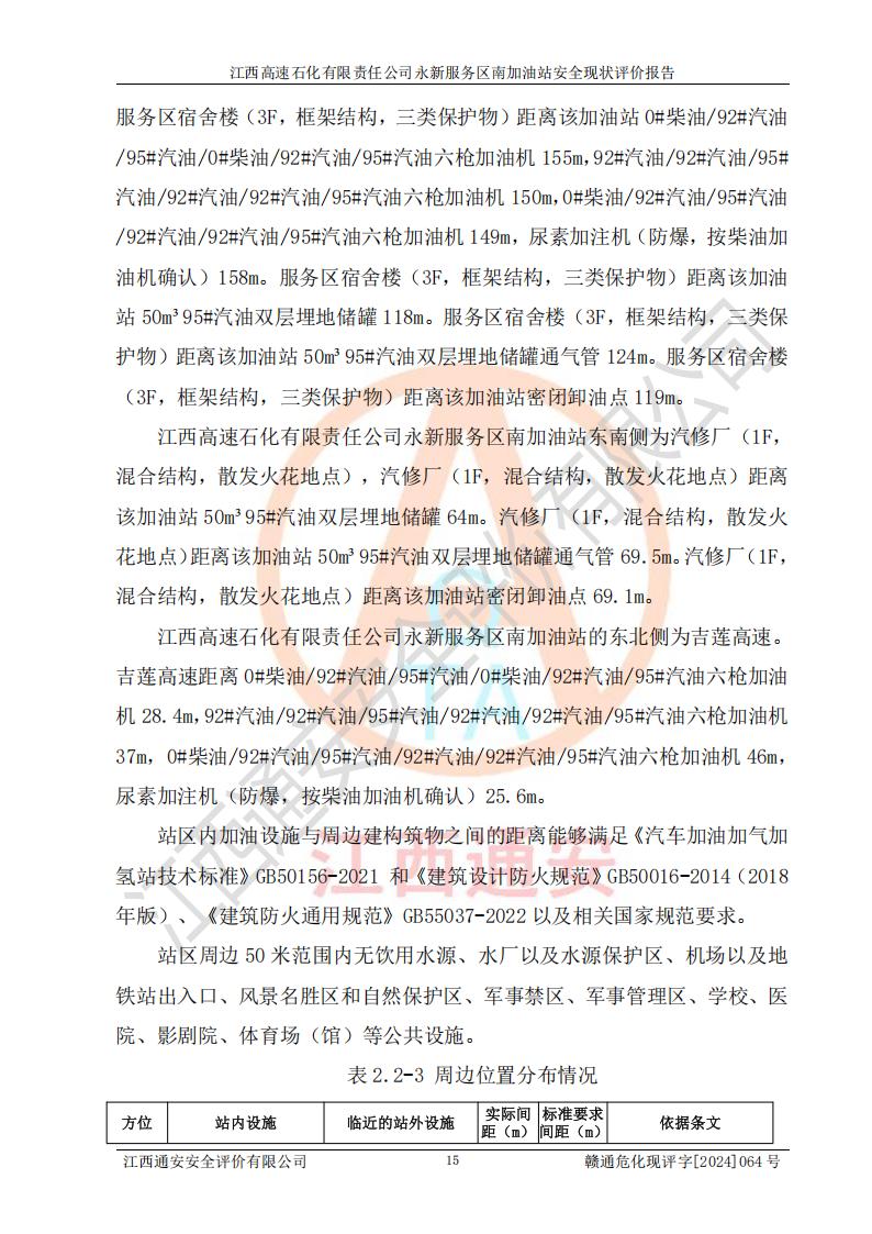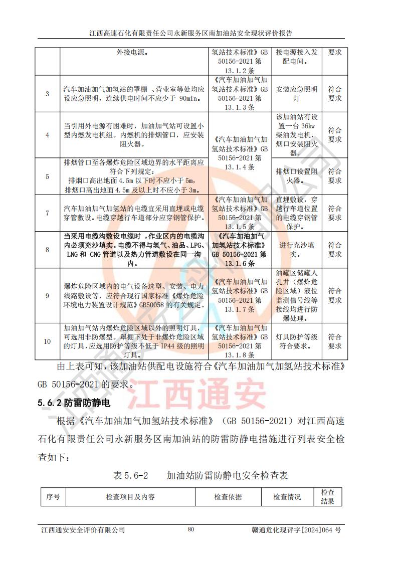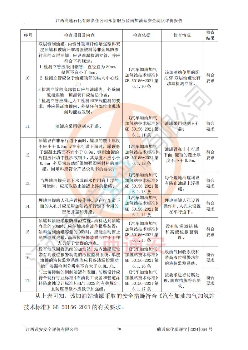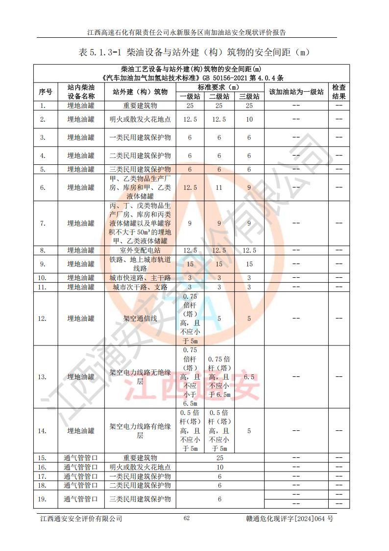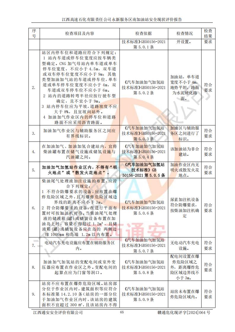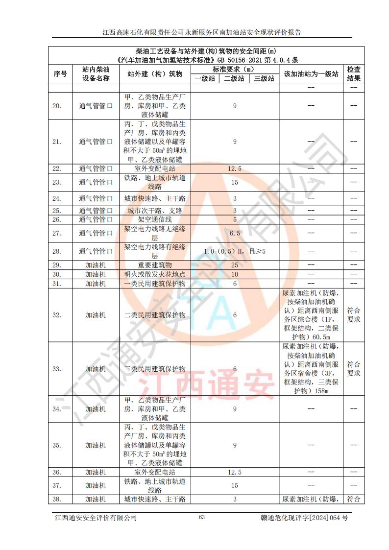 評價結論 | 江西高速石化有限責任公司永新服務區(qū)南加油站站址合理,周邊環(huán)境良好,與敏感防護目標間距符合規(guī)范要求,站區(qū)建構筑物之間的防火間距、耐火等級符合標準要求,與總平面布置圖一致,加油卸油工藝及設備設施合理,工藝布置得當,防雷設施經(jīng)檢測合格,采取的工藝安全設施符合規(guī)范要求;該加油站制定了安全管理制度和操作規(guī)程,人員經(jīng)培訓合格后上崗,安全管理人員經(jīng)考核合格并取得安全合格證,能按照法律法規(guī)要求開展安全生產(chǎn)管理工作。 綜上:江西高速石化有限責任公司永新服務區(qū)南加油站符合《汽車加油加氣加氫站技術標準》GB50156-2021等標準規(guī)范的要求,安全風險可控,滿足危險化學品經(jīng)營的安全條件。 | |||
