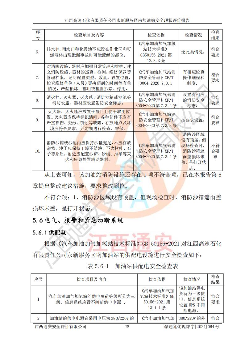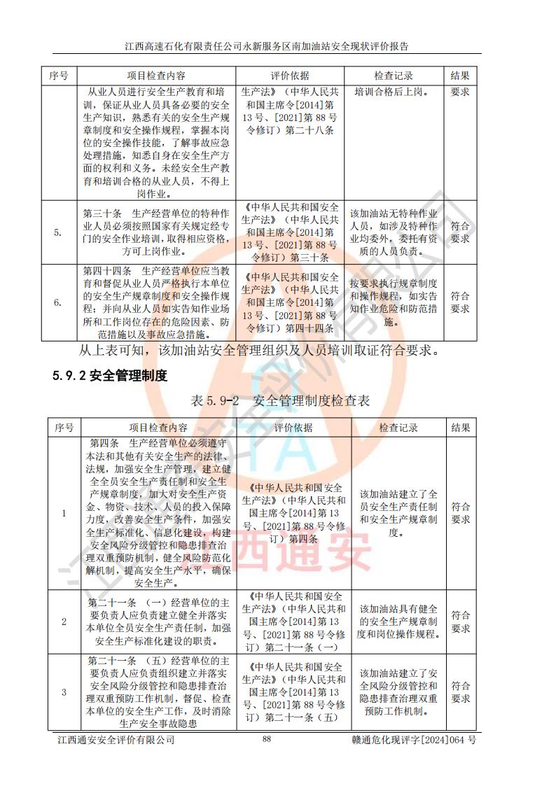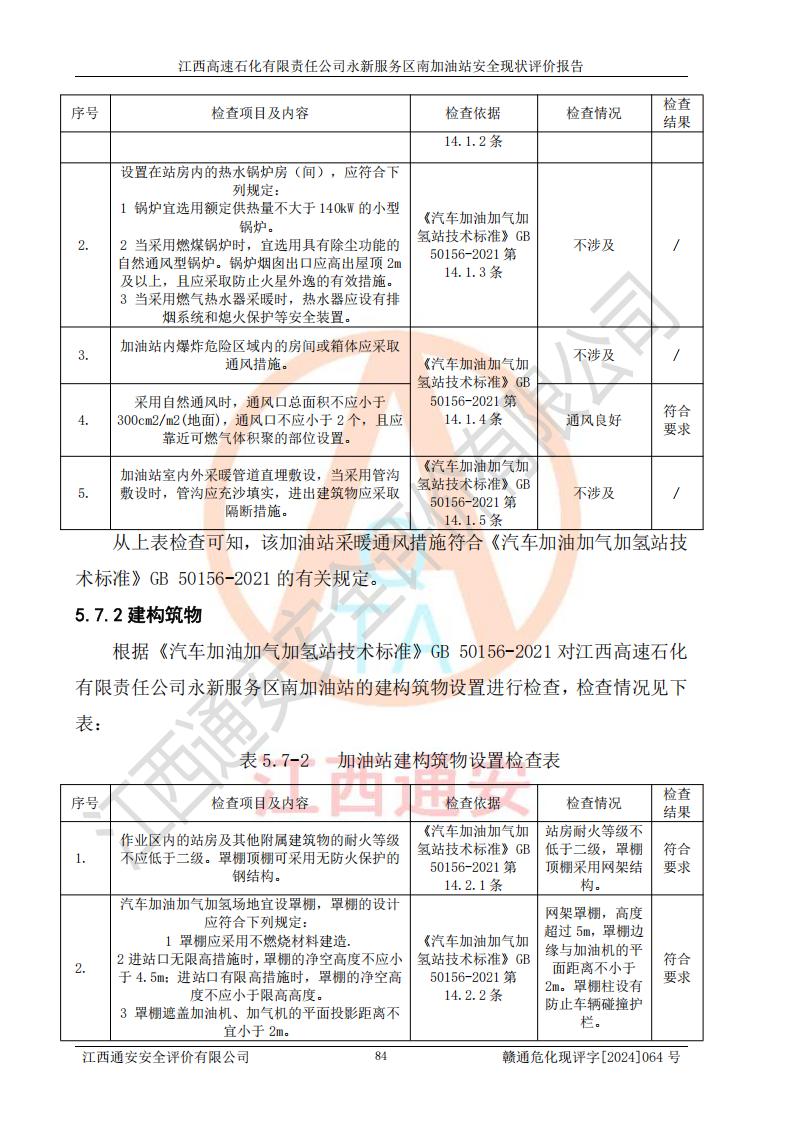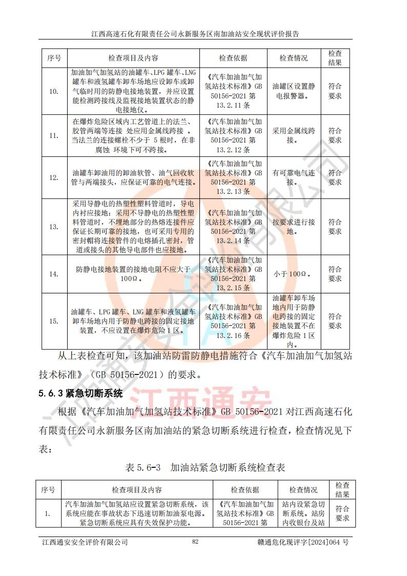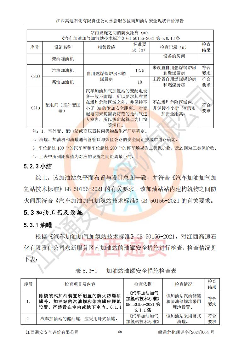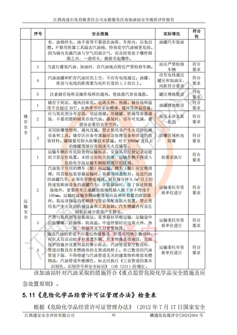 評價結論 | 江西高速石化有限責任公司永新服務區(qū)南加油站站址合理,周邊環(huán)境良好,與敏感防護目標間距符合規(guī)范要求,站區(qū)建構筑物之間的防火間距、耐火等級符合標準要求,與總平面布置圖一致,加油卸油工藝及設備設施合理,工藝布置得當,防雷設施經(jīng)檢測合格,采取的工藝安全設施符合規(guī)范要求;該加油站制定了安全管理制度和操作規(guī)程,人員經(jīng)培訓合格后上崗,安全管理人員經(jīng)考核合格并取得安全合格證,能按照法律法規(guī)要求開展安全生產(chǎn)管理工作。 綜上:江西高速石化有限責任公司永新服務區(qū)南加油站符合《汽車加油加氣加氫站技術標準》GB50156-2021等標準規(guī)范的要求,安全風險可控,滿足危險化學品經(jīng)營的安全條件。 | |||