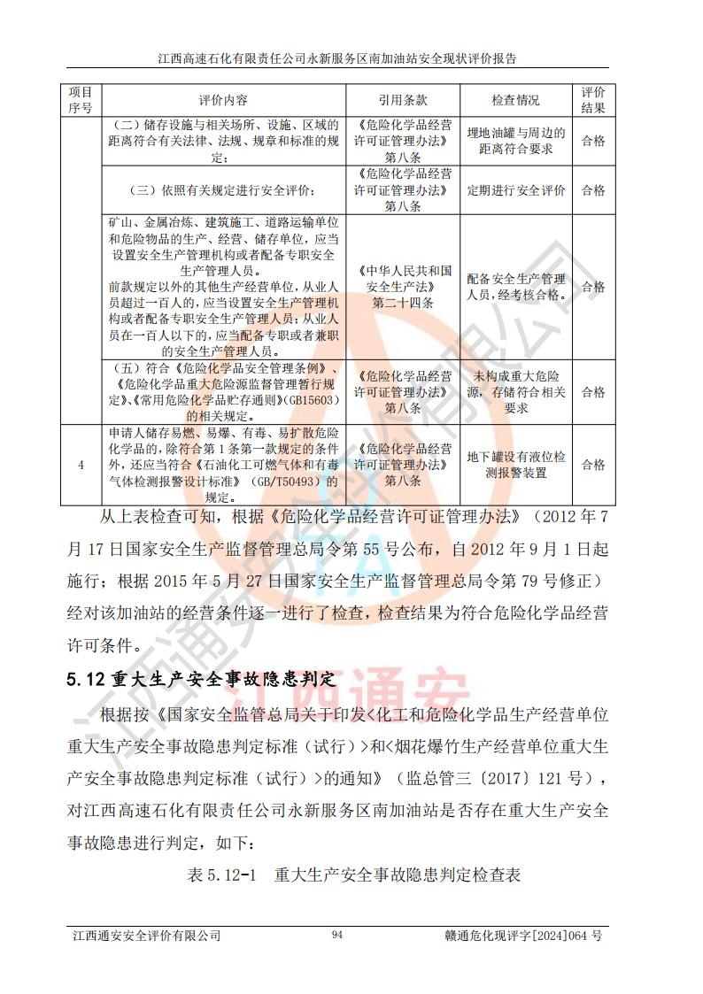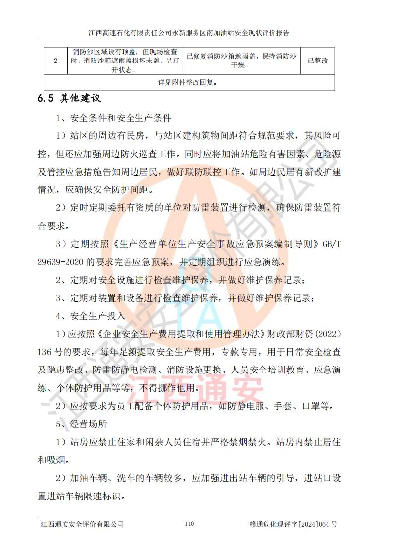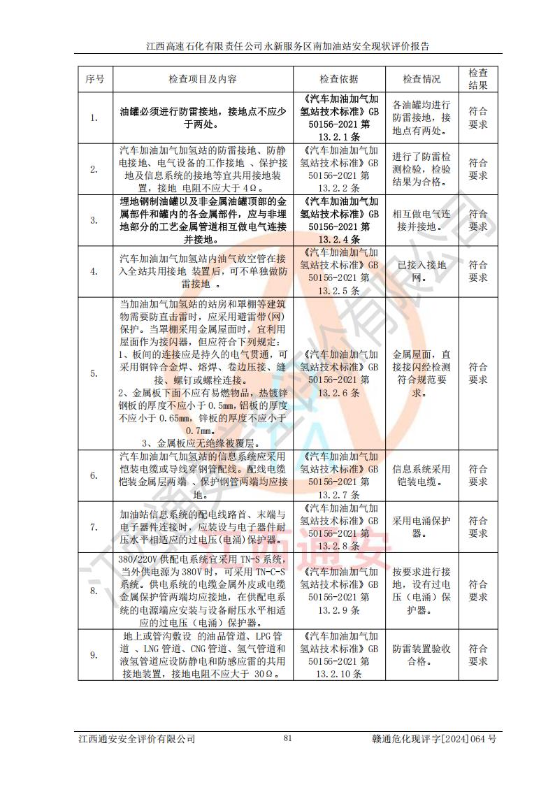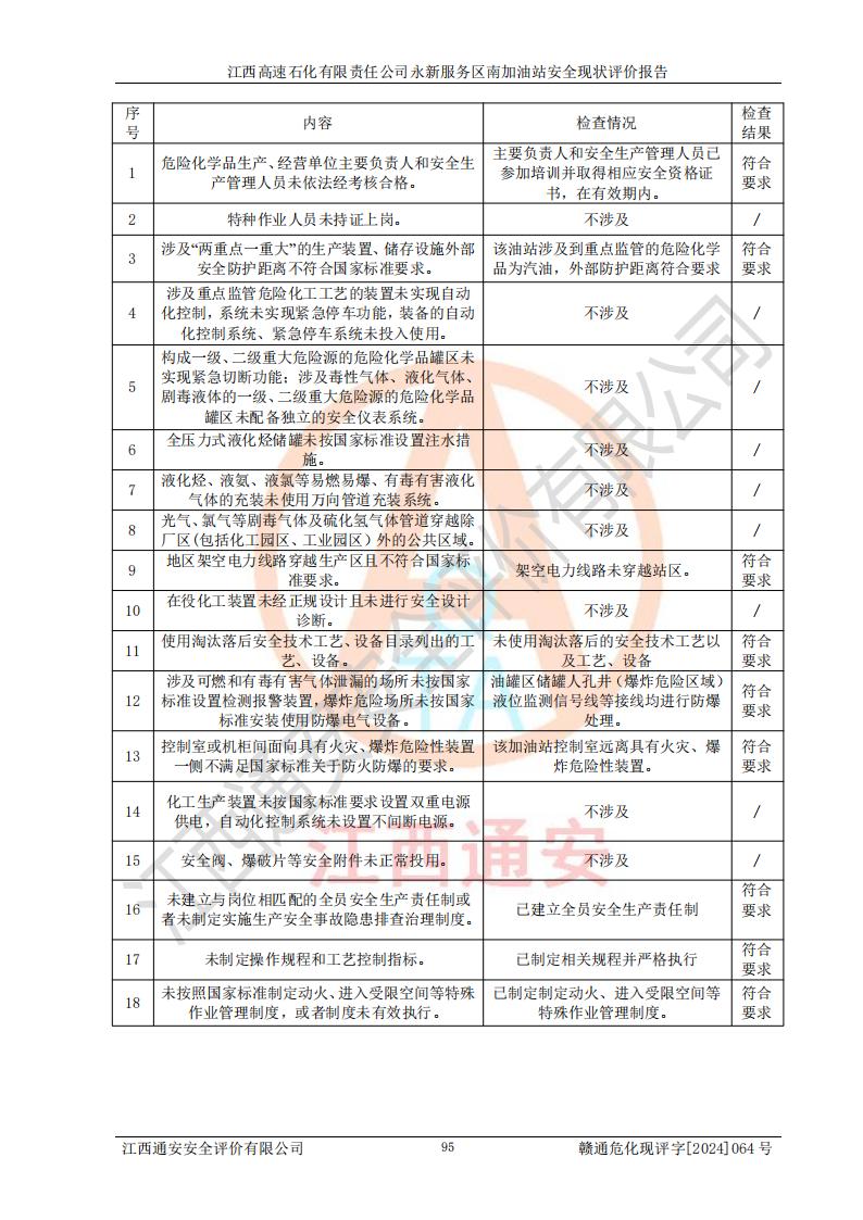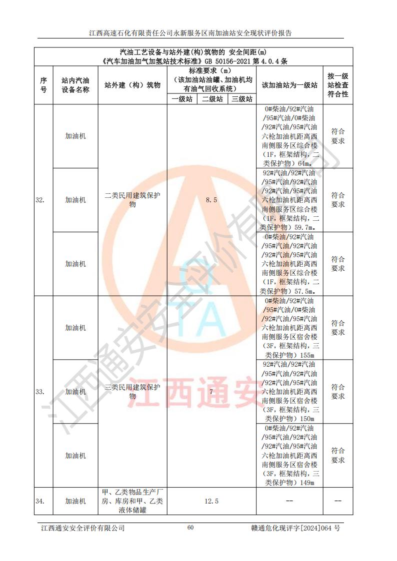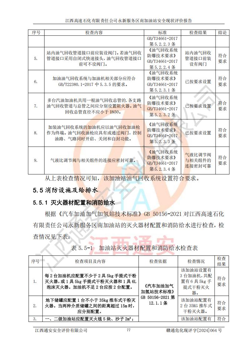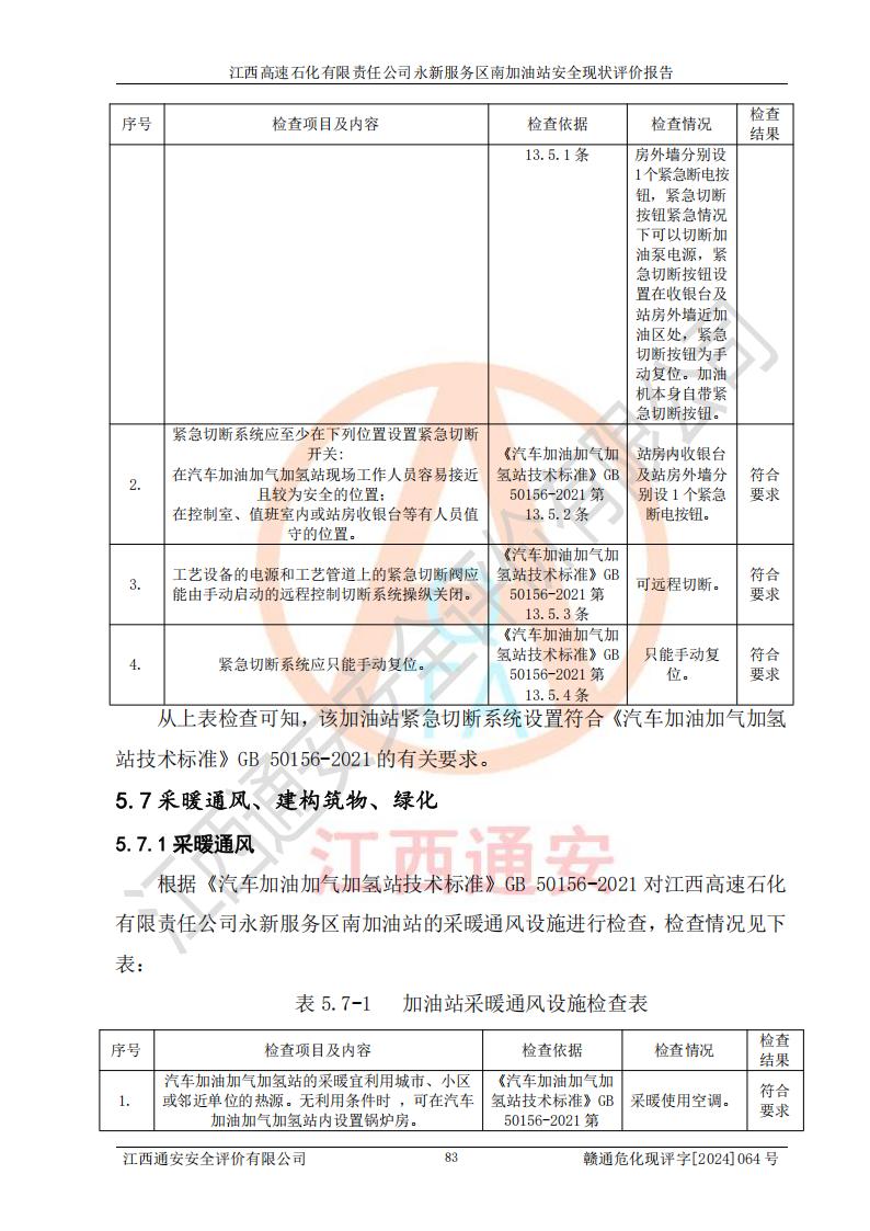 評價結論 | 江西高速石化有限責任公司永新服務區(qū)南加油站站址合理,周邊環(huán)境良好,與敏感防護目標間距符合規(guī)范要求,站區(qū)建構筑物之間的防火間距、耐火等級符合標準要求,與總平面布置圖一致,加油卸油工藝及設備設施合理,工藝布置得當,防雷設施經(jīng)檢測合格,采取的工藝安全設施符合規(guī)范要求;該加油站制定了安全管理制度和操作規(guī)程,人員經(jīng)培訓合格后上崗,安全管理人員經(jīng)考核合格并取得安全合格證,能按照法律法規(guī)要求開展安全生產(chǎn)管理工作。 綜上:江西高速石化有限責任公司永新服務區(qū)南加油站符合《汽車加油加氣加氫站技術標準》GB50156-2021等標準規(guī)范的要求,安全風險可控,滿足危險化學品經(jīng)營的安全條件。 | |||