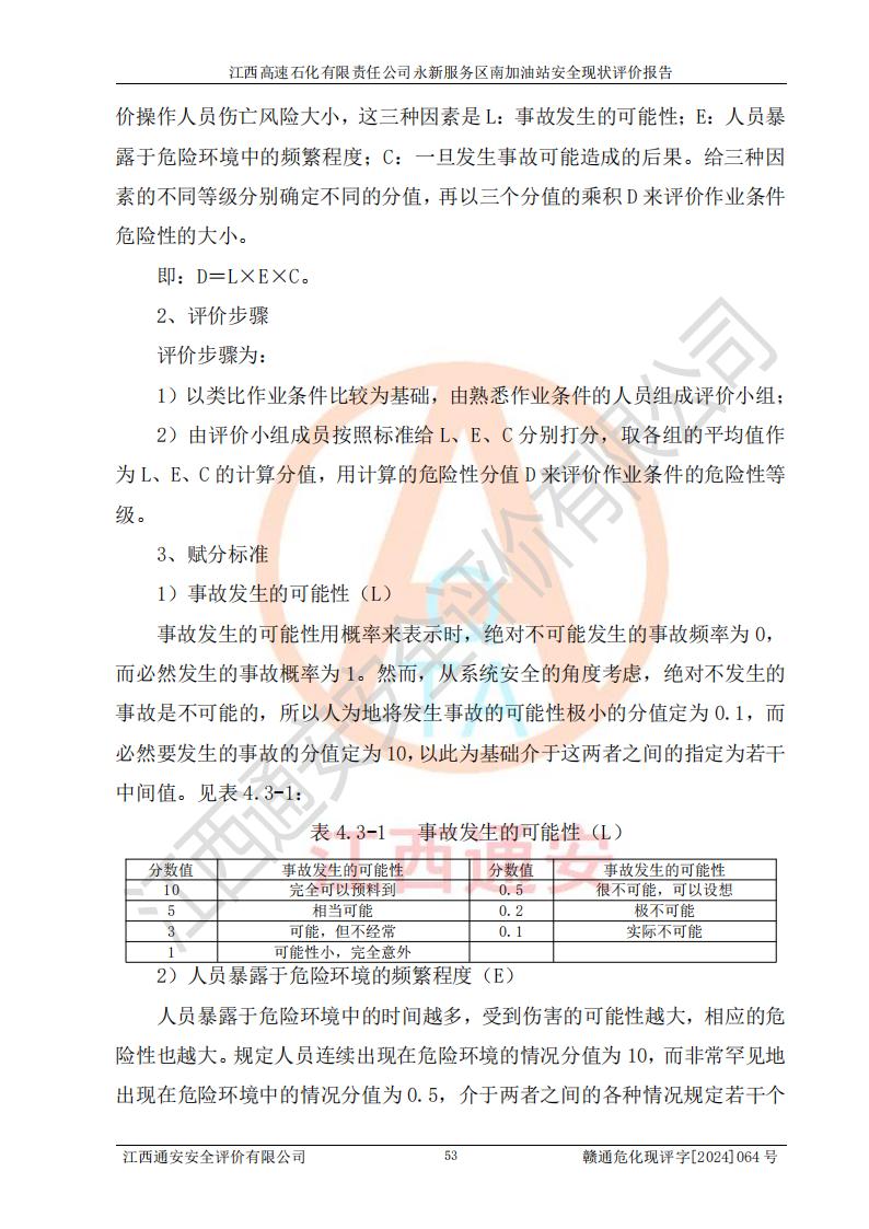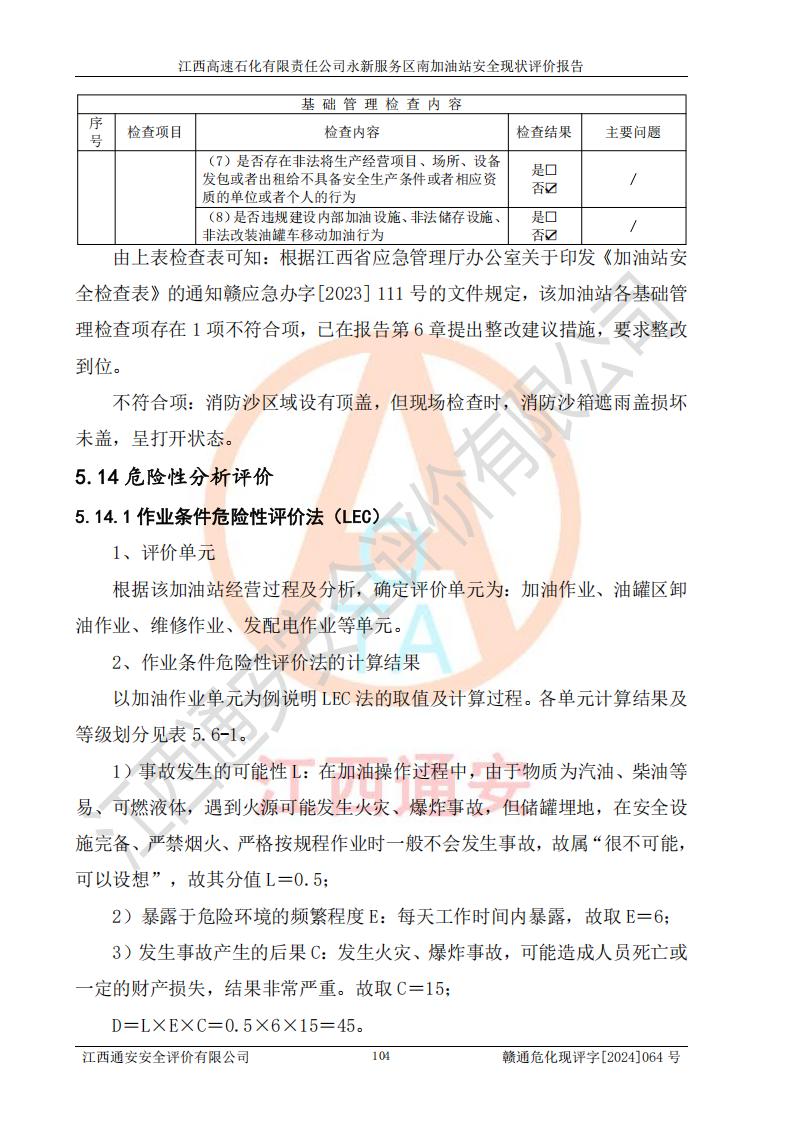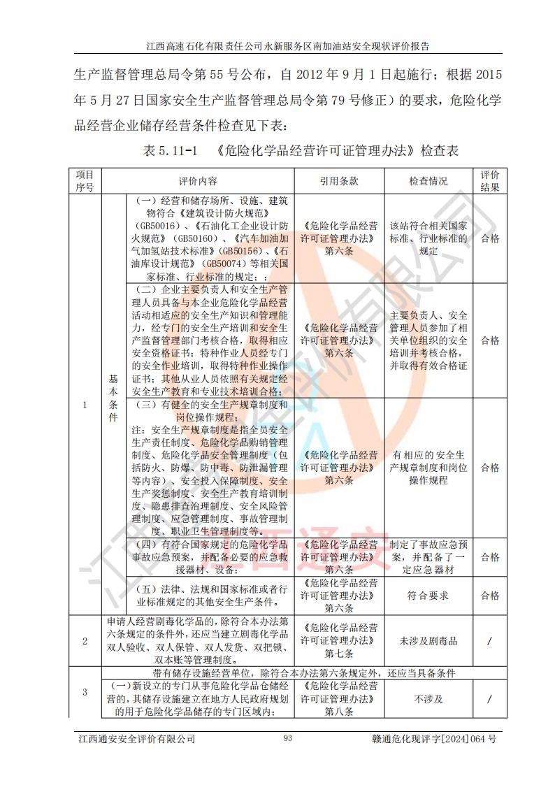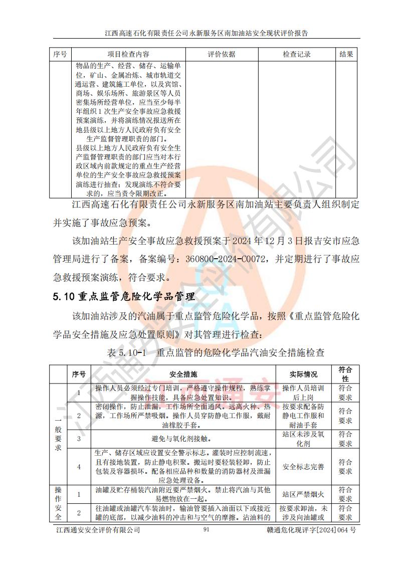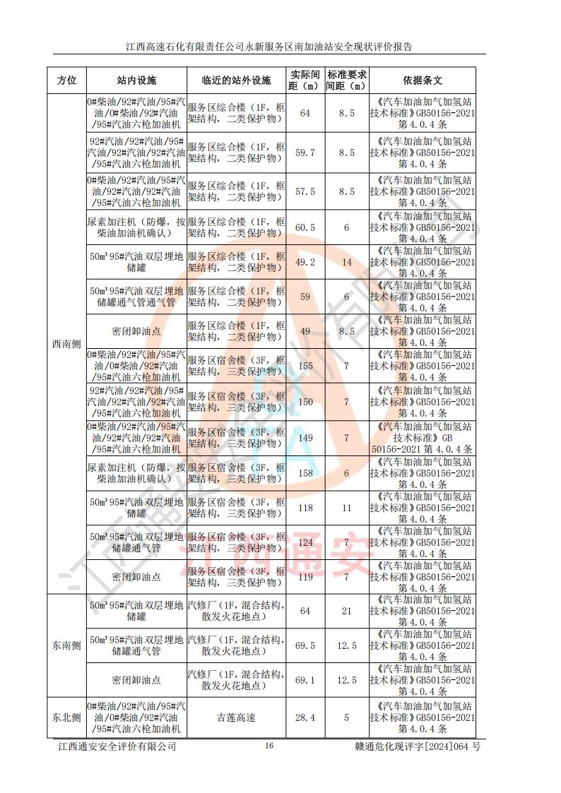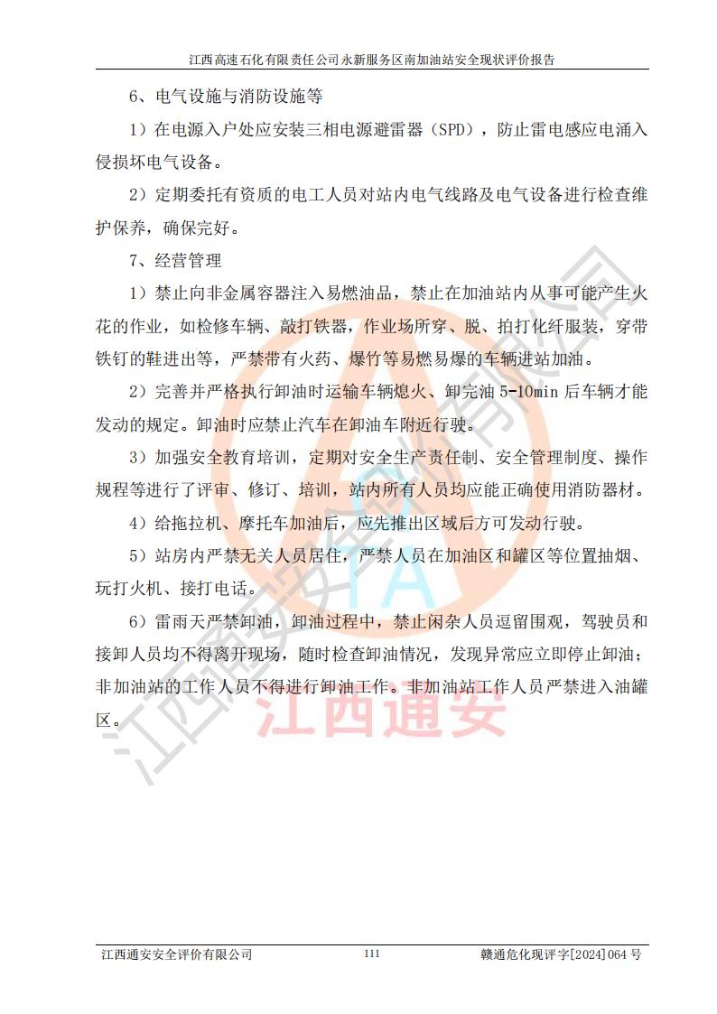評價結論 | 江西高速石化有限責任公司永新服務區(qū)南加油站站址合理,周邊環(huán)境良好,與敏感防護目標間距符合規(guī)范要求,站區(qū)建構筑物之間的防火間距、耐火等級符合標準要求,與總平面布置圖一致,加油卸油工藝及設備設施合理,工藝布置得當,防雷設施經(jīng)檢測合格,采取的工藝安全設施符合規(guī)范要求;該加油站制定了安全管理制度和操作規(guī)程,人員經(jīng)培訓合格后上崗,安全管理人員經(jīng)考核合格并取得安全合格證,能按照法律法規(guī)要求開展安全生產(chǎn)管理工作。 綜上:江西高速石化有限責任公司永新服務區(qū)南加油站符合《汽車加油加氣加氫站技術標準》GB50156-2021等標準規(guī)范的要求,安全風險可控,滿足危險化學品經(jīng)營的安全條件。 | |||