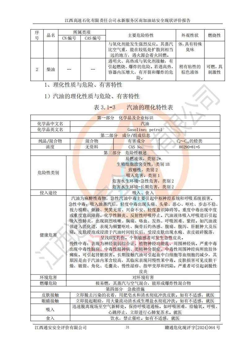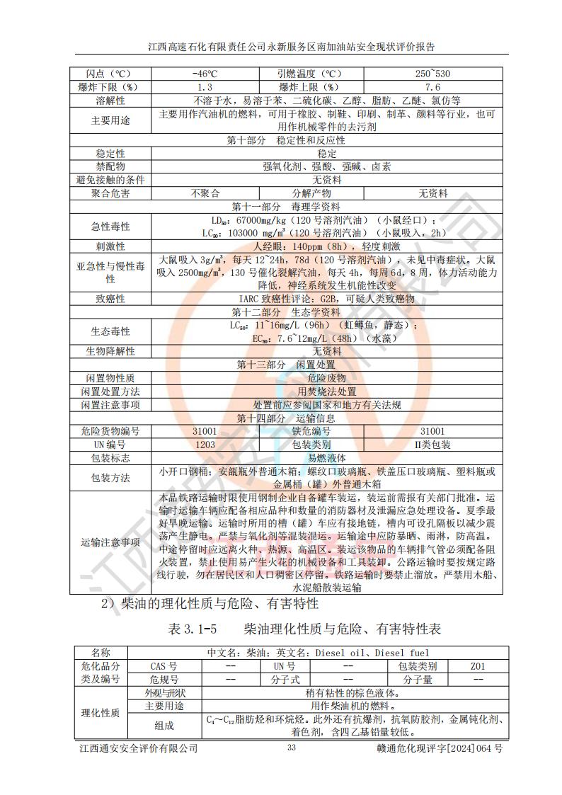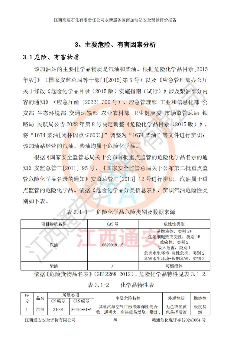 項目簡介 | 江西高速石化有限責任公司永新服務區(qū)南加油站成立于2019年2月2日,類型:其他有限責任公司分公司;負責人:陳志斌;經(jīng)營場所為江西省吉安市永新縣吉蓮高速永新服務區(qū)南。該公司營業(yè)執(zhí)照經(jīng)營范圍:石油、石油化工、化纖及其他化工產(chǎn)品的銷售;光伏、充電樁、日用百貨便利店經(jīng)營:汽車清洗服務:廣告位出租:房屋租賃:食品、計生用品、零售卷煙、雪茄煙:委托代理收取水電費:銷售潤滑油、燃油料。(依法須經(jīng)批準的項目,經(jīng)相關部門批準后方可開展經(jīng)營活動)。 江西高速石化有限責任公司永新服務區(qū)南加油站設有1臺0#柴油/92#汽油/95#汽油/92#汽油/92#汽油/95#汽油6槍3油品加油機,1臺0#柴油/92#汽油/95#汽油/0#柴油/92#汽油/95#汽油6槍3油品加油機,1臺92#汽油/92#汽油/95#汽油/92#汽油/92#汽油/95#汽油6槍雙油品加油機,設有1個尿素加注機(防爆,按柴油加油機確認);設置4臺SF雙層埋地儲罐,其中包括:2臺50m392#汽油雙層埋地儲罐;1臺50m395#汽油雙層埋地儲罐;1臺50m30#柴油雙層埋地儲罐;總儲量為200m3,柴油折半后總容積為175m3,加油站等級為**,汽油卸油、加油設置了油氣回收系統(tǒng)。 該加油站的主要化學品物質(zhì)是汽油和柴油。根據(jù)危險化學品目錄[2015年版]》(**安監(jiān)總局等十部門[2015]第5號)以及《應急管理部辦公廳關于修改《危險化學品目錄(2015版)實施指南(試行)》涉及柴油部分內(nèi)容的通知》(應急廳函〔2022〕300號)、應急管理部 工業(yè)和信息化部 公安部 生態(tài)環(huán)境部 交通運輸部 農(nóng)業(yè)農(nóng)村部 衛(wèi)生健康委 市場監(jiān)管總局 鐵路局 民航局公告2022年第8號決定調(diào)整《危險化學品目錄(2015版)》,將“1674柴油[閉杯閃點≤60℃]”調(diào)整為“1674柴油”等文件進行辨識:該加油站經(jīng)營的汽油、柴油均屬于危險化學品。 | |||