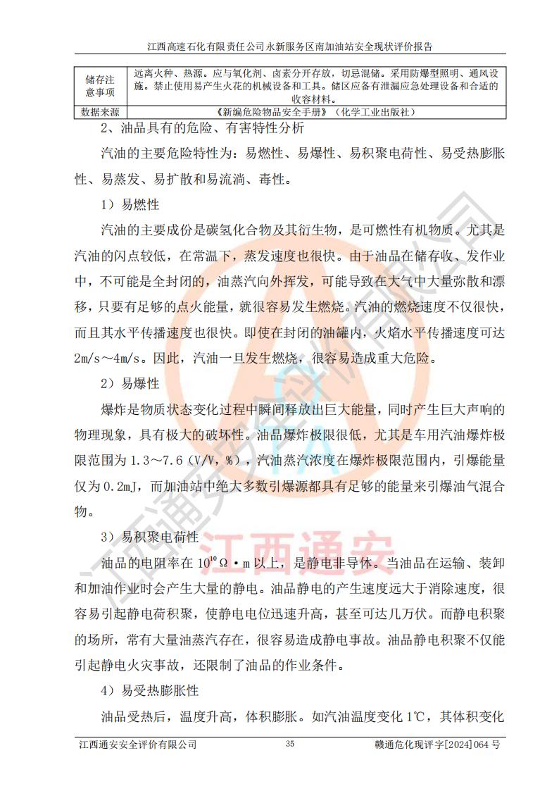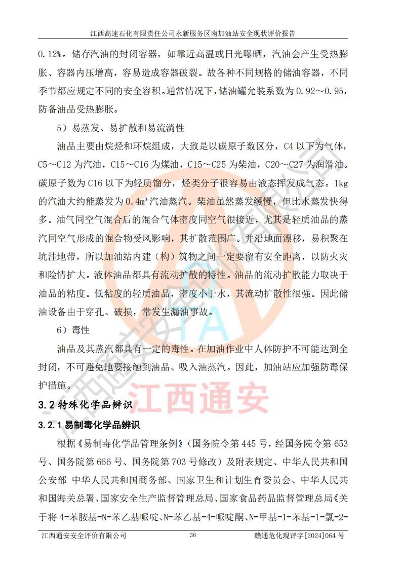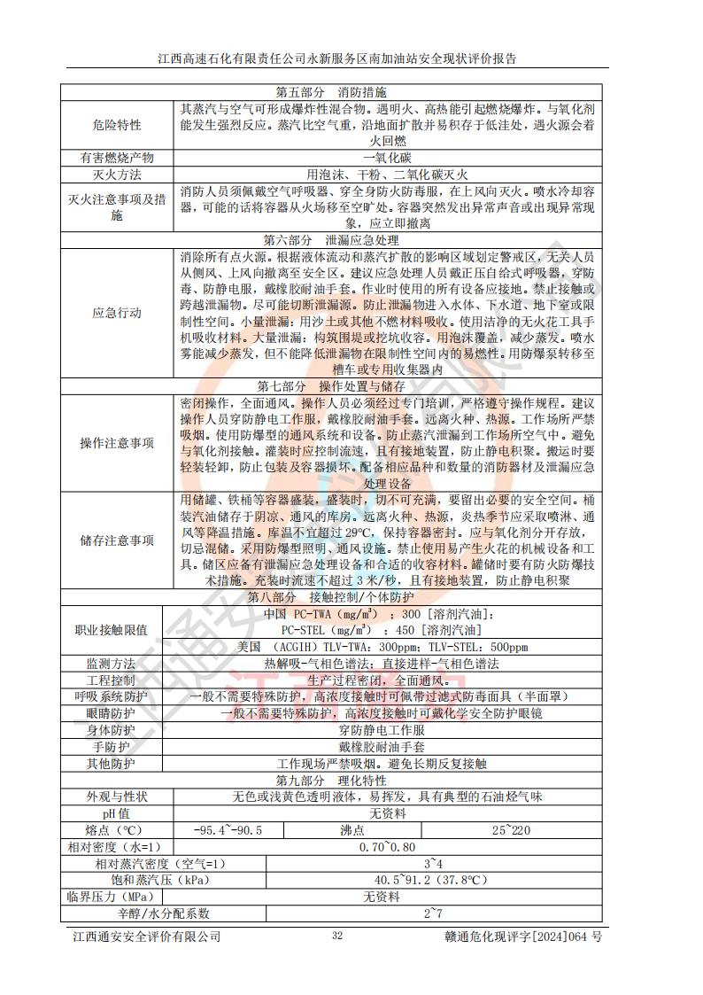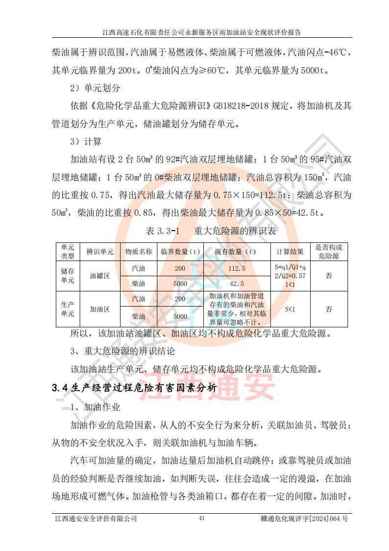 項目簡介 | 江西高速石化有限責任公司永新服務區(qū)南加油站成立于2019年2月2日,類型:其他有限責任公司分公司;負責人:陳志斌;經(jīng)營場所為江西省吉安市永新縣吉蓮高速永新服務區(qū)南。該公司營業(yè)執(zhí)照經(jīng)營范圍:石油、石油化工、化纖及其他化工產(chǎn)品的銷售;光伏、充電樁、日用百貨便利店經(jīng)營:汽車清洗服務:廣告位出租:房屋租賃:食品、計生用品、零售卷煙、雪茄煙:委托代理收取水電費:銷售潤滑油、燃油料。(依法須經(jīng)批準的項目,經(jīng)相關部門批準后方可開展經(jīng)營活動)。 江西高速石化有限責任公司永新服務區(qū)南加油站設有1臺0#柴油/92#汽油/95#汽油/92#汽油/92#汽油/95#汽油6槍3油品加油機,1臺0#柴油/92#汽油/95#汽油/0#柴油/92#汽油/95#汽油6槍3油品加油機,1臺92#汽油/92#汽油/95#汽油/92#汽油/92#汽油/95#汽油6槍雙油品加油機,設有1個尿素加注機(防爆,按柴油加油機確認);設置4臺SF雙層埋地儲罐,其中包括:2臺50m392#汽油雙層埋地儲罐;1臺50m395#汽油雙層埋地儲罐;1臺50m30#柴油雙層埋地儲罐;總儲量為200m3,柴油折半后總容積為175m3,加油站等級為**,汽油卸油、加油設置了油氣回收系統(tǒng)。 該加油站的主要化學品物質(zhì)是汽油和柴油。根據(jù)危險化學品目錄[2015年版]》(**安監(jiān)總局等十部門[2015]第5號)以及《應急管理部辦公廳關于修改《危險化學品目錄(2015版)實施指南(試行)》涉及柴油部分內(nèi)容的通知》(應急廳函〔2022〕300號)、應急管理部 工業(yè)和信息化部 公安部 生態(tài)環(huán)境部 交通運輸部 農(nóng)業(yè)農(nóng)村部 衛(wèi)生健康委 市場監(jiān)管總局 鐵路局 民航局公告2022年第8號決定調(diào)整《危險化學品目錄(2015版)》,將“1674柴油[閉杯閃點≤60℃]”調(diào)整為“1674柴油”等文件進行辨識:該加油站經(jīng)營的汽油、柴油均屬于危險化學品。 | |||