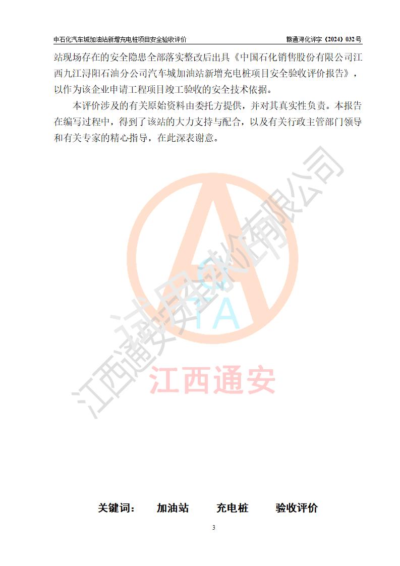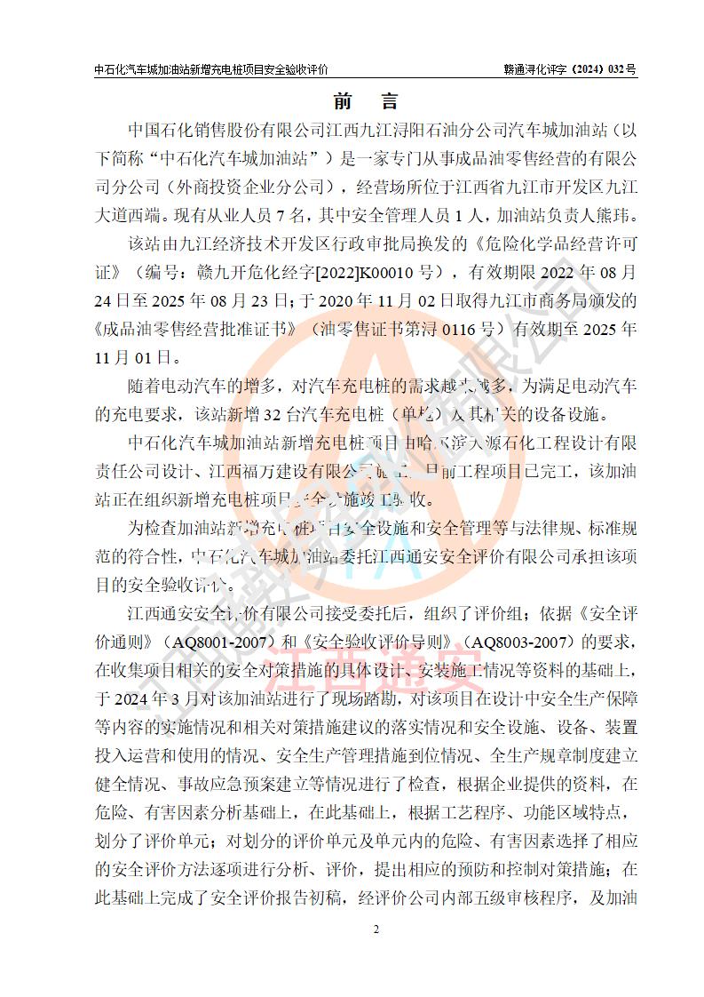 評價報告名稱 | 中國石化銷售股份有限公司江西九江潯陽石油分公司汽車城加油站新增充電樁項目安全驗收評價報告 | |||
