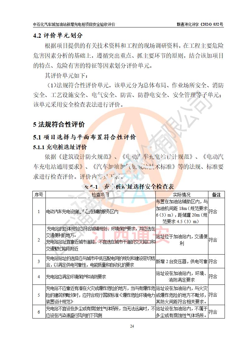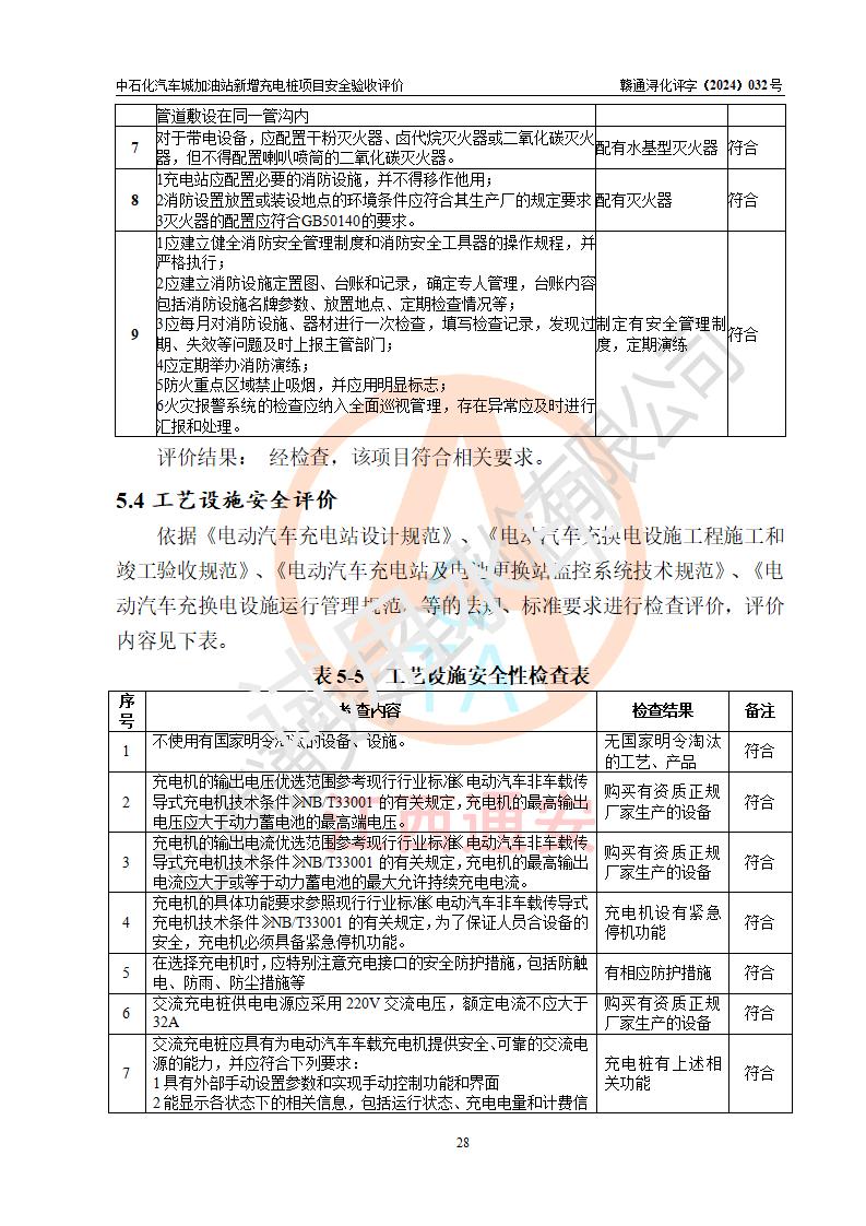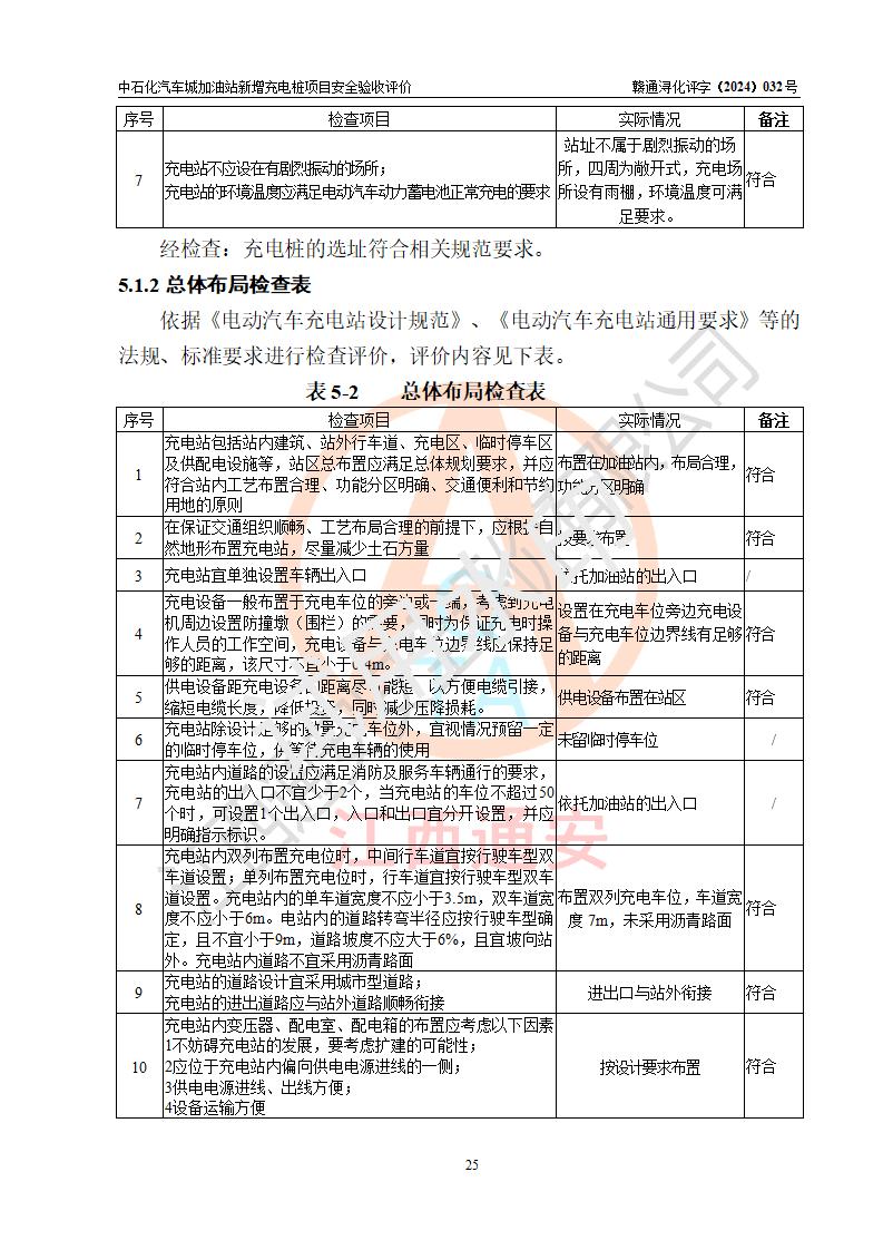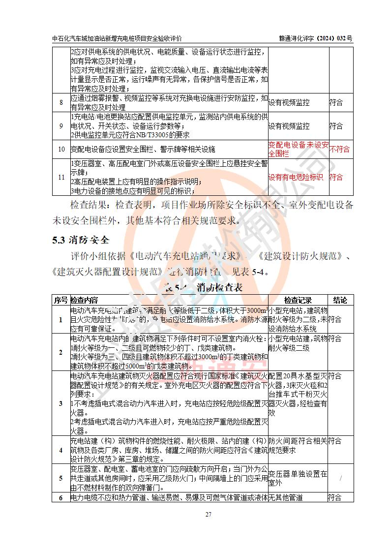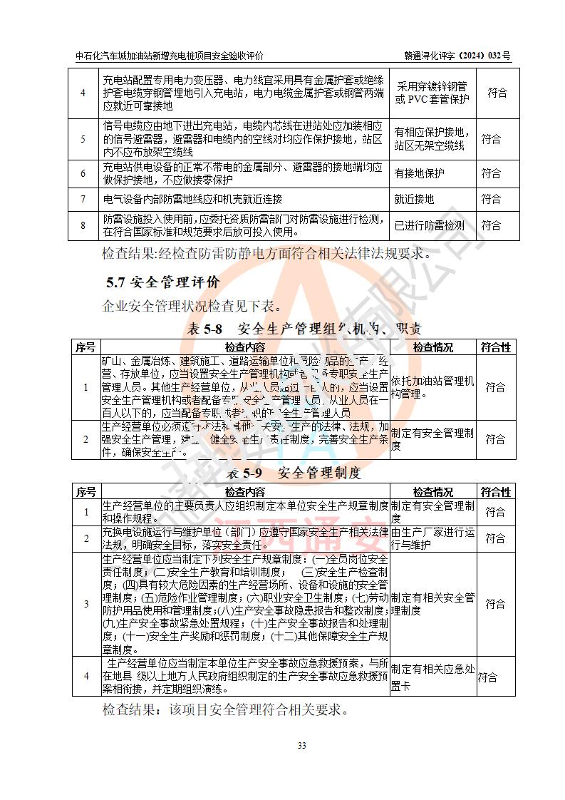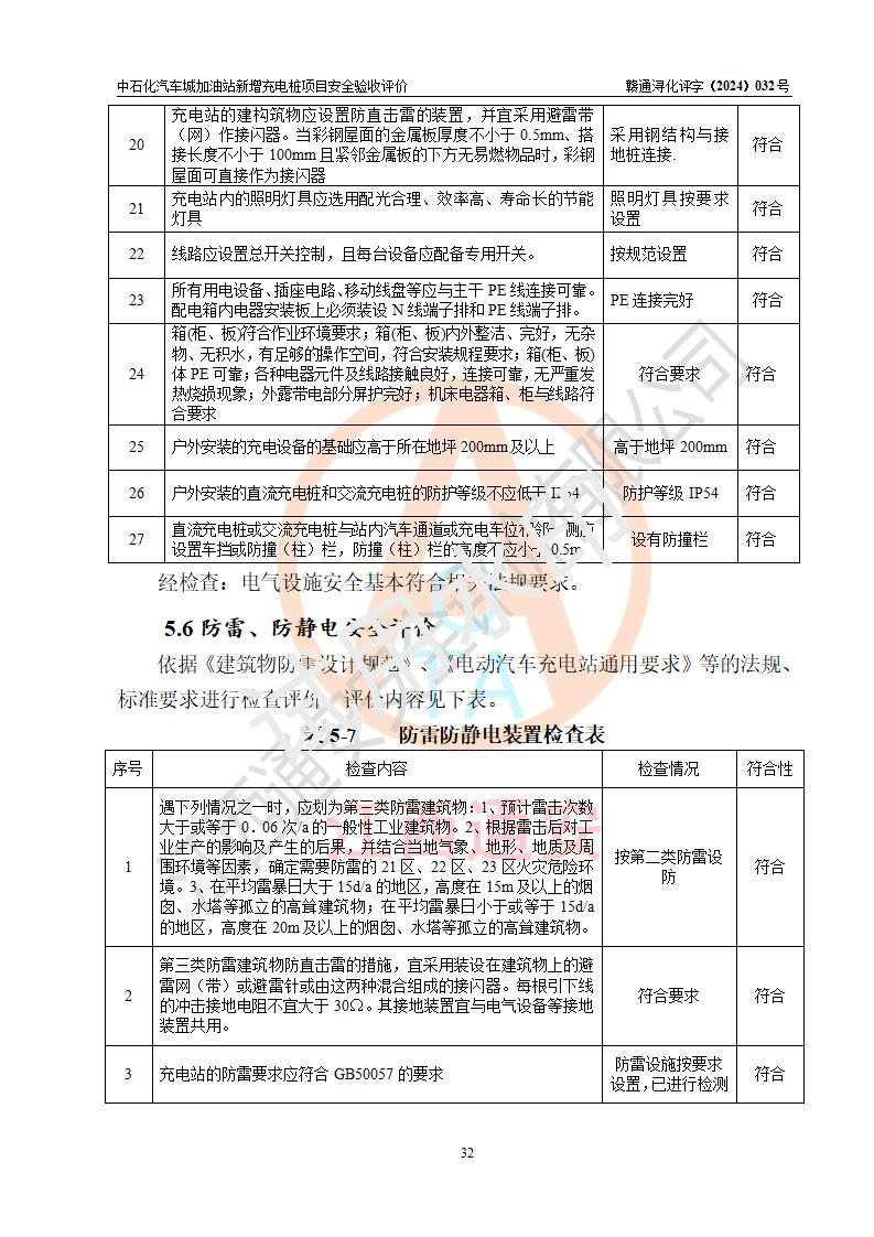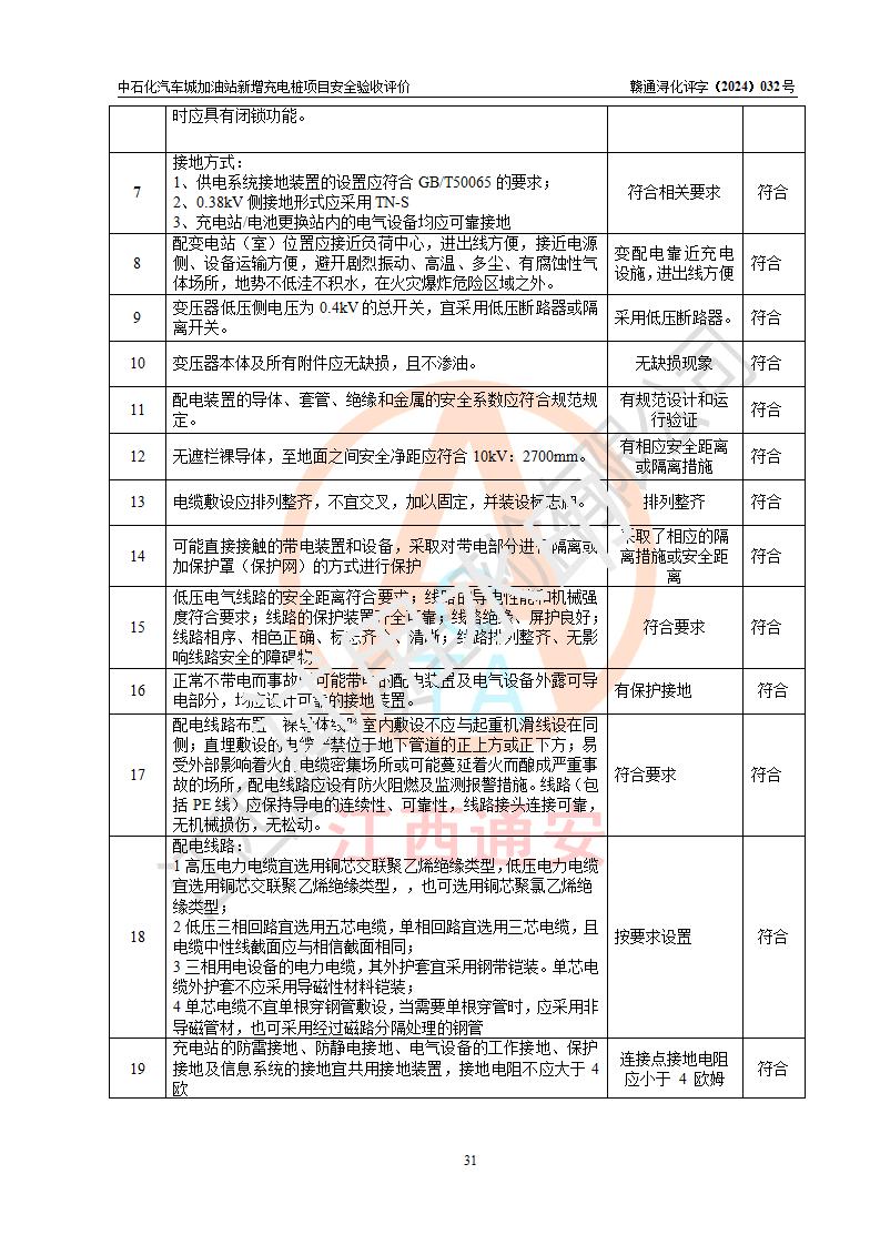 評價結(jié)論 | 中國石化銷售股份有限公司江西九江潯陽石油分公司汽車城加油站新增充電樁項目涉及的安全條件、安全生產(chǎn)條件、安全生產(chǎn)管理符合《電動汽車充電站設(shè)計規(guī)范》、《汽車加油加氣加氫站技術(shù)標(biāo)準(zhǔn)》等**有關(guān)法規(guī)、標(biāo)準(zhǔn)、規(guī)范要求,能滿足經(jīng)營單位的安全條件,具備項目竣工驗收的條件。 | |||