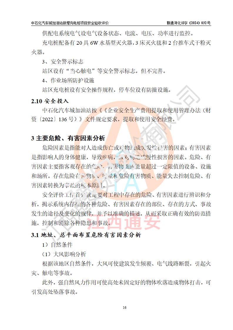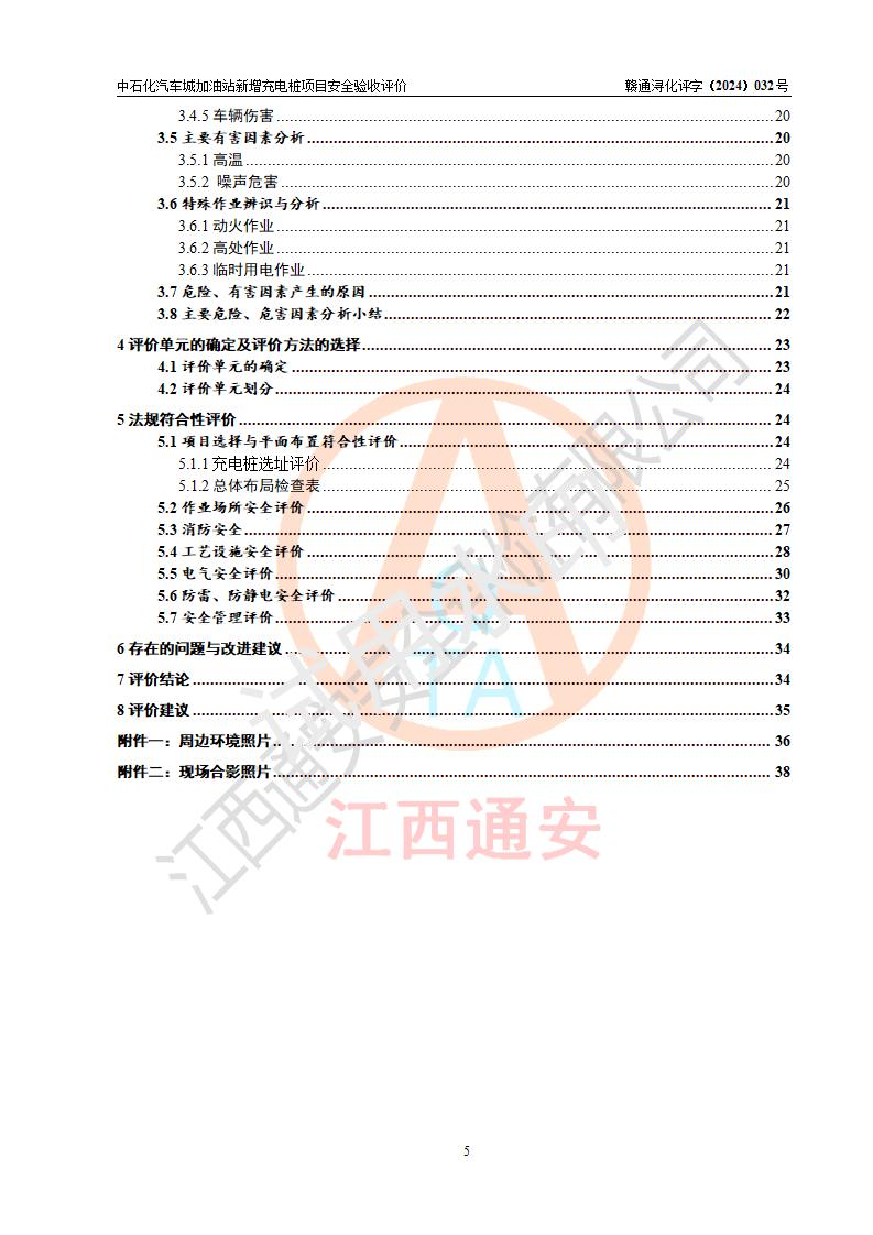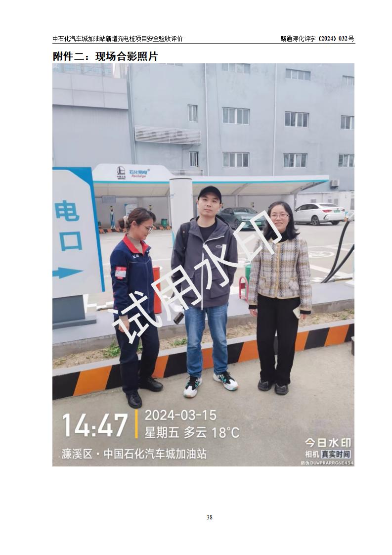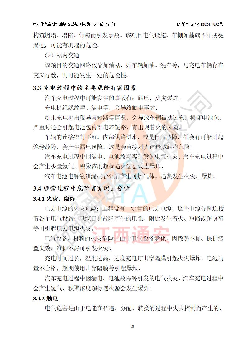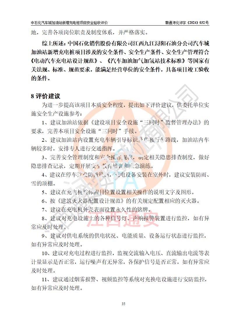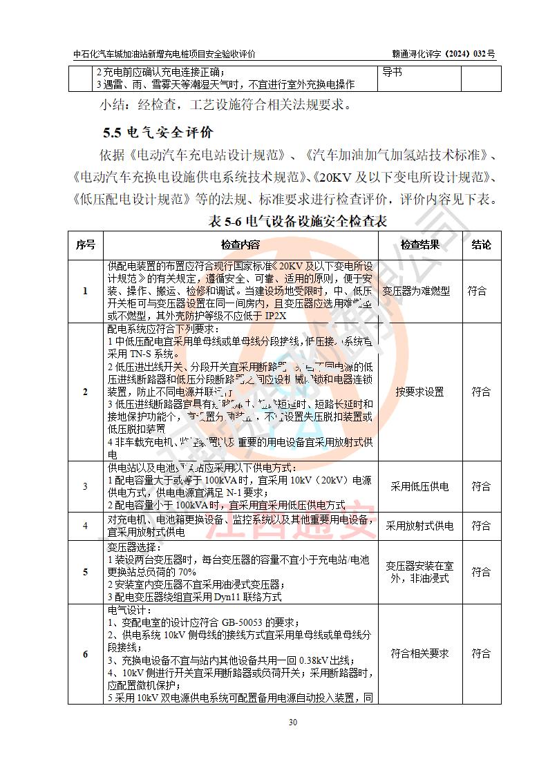 評價結(jié)論 | 中國石化銷售股份有限公司江西九江潯陽石油分公司汽車城加油站新增充電樁項目涉及的安全條件、安全生產(chǎn)條件、安全生產(chǎn)管理符合《電動汽車充電站設(shè)計規(guī)范》、《汽車加油加氣加氫站技術(shù)標(biāo)準(zhǔn)》等**有關(guān)法規(guī)、標(biāo)準(zhǔn)、規(guī)范要求,能滿足經(jīng)營單位的安全條件,具備項目竣工驗收的條件。 | |||