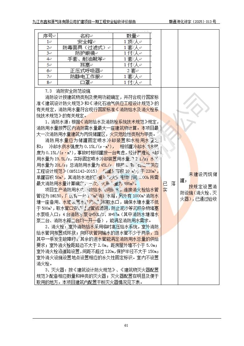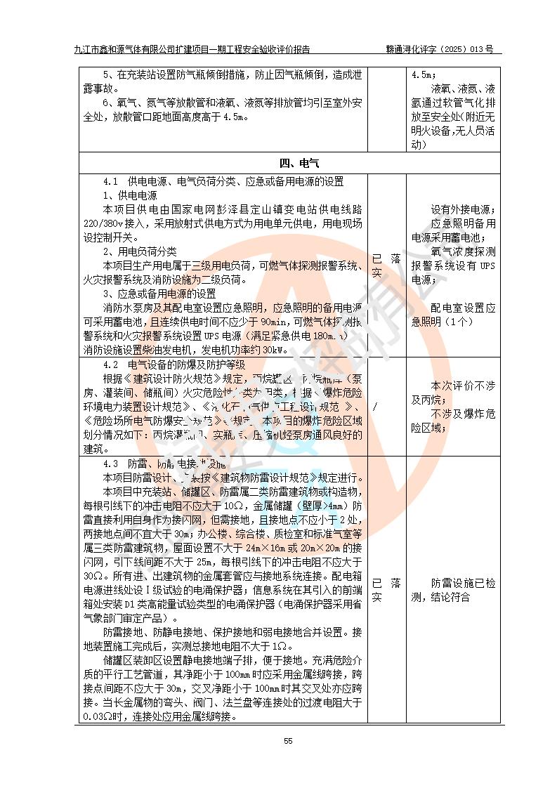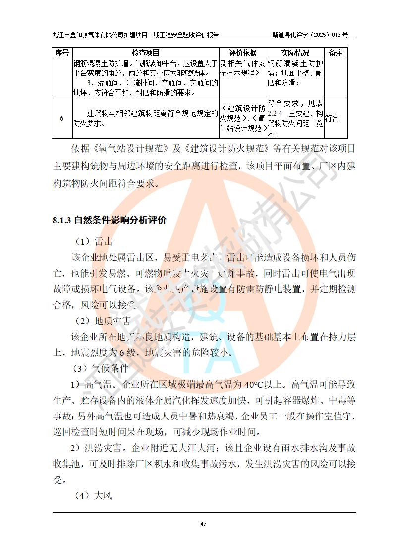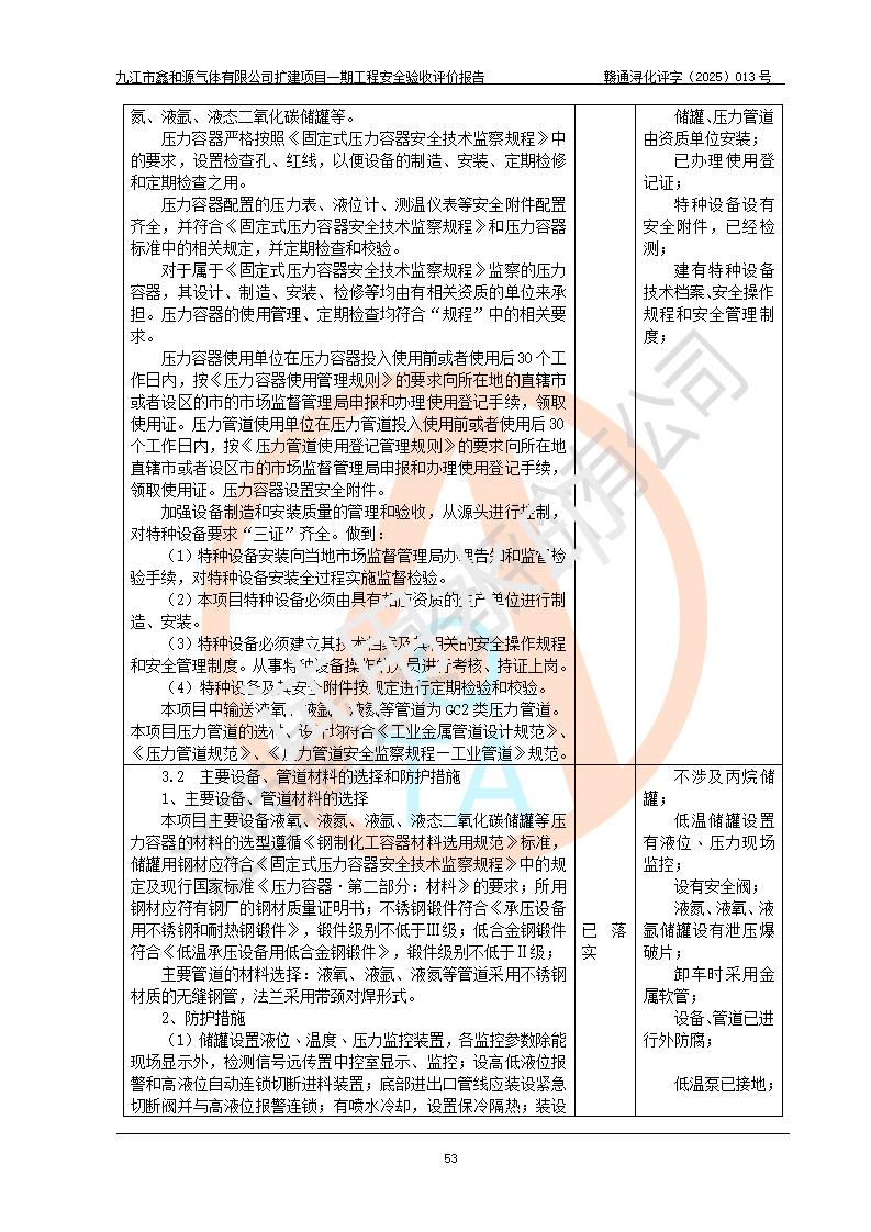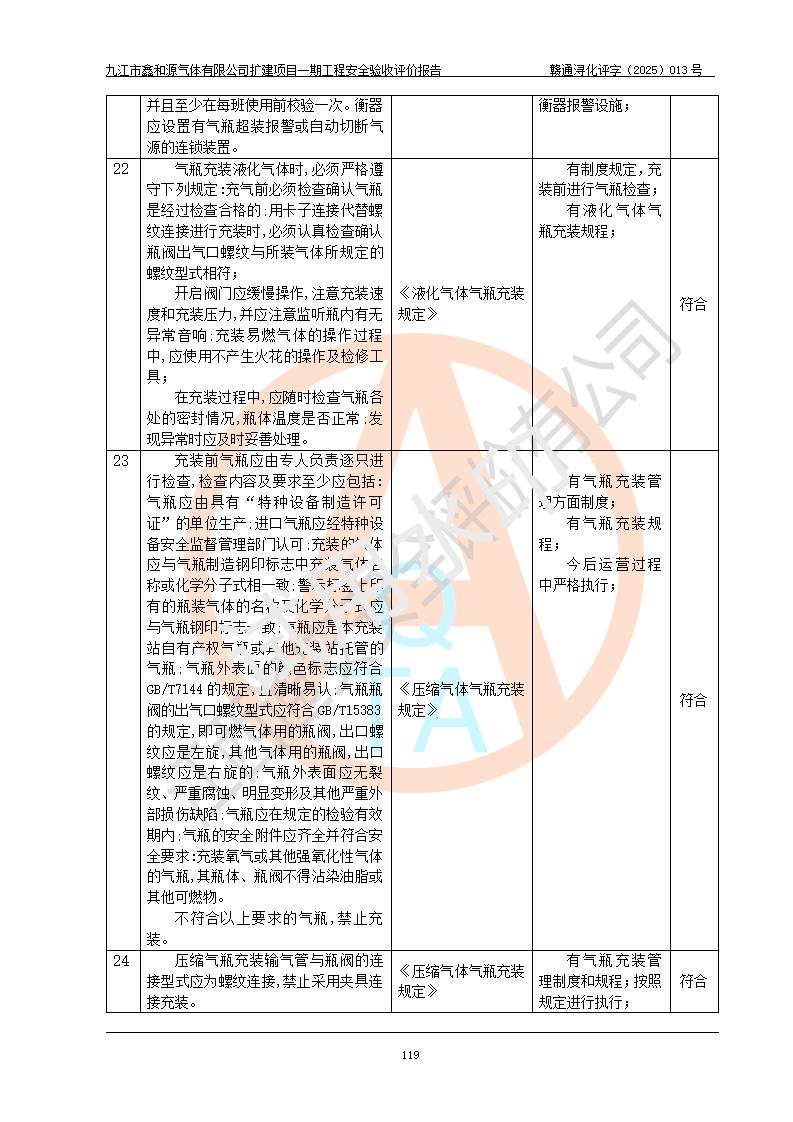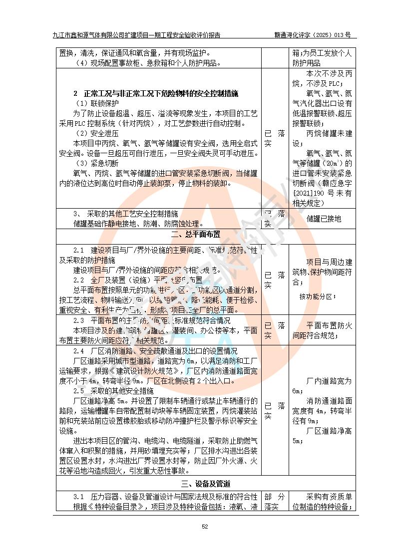 評(píng)價(jià)結(jié)論 | 經(jīng)評(píng)價(jià)組評(píng)價(jià),九江市鑫和源氣體有限公司擴(kuò)建2×20m3液氬、3×20m3液氮、2×20m3液氧、2×20m3CO2、2×50m3丙烷儲(chǔ)存及充裝項(xiàng)目一期工程總體布局、設(shè)備布置情況與設(shè)計(jì)圖紙一致,本次項(xiàng)目(儲(chǔ)存、充裝)不涉及重點(diǎn)監(jiān)管的危險(xiǎn)化學(xué)品、危險(xiǎn)工藝、重大危險(xiǎn)源,按設(shè)計(jì)要求施工、安裝;企業(yè)主要負(fù)責(zé)人及安全管理人員已取得危險(xiǎn)化學(xué)品企業(yè)安全生產(chǎn)知識(shí)和管理能力考核合格證。項(xiàng)目選擇的工藝過程及設(shè)備設(shè)施的安全可靠性能達(dá)到**法規(guī)、標(biāo)準(zhǔn)規(guī)定要求。 項(xiàng)目運(yùn)行后存在的主要危險(xiǎn)、有害因素有:火災(zāi)、其他爆炸、容器爆炸、凍傷等;存在的主要有害因素有噪聲等;針對(duì)存在的危險(xiǎn)、有害因素,企業(yè)采取了**的安全技術(shù)措施及安全管理措施,項(xiàng)目風(fēng)險(xiǎn)可控,其安全生產(chǎn)條件和安全管理方面具備竣工安全驗(yàn)收的條件。 | |||||