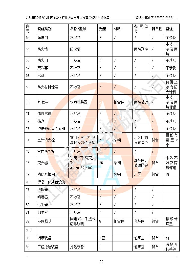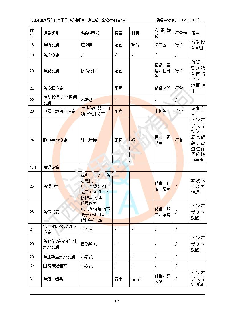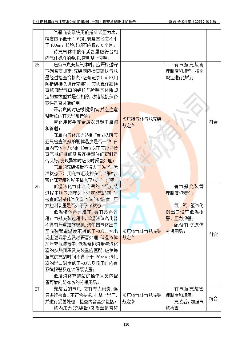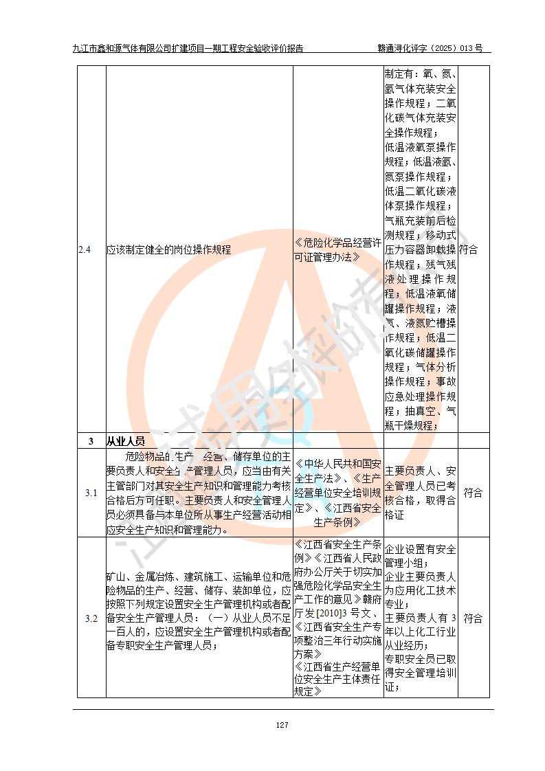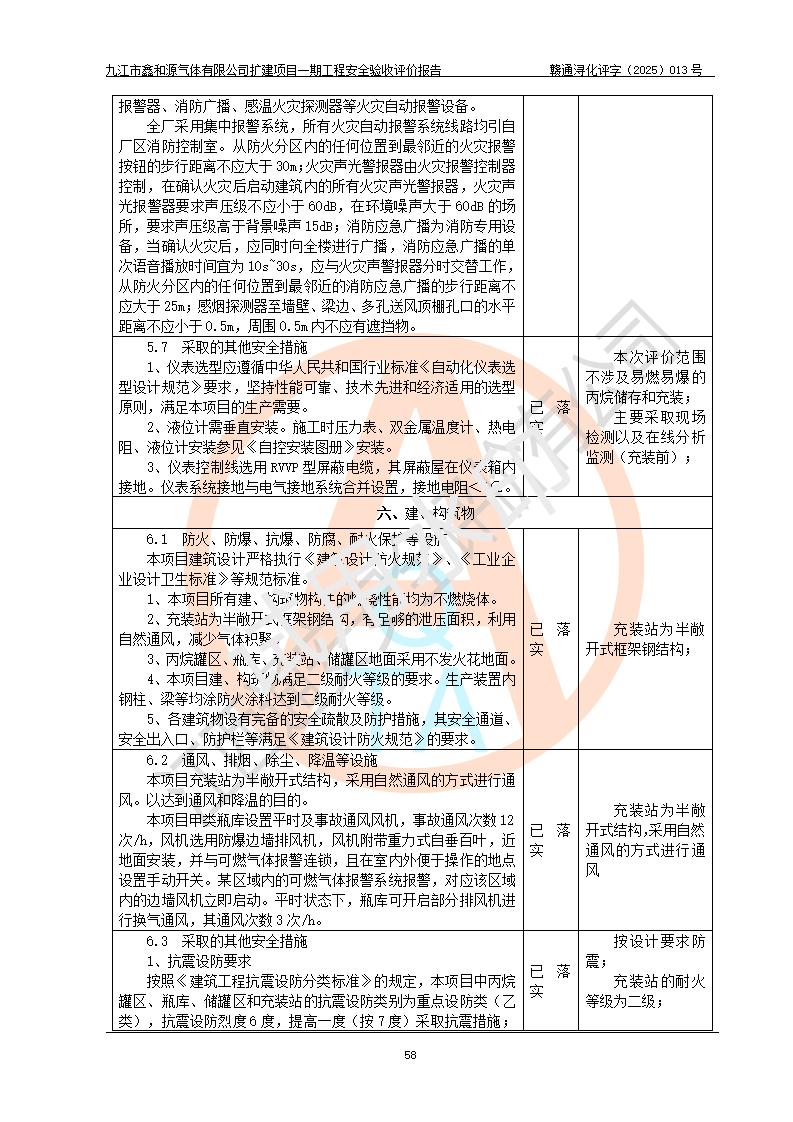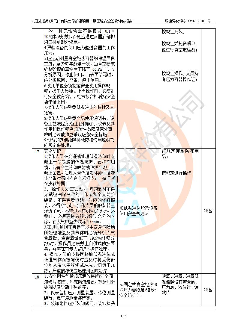 評(píng)價(jià)結(jié)論 | 經(jīng)評(píng)價(jià)組評(píng)價(jià),九江市鑫和源氣體有限公司擴(kuò)建2×20m3液氬、3×20m3液氮、2×20m3液氧、2×20m3CO2、2×50m3丙烷儲(chǔ)存及充裝項(xiàng)目一期工程總體布局、設(shè)備布置情況與設(shè)計(jì)圖紙一致,本次項(xiàng)目(儲(chǔ)存、充裝)不涉及重點(diǎn)監(jiān)管的危險(xiǎn)化學(xué)品、危險(xiǎn)工藝、重大危險(xiǎn)源,按設(shè)計(jì)要求施工、安裝;企業(yè)主要負(fù)責(zé)人及安全管理人員已取得危險(xiǎn)化學(xué)品企業(yè)安全生產(chǎn)知識(shí)和管理能力考核合格證。項(xiàng)目選擇的工藝過程及設(shè)備設(shè)施的安全可靠性能達(dá)到**法規(guī)、標(biāo)準(zhǔn)規(guī)定要求。 項(xiàng)目運(yùn)行后存在的主要危險(xiǎn)、有害因素有:火災(zāi)、其他爆炸、容器爆炸、凍傷等;存在的主要有害因素有噪聲等;針對(duì)存在的危險(xiǎn)、有害因素,企業(yè)采取了**的安全技術(shù)措施及安全管理措施,項(xiàng)目風(fēng)險(xiǎn)可控,其安全生產(chǎn)條件和安全管理方面具備竣工安全驗(yàn)收的條件。 | |||||
