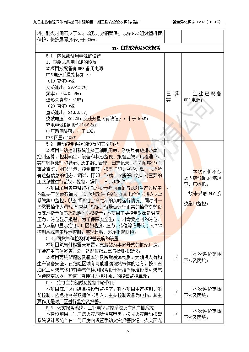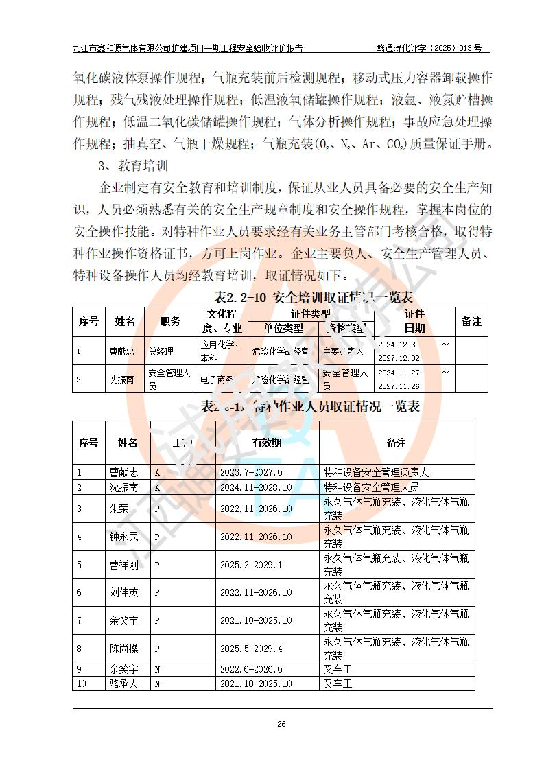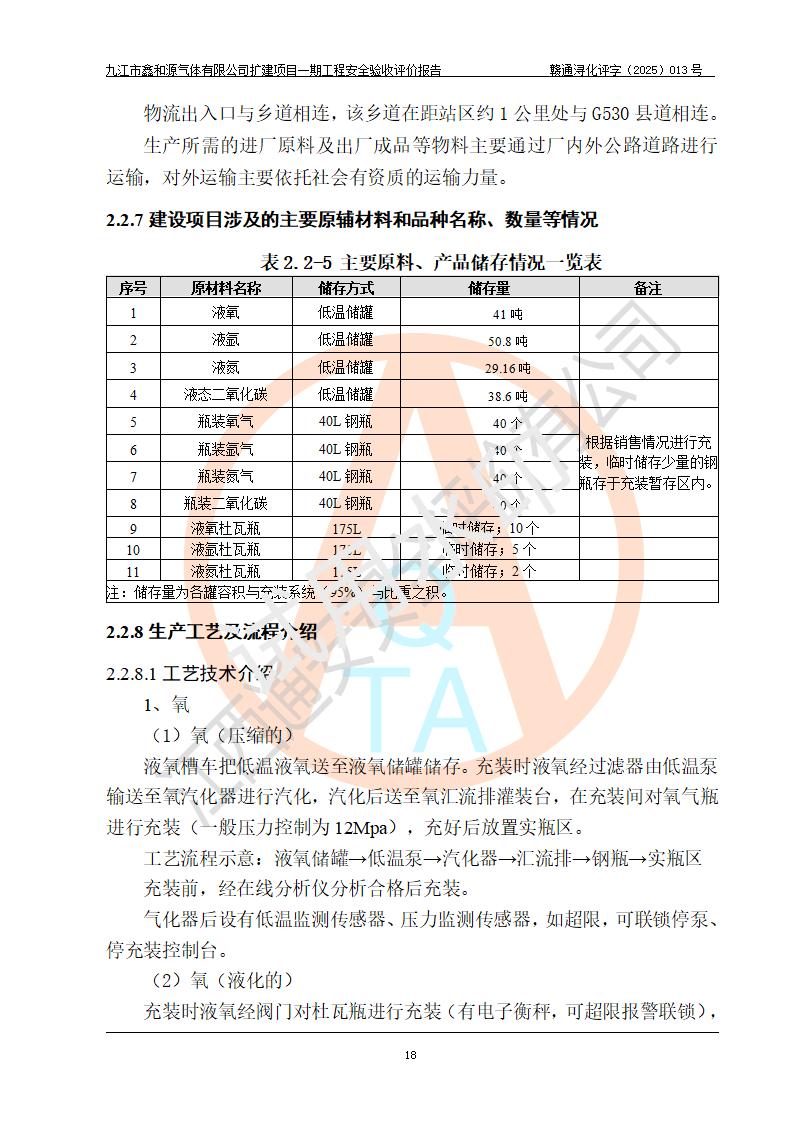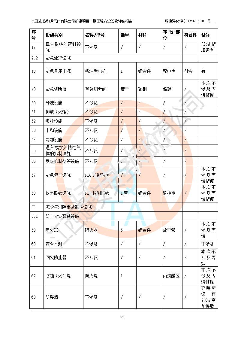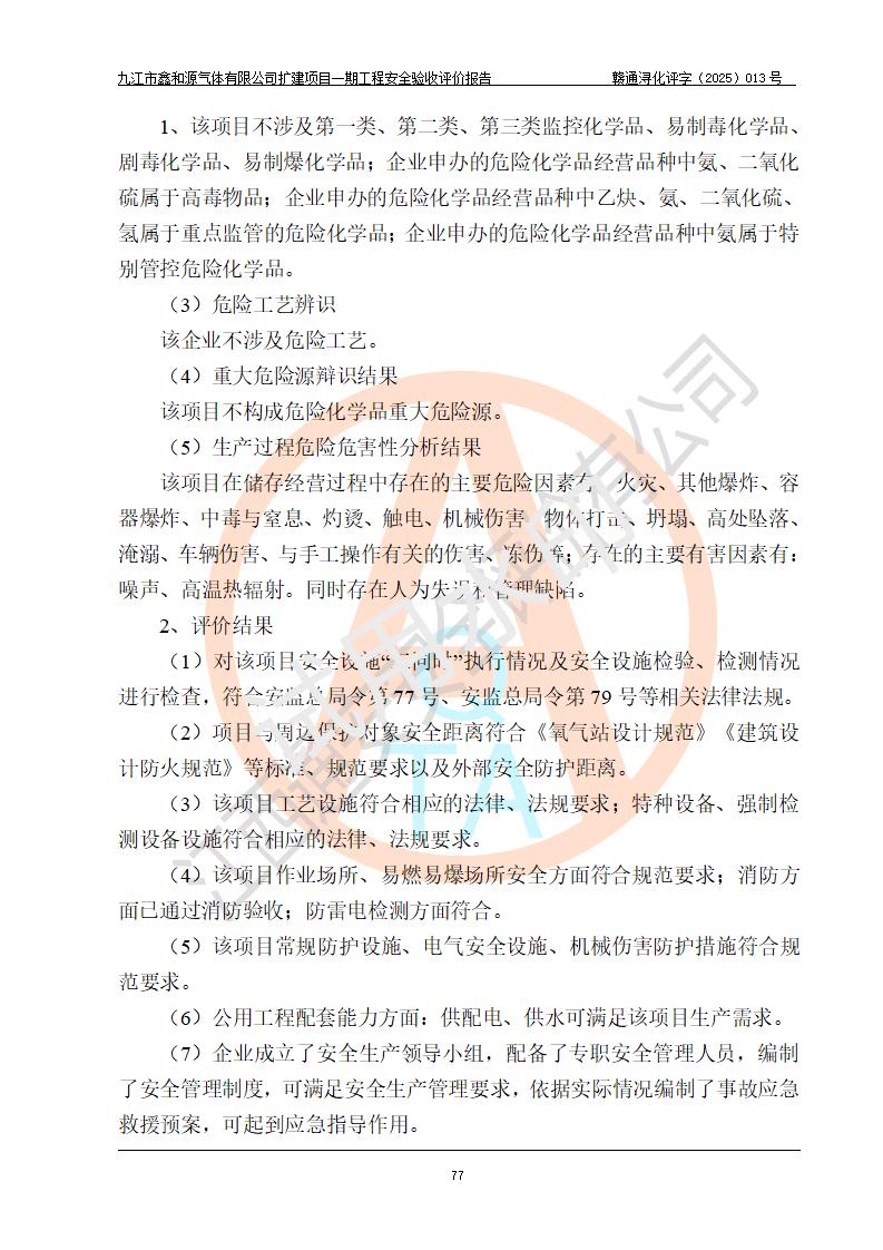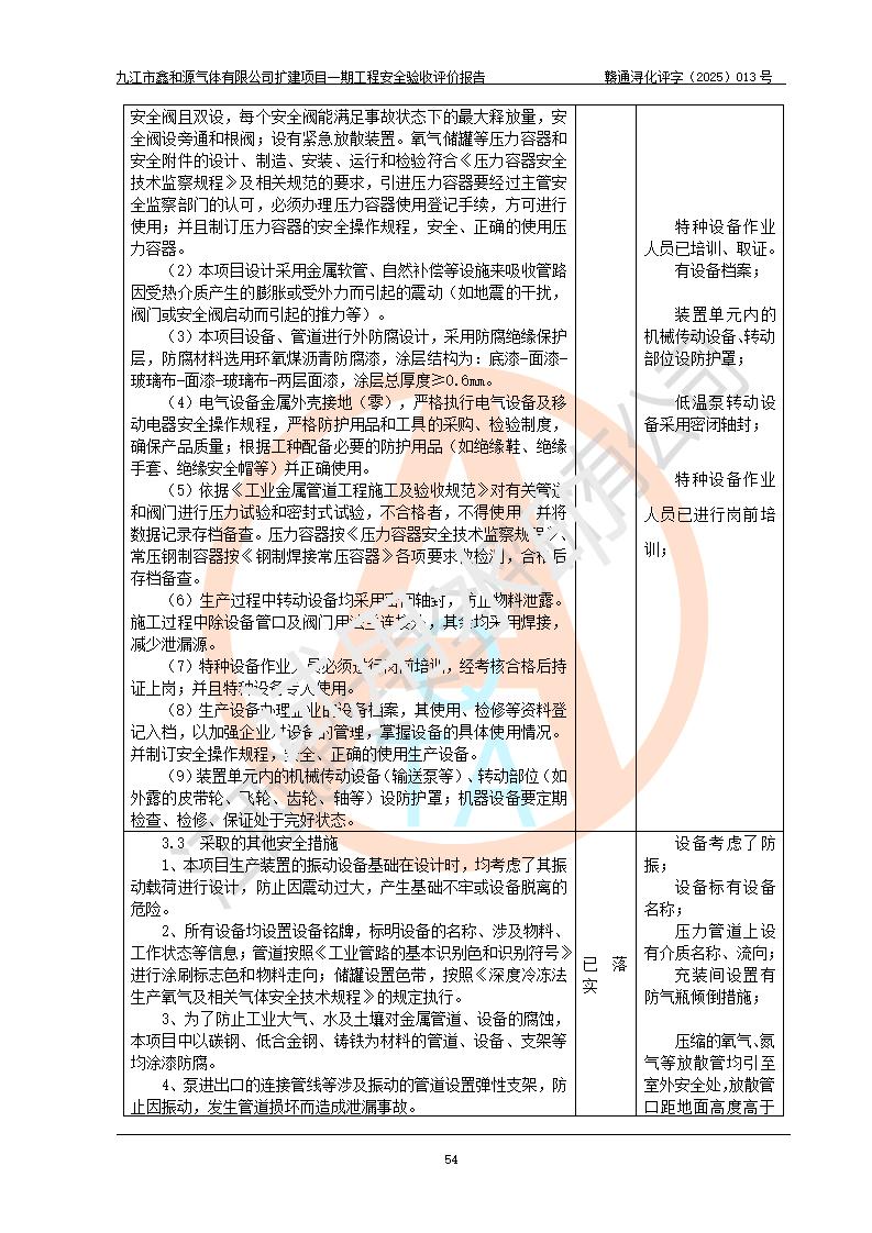 評(píng)價(jià)結(jié)論 | 經(jīng)評(píng)價(jià)組評(píng)價(jià),九江市鑫和源氣體有限公司擴(kuò)建2×20m3液氬、3×20m3液氮、2×20m3液氧、2×20m3CO2、2×50m3丙烷儲(chǔ)存及充裝項(xiàng)目一期工程總體布局、設(shè)備布置情況與設(shè)計(jì)圖紙一致,本次項(xiàng)目(儲(chǔ)存、充裝)不涉及重點(diǎn)監(jiān)管的危險(xiǎn)化學(xué)品、危險(xiǎn)工藝、重大危險(xiǎn)源,按設(shè)計(jì)要求施工、安裝;企業(yè)主要負(fù)責(zé)人及安全管理人員已取得危險(xiǎn)化學(xué)品企業(yè)安全生產(chǎn)知識(shí)和管理能力考核合格證。項(xiàng)目選擇的工藝過程及設(shè)備設(shè)施的安全可靠性能達(dá)到**法規(guī)、標(biāo)準(zhǔn)規(guī)定要求。 項(xiàng)目運(yùn)行后存在的主要危險(xiǎn)、有害因素有:火災(zāi)、其他爆炸、容器爆炸、凍傷等;存在的主要有害因素有噪聲等;針對(duì)存在的危險(xiǎn)、有害因素,企業(yè)采取了**的安全技術(shù)措施及安全管理措施,項(xiàng)目風(fēng)險(xiǎn)可控,其安全生產(chǎn)條件和安全管理方面具備竣工安全驗(yàn)收的條件。 | |||||