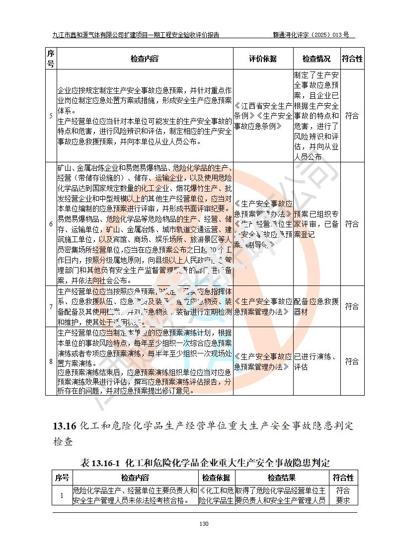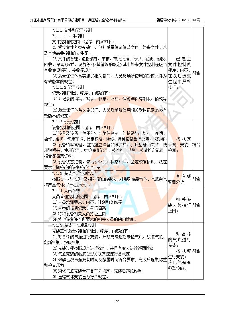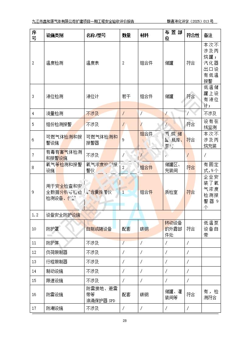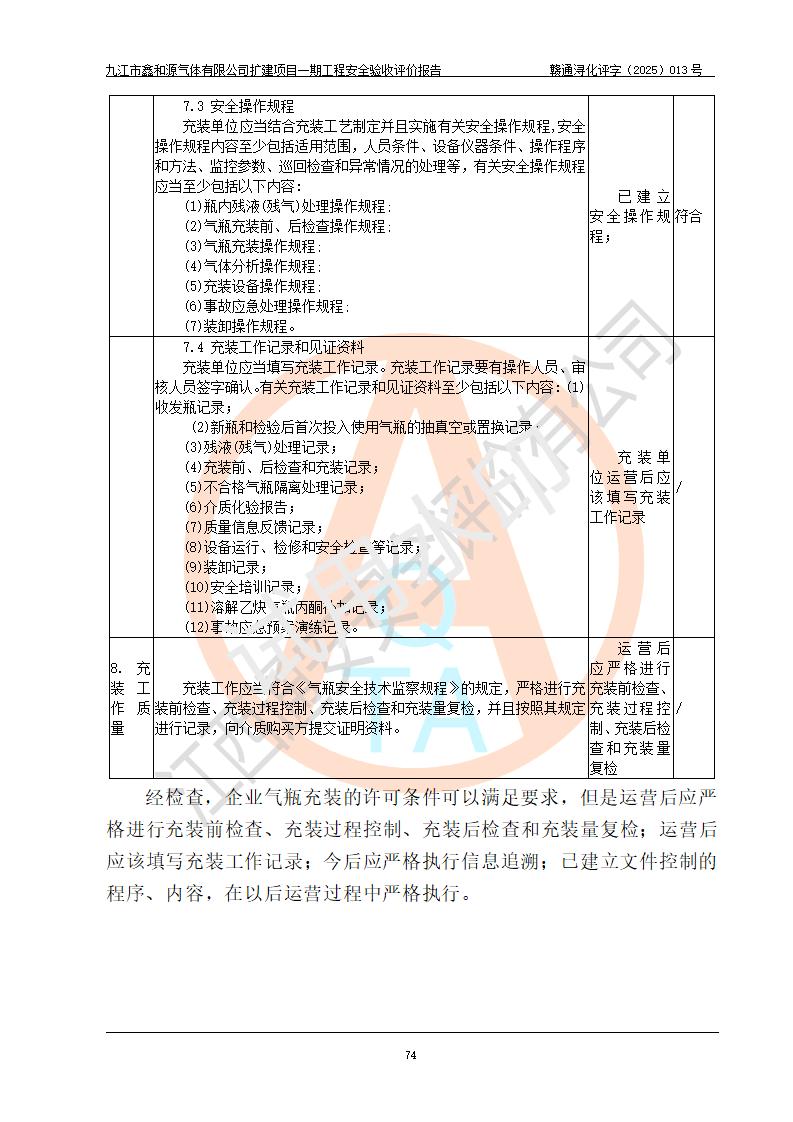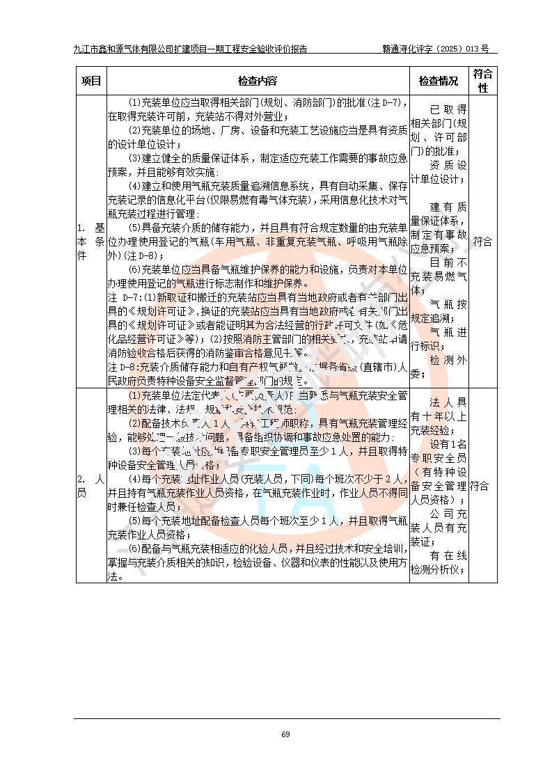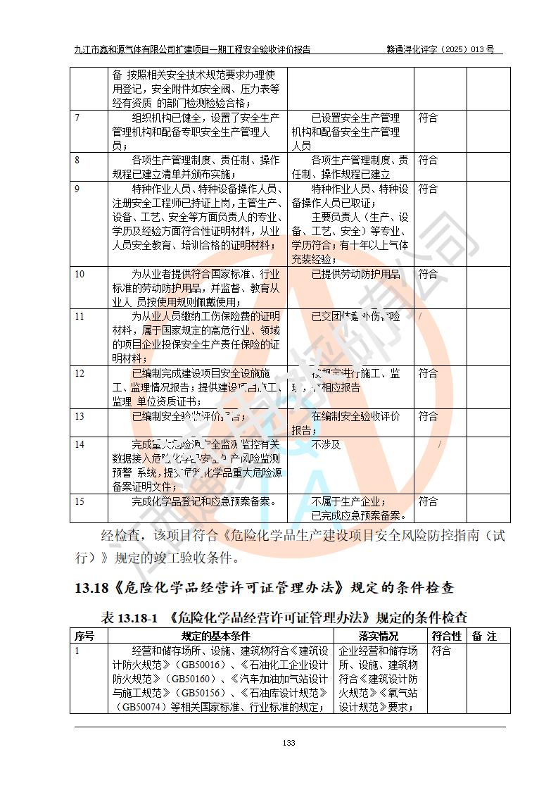 評(píng)價(jià)結(jié)論 | 經(jīng)評(píng)價(jià)組評(píng)價(jià),九江市鑫和源氣體有限公司擴(kuò)建2×20m3液氬、3×20m3液氮、2×20m3液氧、2×20m3CO2、2×50m3丙烷儲(chǔ)存及充裝項(xiàng)目一期工程總體布局、設(shè)備布置情況與設(shè)計(jì)圖紙一致,本次項(xiàng)目(儲(chǔ)存、充裝)不涉及重點(diǎn)監(jiān)管的危險(xiǎn)化學(xué)品、危險(xiǎn)工藝、重大危險(xiǎn)源,按設(shè)計(jì)要求施工、安裝;企業(yè)主要負(fù)責(zé)人及安全管理人員已取得危險(xiǎn)化學(xué)品企業(yè)安全生產(chǎn)知識(shí)和管理能力考核合格證。項(xiàng)目選擇的工藝過程及設(shè)備設(shè)施的安全可靠性能達(dá)到**法規(guī)、標(biāo)準(zhǔn)規(guī)定要求。 項(xiàng)目運(yùn)行后存在的主要危險(xiǎn)、有害因素有:火災(zāi)、其他爆炸、容器爆炸、凍傷等;存在的主要有害因素有噪聲等;針對(duì)存在的危險(xiǎn)、有害因素,企業(yè)采取了**的安全技術(shù)措施及安全管理措施,項(xiàng)目風(fēng)險(xiǎn)可控,其安全生產(chǎn)條件和安全管理方面具備竣工安全驗(yàn)收的條件。 | |||||