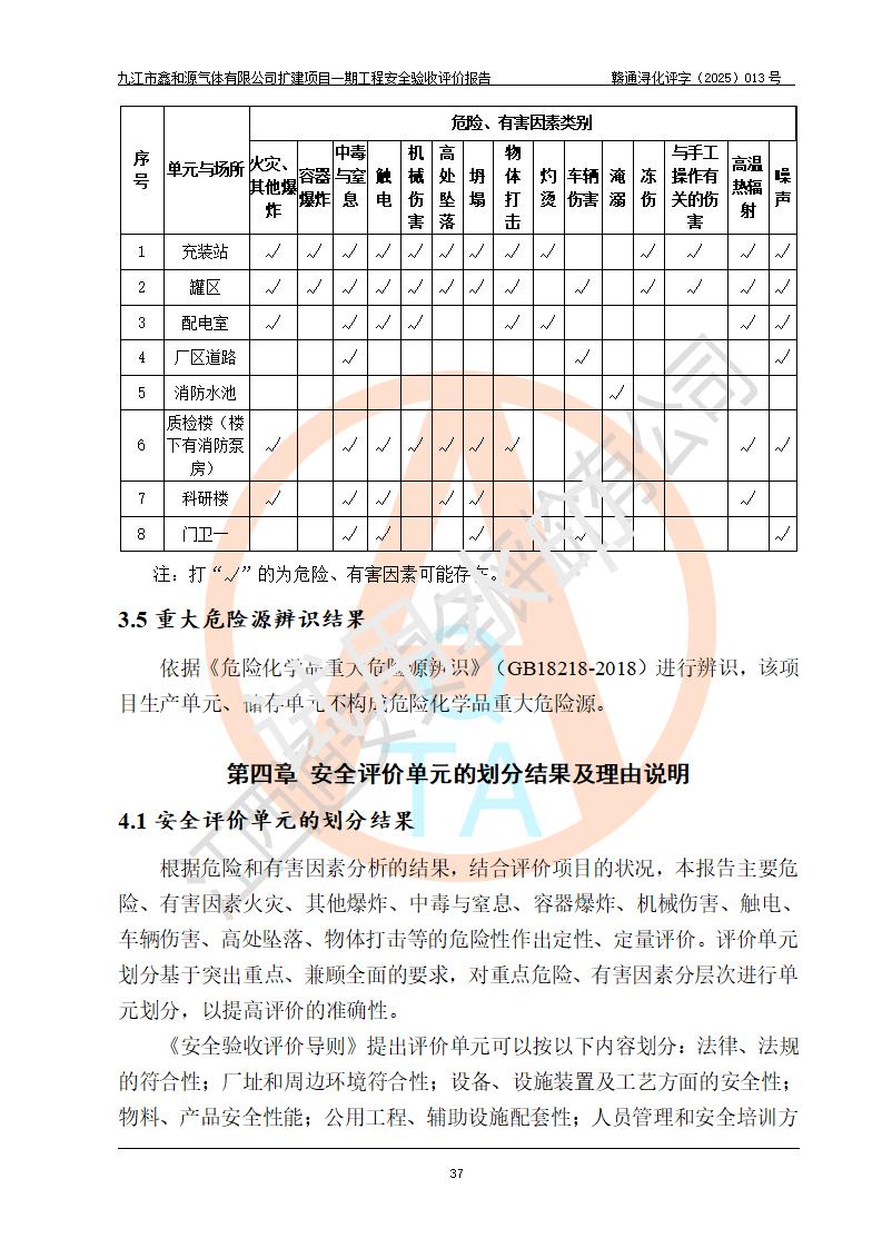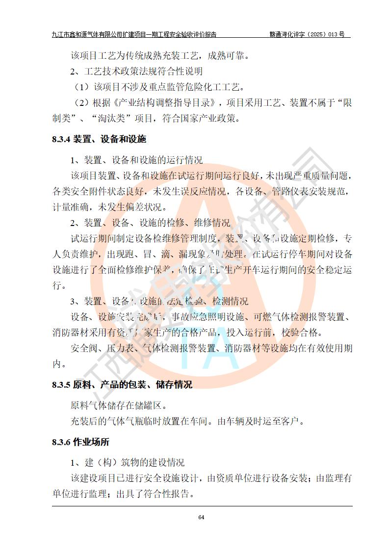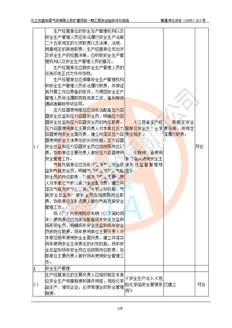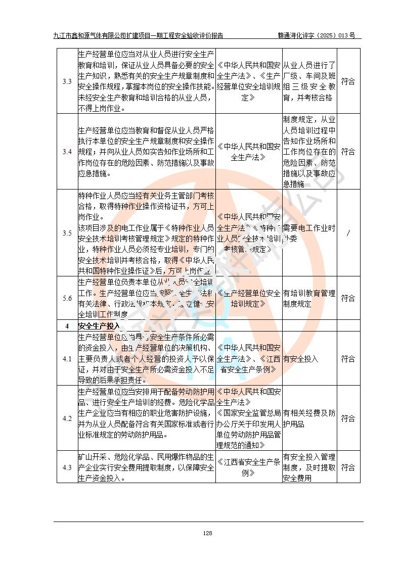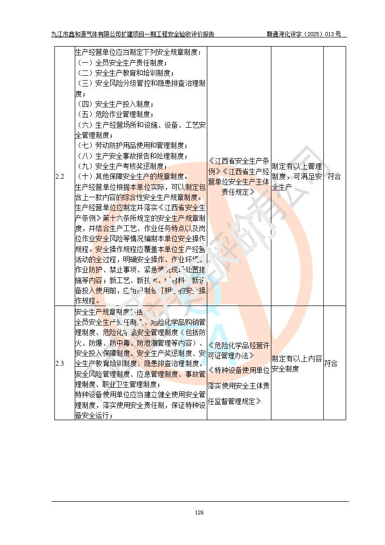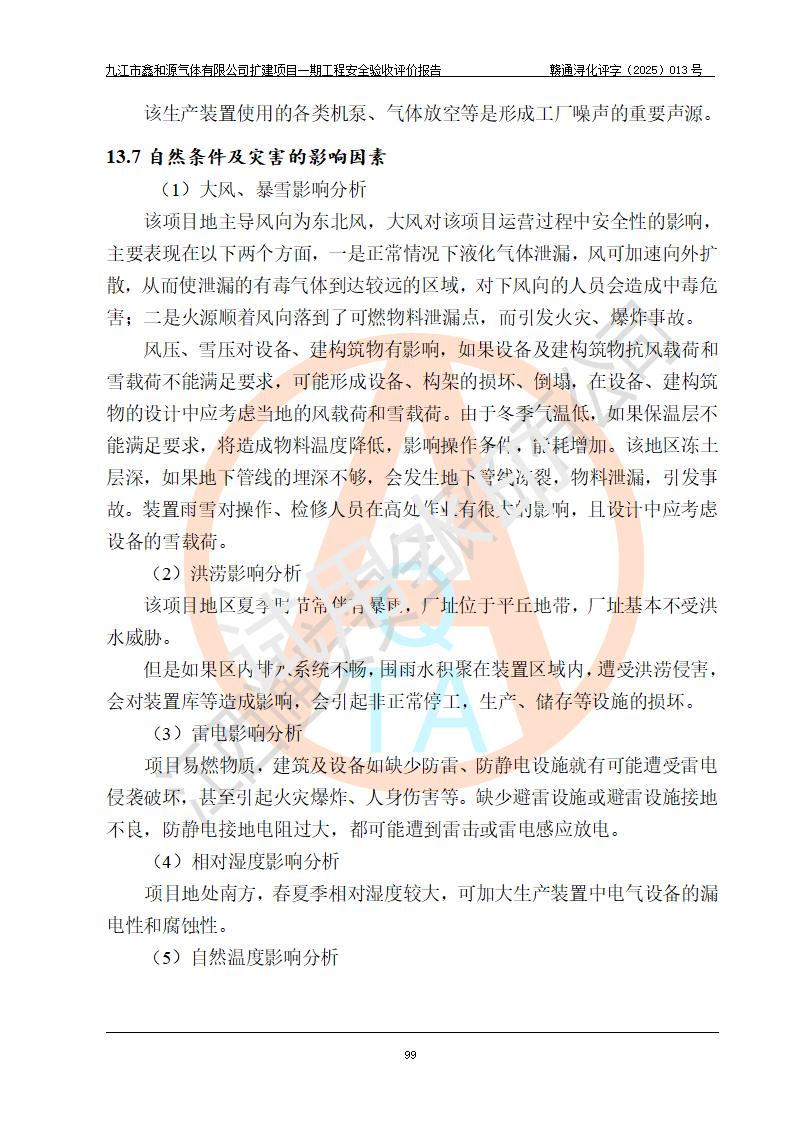 評(píng)價(jià)結(jié)論 | 經(jīng)評(píng)價(jià)組評(píng)價(jià),九江市鑫和源氣體有限公司擴(kuò)建2×20m3液氬、3×20m3液氮、2×20m3液氧、2×20m3CO2、2×50m3丙烷儲(chǔ)存及充裝項(xiàng)目一期工程總體布局、設(shè)備布置情況與設(shè)計(jì)圖紙一致,本次項(xiàng)目(儲(chǔ)存、充裝)不涉及重點(diǎn)監(jiān)管的危險(xiǎn)化學(xué)品、危險(xiǎn)工藝、重大危險(xiǎn)源,按設(shè)計(jì)要求施工、安裝;企業(yè)主要負(fù)責(zé)人及安全管理人員已取得危險(xiǎn)化學(xué)品企業(yè)安全生產(chǎn)知識(shí)和管理能力考核合格證。項(xiàng)目選擇的工藝過程及設(shè)備設(shè)施的安全可靠性能達(dá)到**法規(guī)、標(biāo)準(zhǔn)規(guī)定要求。 項(xiàng)目運(yùn)行后存在的主要危險(xiǎn)、有害因素有:火災(zāi)、其他爆炸、容器爆炸、凍傷等;存在的主要有害因素有噪聲等;針對(duì)存在的危險(xiǎn)、有害因素,企業(yè)采取了**的安全技術(shù)措施及安全管理措施,項(xiàng)目風(fēng)險(xiǎn)可控,其安全生產(chǎn)條件和安全管理方面具備竣工安全驗(yàn)收的條件。 | |||||