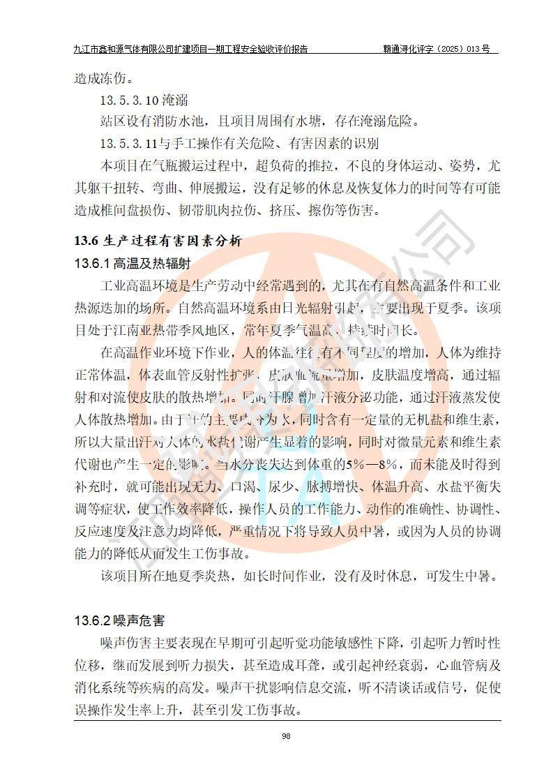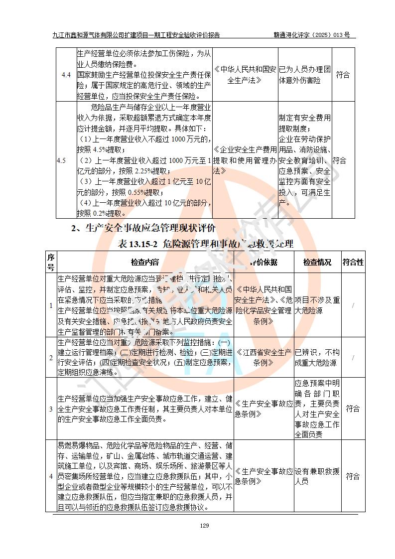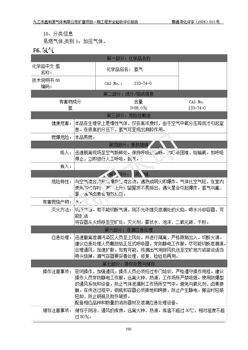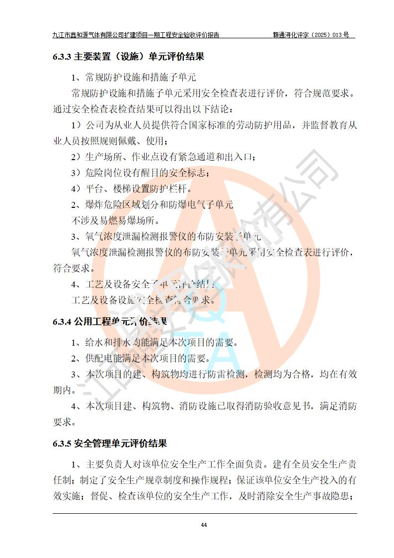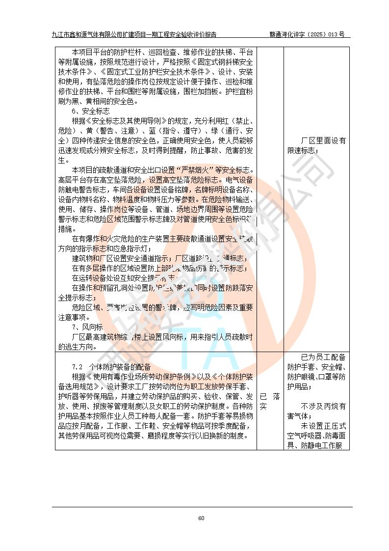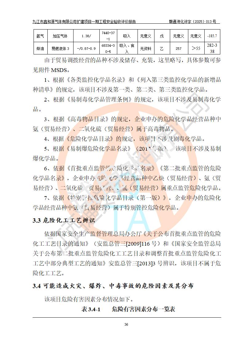 評(píng)價(jià)結(jié)論 | 經(jīng)評(píng)價(jià)組評(píng)價(jià),九江市鑫和源氣體有限公司擴(kuò)建2×20m3液氬、3×20m3液氮、2×20m3液氧、2×20m3CO2、2×50m3丙烷儲(chǔ)存及充裝項(xiàng)目一期工程總體布局、設(shè)備布置情況與設(shè)計(jì)圖紙一致,本次項(xiàng)目(儲(chǔ)存、充裝)不涉及重點(diǎn)監(jiān)管的危險(xiǎn)化學(xué)品、危險(xiǎn)工藝、重大危險(xiǎn)源,按設(shè)計(jì)要求施工、安裝;企業(yè)主要負(fù)責(zé)人及安全管理人員已取得危險(xiǎn)化學(xué)品企業(yè)安全生產(chǎn)知識(shí)和管理能力考核合格證。項(xiàng)目選擇的工藝過程及設(shè)備設(shè)施的安全可靠性能達(dá)到**法規(guī)、標(biāo)準(zhǔn)規(guī)定要求。 項(xiàng)目運(yùn)行后存在的主要危險(xiǎn)、有害因素有:火災(zāi)、其他爆炸、容器爆炸、凍傷等;存在的主要有害因素有噪聲等;針對(duì)存在的危險(xiǎn)、有害因素,企業(yè)采取了**的安全技術(shù)措施及安全管理措施,項(xiàng)目風(fēng)險(xiǎn)可控,其安全生產(chǎn)條件和安全管理方面具備竣工安全驗(yàn)收的條件。 | |||||