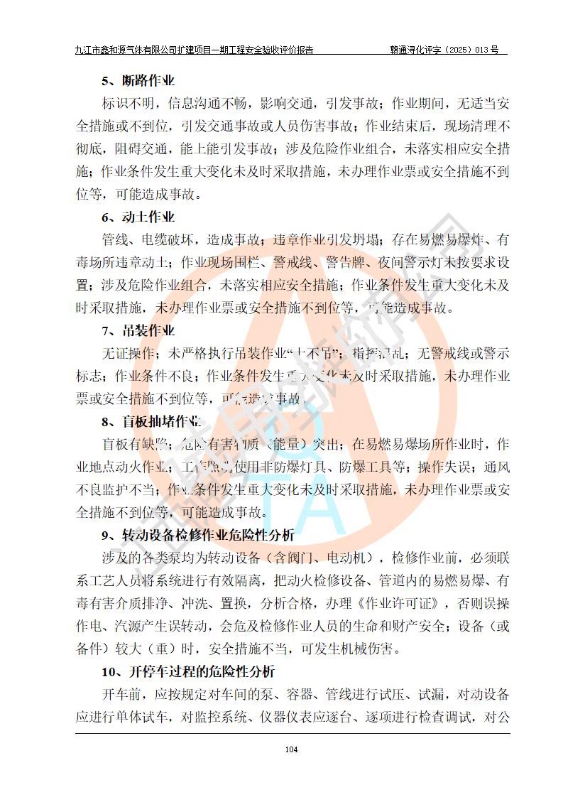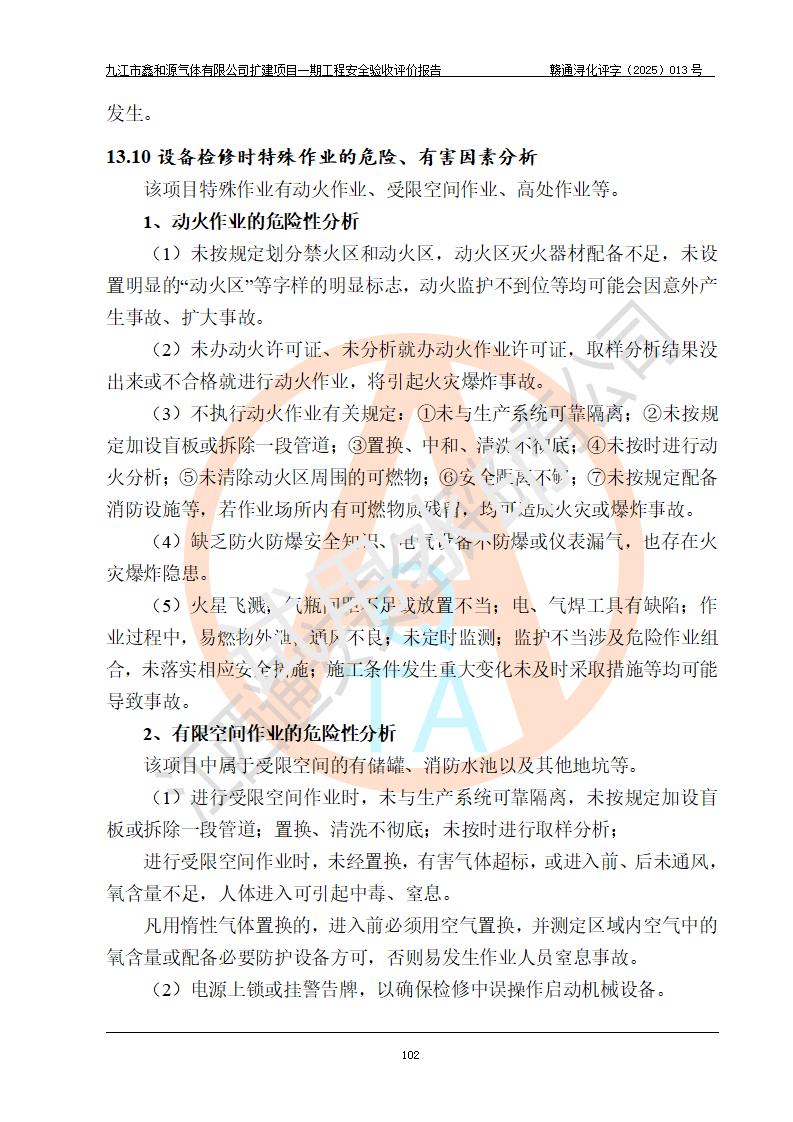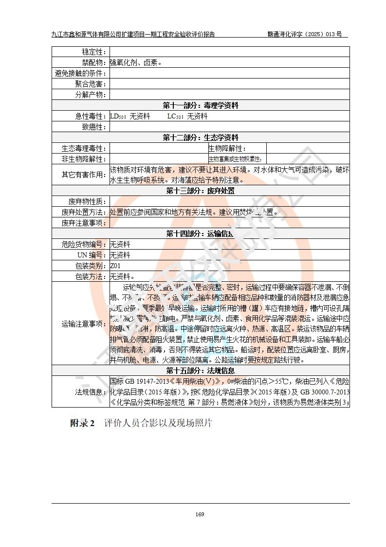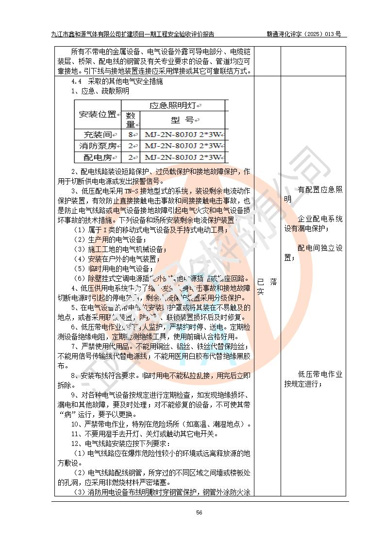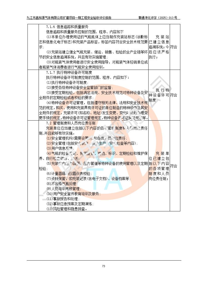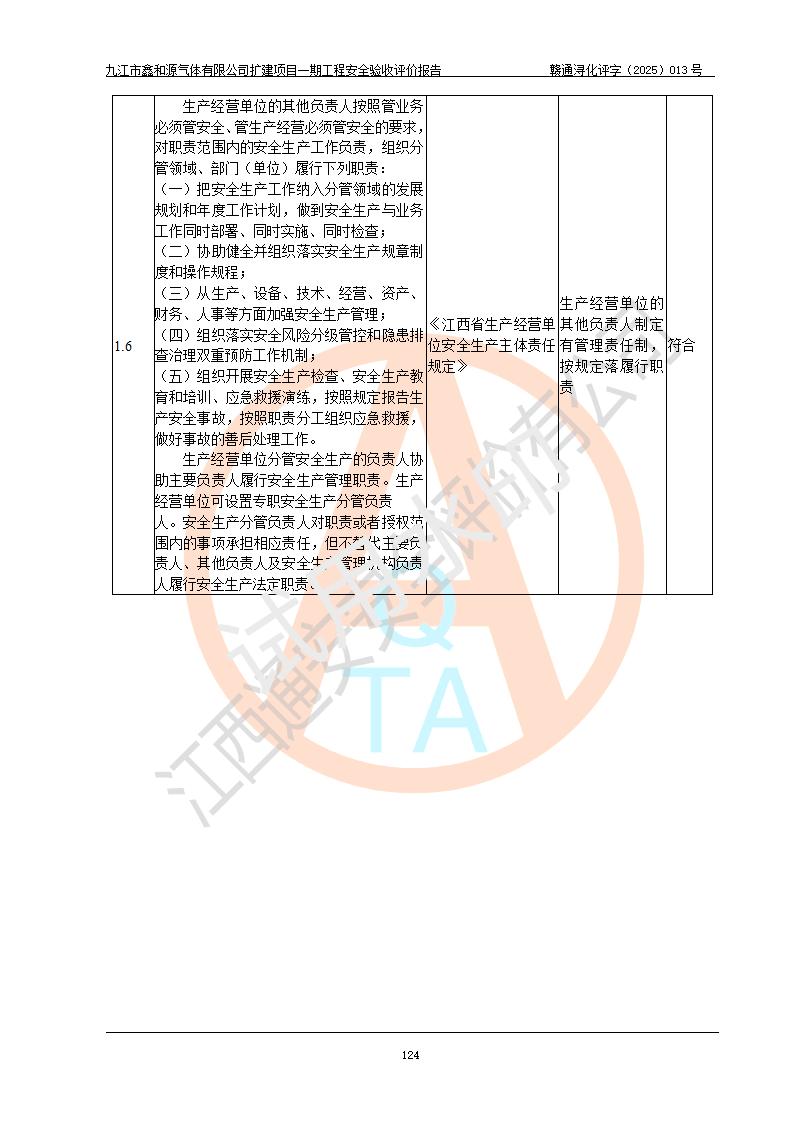 評(píng)價(jià)結(jié)論 | 經(jīng)評(píng)價(jià)組評(píng)價(jià),九江市鑫和源氣體有限公司擴(kuò)建2×20m3液氬、3×20m3液氮、2×20m3液氧、2×20m3CO2、2×50m3丙烷儲(chǔ)存及充裝項(xiàng)目一期工程總體布局、設(shè)備布置情況與設(shè)計(jì)圖紙一致,本次項(xiàng)目(儲(chǔ)存、充裝)不涉及重點(diǎn)監(jiān)管的危險(xiǎn)化學(xué)品、危險(xiǎn)工藝、重大危險(xiǎn)源,按設(shè)計(jì)要求施工、安裝;企業(yè)主要負(fù)責(zé)人及安全管理人員已取得危險(xiǎn)化學(xué)品企業(yè)安全生產(chǎn)知識(shí)和管理能力考核合格證。項(xiàng)目選擇的工藝過程及設(shè)備設(shè)施的安全可靠性能達(dá)到**法規(guī)、標(biāo)準(zhǔn)規(guī)定要求。 項(xiàng)目運(yùn)行后存在的主要危險(xiǎn)、有害因素有:火災(zāi)、其他爆炸、容器爆炸、凍傷等;存在的主要有害因素有噪聲等;針對(duì)存在的危險(xiǎn)、有害因素,企業(yè)采取了**的安全技術(shù)措施及安全管理措施,項(xiàng)目風(fēng)險(xiǎn)可控,其安全生產(chǎn)條件和安全管理方面具備竣工安全驗(yàn)收的條件。 | |||||