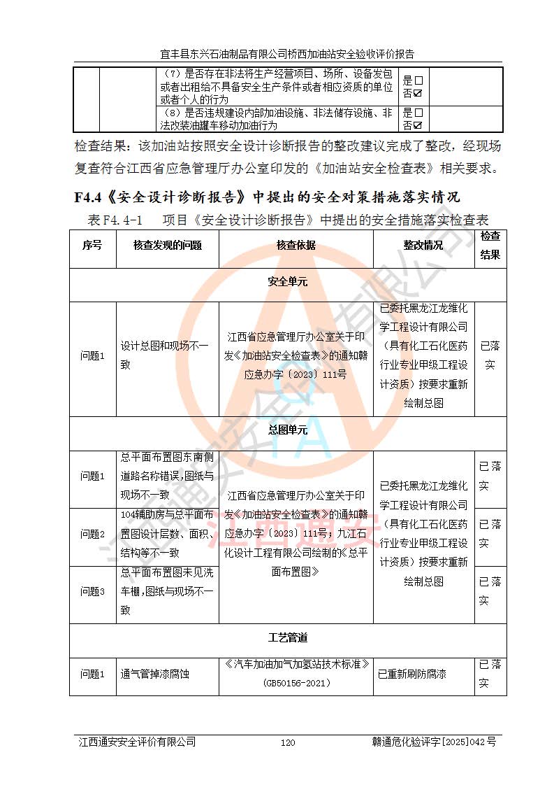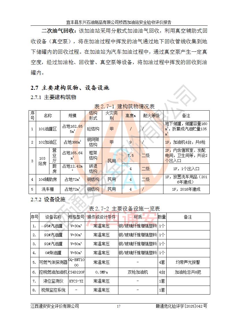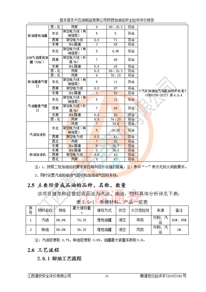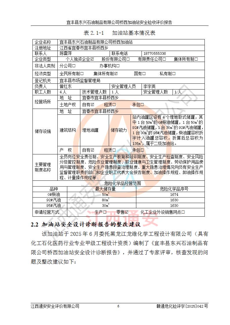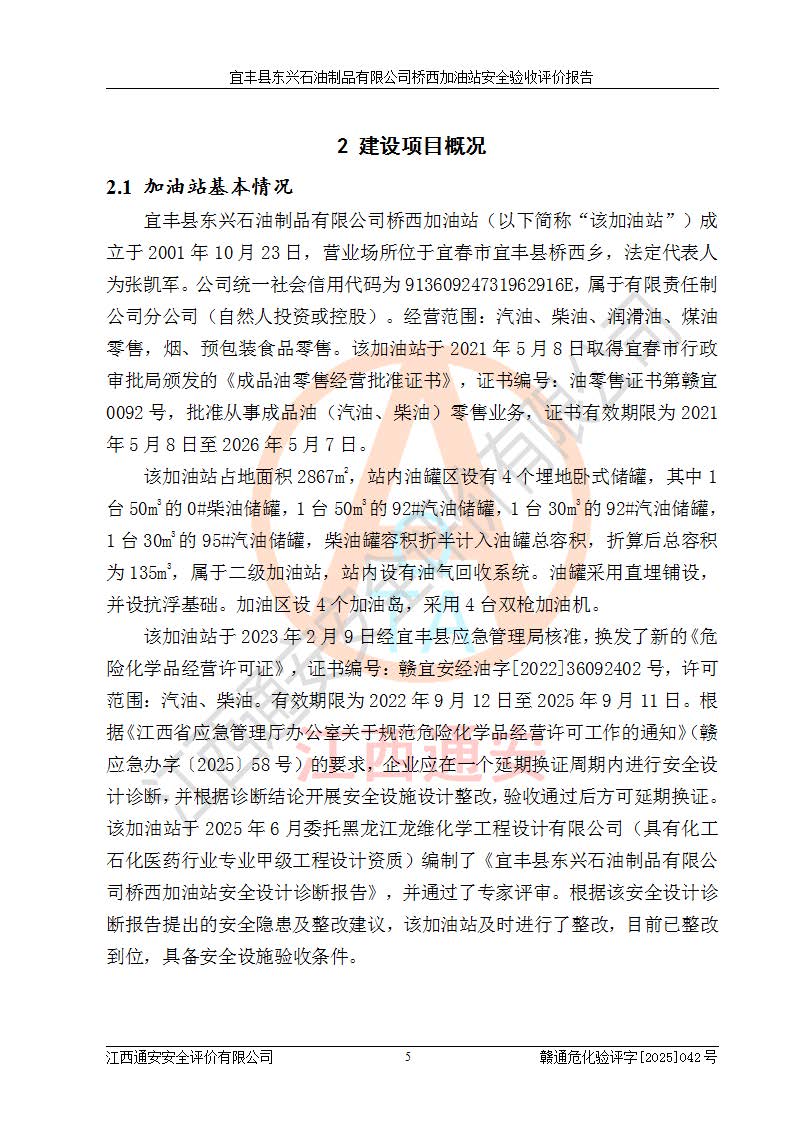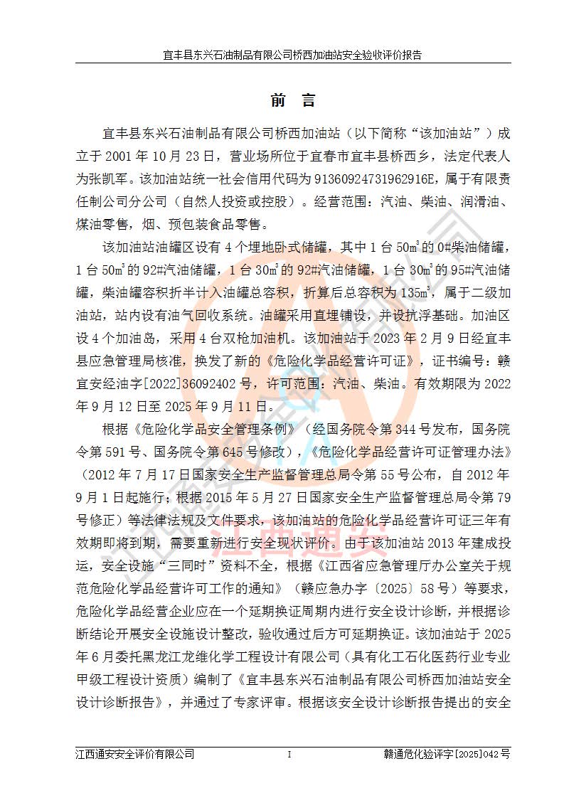 項(xiàng)目簡(jiǎn)介 | 宜豐縣東興石油制品有限公司橋西加油站(以下簡(jiǎn)稱(chēng)“該加油站”)成立于2001年10月23日,營(yíng)業(yè)場(chǎng)所位于宜春市宜豐縣橋西鄉(xiāng),法定**人為張凱軍。該加油站統(tǒng)一社會(huì)信用代碼為91360924731962916E,屬于有限責(zé)任制公司分公司(自然人投資或控股)。經(jīng)營(yíng)范圍:汽油、柴油、潤(rùn)滑油、煤油零售,煙、預(yù)包裝食品零售。 該加油站油罐區(qū)設(shè)有4個(gè)埋地臥式儲(chǔ)罐,其中1臺(tái)50m3的0#柴油儲(chǔ)罐,1臺(tái)50m3的92#汽油儲(chǔ)罐,1臺(tái)30m3的92#汽油儲(chǔ)罐,1臺(tái)30m3的95#汽油儲(chǔ)罐,柴油罐容積折半計(jì)入油罐總?cè)莘e,折算后總?cè)莘e為135m3,屬于二級(jí)加油站,站內(nèi)設(shè)有油氣回收系統(tǒng)。油罐采用直埋鋪設(shè),并設(shè)抗浮基礎(chǔ)。加油區(qū)設(shè)4個(gè)加油島,采用4臺(tái)雙槍加油機(jī)。該加油站于2023年2月9日經(jīng)宜豐縣應(yīng)急管理局核準(zhǔn),換發(fā)了新的《危險(xiǎn)化學(xué)品經(jīng)營(yíng)許可證》,證書(shū)編號(hào):贛宜安經(jīng)油字[2022]36092402號(hào),許可范圍:汽油、柴油。**期限為2022年9月12日至2025年9月11日。 根據(jù)《危險(xiǎn)化學(xué)品安全管理?xiàng)l例》(經(jīng)***令第344號(hào)發(fā)布,***令第591號(hào)、***令第645號(hào)修改),《危險(xiǎn)化學(xué)品經(jīng)營(yíng)許可證管理辦法》(2012年7月17日**安全生產(chǎn)監(jiān)督管理總局令第55號(hào)公布,自2012年9月1日起施行;根據(jù)2015年5月27日**安全生產(chǎn)監(jiān)督管理總局令第79號(hào)修正)等法律法規(guī)及文件要求,該加油站的危險(xiǎn)化學(xué)品經(jīng)營(yíng)許可證三年**期即將到期,需要重新進(jìn)行安全現(xiàn)狀評(píng)價(jià)。由于該加油站2013年建成投運(yùn),安全設(shè)施“三同時(shí)”資料不全,根據(jù)《江西省應(yīng)急管理廳辦公室關(guān)于規(guī)范危險(xiǎn)化學(xué)品經(jīng)營(yíng)許可工作的通知》(贛應(yīng)急辦字〔2025〕58號(hào))等要求,危險(xiǎn)化學(xué)品經(jīng)營(yíng)企業(yè)應(yīng)在一個(gè)延期換證周期內(nèi)進(jìn)行安全設(shè)計(jì)診斷,并根據(jù)診斷結(jié)論開(kāi)展安全設(shè)施設(shè)計(jì)整改,驗(yàn)收通過(guò)后方可延期換證。該加油站于2025年6月委托黑龍江龍維化學(xué)工程設(shè)計(jì)有限公司(具有化工石化醫(yī)藥行業(yè)專(zhuān)業(yè)**工程設(shè)計(jì)資質(zhì))編制了《宜豐縣東興石油制品有限公司橋西加油站安全設(shè)計(jì)診斷報(bào)告》,并通過(guò)了專(zhuān)家評(píng)審。根據(jù)該安全設(shè)計(jì)診斷報(bào)告提出的安全隱患及整改建議,該加油站及時(shí)進(jìn)行了整改,目前已整改到位,具備安全設(shè)施驗(yàn)收條件。
