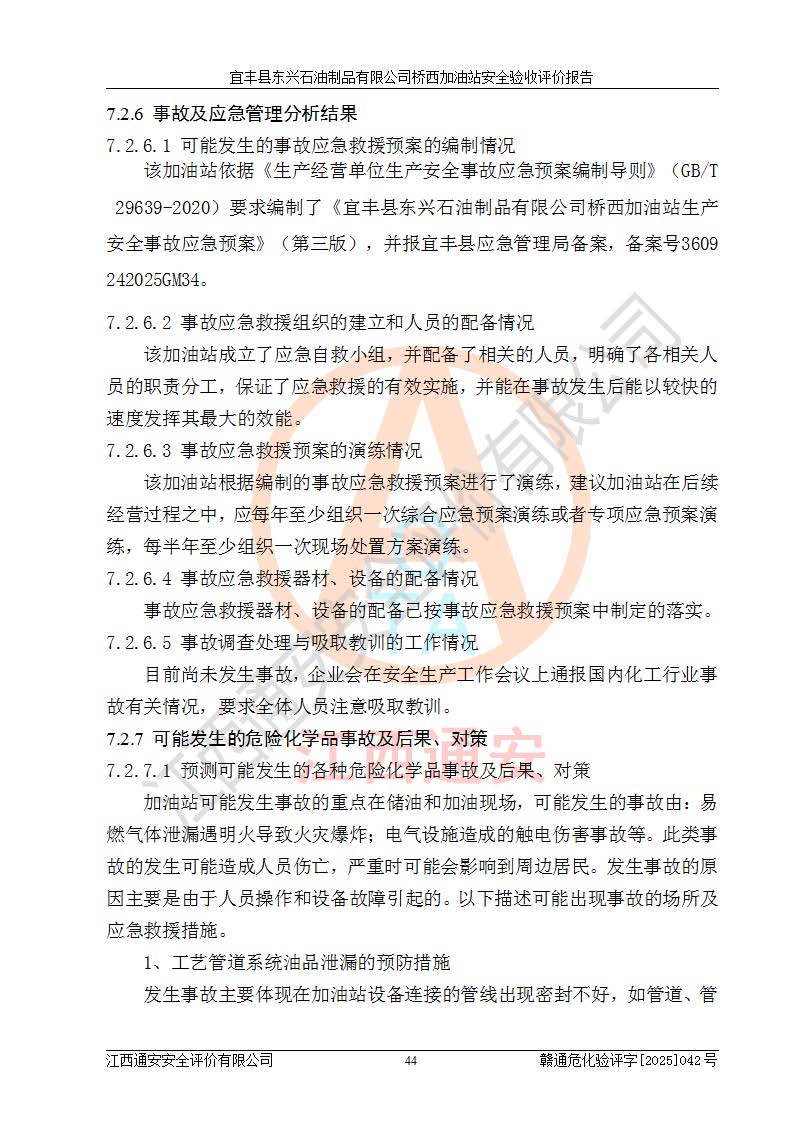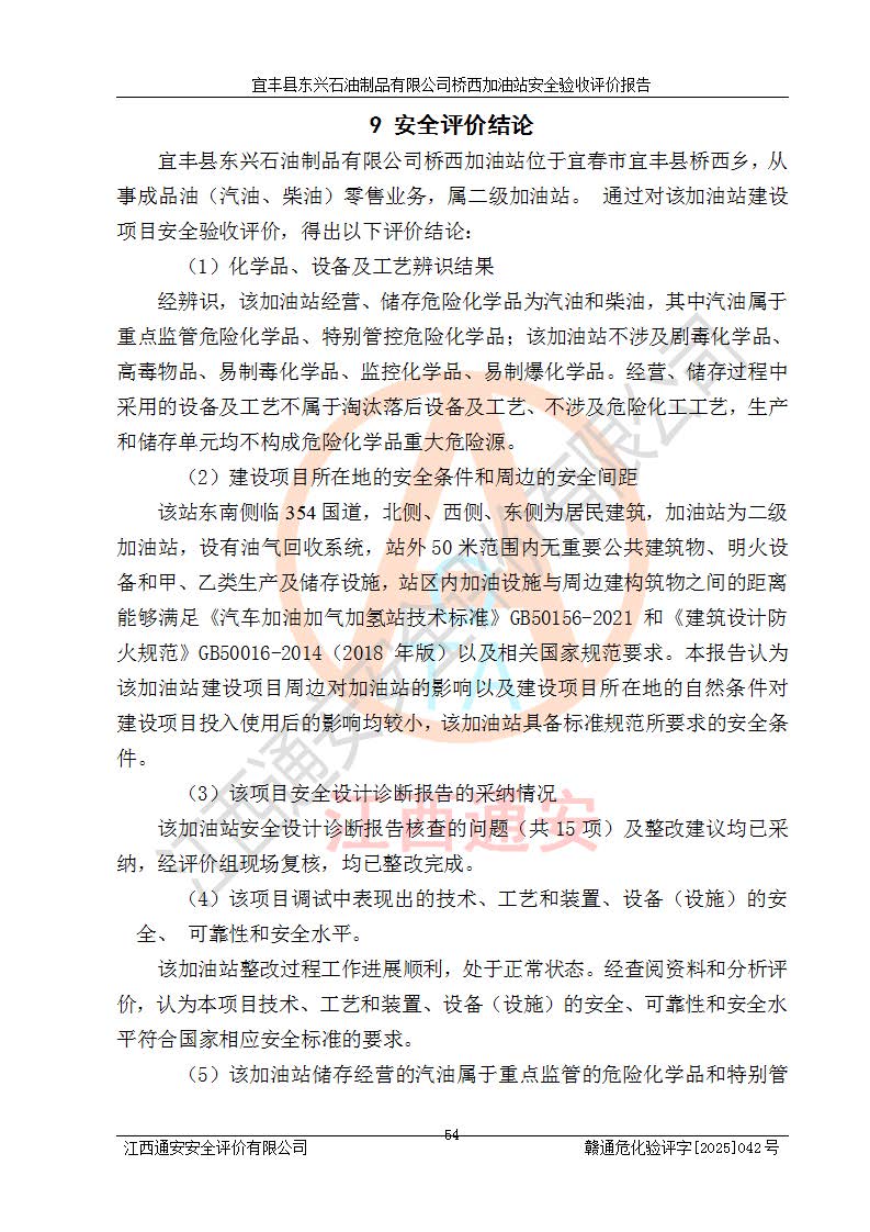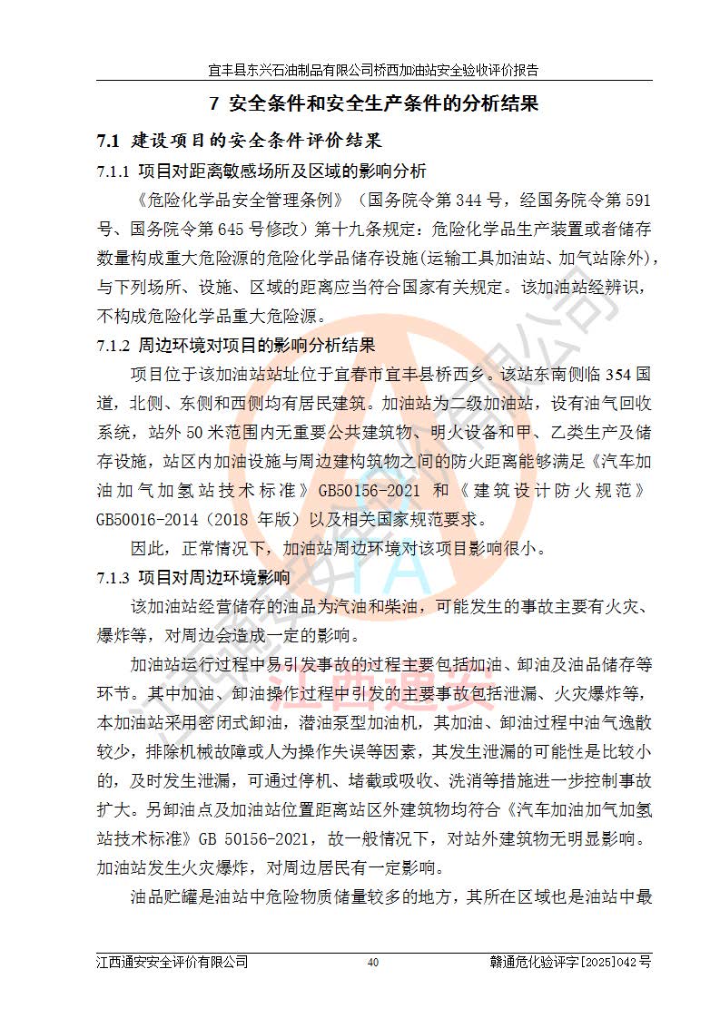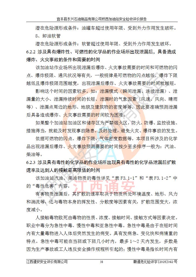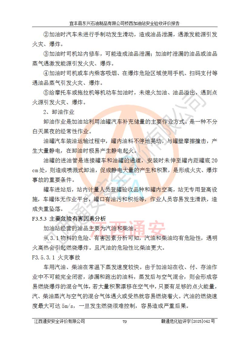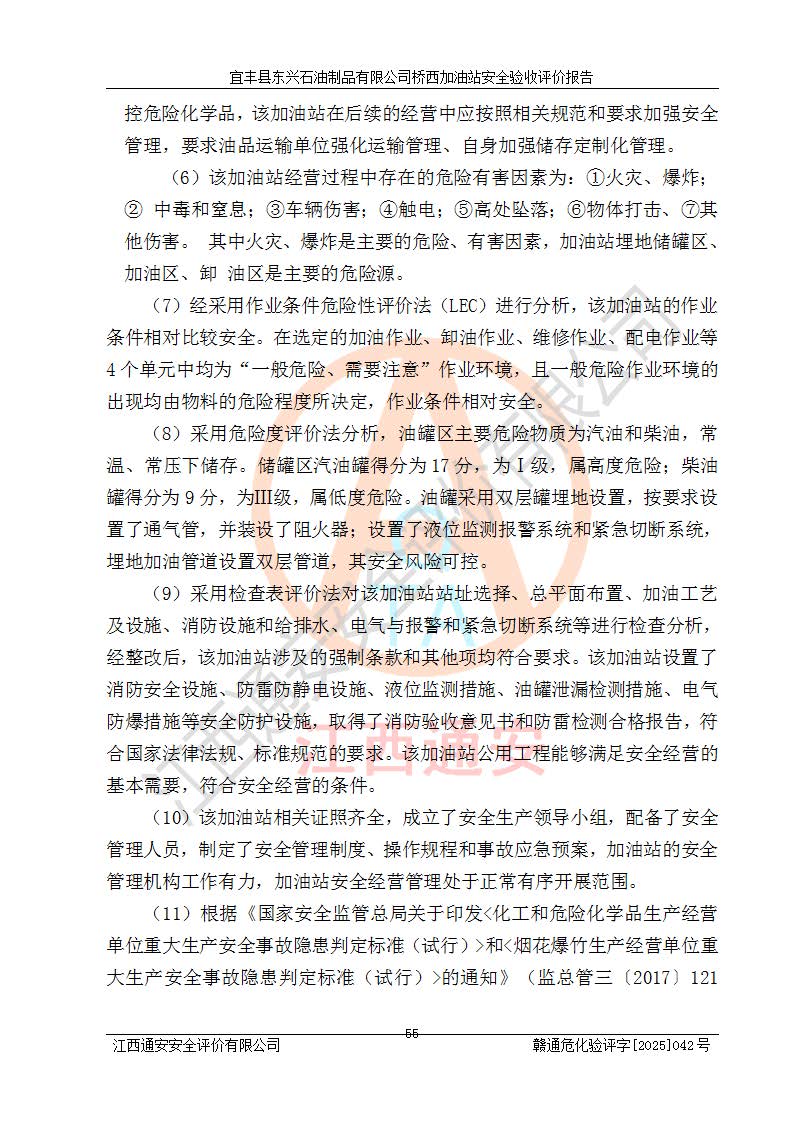 其它 | 一、安全狀況綜合評(píng)述 宜豐縣東興石油制品有限公司橋西加油站位于宜春市宜豐縣橋西鄉(xiāng),從事成品油(汽油、柴油)零售業(yè)務(wù),屬二級(jí)加油站。 通過(guò)對(duì)該加油站建設(shè)項(xiàng)目安全驗(yàn)收評(píng)價(jià),得出以下評(píng)價(jià)結(jié)論: 化學(xué)品、設(shè)備及工藝辨識(shí)結(jié)果 經(jīng)辨識(shí),該加油站經(jīng)營(yíng)、儲(chǔ)存危險(xiǎn)化學(xué)品為汽油和柴油,其中汽油屬于重點(diǎn)監(jiān)管危險(xiǎn)化學(xué)品、特別管控危險(xiǎn)化學(xué)品;該加油站不涉及劇毒化學(xué)品、高毒物品、易制毒化學(xué)品、監(jiān)控化學(xué)品、易制爆化學(xué)品。經(jīng)營(yíng)、儲(chǔ)存過(guò)程中采用的設(shè)備及工藝不屬于淘汰落后設(shè)備及工藝、不涉及危險(xiǎn)化工工藝,生產(chǎn)和儲(chǔ)存單元均不構(gòu)成危險(xiǎn)化學(xué)品重大危險(xiǎn)源。 建設(shè)項(xiàng)目所在地的安全條件和周邊的安全間距 該站東南側(cè)臨354國(guó)道,北側(cè)、西側(cè)、東側(cè)為居民建筑,加油站為二級(jí)加油站,設(shè)有油氣回收系統(tǒng),站外50米范圍內(nèi)無(wú)重要公共建筑物、明火設(shè)備和甲、乙類(lèi)生產(chǎn)及儲(chǔ)存設(shè)施,站區(qū)內(nèi)加油設(shè)施與周邊建構(gòu)筑物之間的距離能夠滿足《汽車(chē)加油加氣加氫站技術(shù)標(biāo)準(zhǔn)》GB50156-2021 和《建筑設(shè)計(jì)防火規(guī)范》GB50016-2014(2018 年版)以及相關(guān)**規(guī)范要求。本報(bào)告認(rèn)為該加油站建設(shè)項(xiàng)目周邊對(duì)加油站的影響以及建設(shè)項(xiàng)目所在地的自然條件對(duì)建設(shè)項(xiàng)目投入使用后的影響均較小,該加油站具備標(biāo)準(zhǔn)規(guī)范所要求的安全條件。 該項(xiàng)目安全設(shè)計(jì)診斷報(bào)告的采納情況 該加油站安全設(shè)計(jì)診斷報(bào)告核查的問(wèn)題(共15項(xiàng))及整改建議均已采納,經(jīng)評(píng)價(jià)組現(xiàn)場(chǎng)復(fù)核,均已整改完成。 該項(xiàng)目調(diào)試中表現(xiàn)出的技術(shù)、工藝和裝置、設(shè)備(設(shè)施)的安全、 可靠性和安全水平。 該加油站整改過(guò)程工作進(jìn)展順利,處于正常狀態(tài)。經(jīng)查閱資料和分析評(píng)價(jià),認(rèn)為本項(xiàng)目技術(shù)、工藝和裝置、設(shè)備(設(shè)施)的安全、可靠性和安全水平符合**相應(yīng)安全標(biāo)準(zhǔn)的要求。 該加油站儲(chǔ)存經(jīng)營(yíng)的汽油屬于重點(diǎn)監(jiān)管的危險(xiǎn)化學(xué)品和特別管控危險(xiǎn)化學(xué)品,該加油站在后續(xù)的經(jīng)營(yíng)中應(yīng)按照相關(guān)規(guī)范和要求加強(qiáng)安全管理,要求油品運(yùn)輸單位強(qiáng)化運(yùn)輸管理、自身加強(qiáng)儲(chǔ)存定制化管理。 該加油站經(jīng)營(yíng)過(guò)程中存在的危險(xiǎn)有害因素為:①火災(zāi)、爆炸;② 中毒和窒息;③**傷害;④觸電;⑤高處墜落;⑥物體打擊、⑦其他傷害。 其中火災(zāi)、爆炸是主要的危險(xiǎn)、有害因素,加油站埋地儲(chǔ)罐區(qū)、加油區(qū)、卸 油區(qū)是主要的危險(xiǎn)源。 (7)經(jīng)采用作業(yè)條件危險(xiǎn)性評(píng)價(jià)法(LEC)進(jìn)行分析,該加油站的作業(yè)條件相對(duì)比較安全。在選定的加油作業(yè)、卸油作業(yè)、維修作業(yè)、配電作業(yè)等4個(gè)單元中均為“一般危險(xiǎn)、需要注意”作業(yè)環(huán)境,且一般危險(xiǎn)作業(yè)環(huán)境的出現(xiàn)均由物料的危險(xiǎn)程度所決定,作業(yè)條件相對(duì)安全。 (8)采用危險(xiǎn)度評(píng)價(jià)法分析,油罐區(qū)主要危險(xiǎn)物質(zhì)為汽油和柴油,常溫、常壓下儲(chǔ)存。儲(chǔ)罐區(qū)汽油罐為Ⅰ級(jí),屬**危險(xiǎn);柴油罐得分為為Ⅲ級(jí),屬低度危險(xiǎn)。油罐采用雙層罐埋地設(shè)置,按要求設(shè)置了通氣管,并裝設(shè)了阻火器;設(shè)置了液位監(jiān)測(cè)報(bào)警系統(tǒng)和緊急切斷系統(tǒng),埋地加油管道設(shè)置雙層管道,其安全風(fēng)險(xiǎn)可控。 (9)采用檢查表評(píng)價(jià)法對(duì)該加油站站址選擇、總平面布置、加油工藝及設(shè)施、消防設(shè)施和給排水、電氣與報(bào)警和緊急切斷系統(tǒng)等進(jìn)行檢查分析,經(jīng)整改后,該加油站涉及的強(qiáng)制條款和其他項(xiàng)均符合要求。該加油站設(shè)置了消防安全設(shè)施、防雷防靜電設(shè)施、液位監(jiān)測(cè)措施、油罐泄漏檢測(cè)措施、電氣防爆措施等安全防護(hù)設(shè)施,取得了消防驗(yàn)收意見(jiàn)書(shū)和防雷檢測(cè)合格報(bào)告,符合**法律法規(guī)、標(biāo)準(zhǔn)規(guī)范的要求。該加油站公用工程能夠滿足安全經(jīng)營(yíng)的基本需要,符合安全經(jīng)營(yíng)的條件。 (10)該加油站相關(guān)證照齊全,成立了安全生產(chǎn)**小組,配備了安全管理人員,制定了安全管理制度、操作規(guī)程和事故應(yīng)急預(yù)案,加油站的安全管理機(jī)構(gòu)工作有力,加油站安全經(jīng)營(yíng)管理處于正常有序開(kāi)展范圍。 (11)對(duì)宜豐縣東興石油制品有限公司橋西加油站存在重大生產(chǎn)安全事故隱患進(jìn)行判定,檢查結(jié)果為該加油站不存在重大生產(chǎn)安全事故隱患。 總體評(píng)價(jià)結(jié)論: