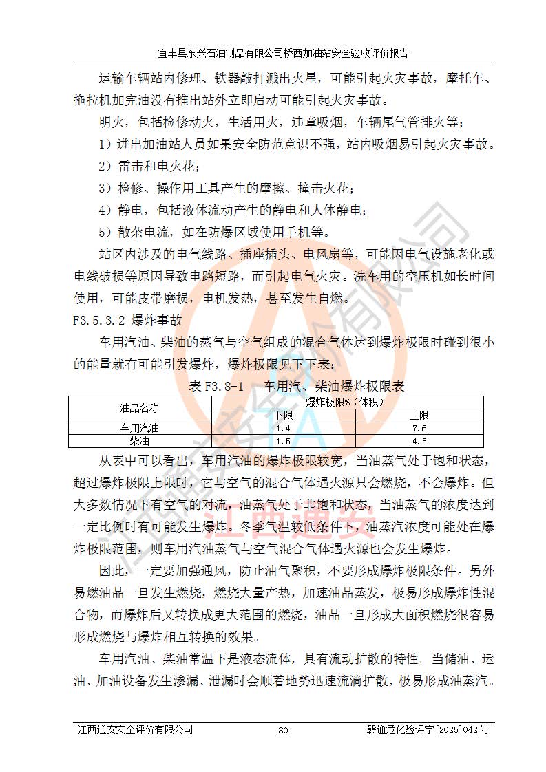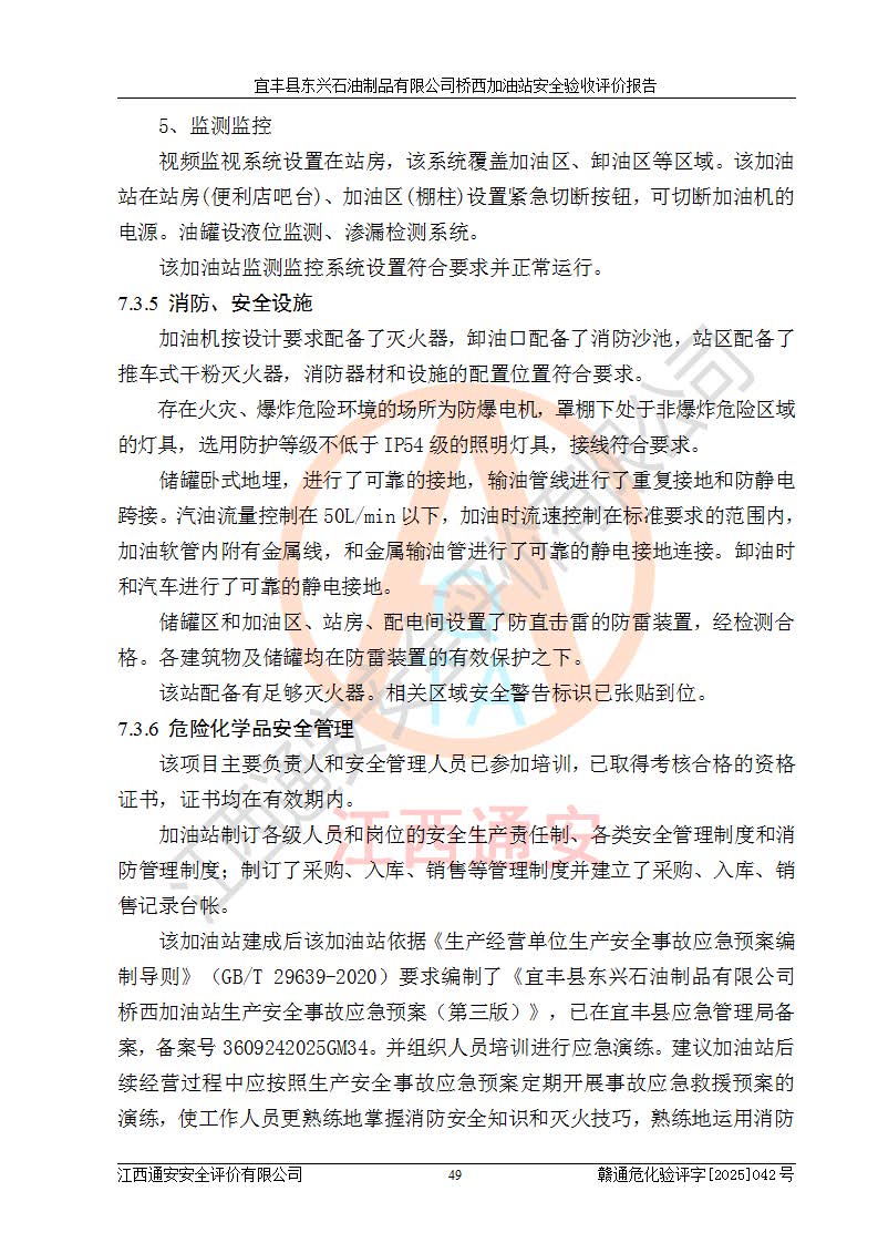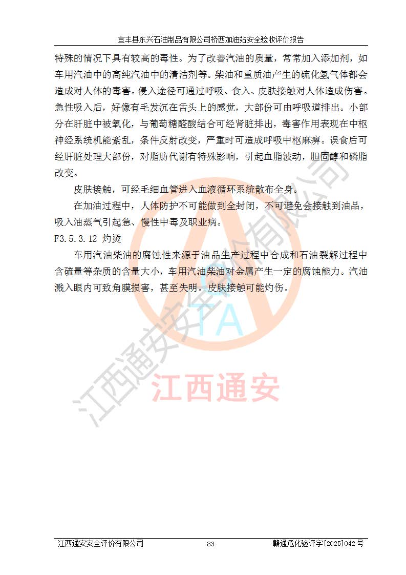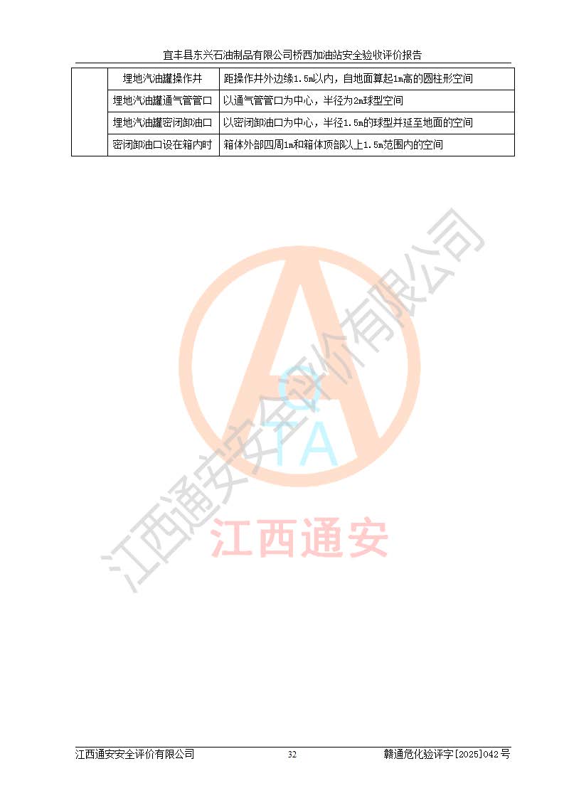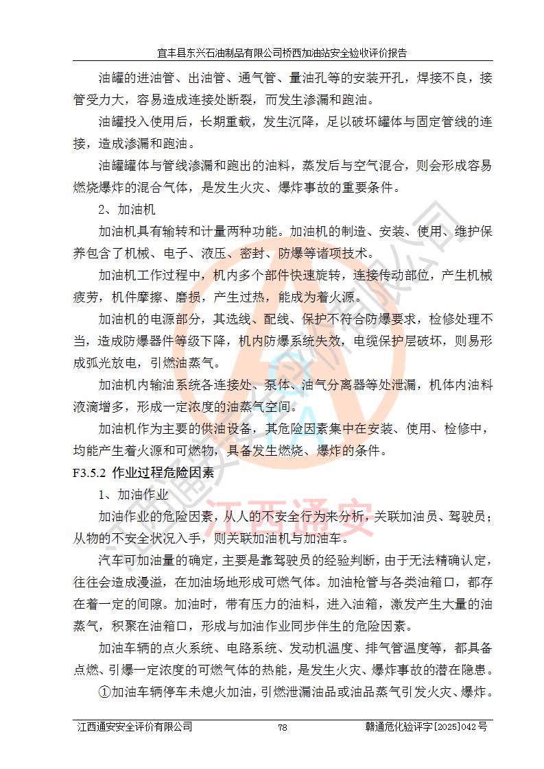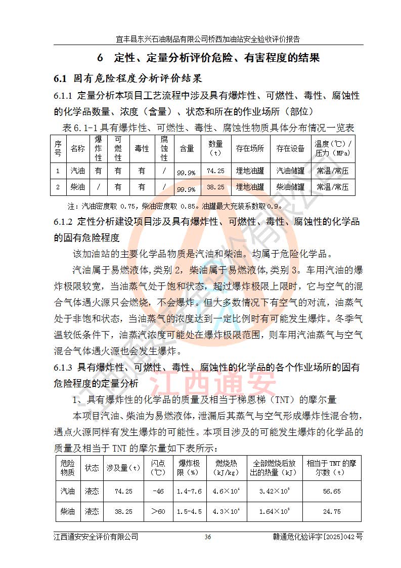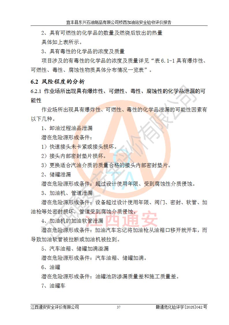 其它 | 一、安全狀況綜合評(píng)述 宜豐縣東興石油制品有限公司橋西加油站位于宜春市宜豐縣橋西鄉(xiāng),從事成品油(汽油、柴油)零售業(yè)務(wù),屬二級(jí)加油站。 通過(guò)對(duì)該加油站建設(shè)項(xiàng)目安全驗(yàn)收評(píng)價(jià),得出以下評(píng)價(jià)結(jié)論: 化學(xué)品、設(shè)備及工藝辨識(shí)結(jié)果 經(jīng)辨識(shí),該加油站經(jīng)營(yíng)、儲(chǔ)存危險(xiǎn)化學(xué)品為汽油和柴油,其中汽油屬于重點(diǎn)監(jiān)管危險(xiǎn)化學(xué)品、特別管控危險(xiǎn)化學(xué)品;該加油站不涉及劇毒化學(xué)品、高毒物品、易制毒化學(xué)品、監(jiān)控化學(xué)品、易制爆化學(xué)品。經(jīng)營(yíng)、儲(chǔ)存過(guò)程中采用的設(shè)備及工藝不屬于淘汰落后設(shè)備及工藝、不涉及危險(xiǎn)化工工藝,生產(chǎn)和儲(chǔ)存單元均不構(gòu)成危險(xiǎn)化學(xué)品重大危險(xiǎn)源。 建設(shè)項(xiàng)目所在地的安全條件和周邊的安全間距 該站東南側(cè)臨354國(guó)道,北側(cè)、西側(cè)、東側(cè)為居民建筑,加油站為二級(jí)加油站,設(shè)有油氣回收系統(tǒng),站外50米范圍內(nèi)無(wú)重要公共建筑物、明火設(shè)備和甲、乙類(lèi)生產(chǎn)及儲(chǔ)存設(shè)施,站區(qū)內(nèi)加油設(shè)施與周邊建構(gòu)筑物之間的距離能夠滿足《汽車(chē)加油加氣加氫站技術(shù)標(biāo)準(zhǔn)》GB50156-2021 和《建筑設(shè)計(jì)防火規(guī)范》GB50016-2014(2018 年版)以及相關(guān)**規(guī)范要求。本報(bào)告認(rèn)為該加油站建設(shè)項(xiàng)目周邊對(duì)加油站的影響以及建設(shè)項(xiàng)目所在地的自然條件對(duì)建設(shè)項(xiàng)目投入使用后的影響均較小,該加油站具備標(biāo)準(zhǔn)規(guī)范所要求的安全條件。 該項(xiàng)目安全設(shè)計(jì)診斷報(bào)告的采納情況 該加油站安全設(shè)計(jì)診斷報(bào)告核查的問(wèn)題(共15項(xiàng))及整改建議均已采納,經(jīng)評(píng)價(jià)組現(xiàn)場(chǎng)復(fù)核,均已整改完成。 該項(xiàng)目調(diào)試中表現(xiàn)出的技術(shù)、工藝和裝置、設(shè)備(設(shè)施)的安全、 可靠性和安全水平。 該加油站整改過(guò)程工作進(jìn)展順利,處于正常狀態(tài)。經(jīng)查閱資料和分析評(píng)價(jià),認(rèn)為本項(xiàng)目技術(shù)、工藝和裝置、設(shè)備(設(shè)施)的安全、可靠性和安全水平符合**相應(yīng)安全標(biāo)準(zhǔn)的要求。 該加油站儲(chǔ)存經(jīng)營(yíng)的汽油屬于重點(diǎn)監(jiān)管的危險(xiǎn)化學(xué)品和特別管控危險(xiǎn)化學(xué)品,該加油站在后續(xù)的經(jīng)營(yíng)中應(yīng)按照相關(guān)規(guī)范和要求加強(qiáng)安全管理,要求油品運(yùn)輸單位強(qiáng)化運(yùn)輸管理、自身加強(qiáng)儲(chǔ)存定制化管理。 該加油站經(jīng)營(yíng)過(guò)程中存在的危險(xiǎn)有害因素為:①火災(zāi)、爆炸;② 中毒和窒息;③**傷害;④觸電;⑤高處墜落;⑥物體打擊、⑦其他傷害。 其中火災(zāi)、爆炸是主要的危險(xiǎn)、有害因素,加油站埋地儲(chǔ)罐區(qū)、加油區(qū)、卸 油區(qū)是主要的危險(xiǎn)源。 (7)經(jīng)采用作業(yè)條件危險(xiǎn)性評(píng)價(jià)法(LEC)進(jìn)行分析,該加油站的作業(yè)條件相對(duì)比較安全。在選定的加油作業(yè)、卸油作業(yè)、維修作業(yè)、配電作業(yè)等4個(gè)單元中均為“一般危險(xiǎn)、需要注意”作業(yè)環(huán)境,且一般危險(xiǎn)作業(yè)環(huán)境的出現(xiàn)均由物料的危險(xiǎn)程度所決定,作業(yè)條件相對(duì)安全。 (8)采用危險(xiǎn)度評(píng)價(jià)法分析,油罐區(qū)主要危險(xiǎn)物質(zhì)為汽油和柴油,常溫、常壓下儲(chǔ)存。儲(chǔ)罐區(qū)汽油罐為Ⅰ級(jí),屬**危險(xiǎn);柴油罐得分為為Ⅲ級(jí),屬低度危險(xiǎn)。油罐采用雙層罐埋地設(shè)置,按要求設(shè)置了通氣管,并裝設(shè)了阻火器;設(shè)置了液位監(jiān)測(cè)報(bào)警系統(tǒng)和緊急切斷系統(tǒng),埋地加油管道設(shè)置雙層管道,其安全風(fēng)險(xiǎn)可控。 (9)采用檢查表評(píng)價(jià)法對(duì)該加油站站址選擇、總平面布置、加油工藝及設(shè)施、消防設(shè)施和給排水、電氣與報(bào)警和緊急切斷系統(tǒng)等進(jìn)行檢查分析,經(jīng)整改后,該加油站涉及的強(qiáng)制條款和其他項(xiàng)均符合要求。該加油站設(shè)置了消防安全設(shè)施、防雷防靜電設(shè)施、液位監(jiān)測(cè)措施、油罐泄漏檢測(cè)措施、電氣防爆措施等安全防護(hù)設(shè)施,取得了消防驗(yàn)收意見(jiàn)書(shū)和防雷檢測(cè)合格報(bào)告,符合**法律法規(guī)、標(biāo)準(zhǔn)規(guī)范的要求。該加油站公用工程能夠滿足安全經(jīng)營(yíng)的基本需要,符合安全經(jīng)營(yíng)的條件。 (10)該加油站相關(guān)證照齊全,成立了安全生產(chǎn)**小組,配備了安全管理人員,制定了安全管理制度、操作規(guī)程和事故應(yīng)急預(yù)案,加油站的安全管理機(jī)構(gòu)工作有力,加油站安全經(jīng)營(yíng)管理處于正常有序開(kāi)展范圍。 (11)對(duì)宜豐縣東興石油制品有限公司橋西加油站存在重大生產(chǎn)安全事故隱患進(jìn)行判定,檢查結(jié)果為該加油站不存在重大生產(chǎn)安全事故隱患。 總體評(píng)價(jià)結(jié)論: