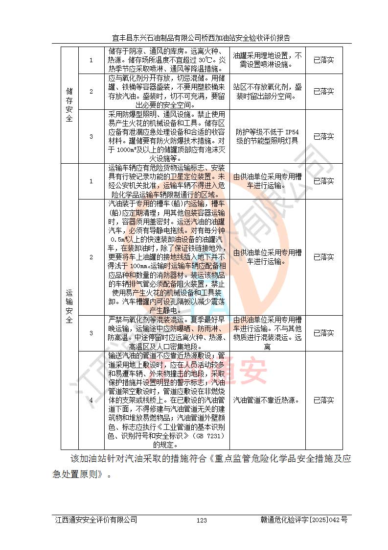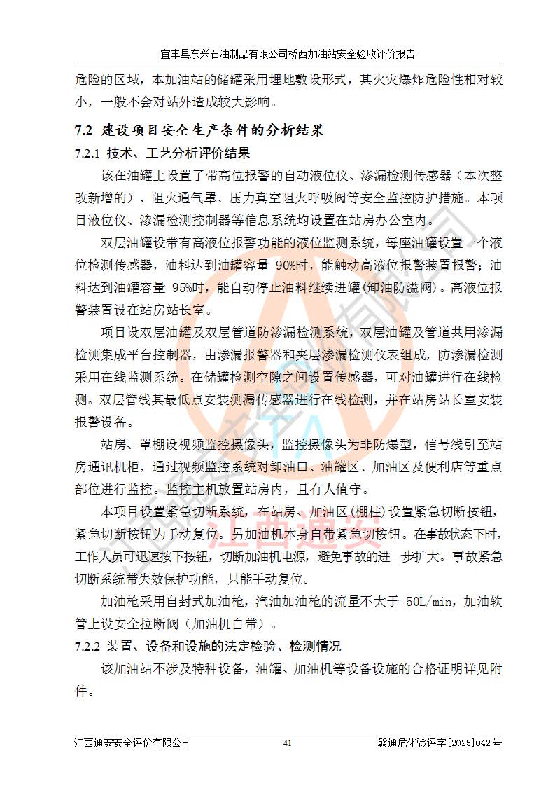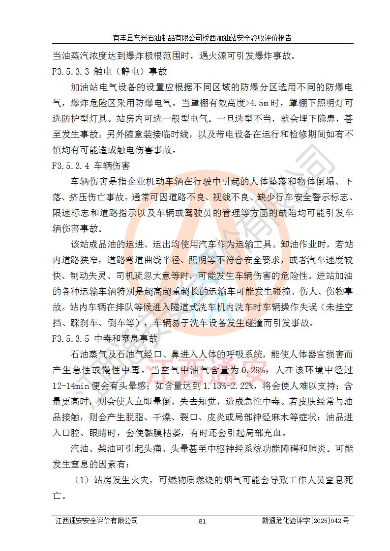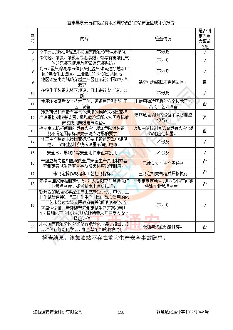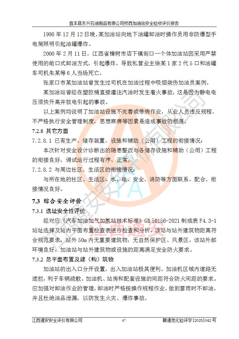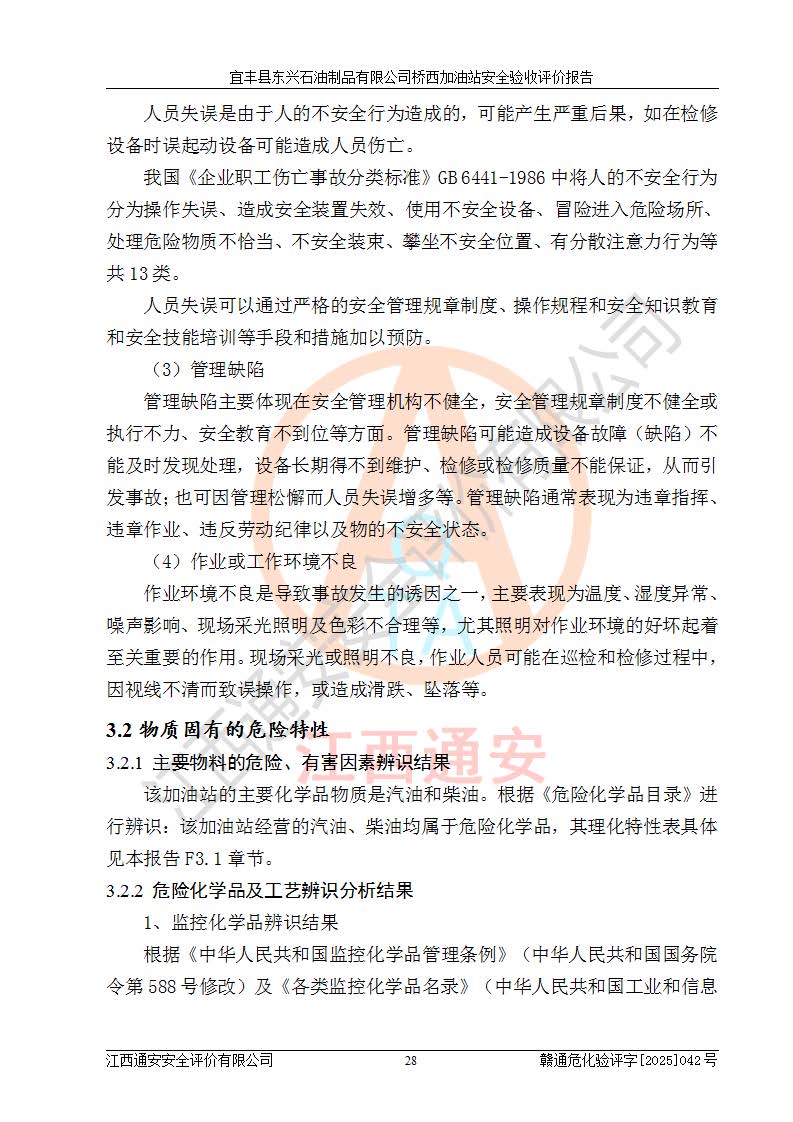 其它 | 一、安全狀況綜合評(píng)述 宜豐縣東興石油制品有限公司橋西加油站位于宜春市宜豐縣橋西鄉(xiāng),從事成品油(汽油、柴油)零售業(yè)務(wù),屬二級(jí)加油站。 通過(guò)對(duì)該加油站建設(shè)項(xiàng)目安全驗(yàn)收評(píng)價(jià),得出以下評(píng)價(jià)結(jié)論: 化學(xué)品、設(shè)備及工藝辨識(shí)結(jié)果 經(jīng)辨識(shí),該加油站經(jīng)營(yíng)、儲(chǔ)存危險(xiǎn)化學(xué)品為汽油和柴油,其中汽油屬于重點(diǎn)監(jiān)管危險(xiǎn)化學(xué)品、特別管控危險(xiǎn)化學(xué)品;該加油站不涉及劇毒化學(xué)品、高毒物品、易制毒化學(xué)品、監(jiān)控化學(xué)品、易制爆化學(xué)品。經(jīng)營(yíng)、儲(chǔ)存過(guò)程中采用的設(shè)備及工藝不屬于淘汰落后設(shè)備及工藝、不涉及危險(xiǎn)化工工藝,生產(chǎn)和儲(chǔ)存單元均不構(gòu)成危險(xiǎn)化學(xué)品重大危險(xiǎn)源。 建設(shè)項(xiàng)目所在地的安全條件和周邊的安全間距 該站東南側(cè)臨354國(guó)道,北側(cè)、西側(cè)、東側(cè)為居民建筑,加油站為二級(jí)加油站,設(shè)有油氣回收系統(tǒng),站外50米范圍內(nèi)無(wú)重要公共建筑物、明火設(shè)備和甲、乙類(lèi)生產(chǎn)及儲(chǔ)存設(shè)施,站區(qū)內(nèi)加油設(shè)施與周邊建構(gòu)筑物之間的距離能夠滿足《汽車(chē)加油加氣加氫站技術(shù)標(biāo)準(zhǔn)》GB50156-2021 和《建筑設(shè)計(jì)防火規(guī)范》GB50016-2014(2018 年版)以及相關(guān)**規(guī)范要求。本報(bào)告認(rèn)為該加油站建設(shè)項(xiàng)目周邊對(duì)加油站的影響以及建設(shè)項(xiàng)目所在地的自然條件對(duì)建設(shè)項(xiàng)目投入使用后的影響均較小,該加油站具備標(biāo)準(zhǔn)規(guī)范所要求的安全條件。 該項(xiàng)目安全設(shè)計(jì)診斷報(bào)告的采納情況 該加油站安全設(shè)計(jì)診斷報(bào)告核查的問(wèn)題(共15項(xiàng))及整改建議均已采納,經(jīng)評(píng)價(jià)組現(xiàn)場(chǎng)復(fù)核,均已整改完成。 該項(xiàng)目調(diào)試中表現(xiàn)出的技術(shù)、工藝和裝置、設(shè)備(設(shè)施)的安全、 可靠性和安全水平。 該加油站整改過(guò)程工作進(jìn)展順利,處于正常狀態(tài)。經(jīng)查閱資料和分析評(píng)價(jià),認(rèn)為本項(xiàng)目技術(shù)、工藝和裝置、設(shè)備(設(shè)施)的安全、可靠性和安全水平符合**相應(yīng)安全標(biāo)準(zhǔn)的要求。 該加油站儲(chǔ)存經(jīng)營(yíng)的汽油屬于重點(diǎn)監(jiān)管的危險(xiǎn)化學(xué)品和特別管控危險(xiǎn)化學(xué)品,該加油站在后續(xù)的經(jīng)營(yíng)中應(yīng)按照相關(guān)規(guī)范和要求加強(qiáng)安全管理,要求油品運(yùn)輸單位強(qiáng)化運(yùn)輸管理、自身加強(qiáng)儲(chǔ)存定制化管理。 該加油站經(jīng)營(yíng)過(guò)程中存在的危險(xiǎn)有害因素為:①火災(zāi)、爆炸;② 中毒和窒息;③**傷害;④觸電;⑤高處墜落;⑥物體打擊、⑦其他傷害。 其中火災(zāi)、爆炸是主要的危險(xiǎn)、有害因素,加油站埋地儲(chǔ)罐區(qū)、加油區(qū)、卸 油區(qū)是主要的危險(xiǎn)源。 (7)經(jīng)采用作業(yè)條件危險(xiǎn)性評(píng)價(jià)法(LEC)進(jìn)行分析,該加油站的作業(yè)條件相對(duì)比較安全。在選定的加油作業(yè)、卸油作業(yè)、維修作業(yè)、配電作業(yè)等4個(gè)單元中均為“一般危險(xiǎn)、需要注意”作業(yè)環(huán)境,且一般危險(xiǎn)作業(yè)環(huán)境的出現(xiàn)均由物料的危險(xiǎn)程度所決定,作業(yè)條件相對(duì)安全。 (8)采用危險(xiǎn)度評(píng)價(jià)法分析,油罐區(qū)主要危險(xiǎn)物質(zhì)為汽油和柴油,常溫、常壓下儲(chǔ)存。儲(chǔ)罐區(qū)汽油罐為Ⅰ級(jí),屬**危險(xiǎn);柴油罐得分為為Ⅲ級(jí),屬低度危險(xiǎn)。油罐采用雙層罐埋地設(shè)置,按要求設(shè)置了通氣管,并裝設(shè)了阻火器;設(shè)置了液位監(jiān)測(cè)報(bào)警系統(tǒng)和緊急切斷系統(tǒng),埋地加油管道設(shè)置雙層管道,其安全風(fēng)險(xiǎn)可控。 (9)采用檢查表評(píng)價(jià)法對(duì)該加油站站址選擇、總平面布置、加油工藝及設(shè)施、消防設(shè)施和給排水、電氣與報(bào)警和緊急切斷系統(tǒng)等進(jìn)行檢查分析,經(jīng)整改后,該加油站涉及的強(qiáng)制條款和其他項(xiàng)均符合要求。該加油站設(shè)置了消防安全設(shè)施、防雷防靜電設(shè)施、液位監(jiān)測(cè)措施、油罐泄漏檢測(cè)措施、電氣防爆措施等安全防護(hù)設(shè)施,取得了消防驗(yàn)收意見(jiàn)書(shū)和防雷檢測(cè)合格報(bào)告,符合**法律法規(guī)、標(biāo)準(zhǔn)規(guī)范的要求。該加油站公用工程能夠滿足安全經(jīng)營(yíng)的基本需要,符合安全經(jīng)營(yíng)的條件。 (10)該加油站相關(guān)證照齊全,成立了安全生產(chǎn)**小組,配備了安全管理人員,制定了安全管理制度、操作規(guī)程和事故應(yīng)急預(yù)案,加油站的安全管理機(jī)構(gòu)工作有力,加油站安全經(jīng)營(yíng)管理處于正常有序開(kāi)展范圍。 (11)對(duì)宜豐縣東興石油制品有限公司橋西加油站存在重大生產(chǎn)安全事故隱患進(jìn)行判定,檢查結(jié)果為該加油站不存在重大生產(chǎn)安全事故隱患。 總體評(píng)價(jià)結(jié)論: